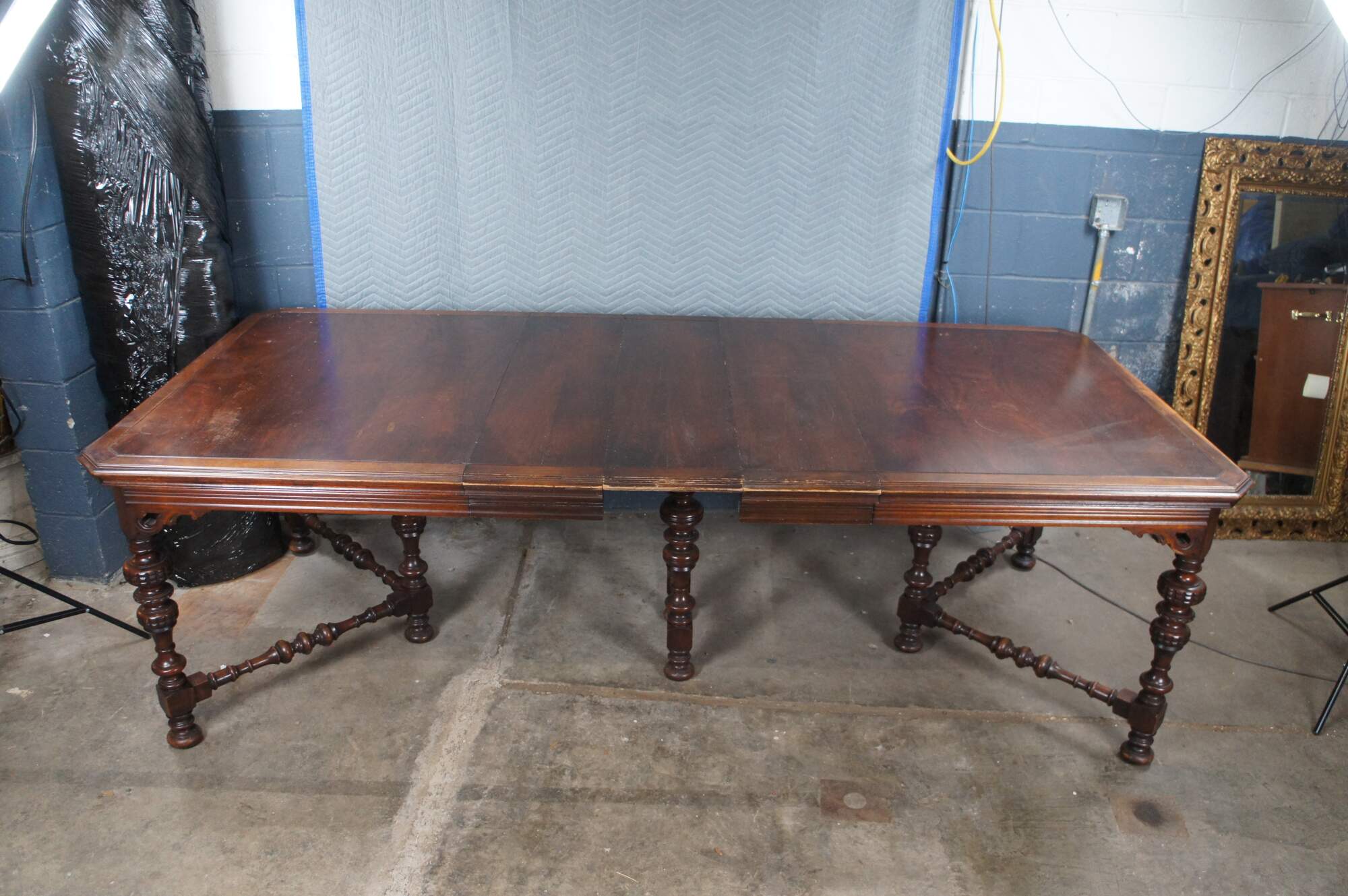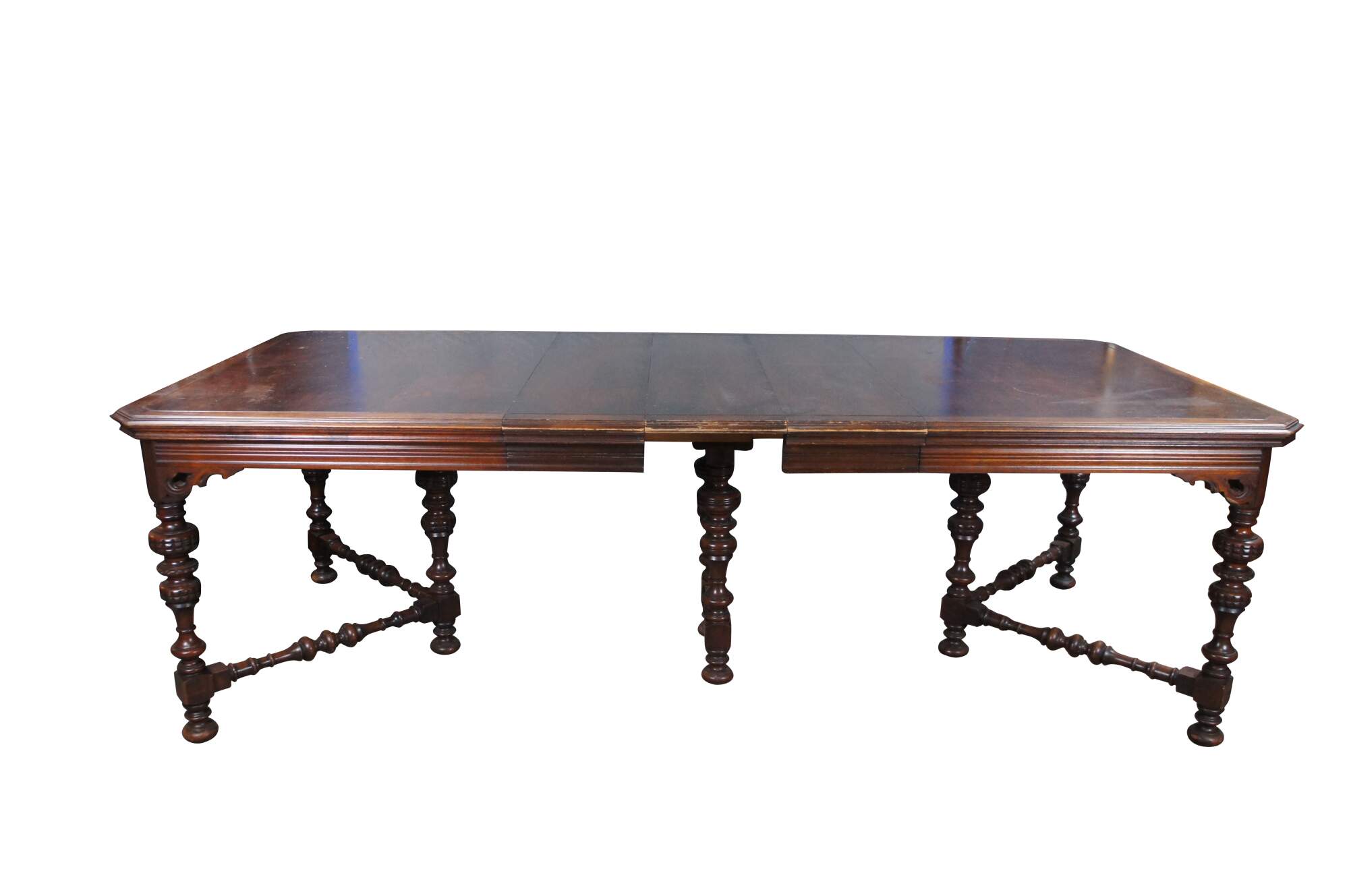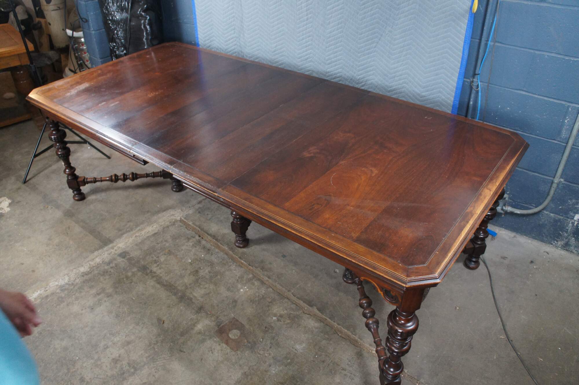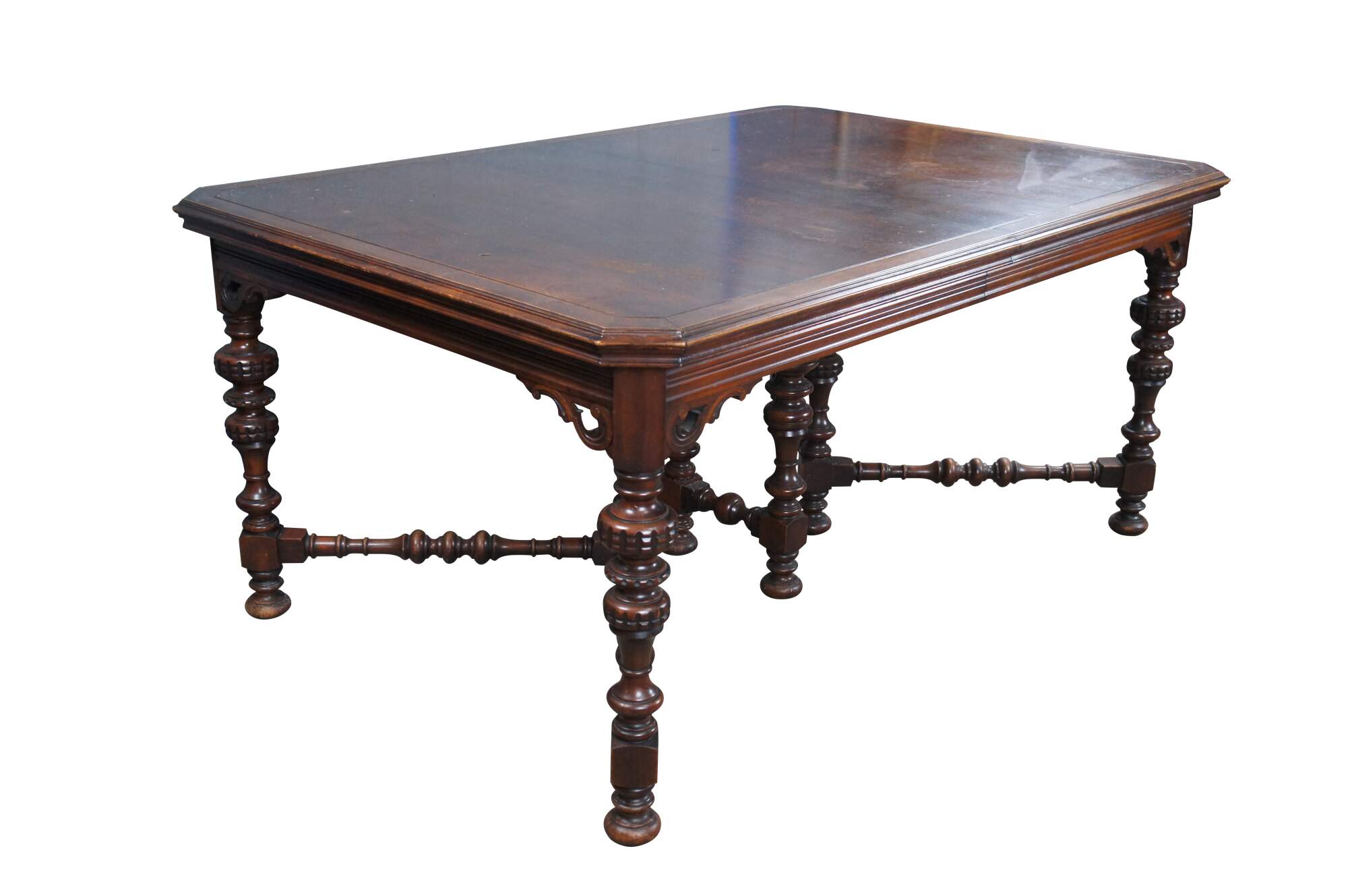 Antique Orinoco Furniture Company Jacobean / Spanish Revival style extendable dining table. Made of oak featuring rectangular form notched corners and pieced S scroll spandrels over baluster turned ribbed legs / feet. Orinoco Furniture, Makers of Fine Furniture Only. Columbus Indiana, Finished with Duco, Dupont. 4325.