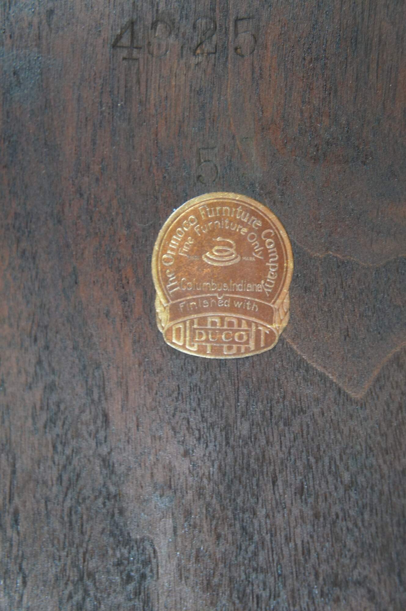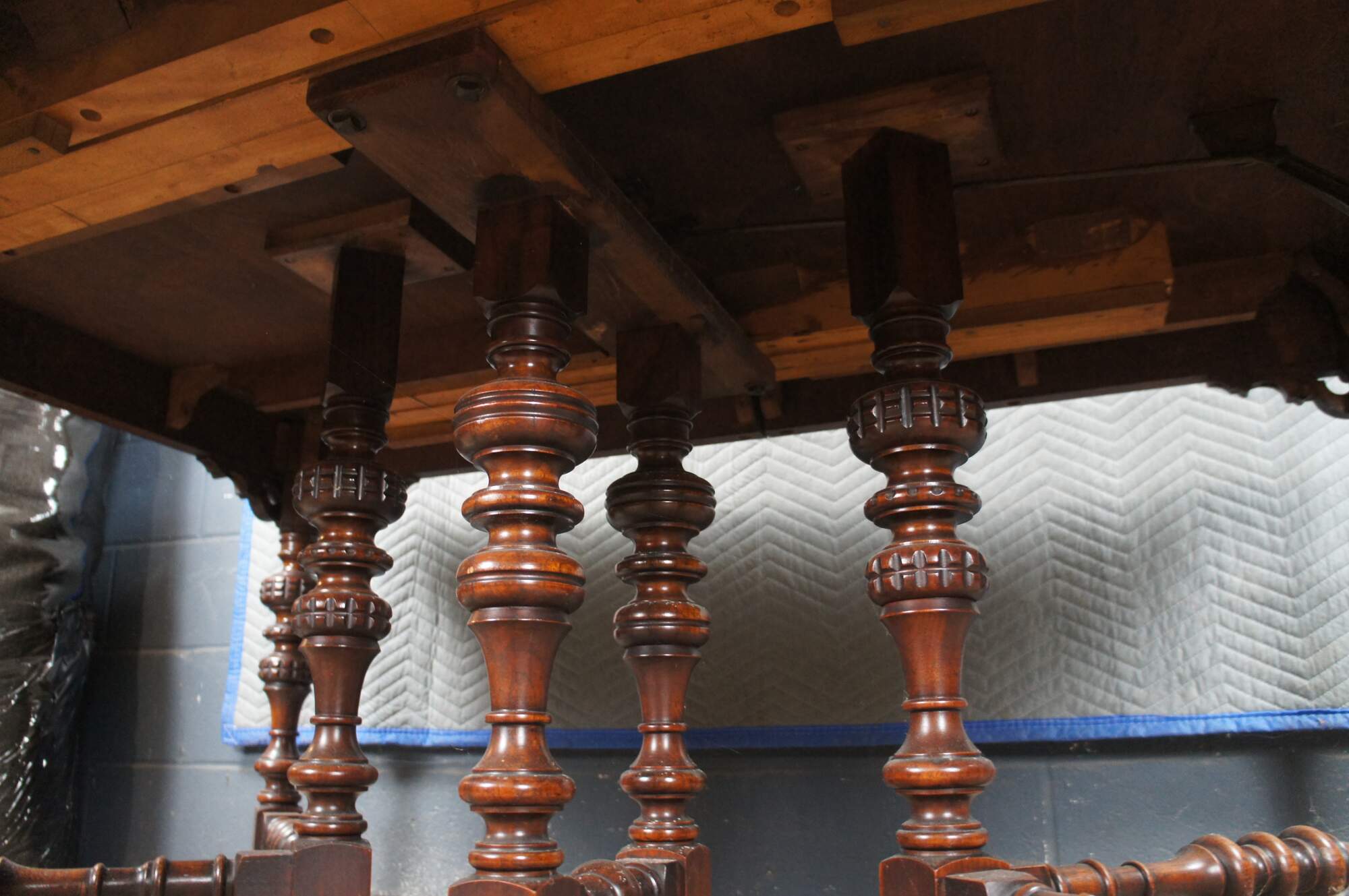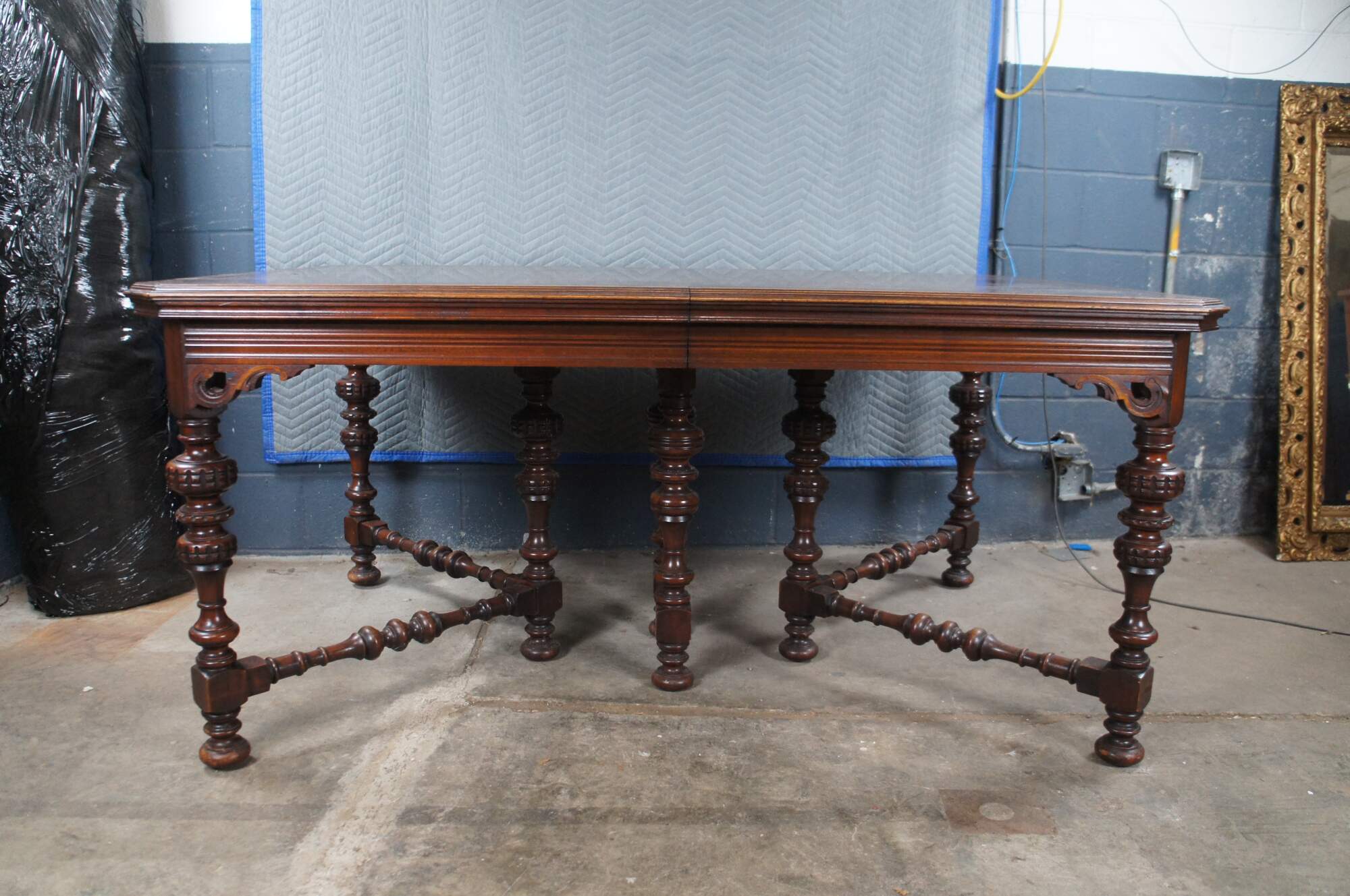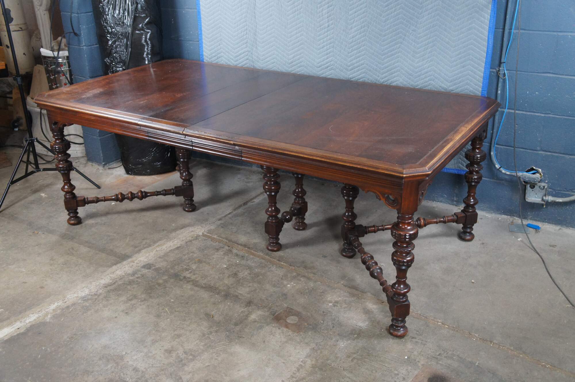 Antique Orinoco Furniture Company Jacobean / Spanish Revival style extendable dining table. Made of oak featuring rectangular form notched corners and pieced S scroll spandrels over baluster turned ribbed legs / feet. Orinoco Furniture, Makers of Fine Furniture Only. Columbus Indiana, Finished with Duco, Dupont. 4325.