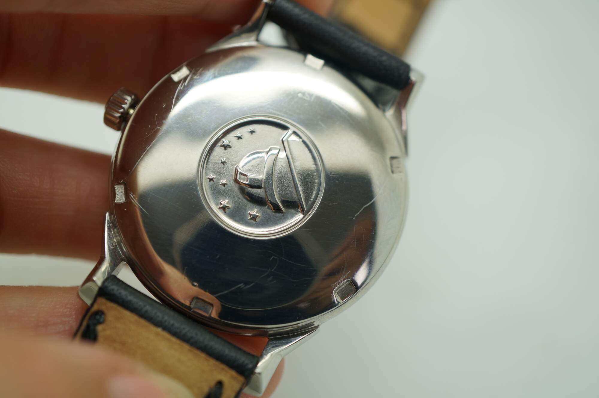 Vintage circa 1963-1967 Omega Constellation Automatic Chronometer Officially Certified wrist watch. Silver / chrome color stainless steel case; white dodecahedron shaped / pie pan dial with black and silver tick marks and hands; date number at right. Omega Watch Company - Swiss Made - 168.005 - SGR - Acier Inoxydable. Movement Unadjusted - Five (5) Positions and Temperature - Twenty Four 24 Jewels - 564 - 2535xxxx. New band by deBeer Watch Bands - Item Number 923-18 - Saddle Leather (hand stitching) - Black - 18mm - Weber Jewelers of Dayton, OH.