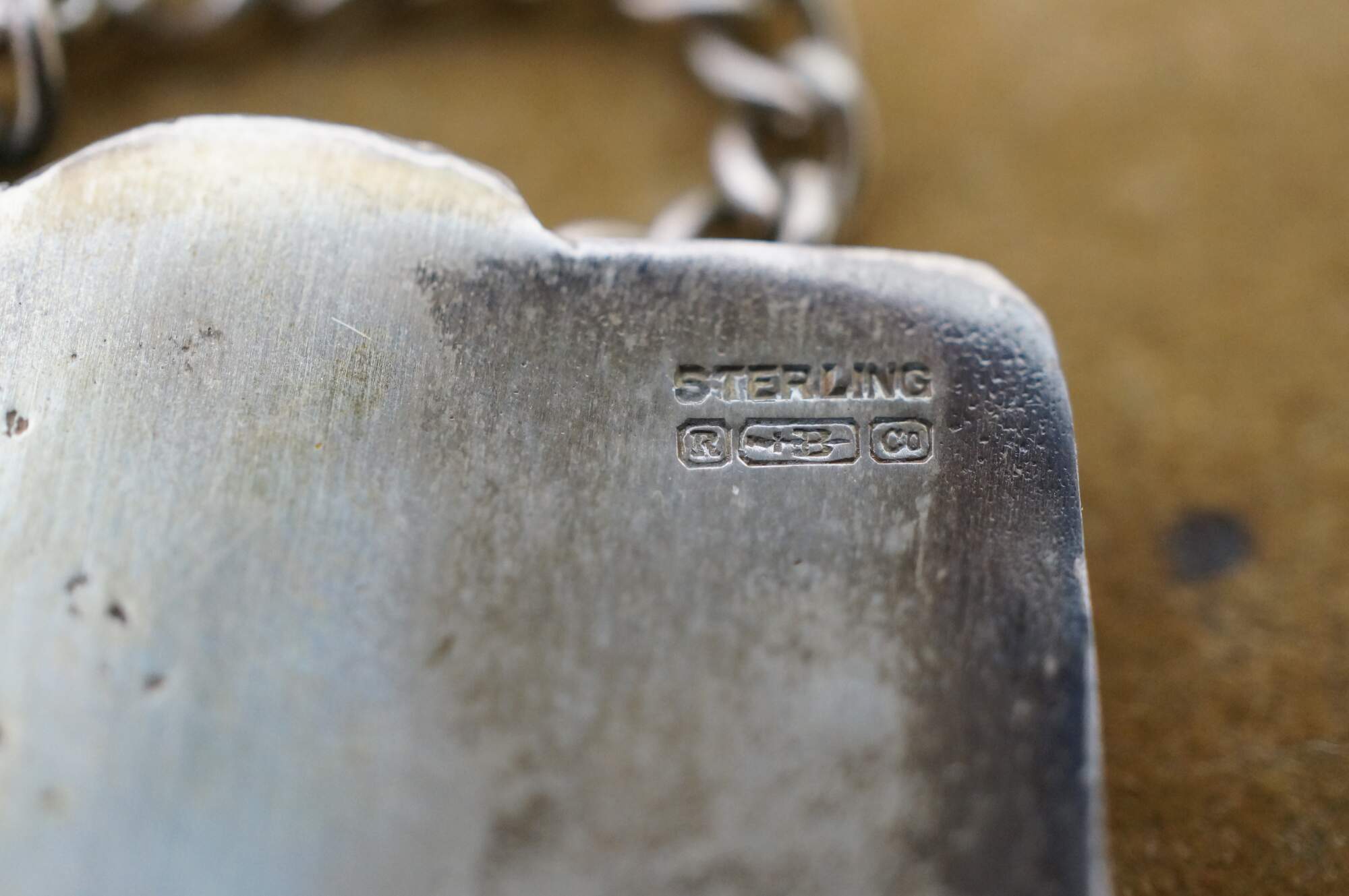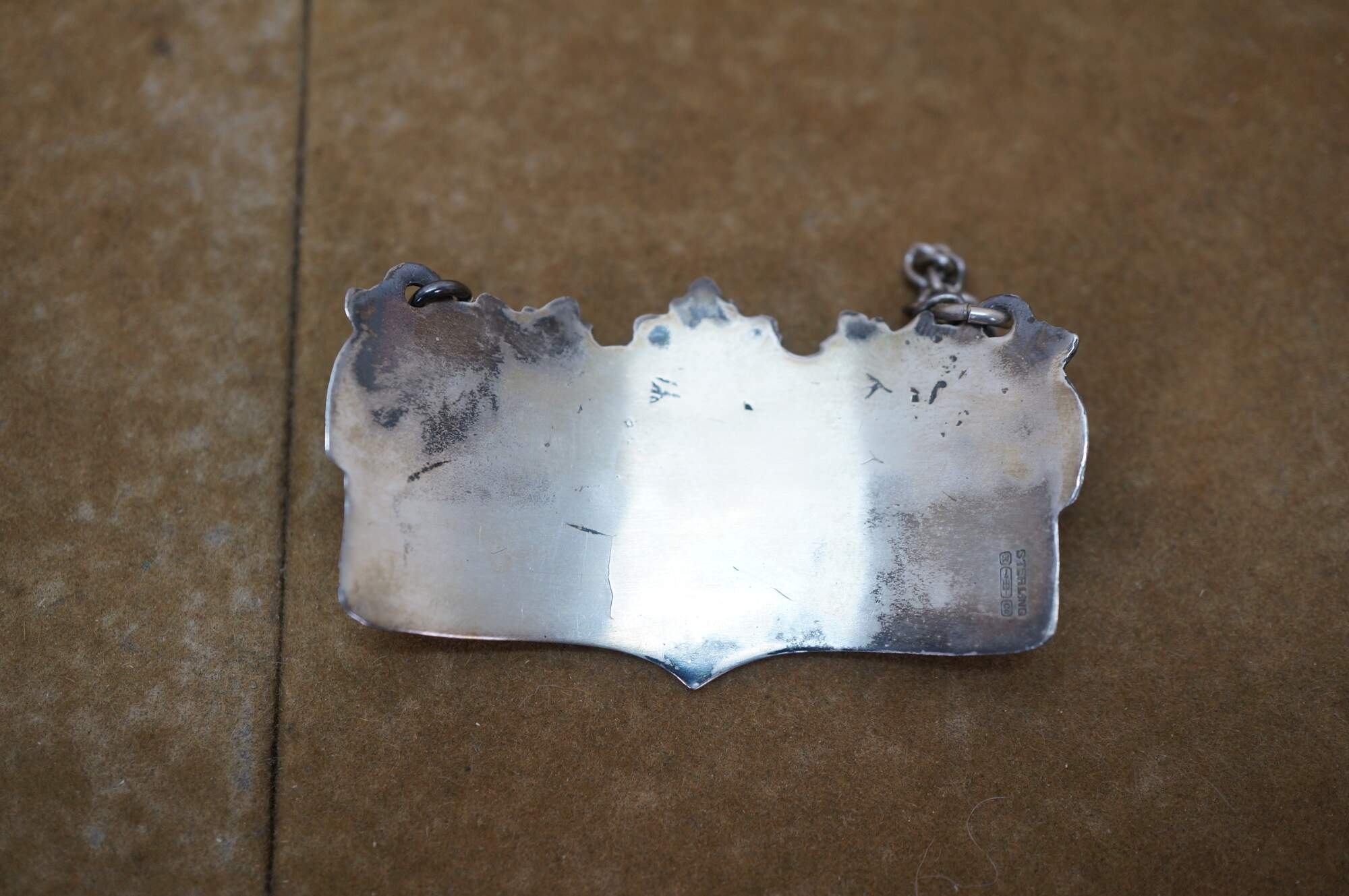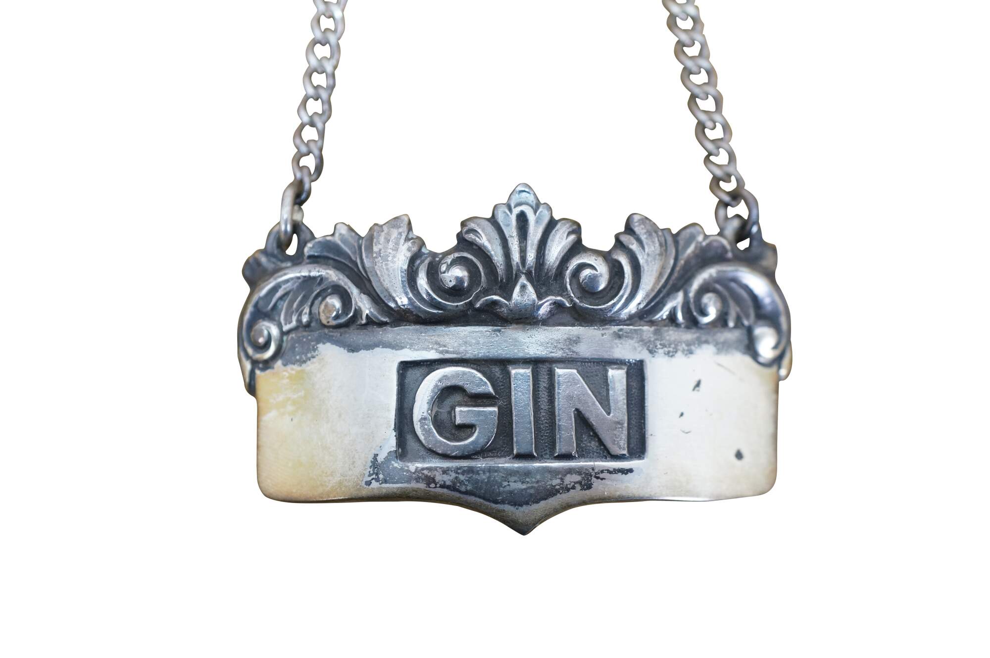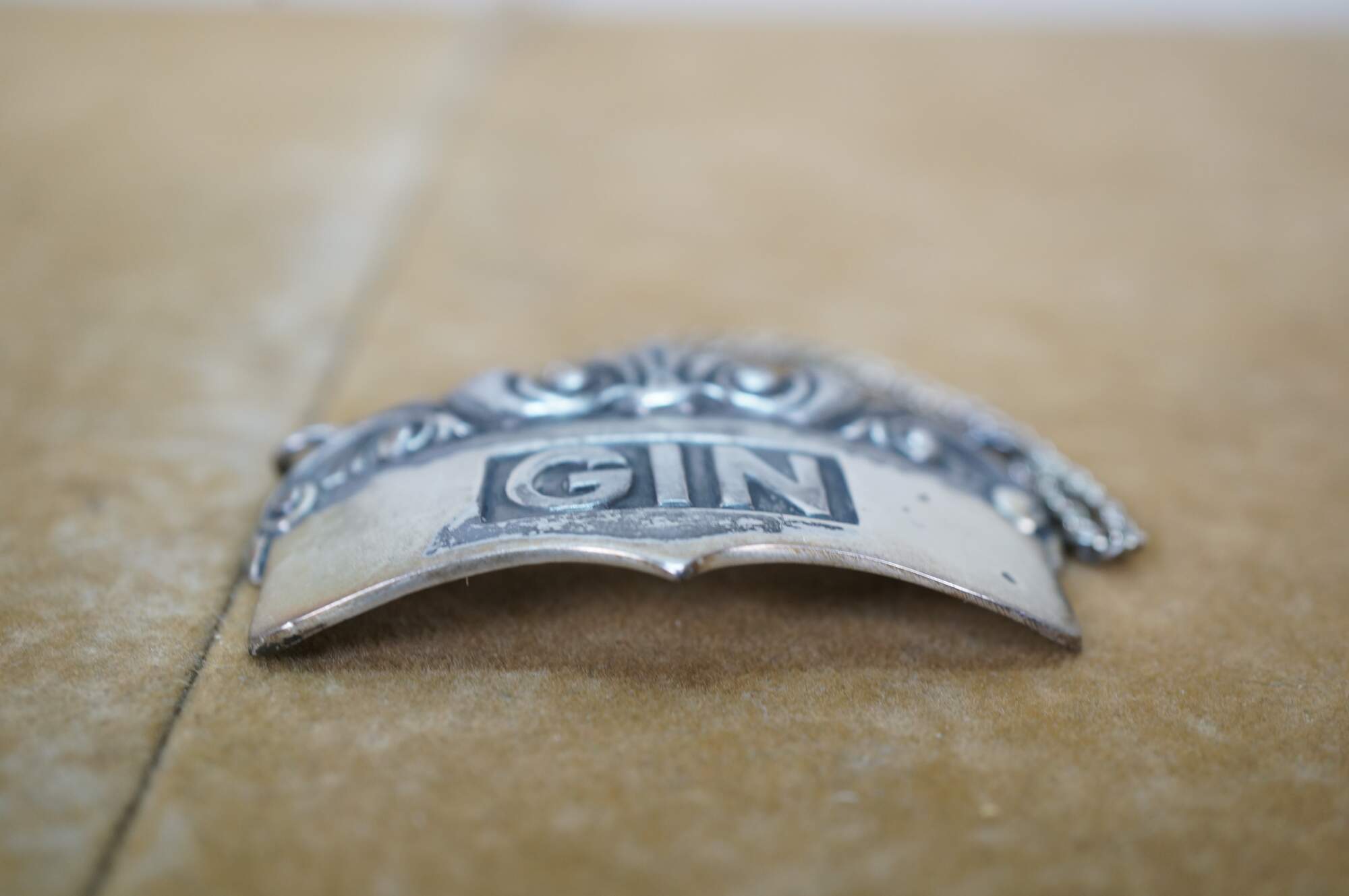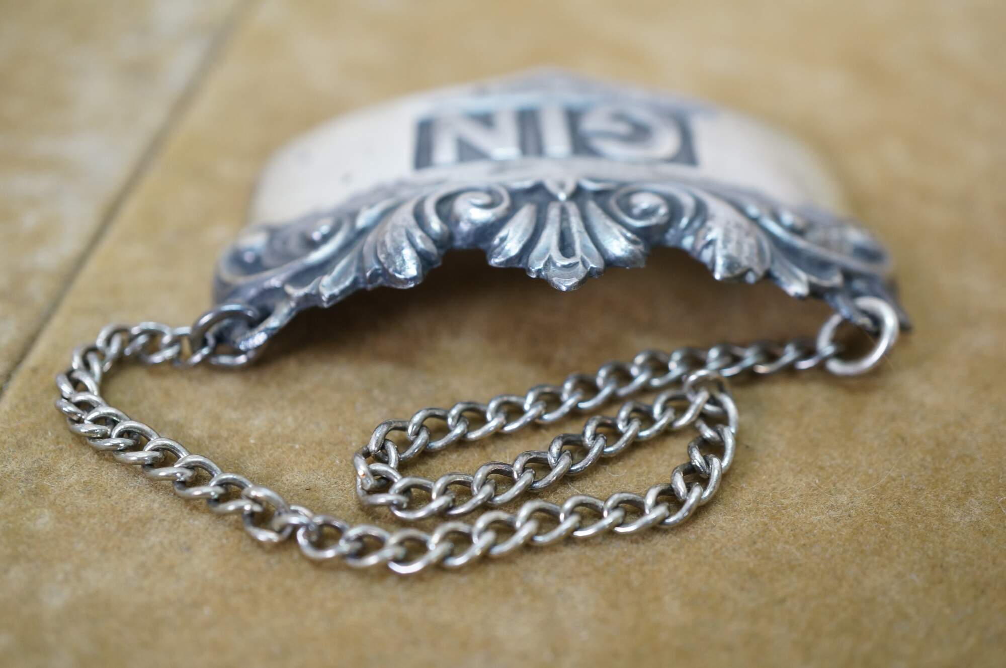 Circa mid 20th century baroque sterling silver Gin decanter / bottle label / charm on chain by R. Blackinton & Company.