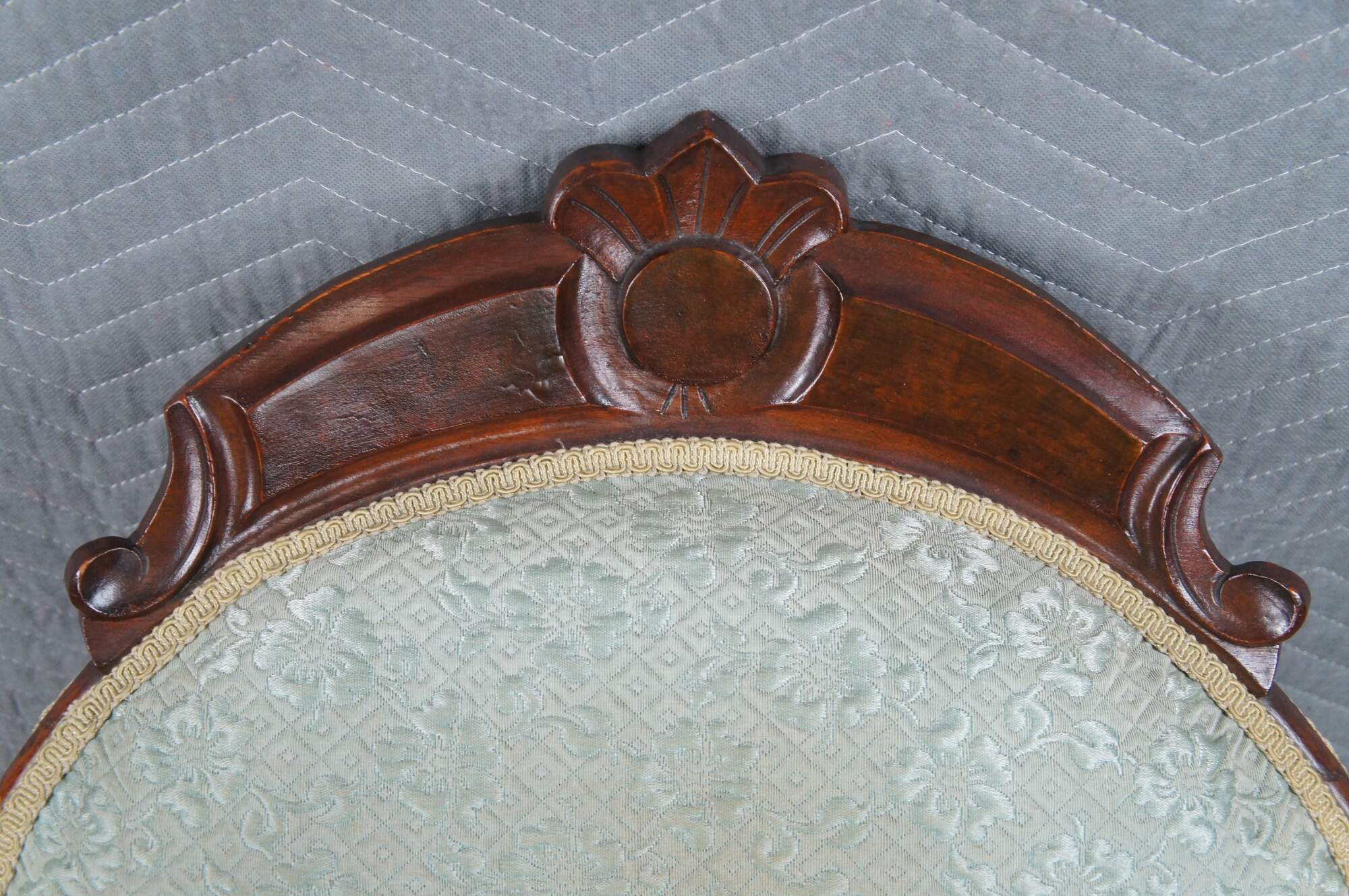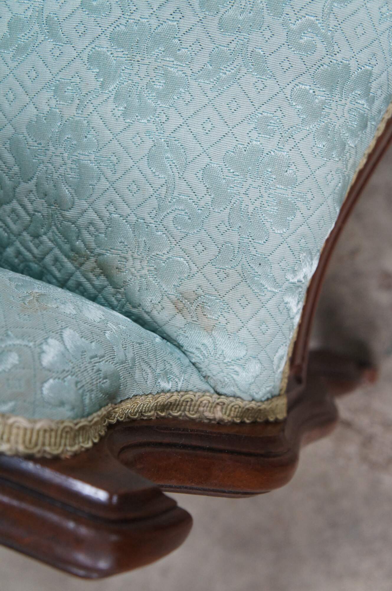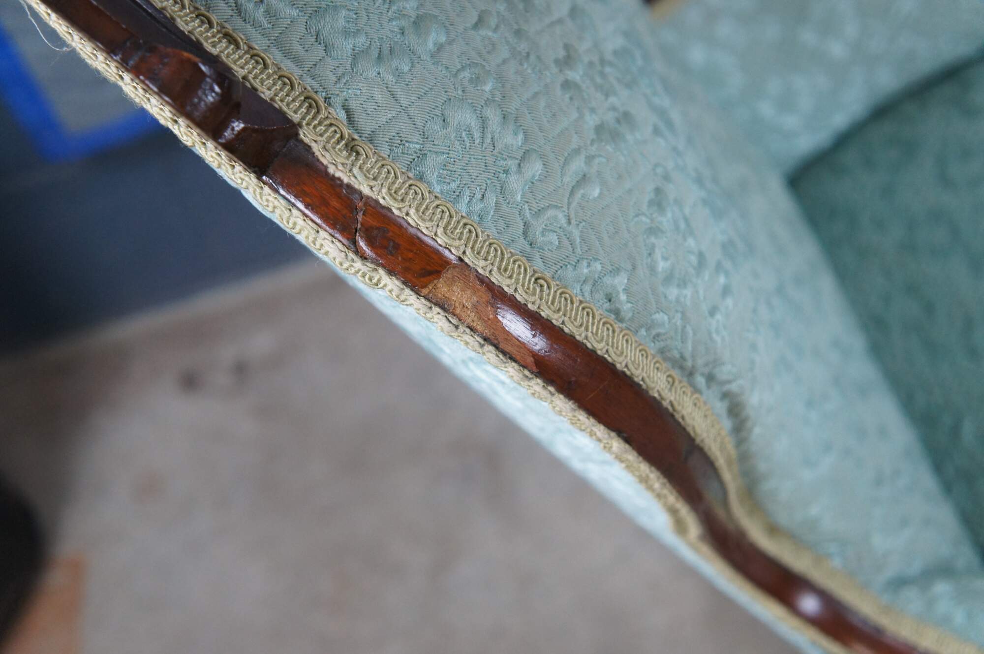 Structurally solid, finish loss / veneer loss, rubbing, splitting, staining to fabric, mismatched castors.