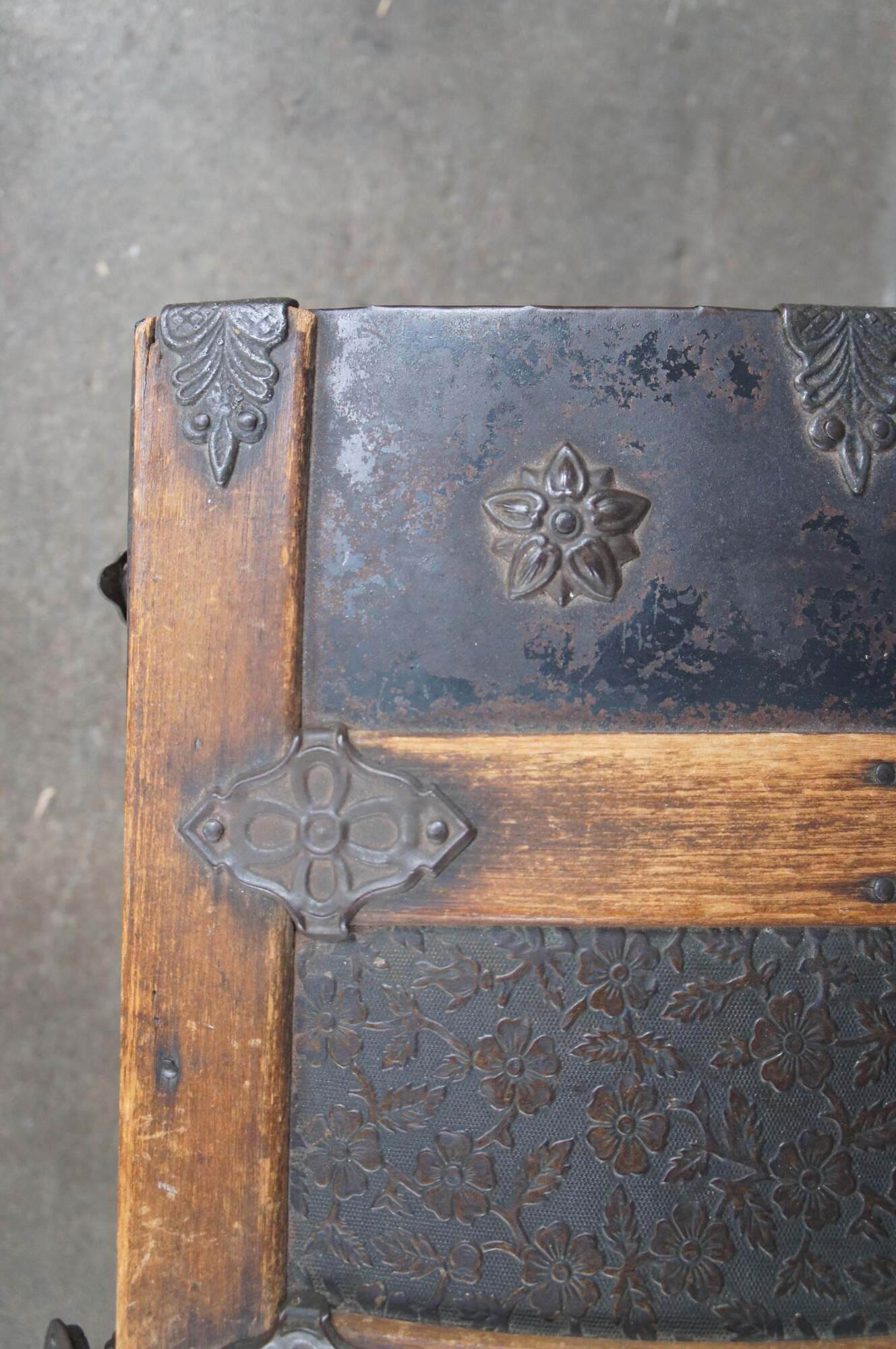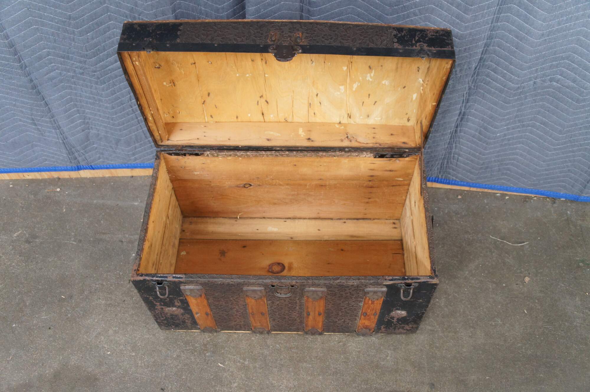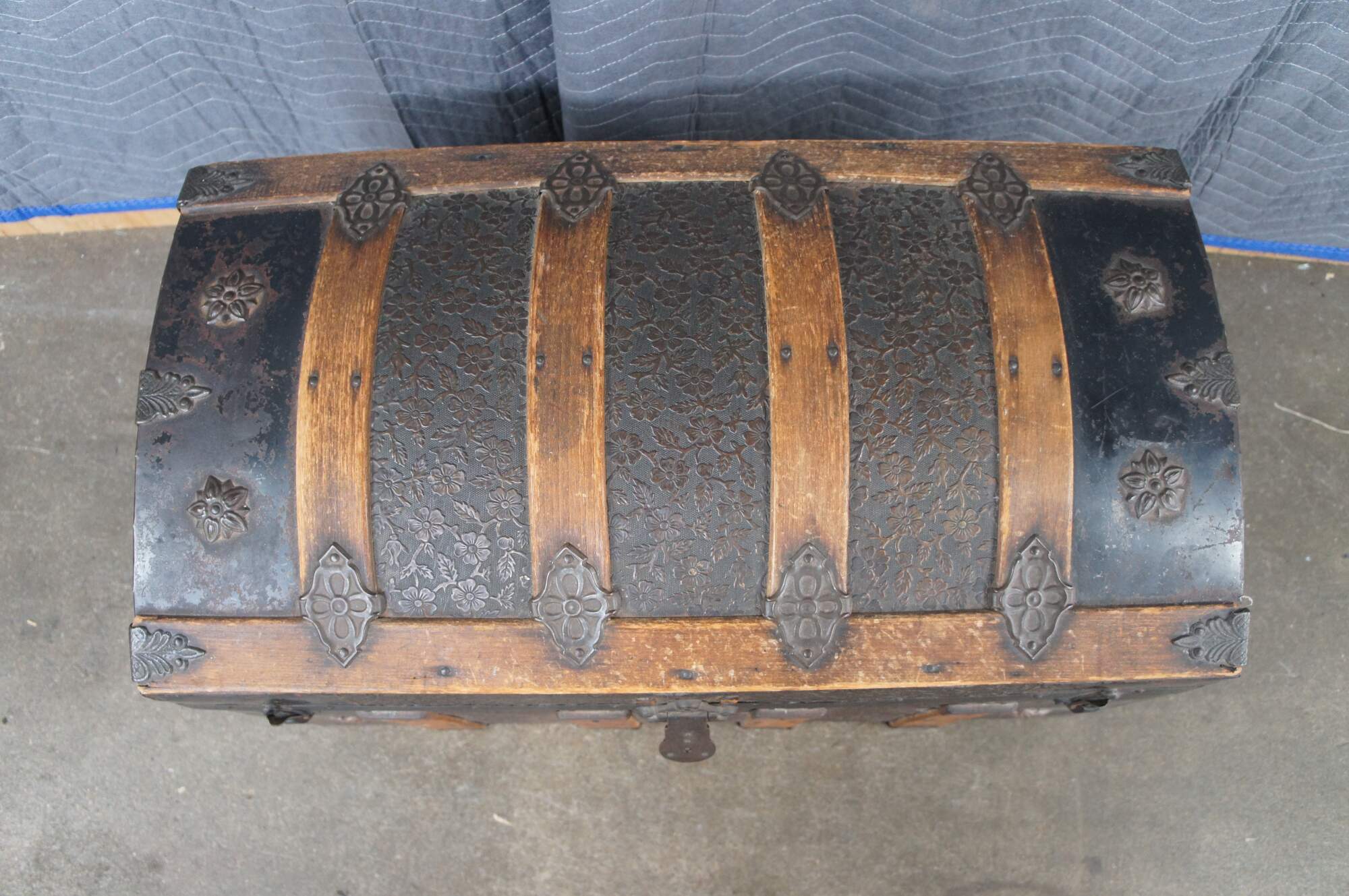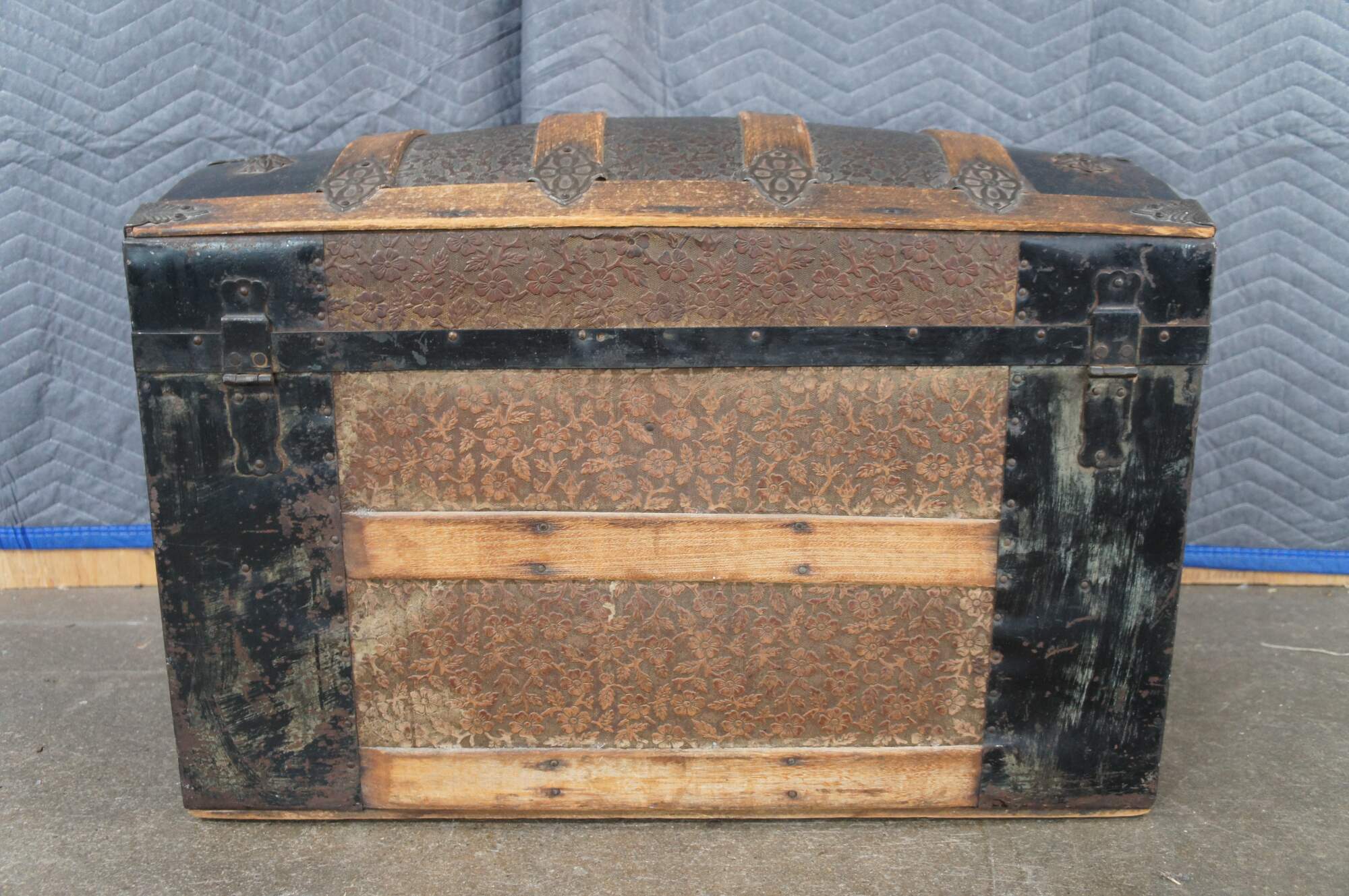A charming antique 19th century steamer trunk. Made from oak with metal paneling and banding. The center of the trunk has a floral embossed fabric. Interior is lined with pine.