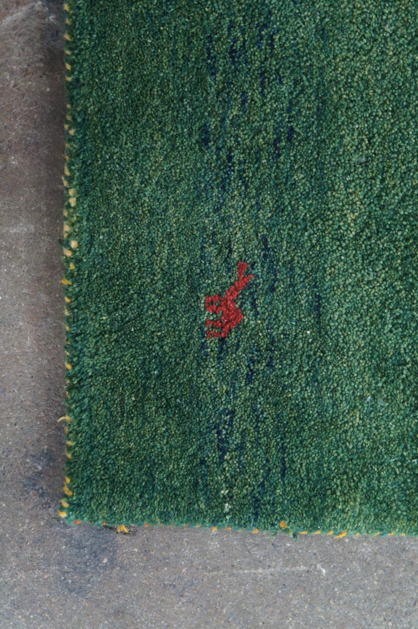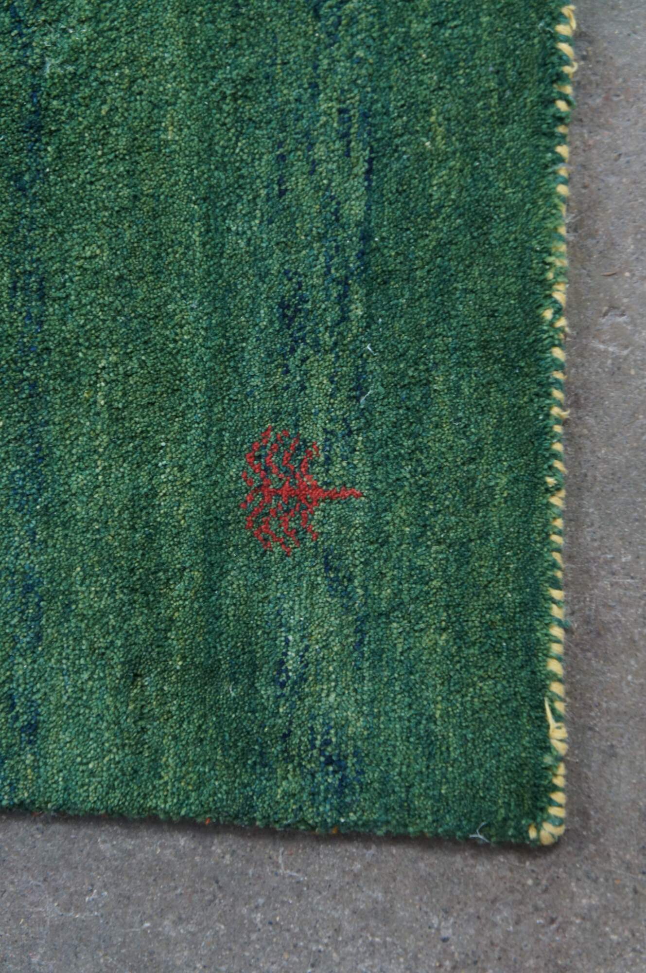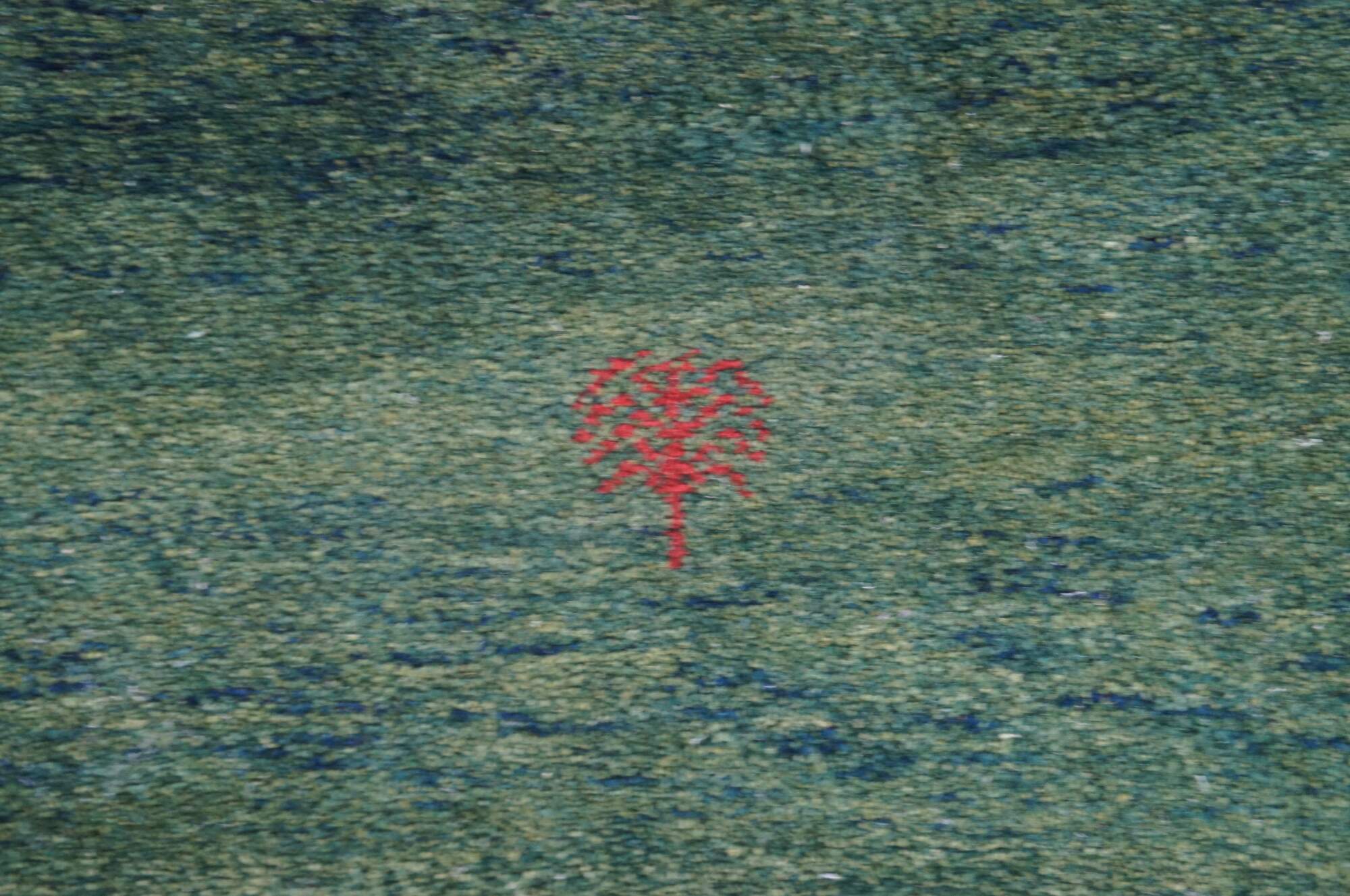Hand Knotted Indian Gabbeh Wool Area Rug. Features a Modern design with green pile accented with red trees and figures.