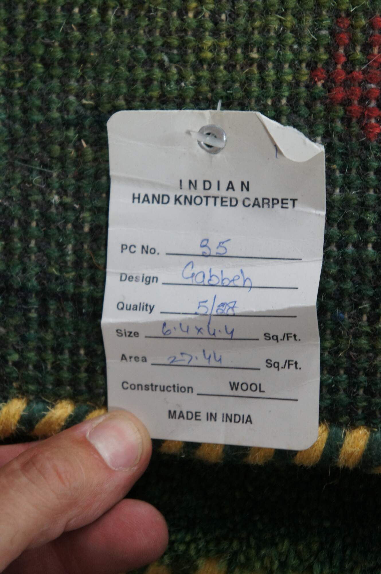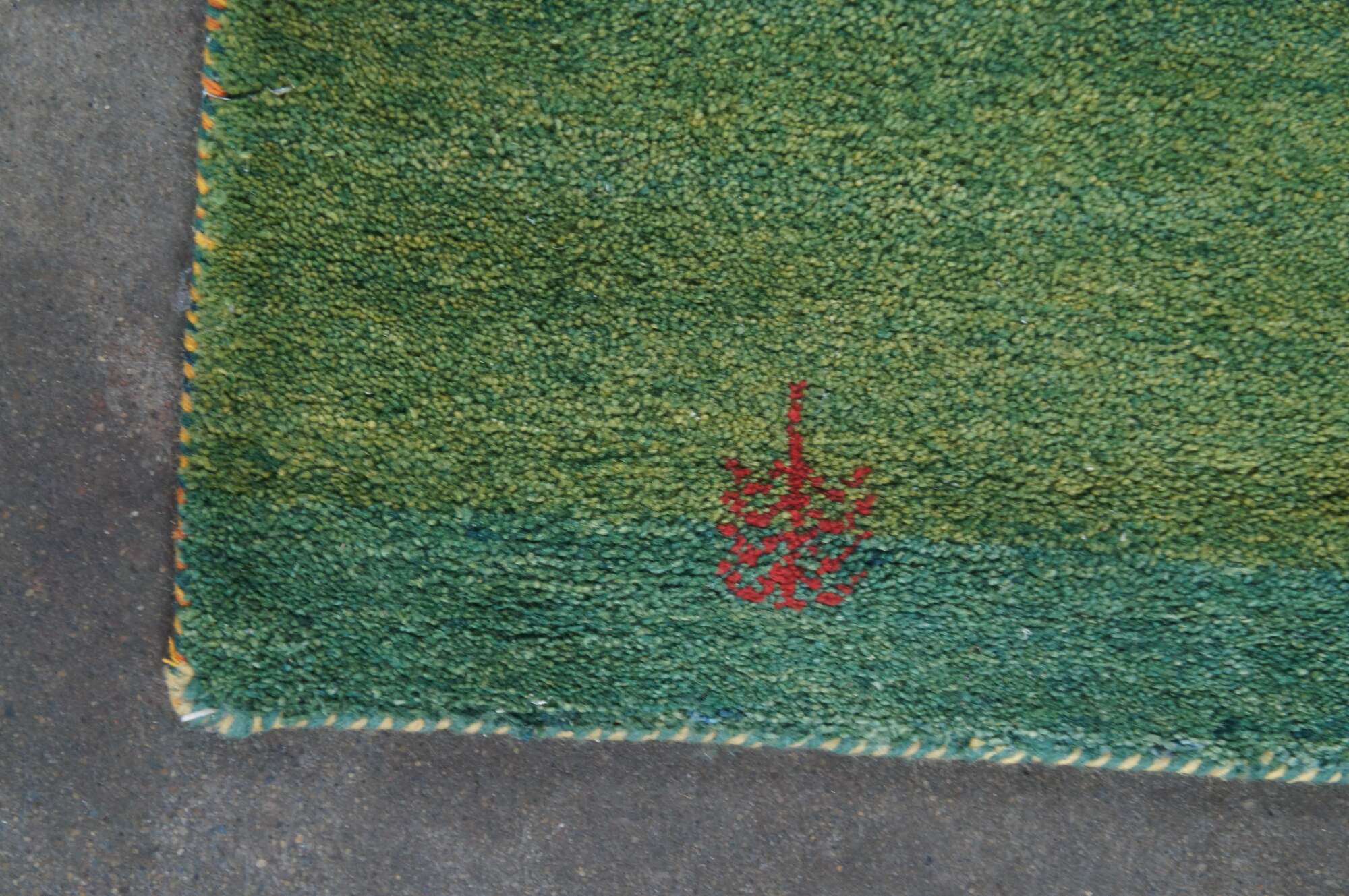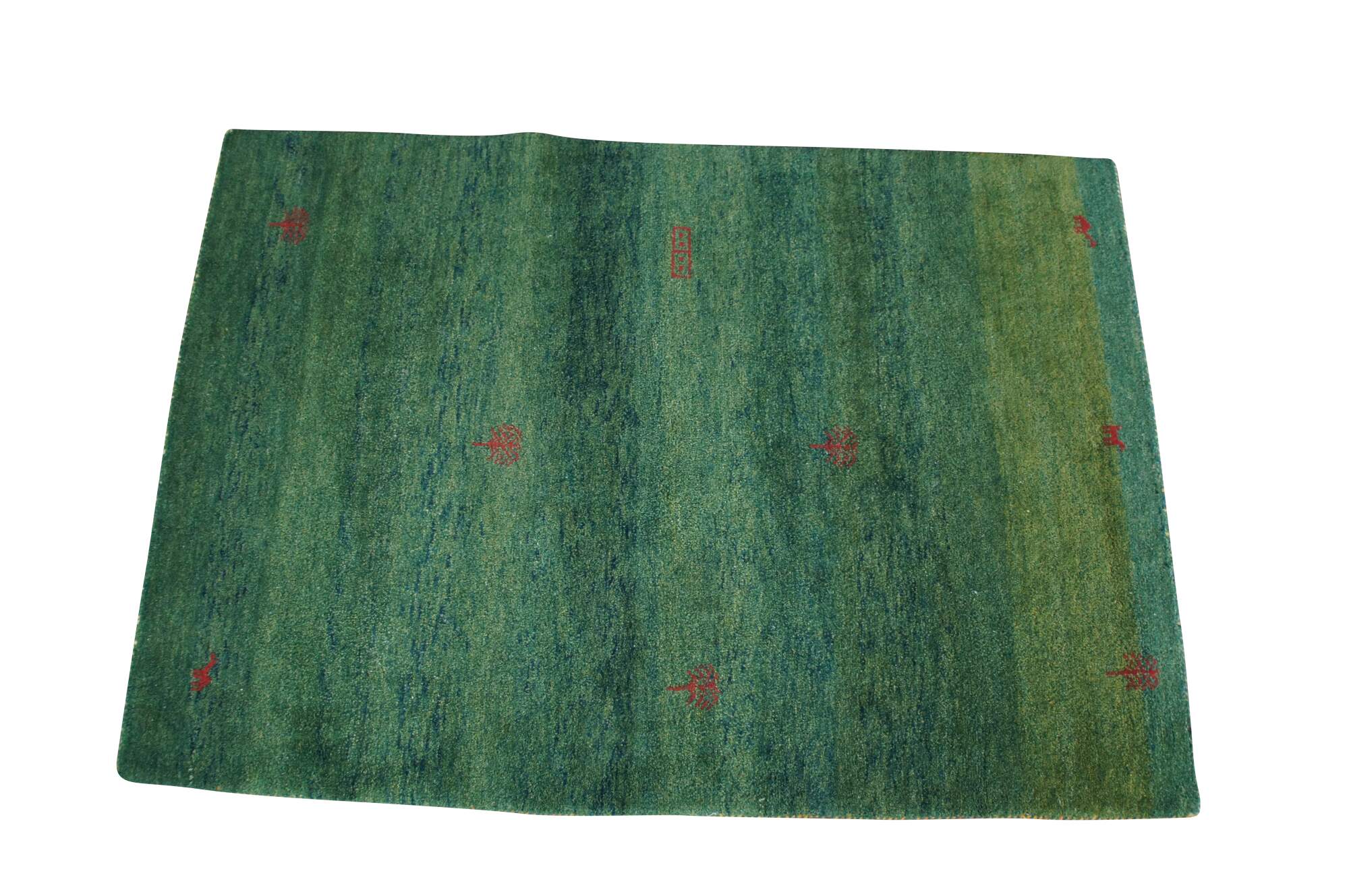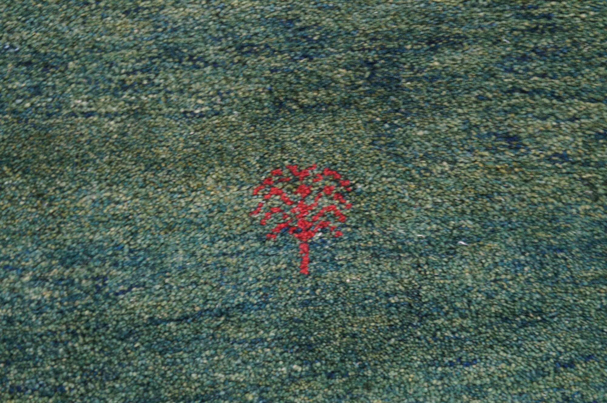 Hand Knotted Indian Gabbeh Wool Area Rug. Features a Modern design with green pile accented with red trees and figures.