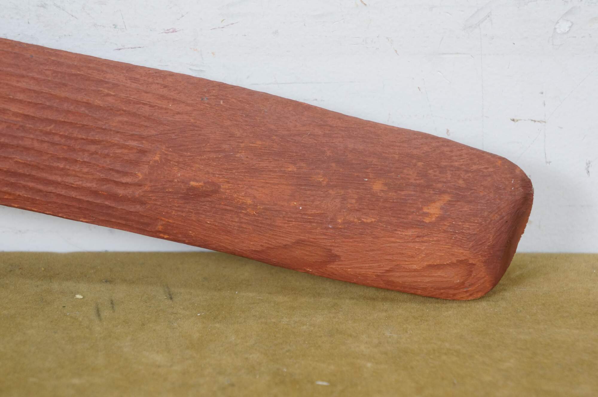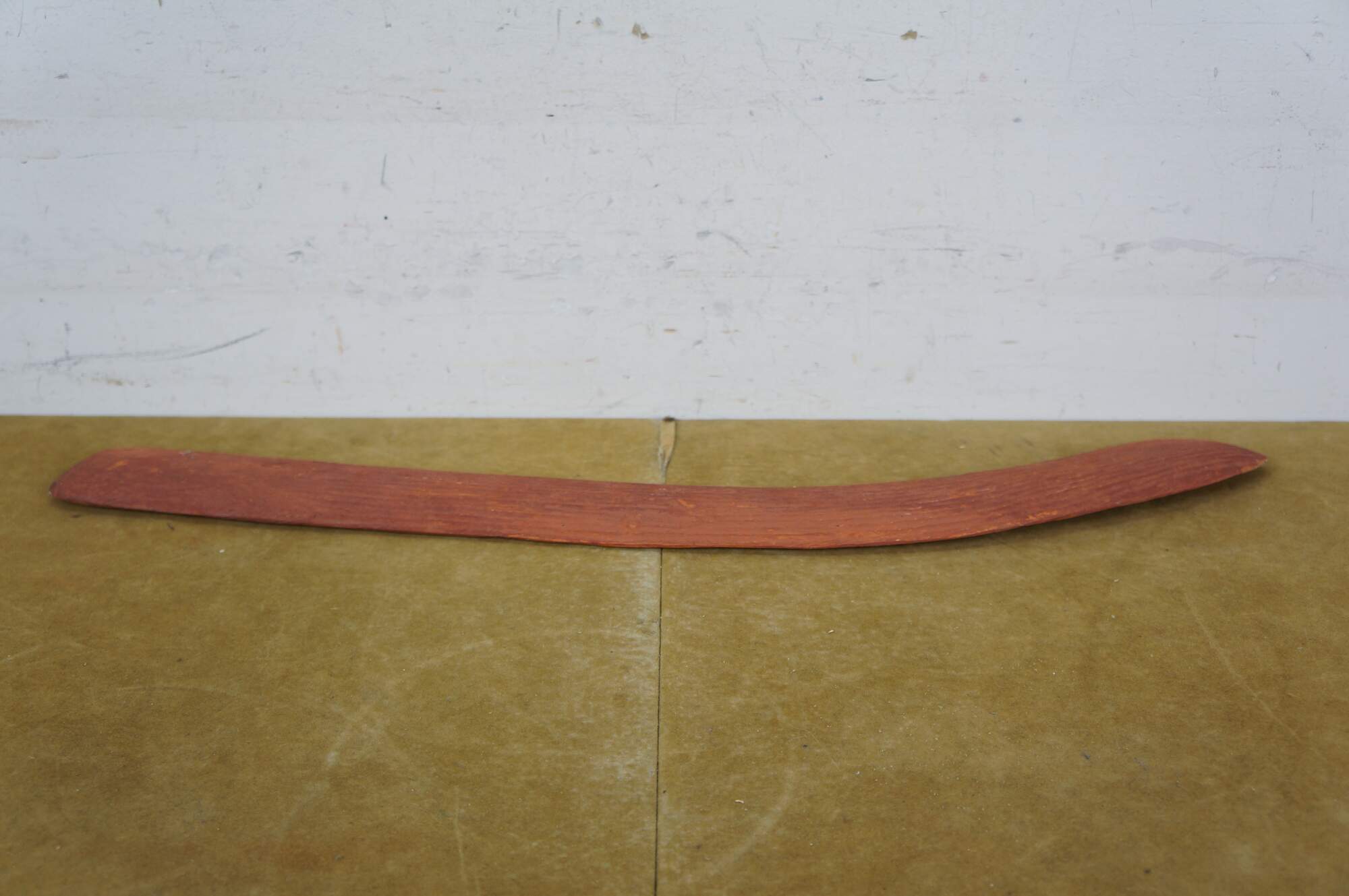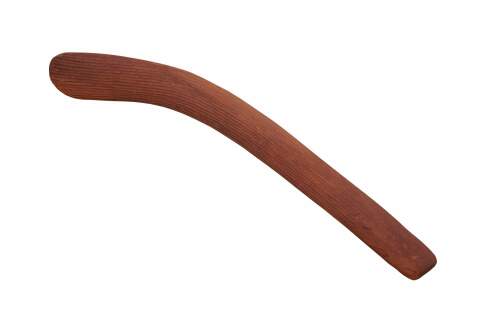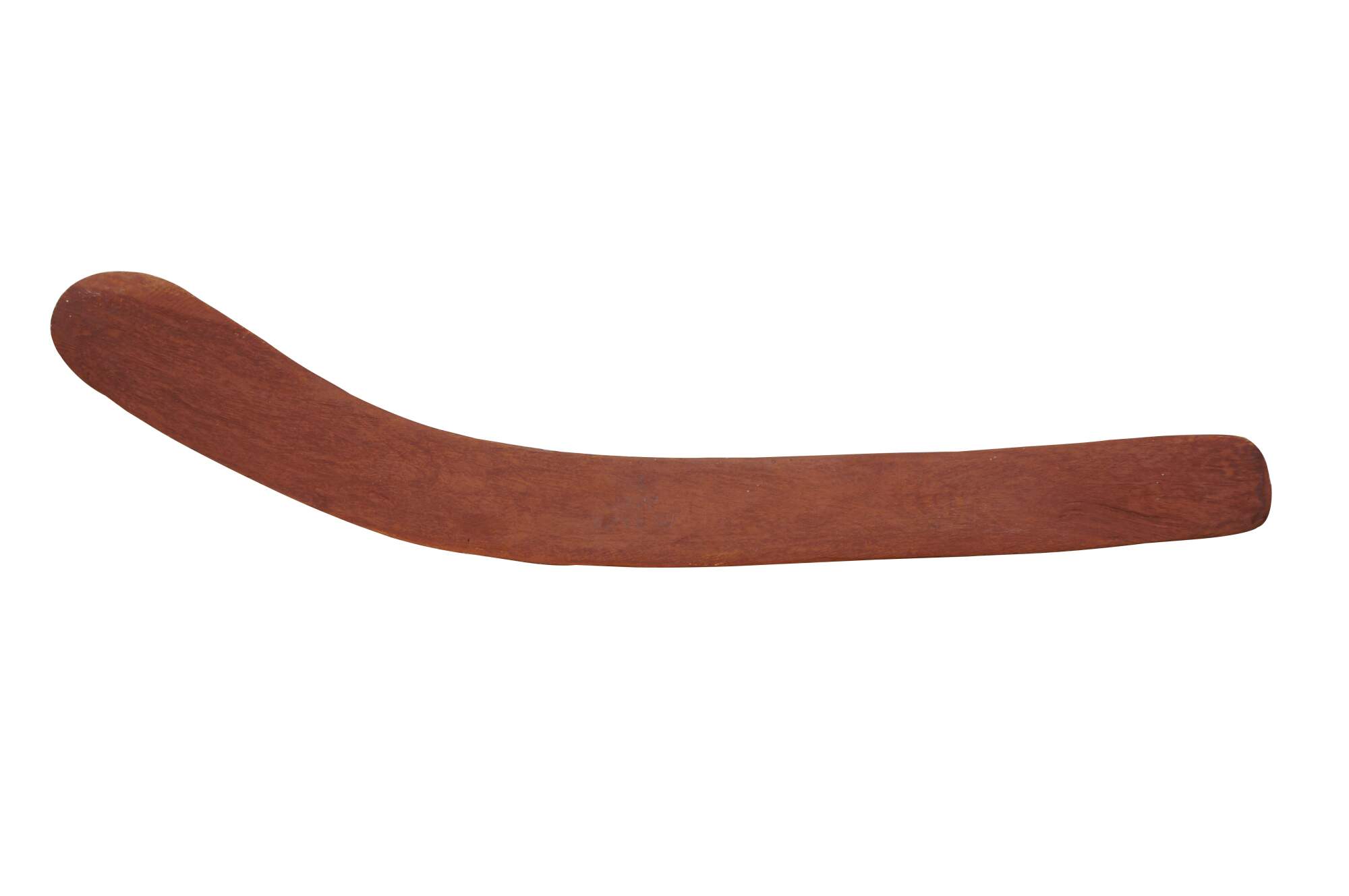 Late 20th century Australian aboriginal boomerang - asymmetrical shape made of reddish brown wood with a grooved front surface and smooth back.