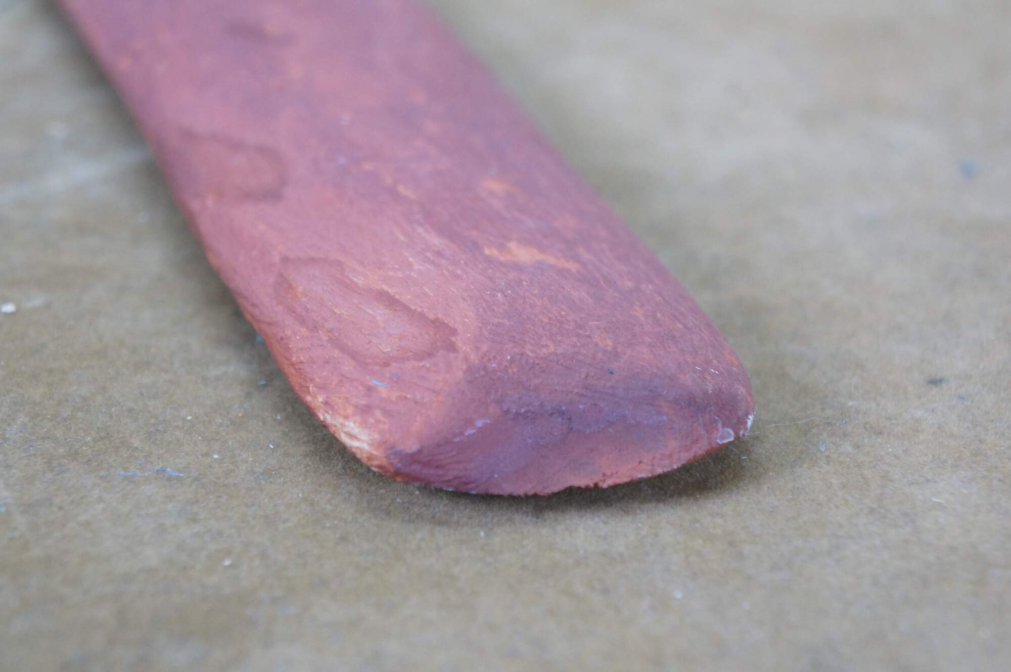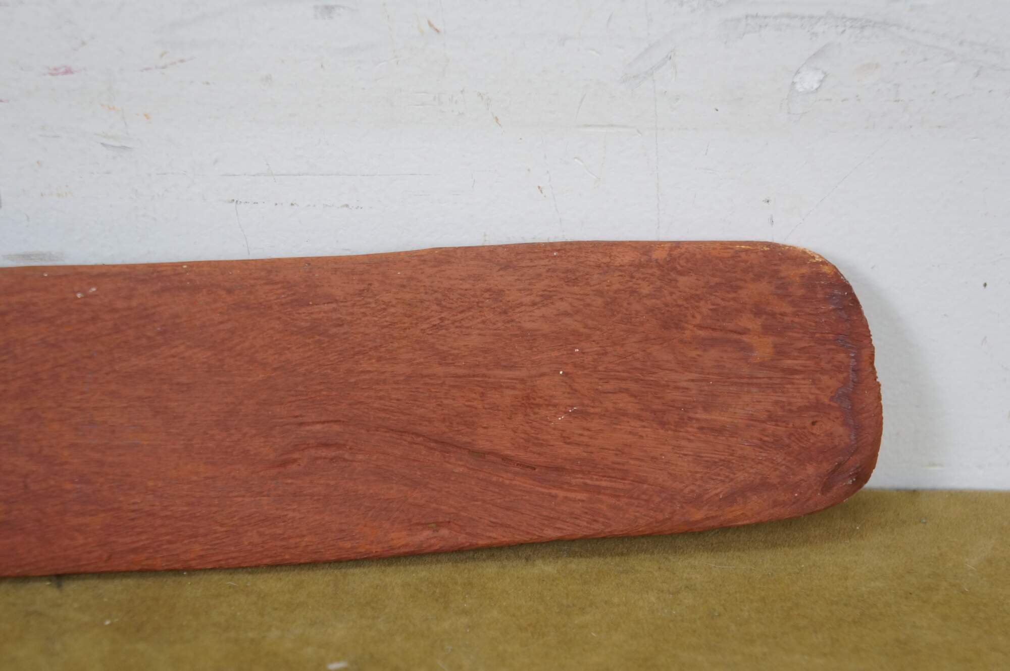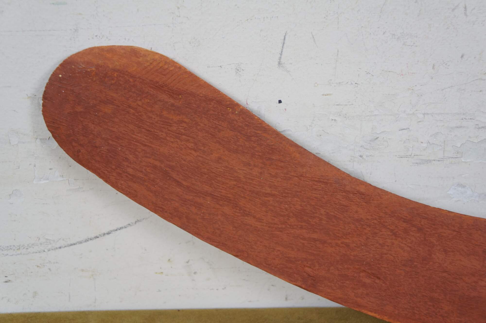 Late 20th century Australian aboriginal boomerang - asymmetrical shape made of reddish brown wood with a grooved front surface and smooth back.
