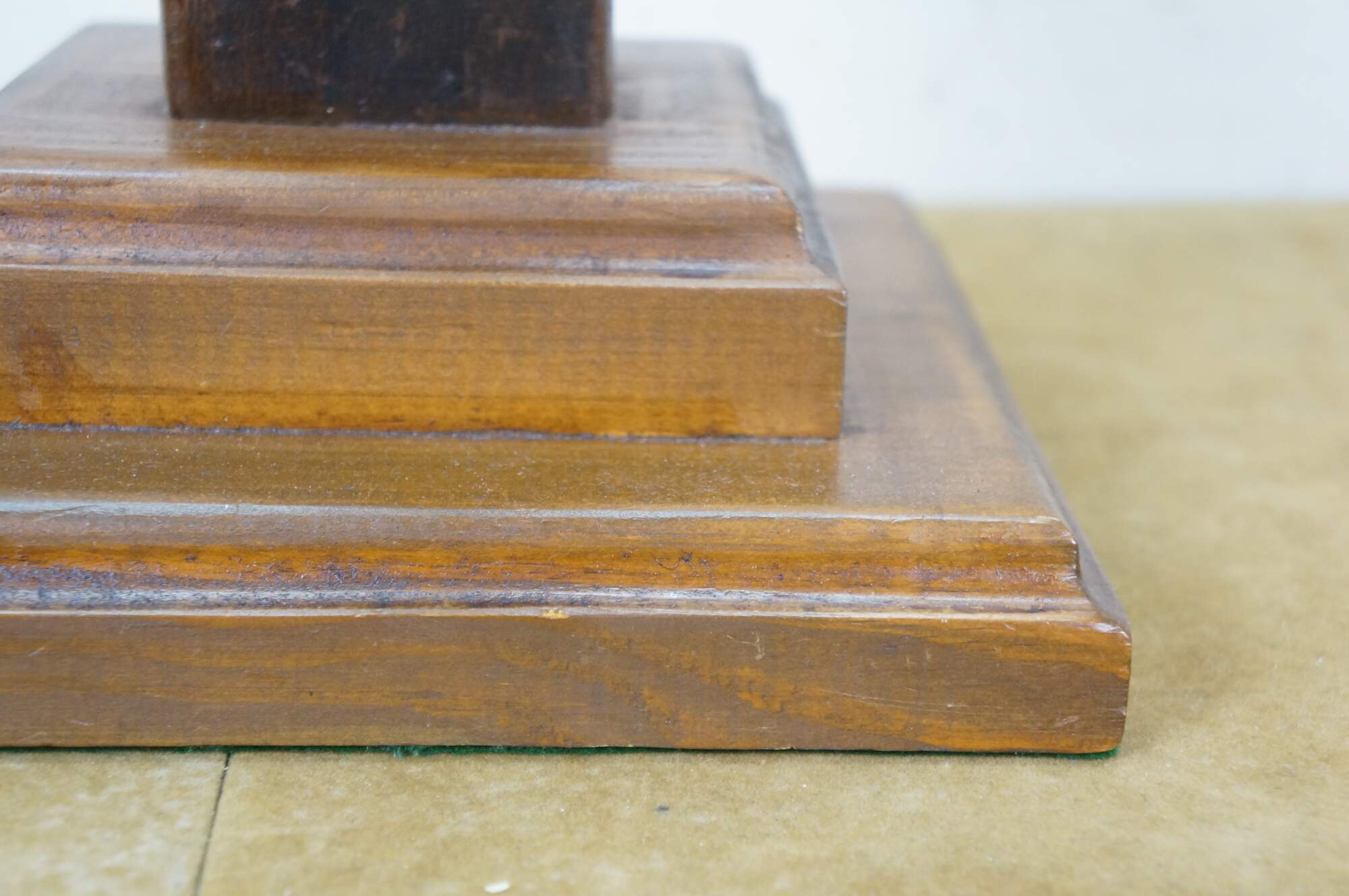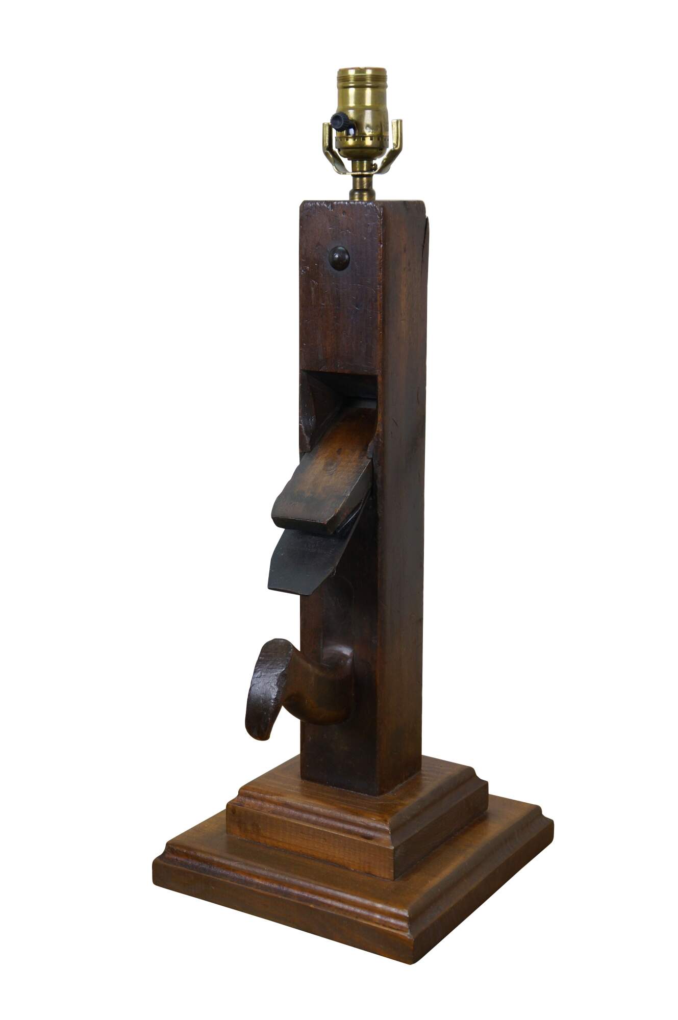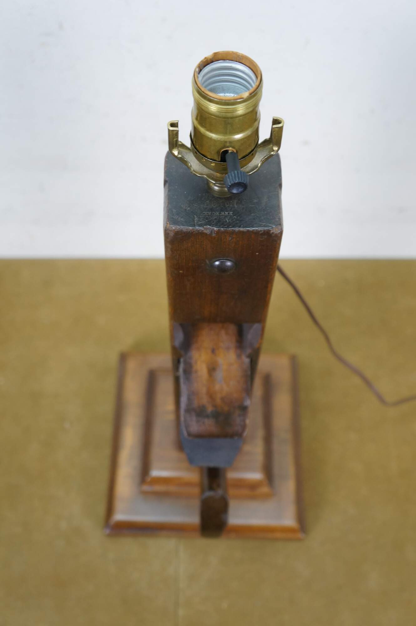 Early 20th century rustic wooden woodworking plane made into a lamp. The planer is from The Chapin Stephens Company, and at some point in time was repurposed into a table lamp with tiered square base. Includes harp, brass finial, and green, red, and gold plaid fabric shade. Chaplin Stephens, Pine Meadow Connecticut Union Factory.