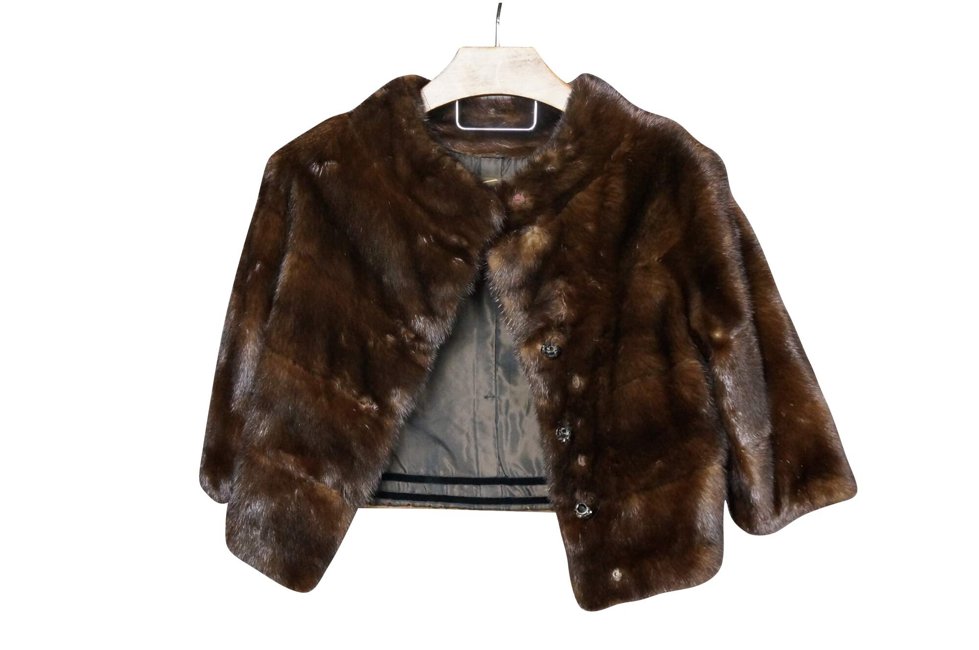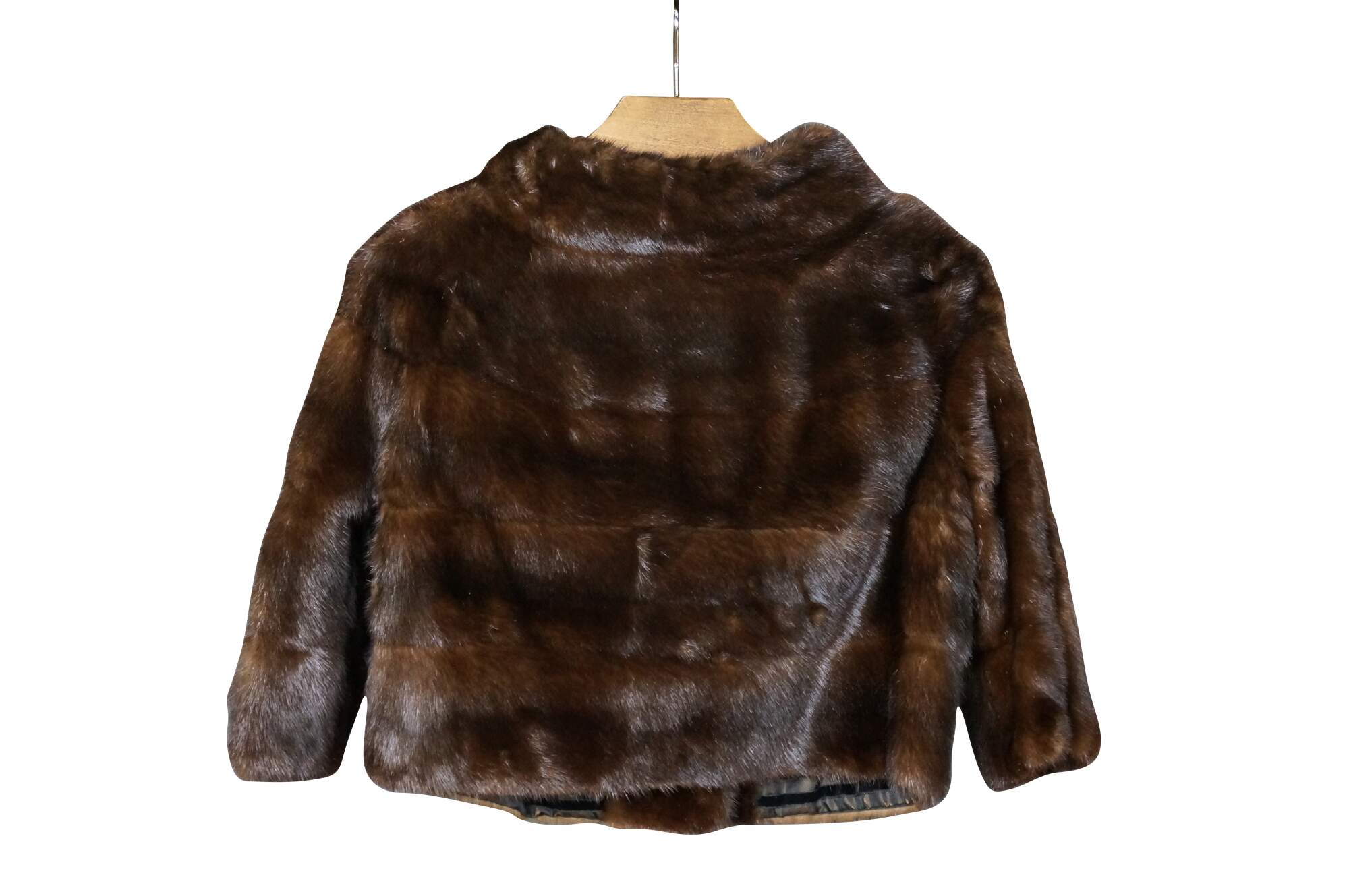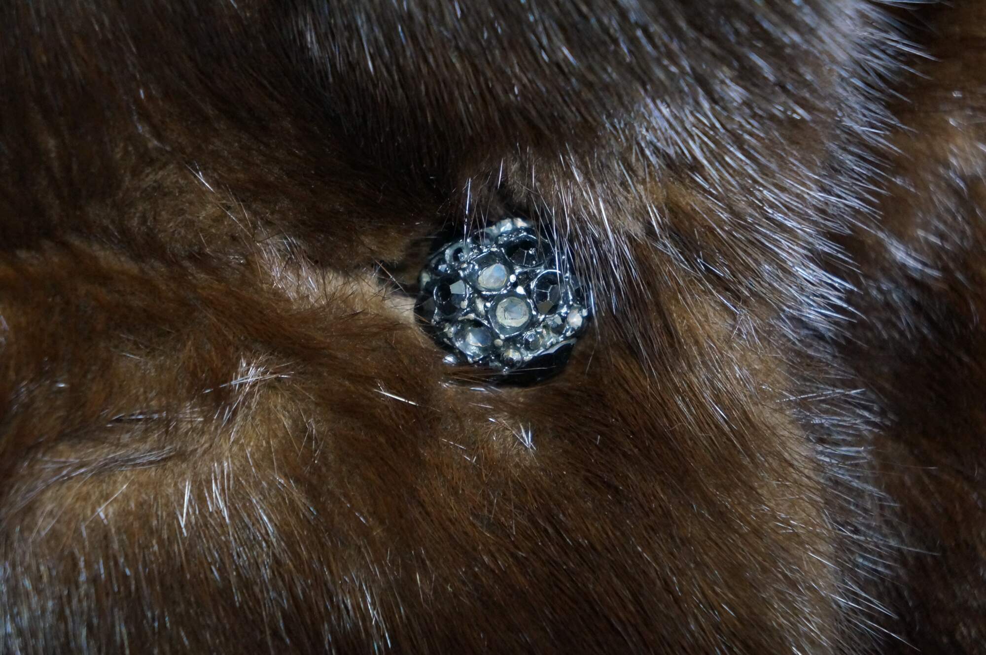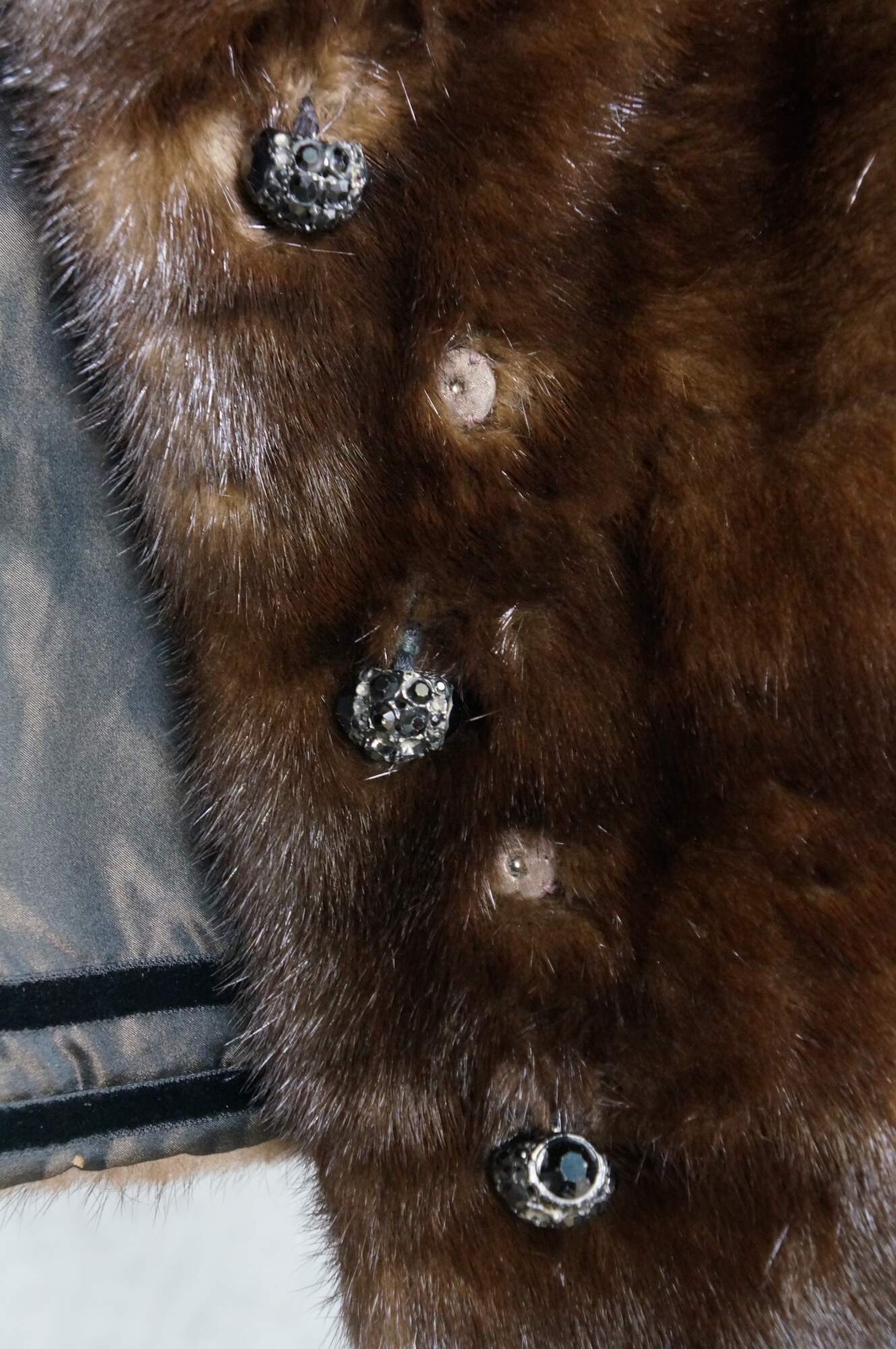 Mid to late 20th century dark brown natural taxidermy mink fur jacket. Cropped / bolero length; three quarter sleeves. Black rhinestone studded button closure. Black lining. Tarnopol's - Philadelphia.