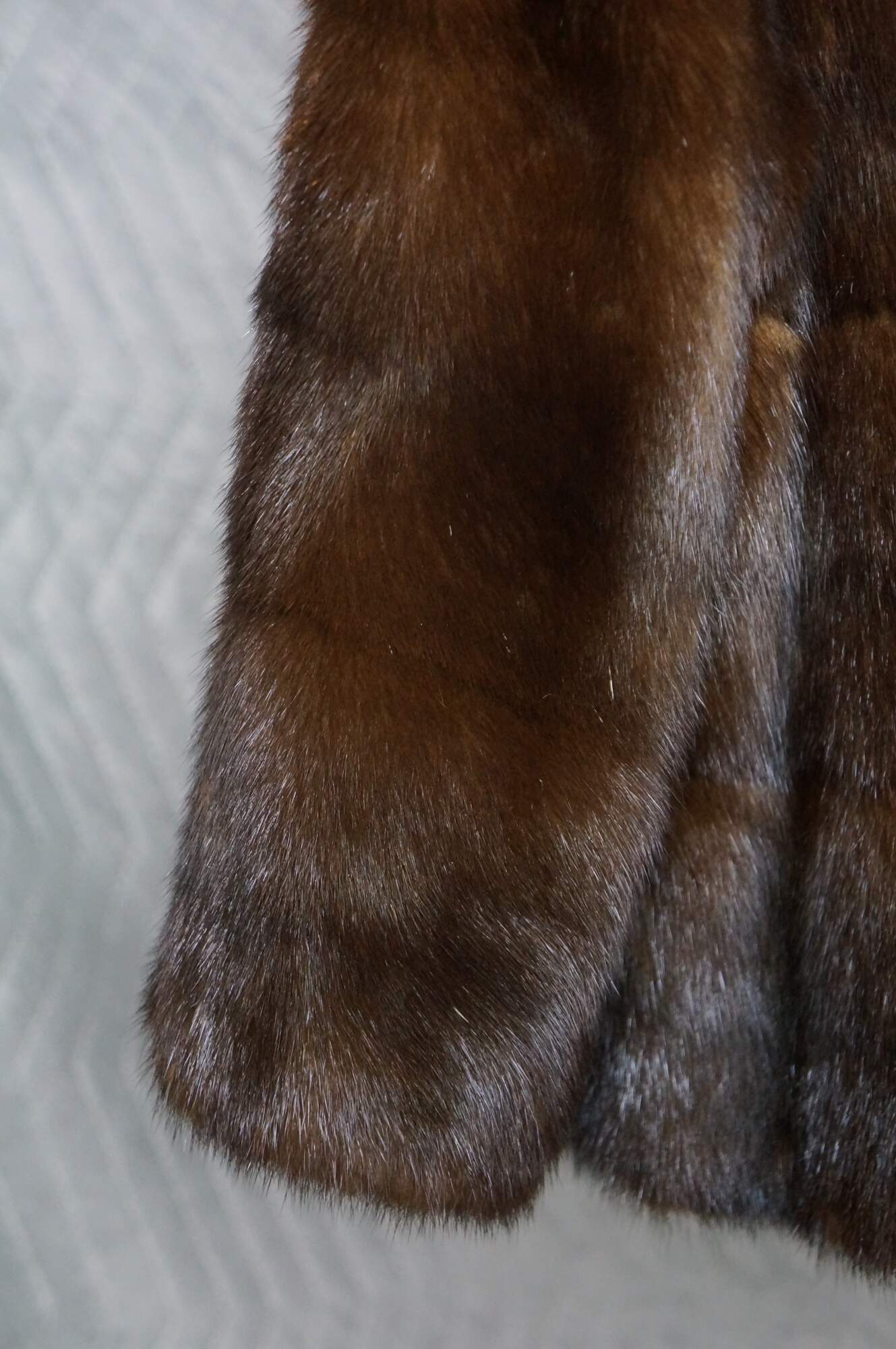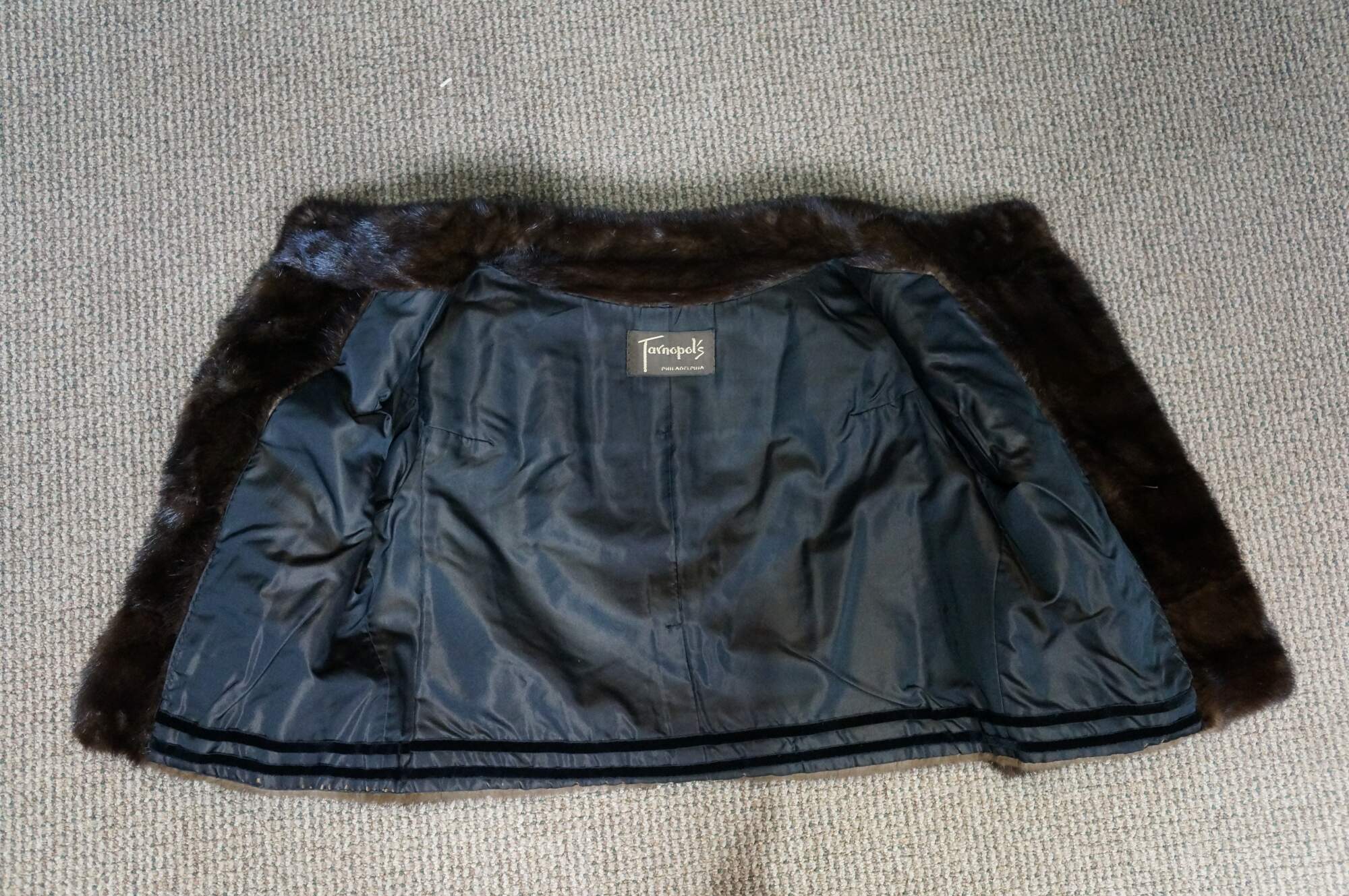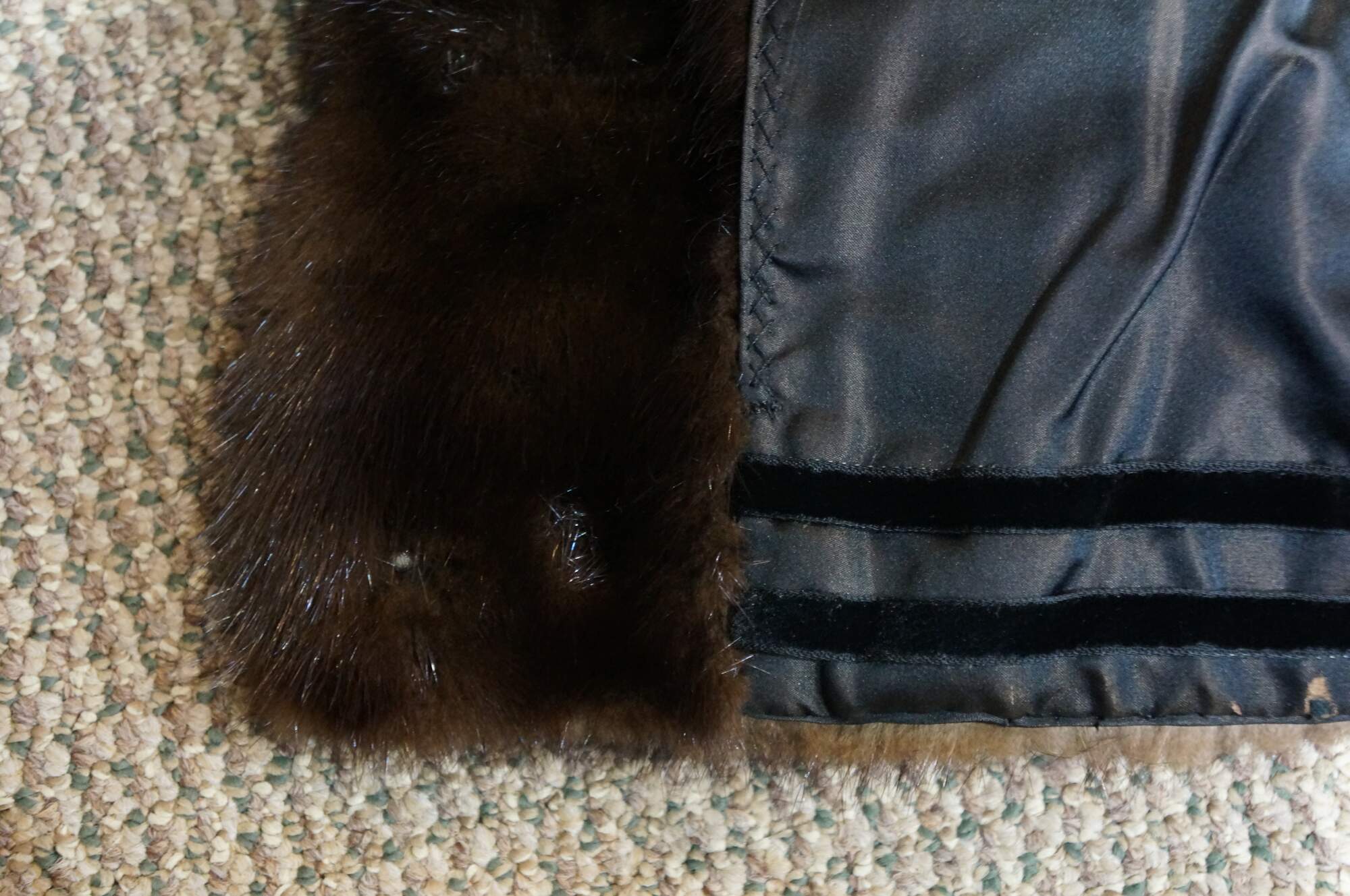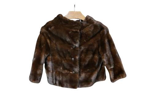 Mid to late 20th century dark brown natural taxidermy mink fur jacket. Cropped / bolero length; three quarter sleeves. Black rhinestone studded button closure. Black lining. Tarnopol's - Philadelphia.