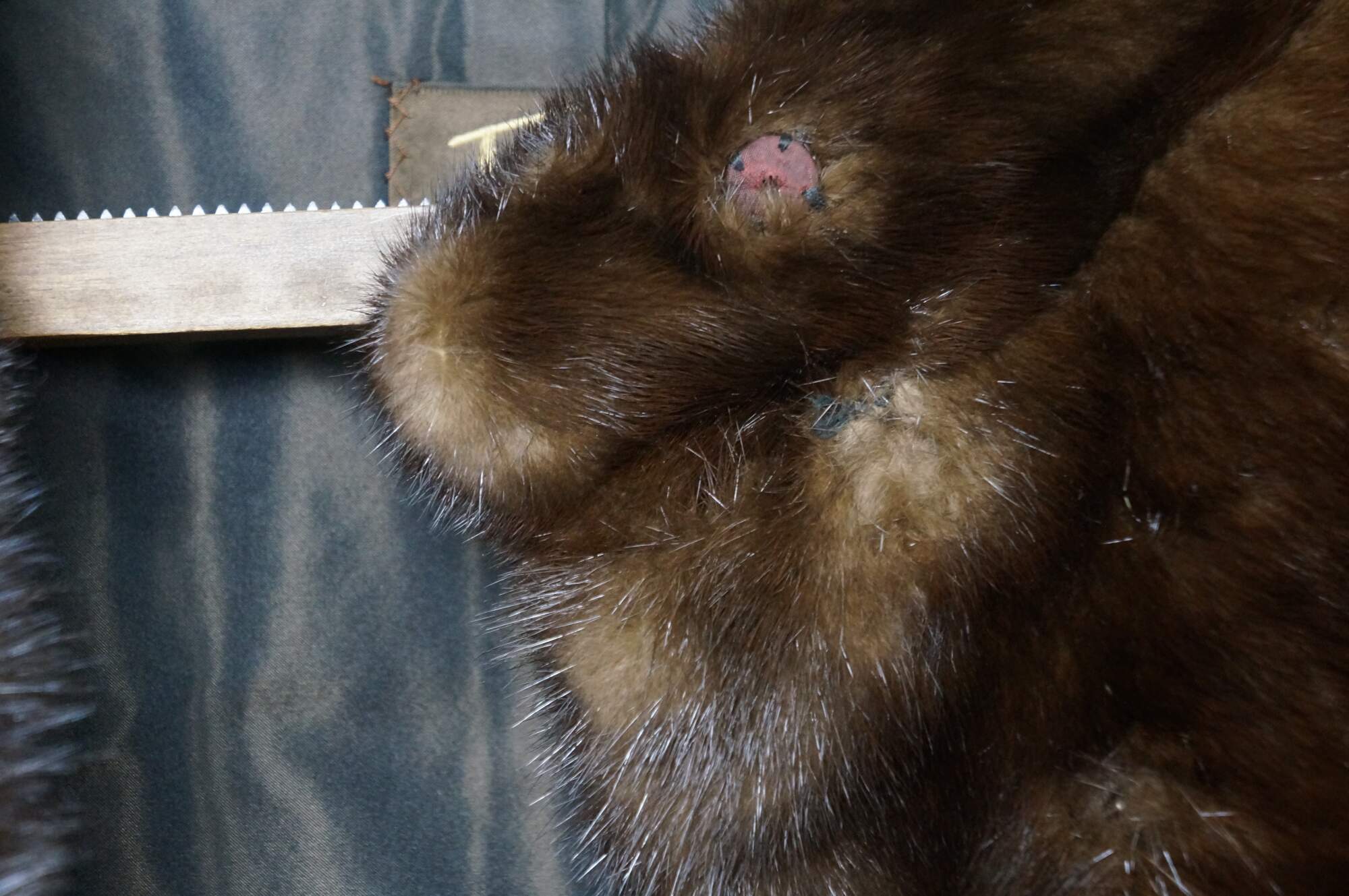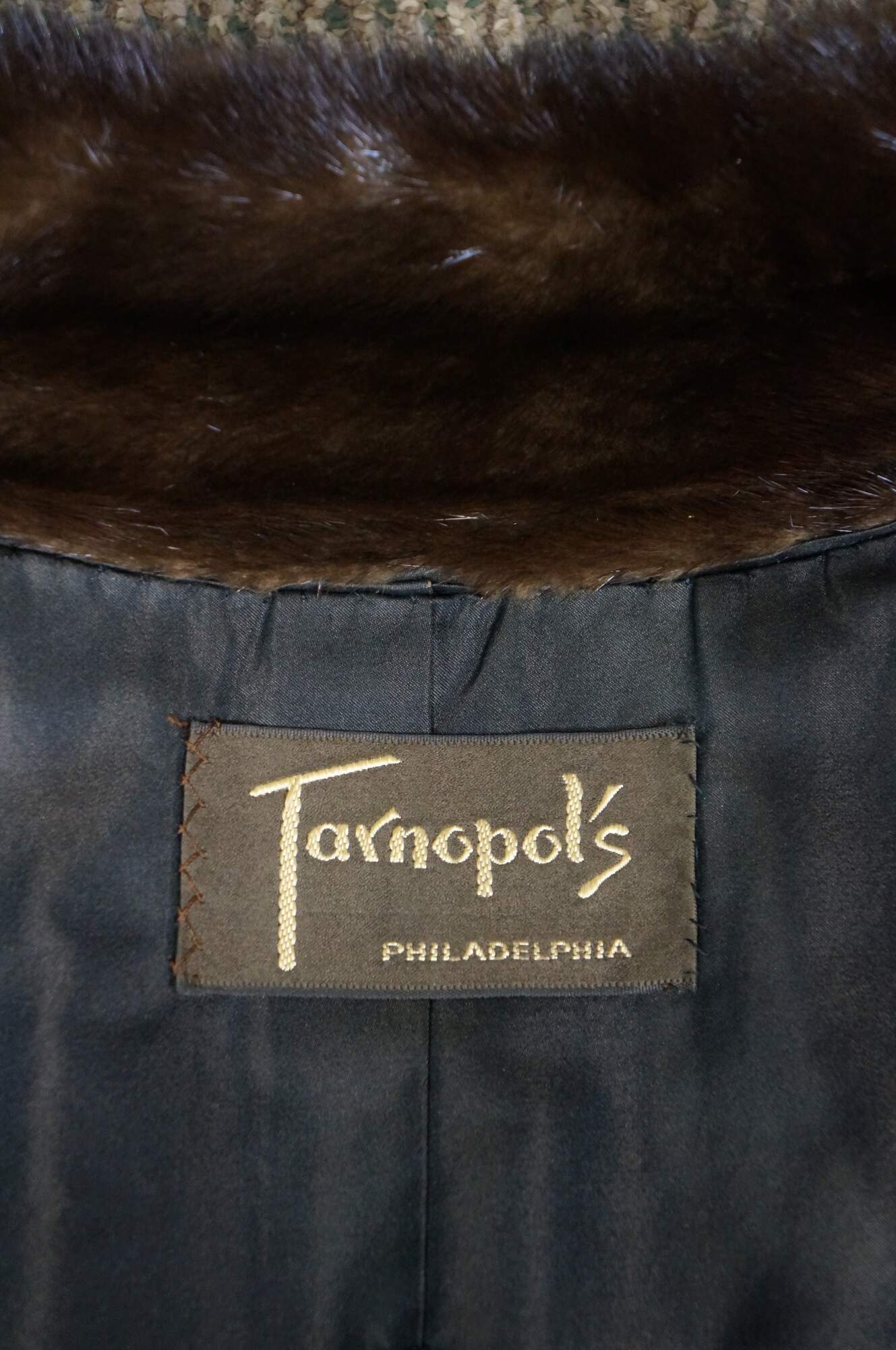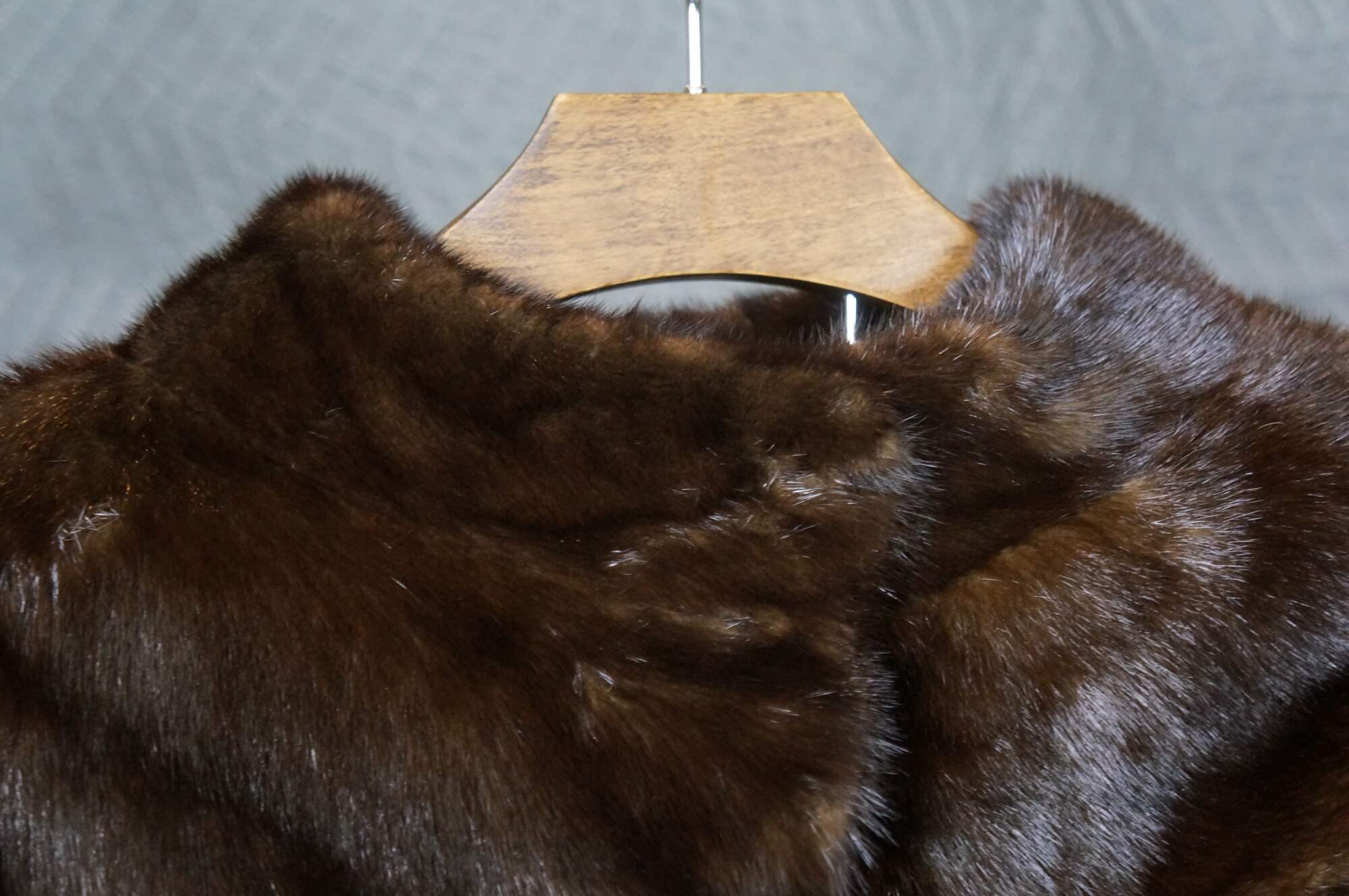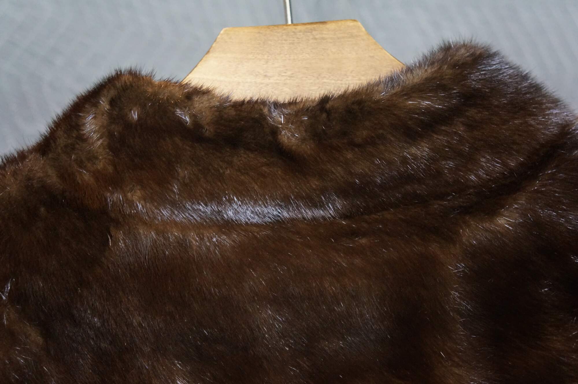Mid to late 20th century dark brown natural taxidermy mink fur jacket. Cropped / bolero length; three quarter sleeves. Black rhinestone studded button closure. Black lining. Tarnopol's - Philadelphia.