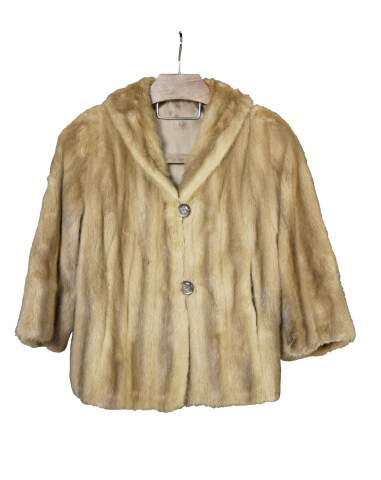 Mid to late 20th century light brown natural taxidermy mink fur jacket / coat. Short / hip length; floral plastic button closure; two exterior side pockets. Dandelion embroidered taupe lining. Lazarus - Columbus.