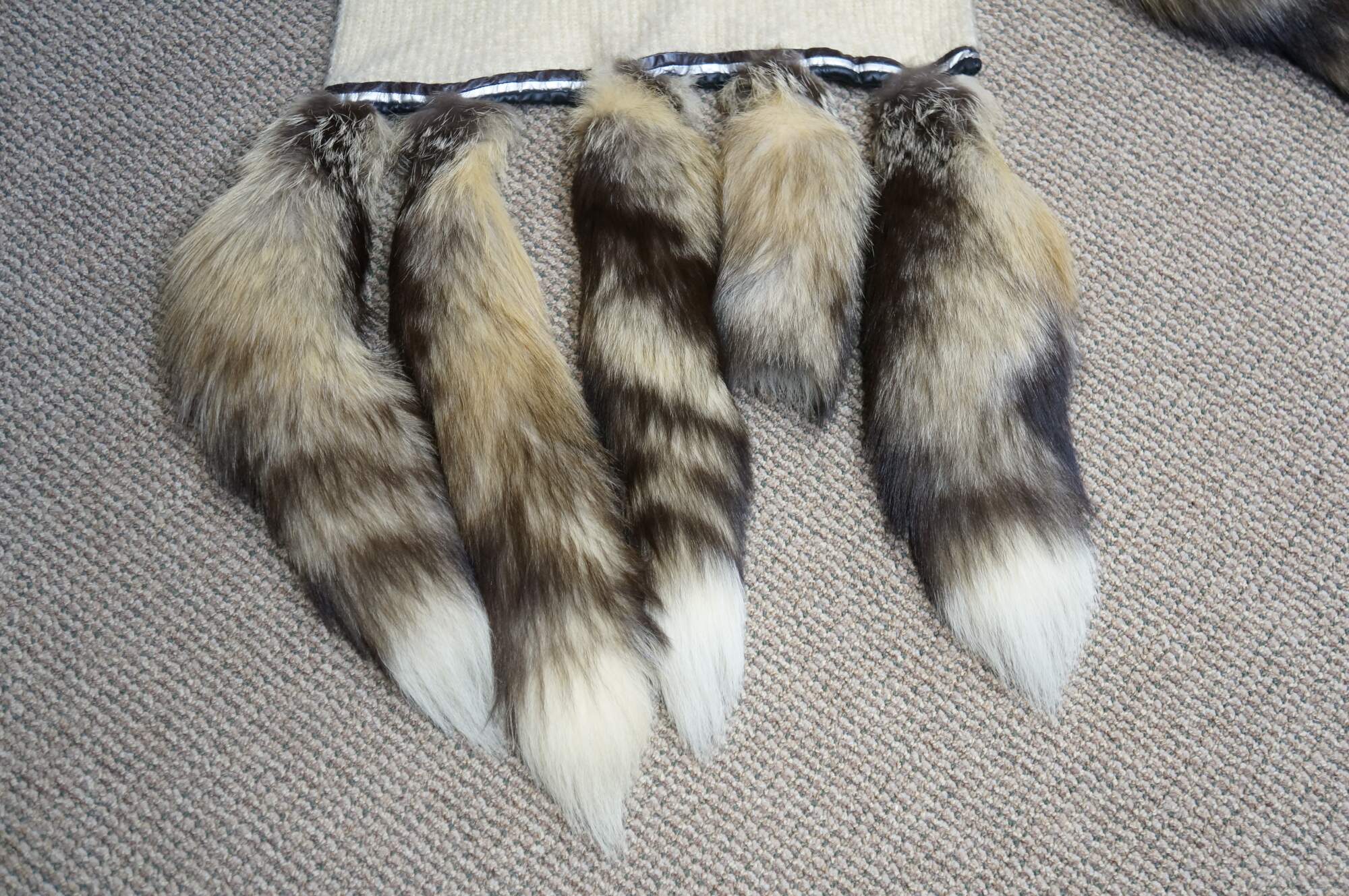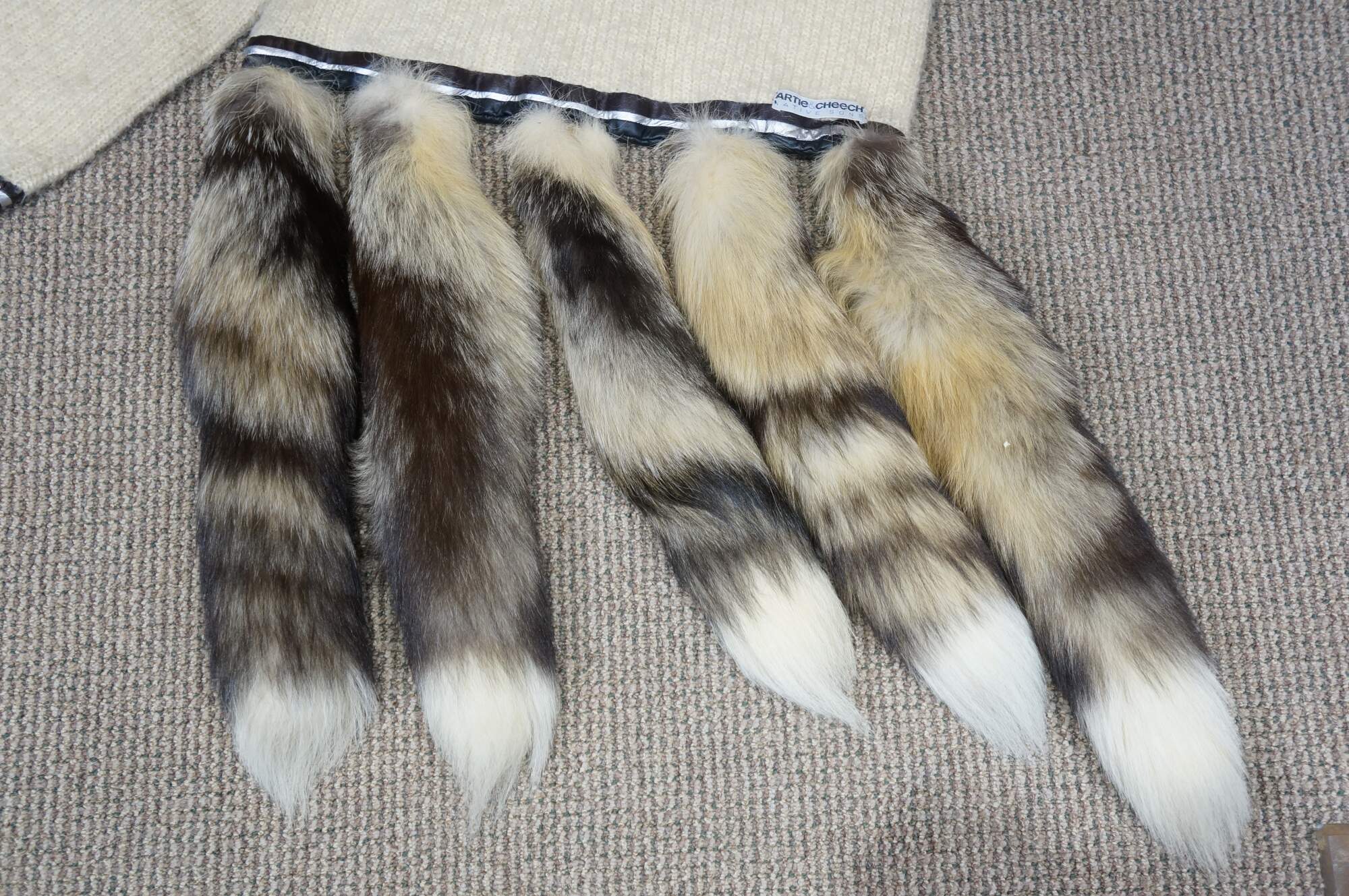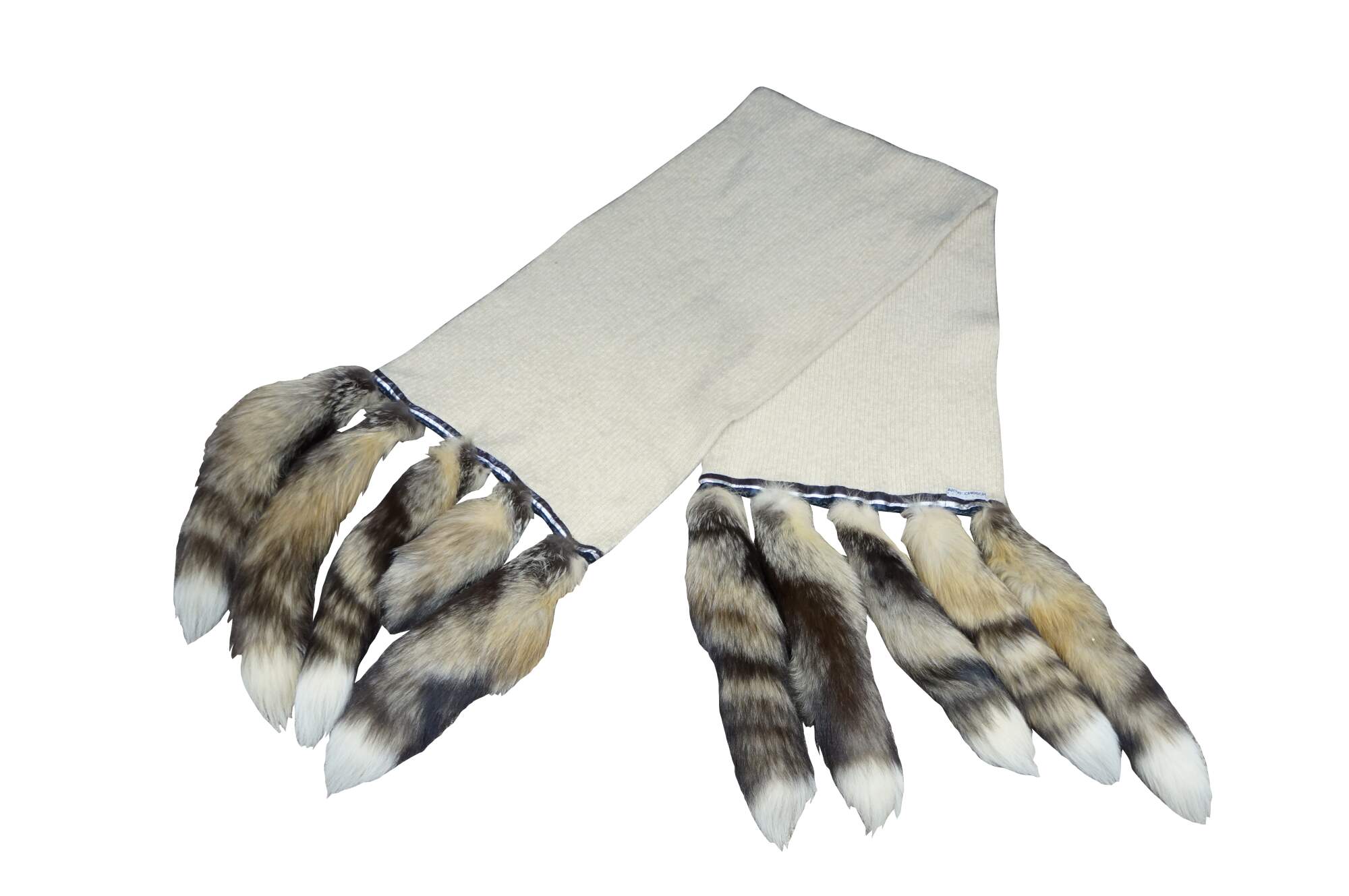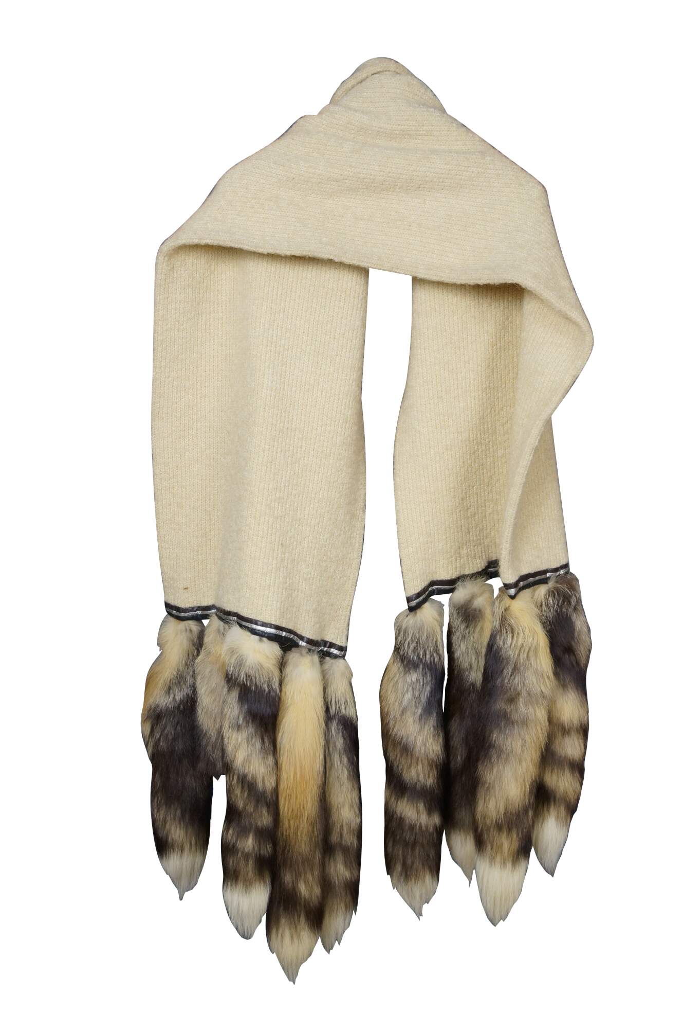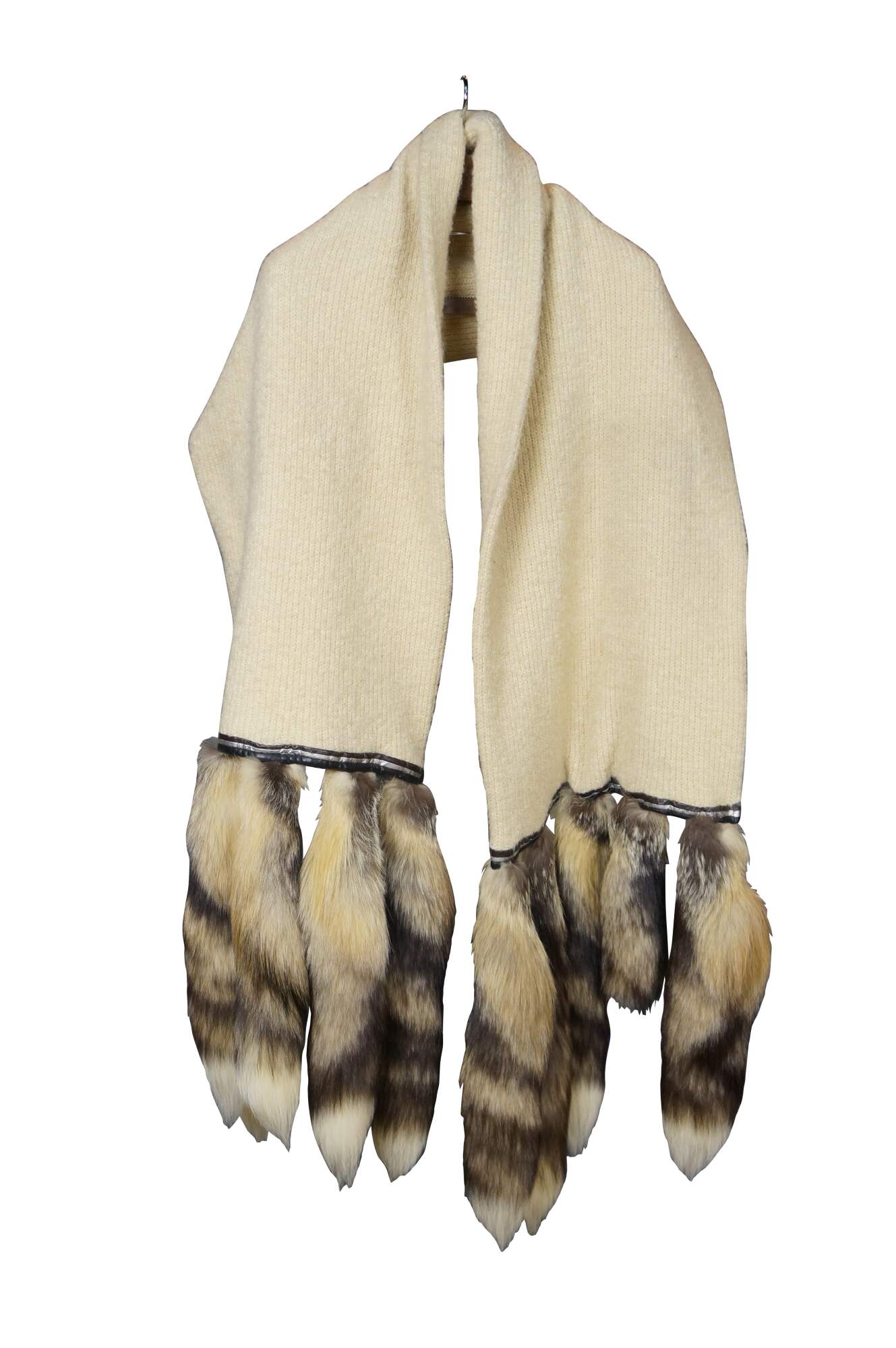 Late 20th century double layered cream colored Southwestern hunt theme knit wool wrapper / shawl / scarf, trimmed with brown and silver leather binding and ten natural tasseled taxidermy fox tails. Artie & Cheech - Native Sons.