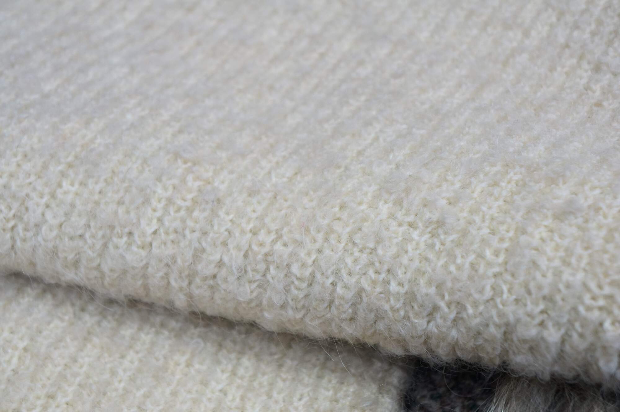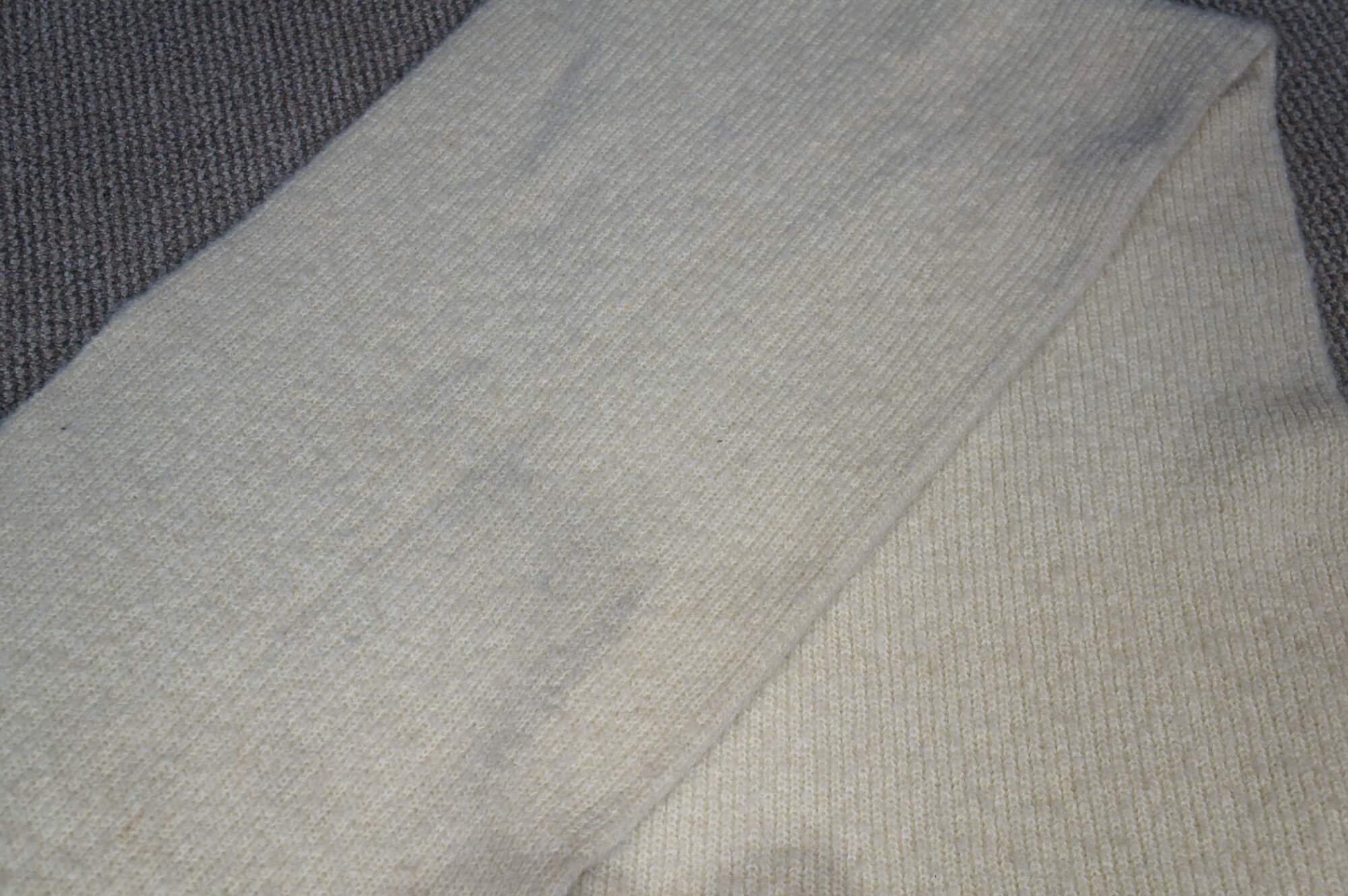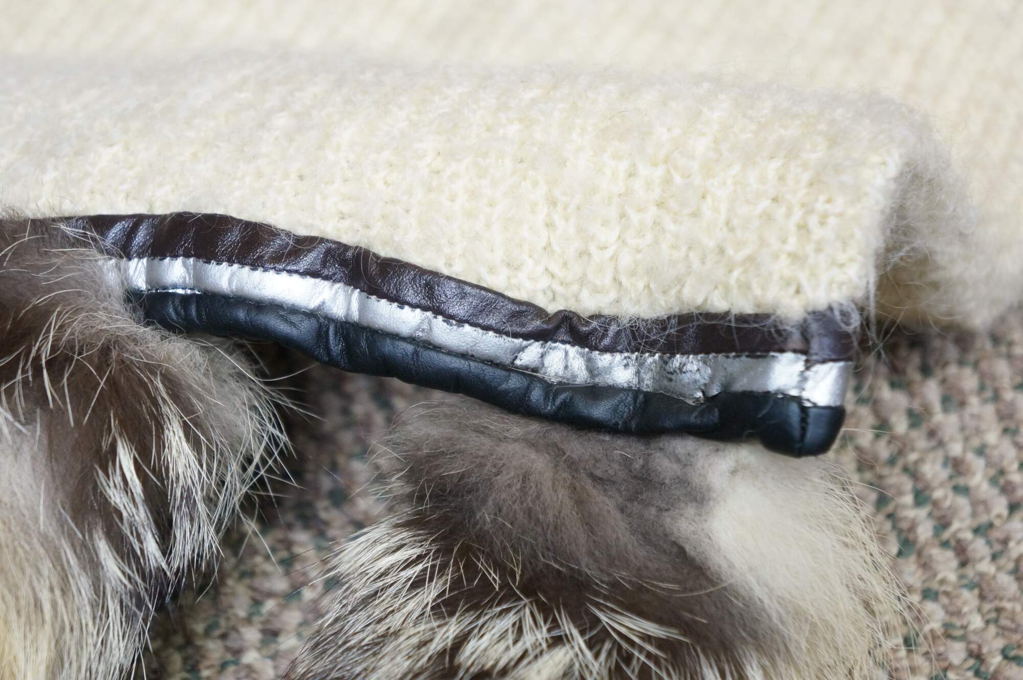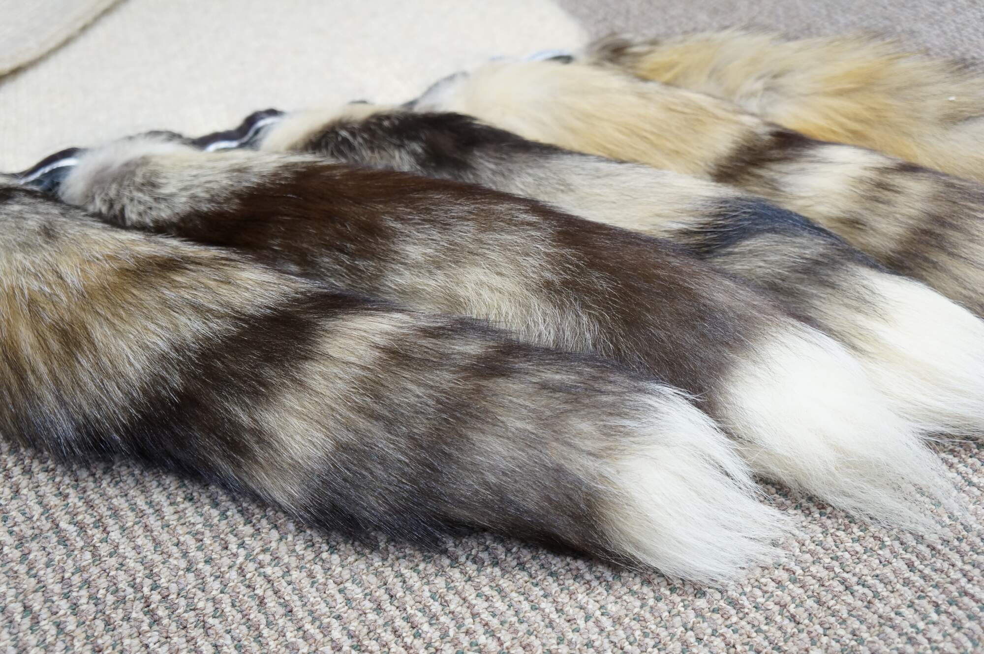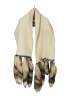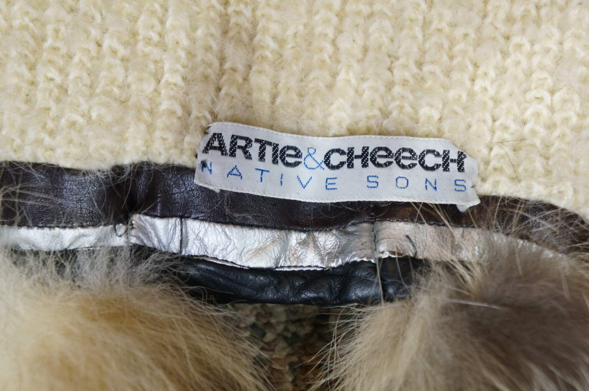 Late 20th century double layered cream colored Southwestern hunt theme knit wool wrapper / shawl / scarf, trimmed with brown and silver leather binding and ten natural tasseled taxidermy fox tails. Artie & Cheech - Native Sons.