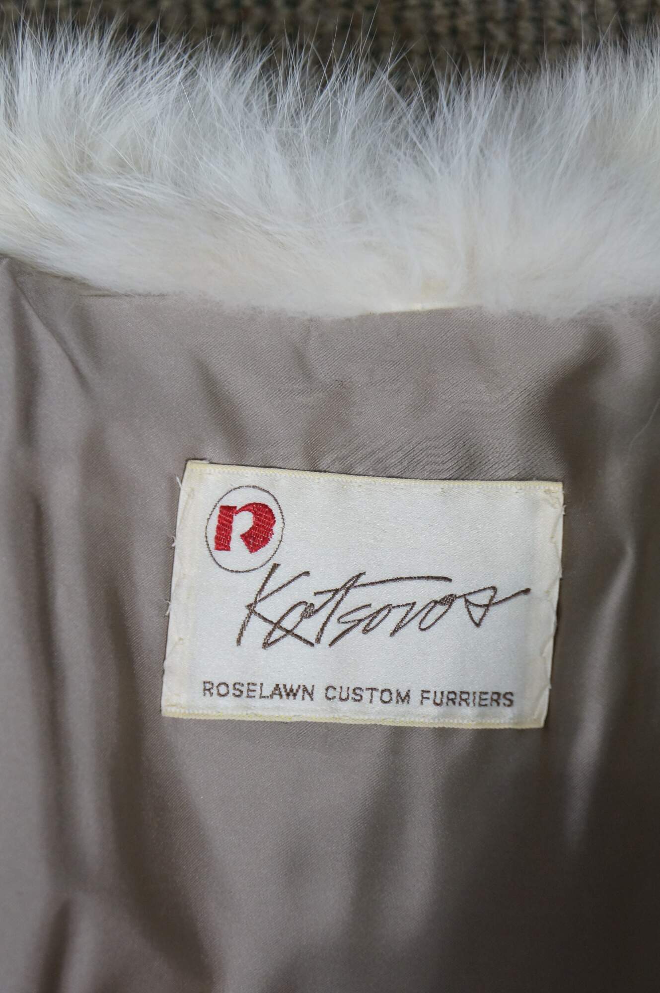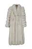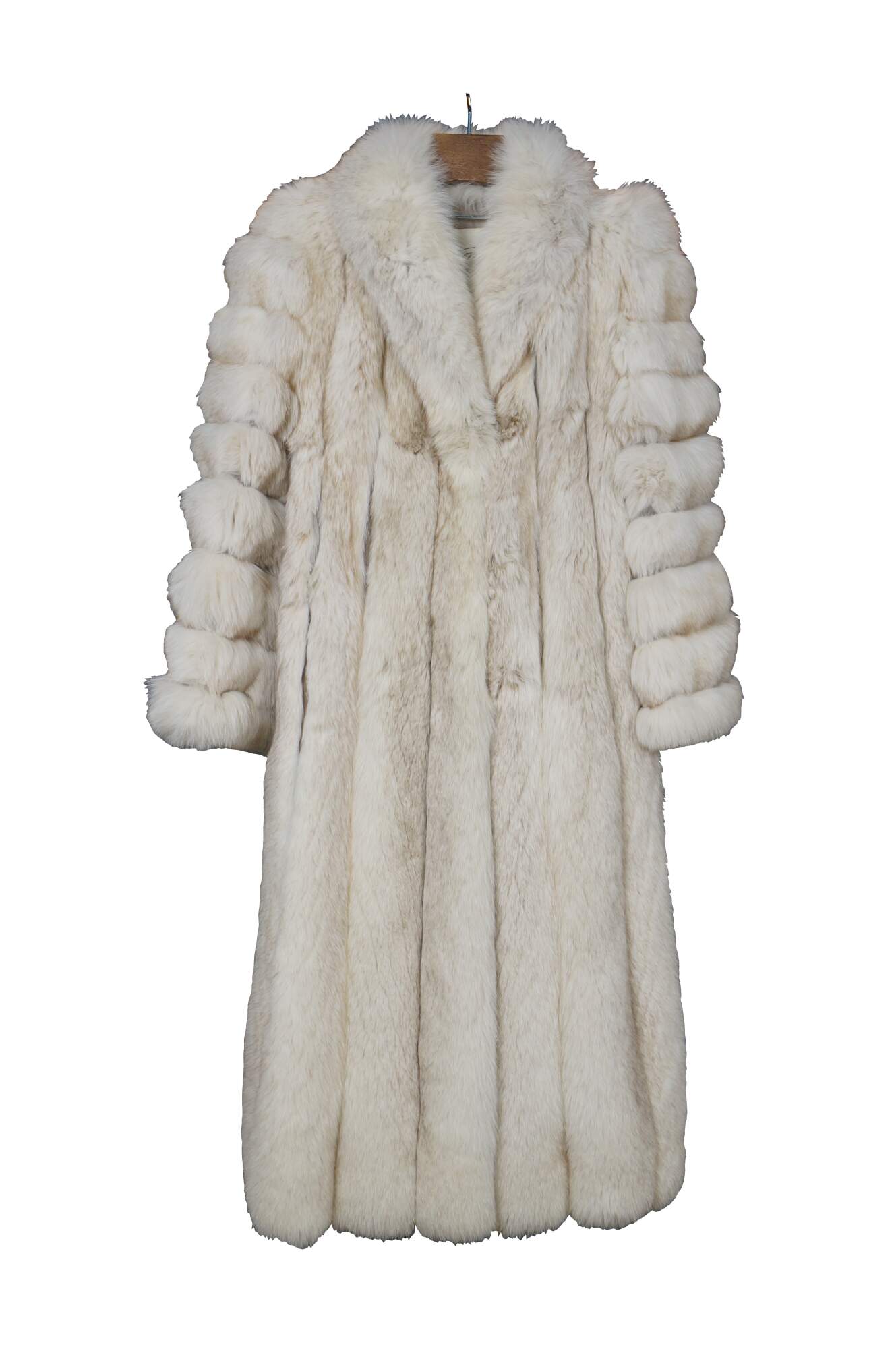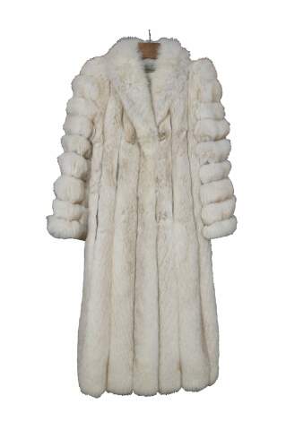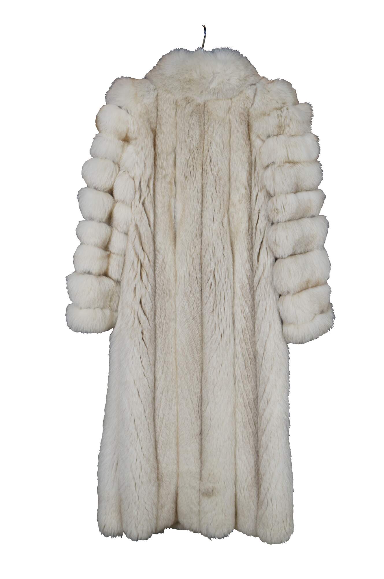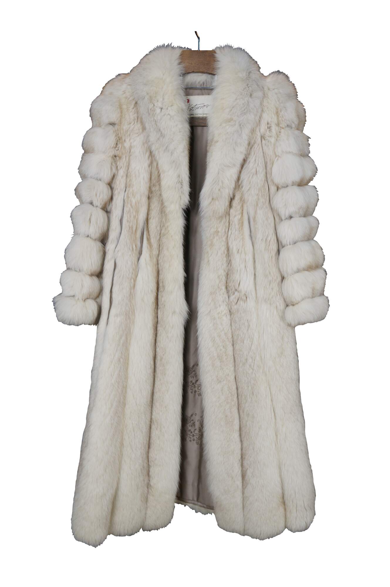 Mid to late 20th century natural blue / silver fox taxidermy fur coat. Full length; textured sleeves; hook and loop closure; no exterior pockets. Floral embroidered taupe lining. One interior breast pocket. Kotsovos - Roselawn Custom Furriers.