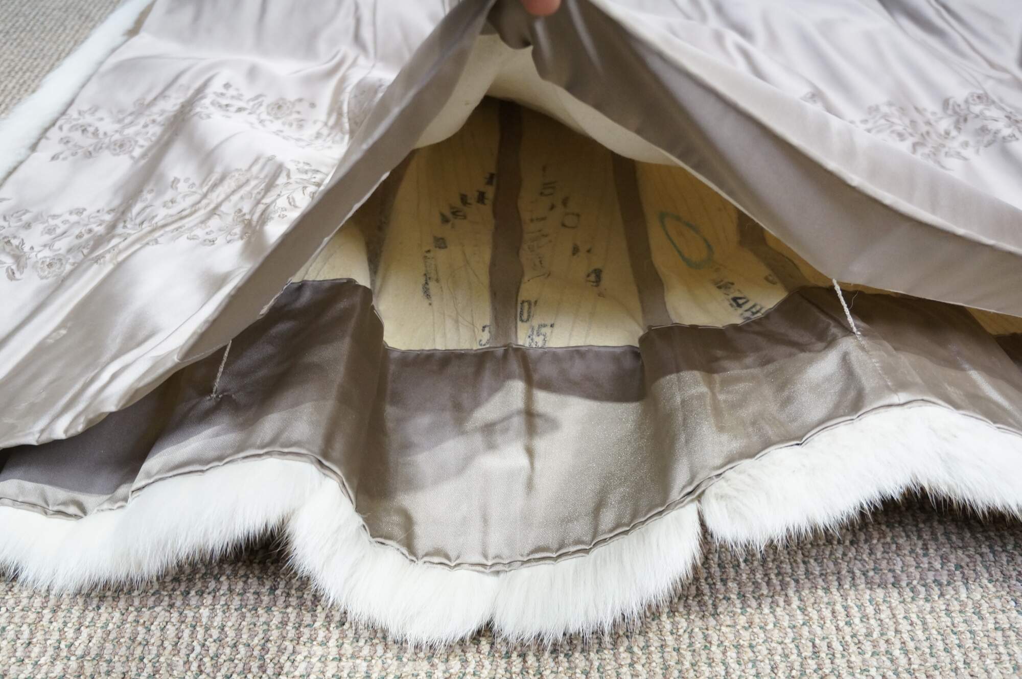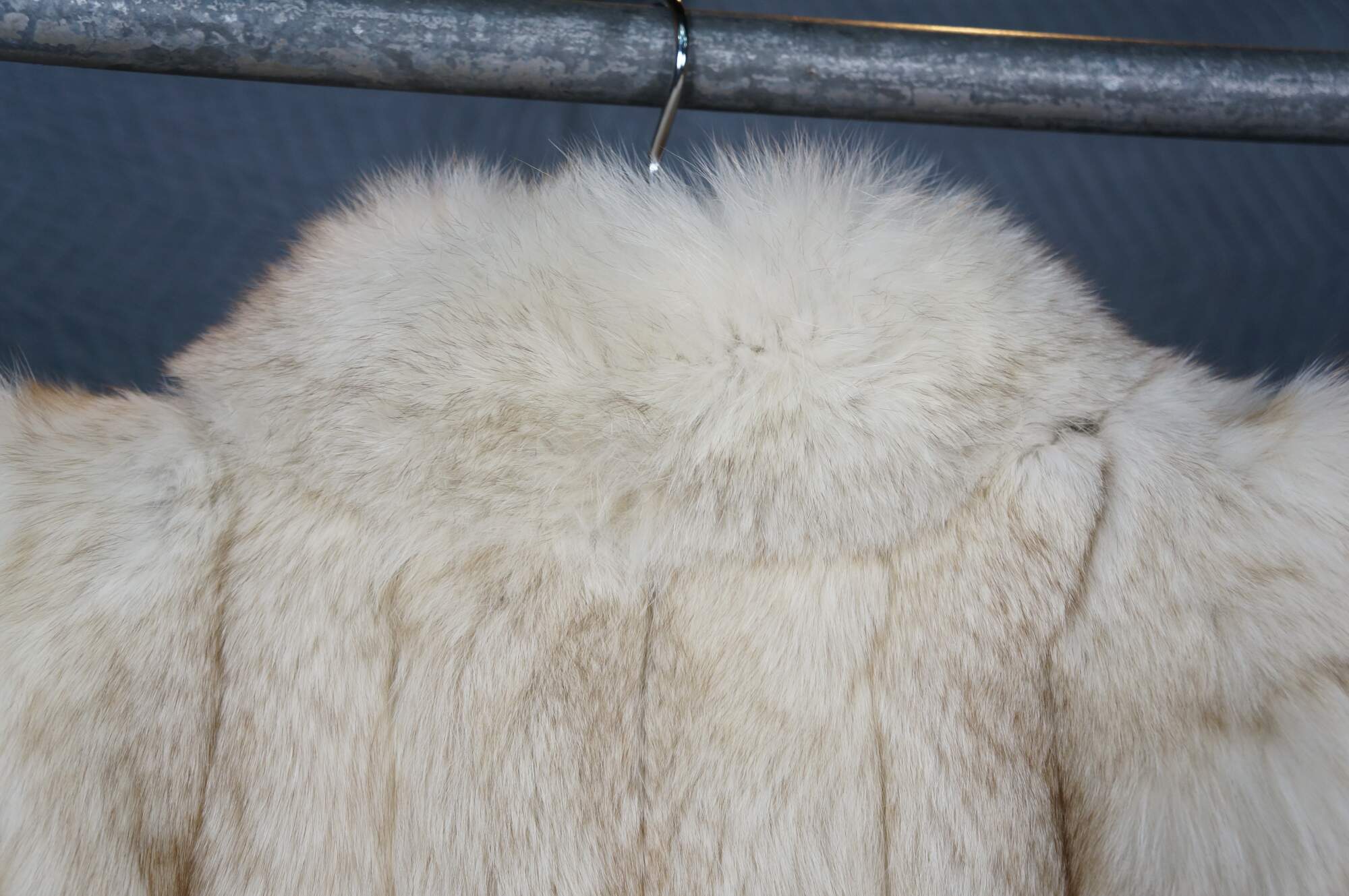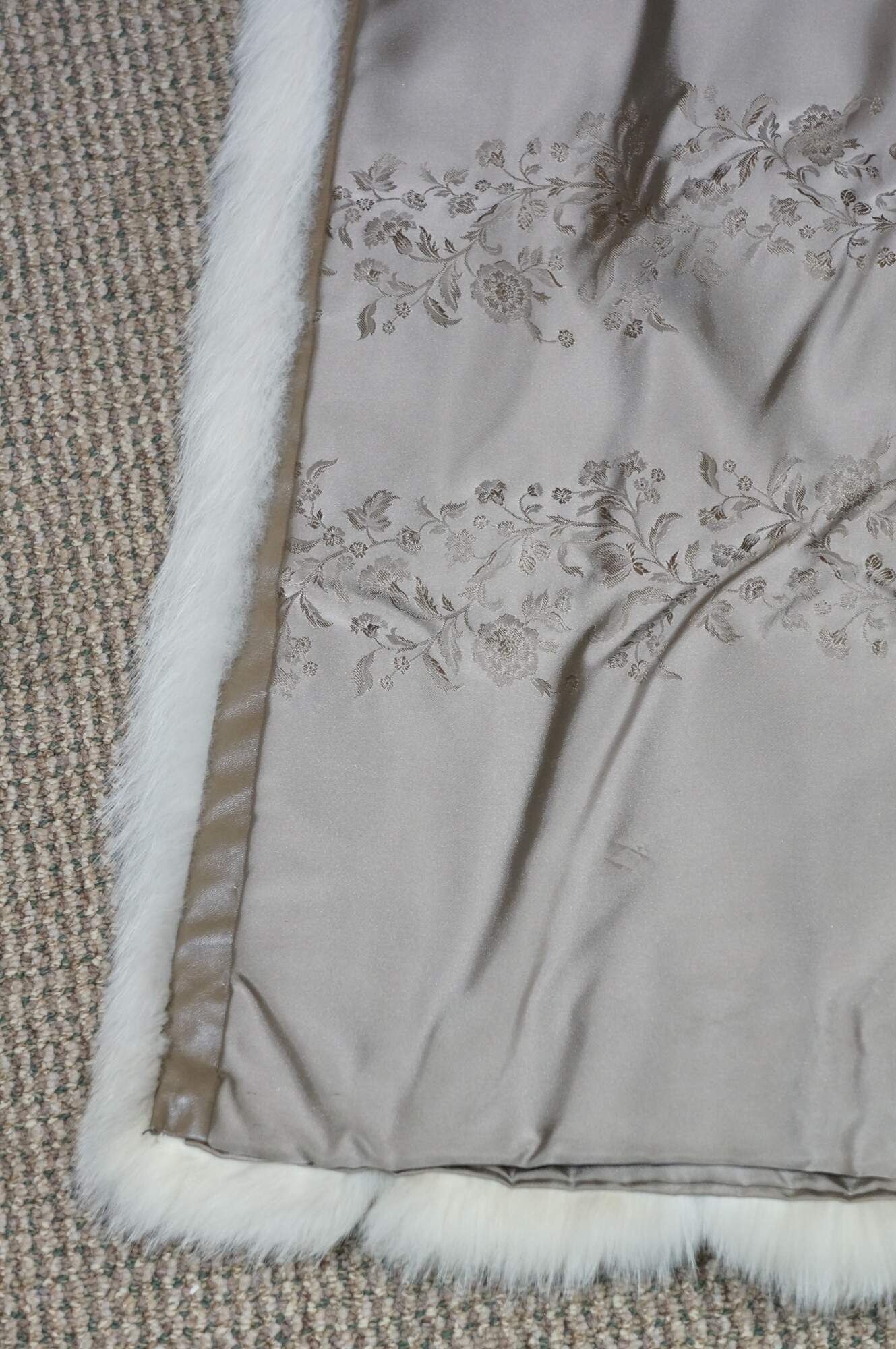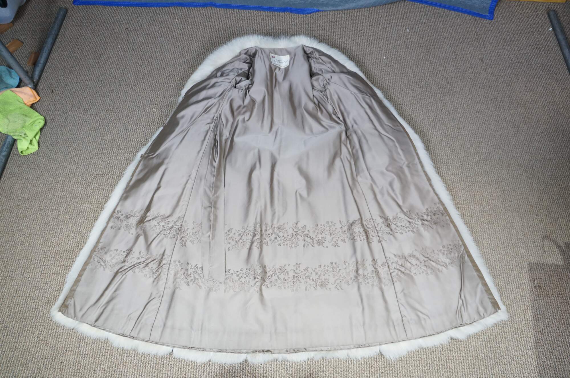 Mid to late 20th century natural blue / silver fox taxidermy fur coat. Full length; textured sleeves; hook and loop closure; no exterior pockets. Floral embroidered taupe lining. One interior breast pocket. Kotsovos - Roselawn Custom Furriers.