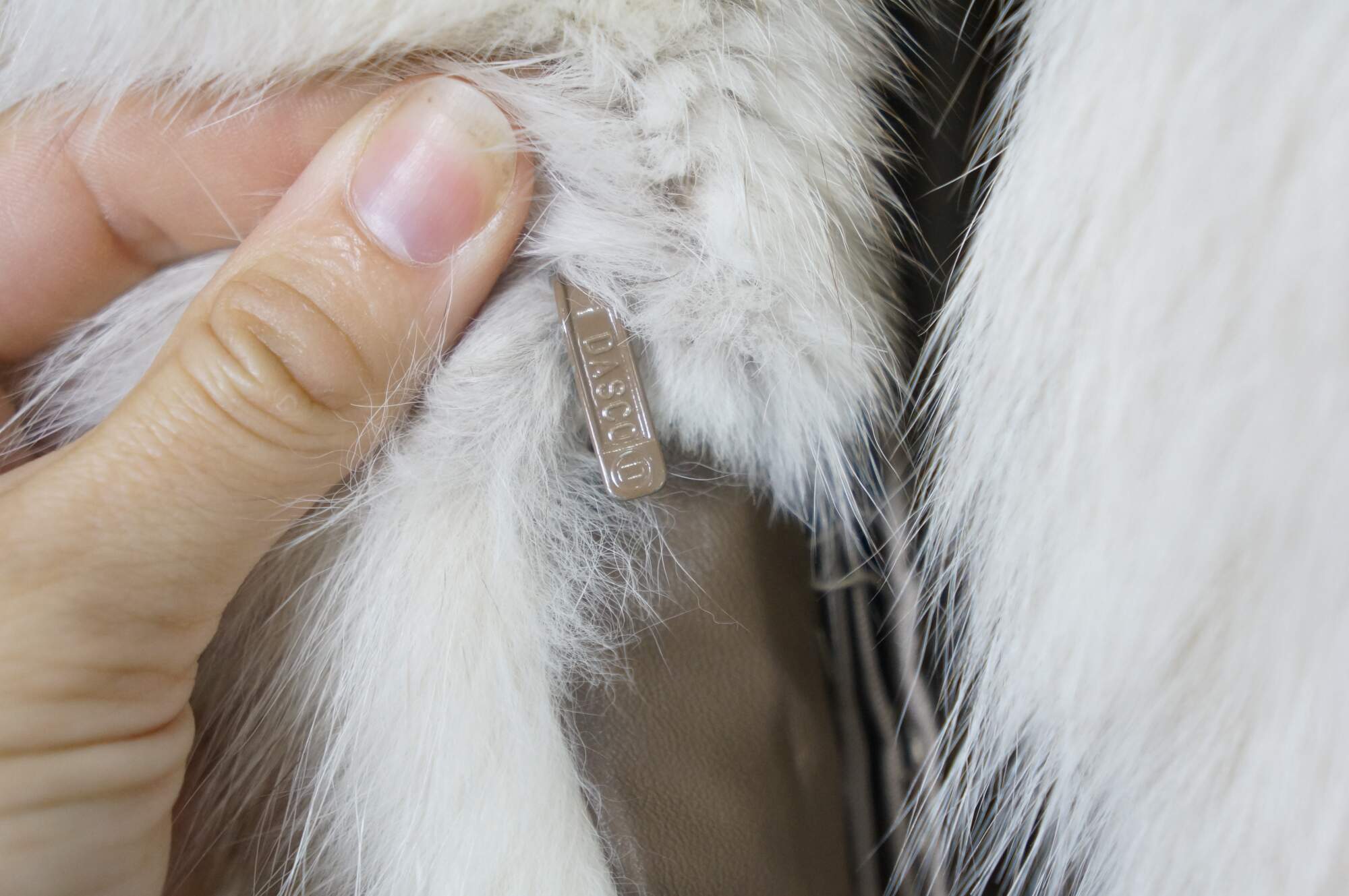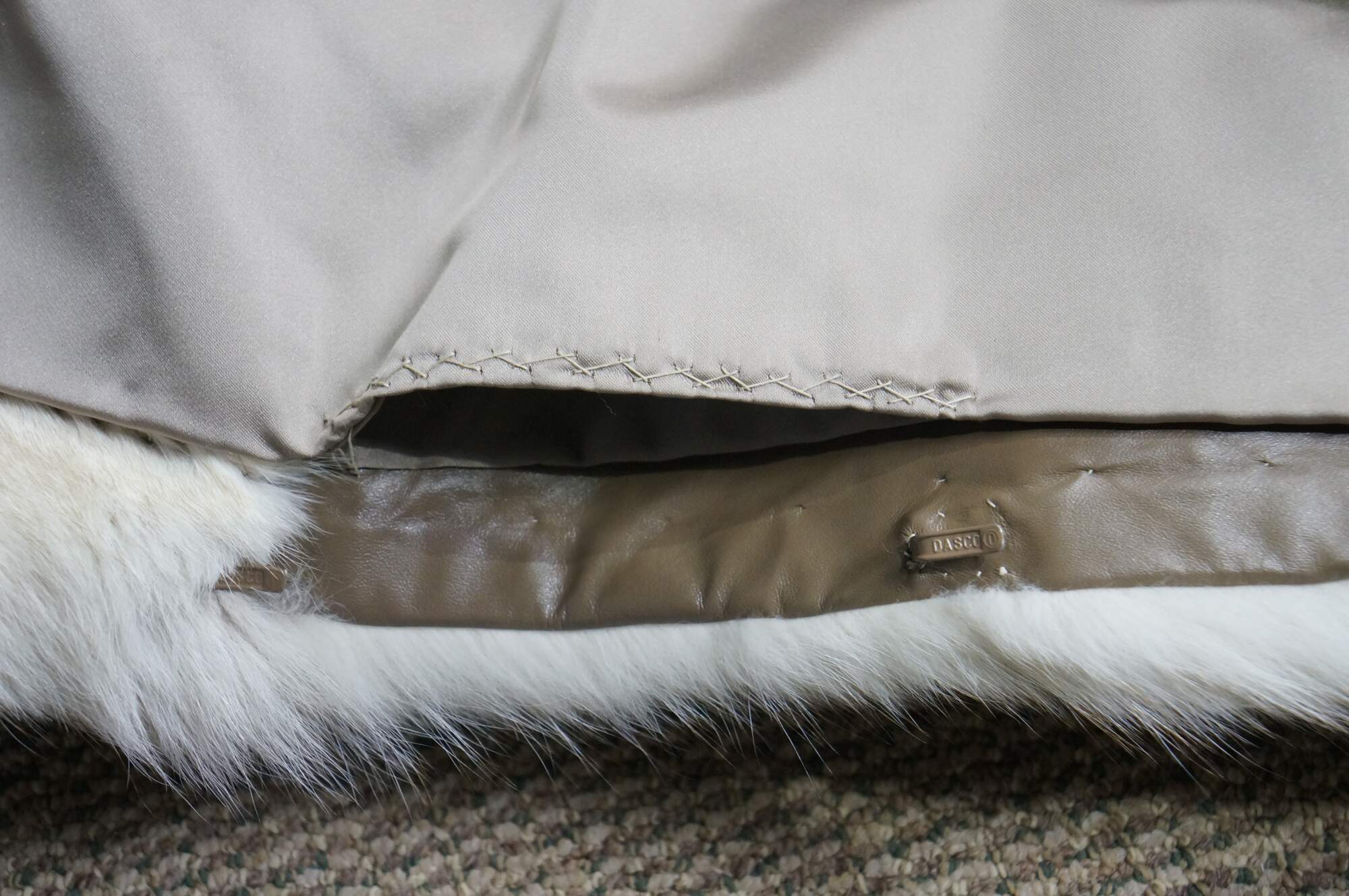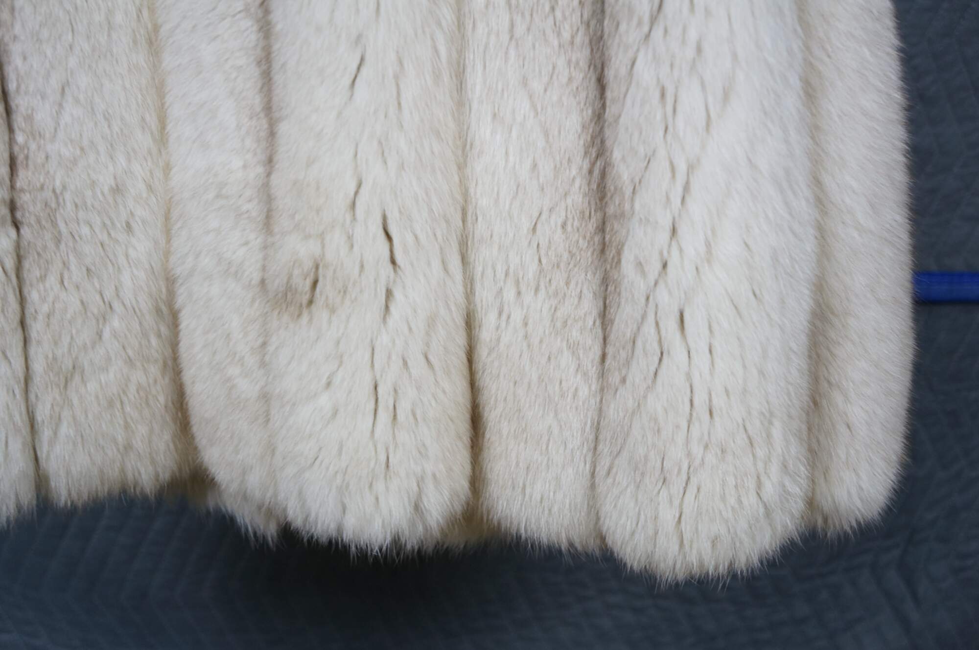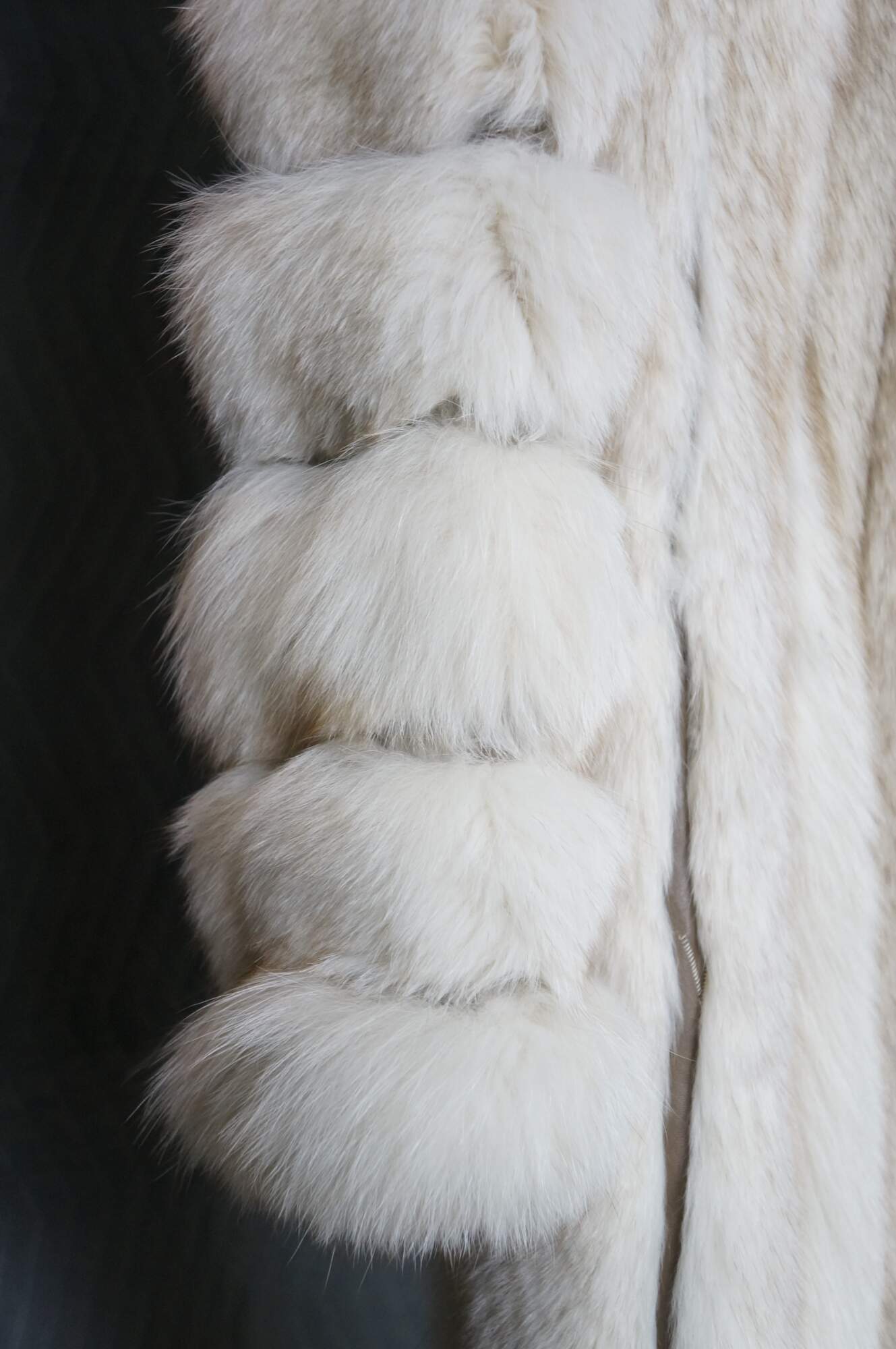 Mid to late 20th century natural blue / silver fox taxidermy fur coat. Full length; textured sleeves; hook and loop closure; no exterior pockets. Floral embroidered taupe lining. One interior breast pocket. Kotsovos - Roselawn Custom Furriers.