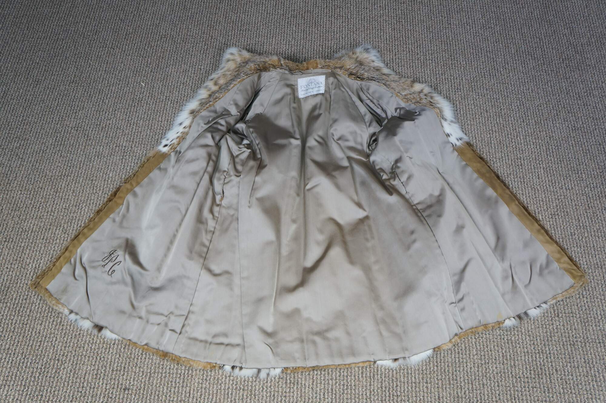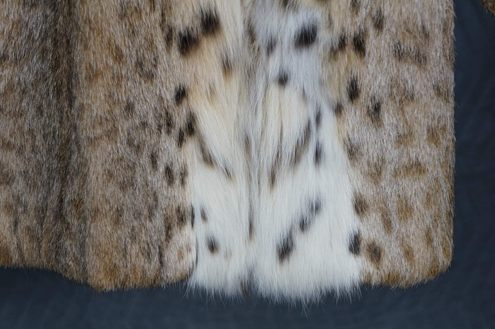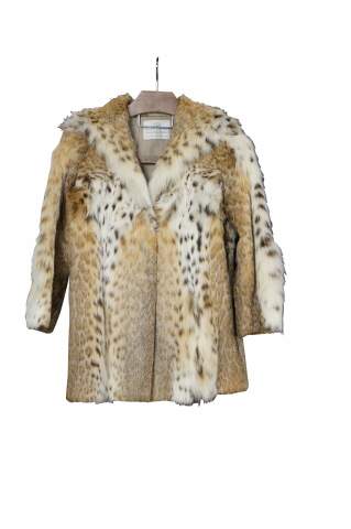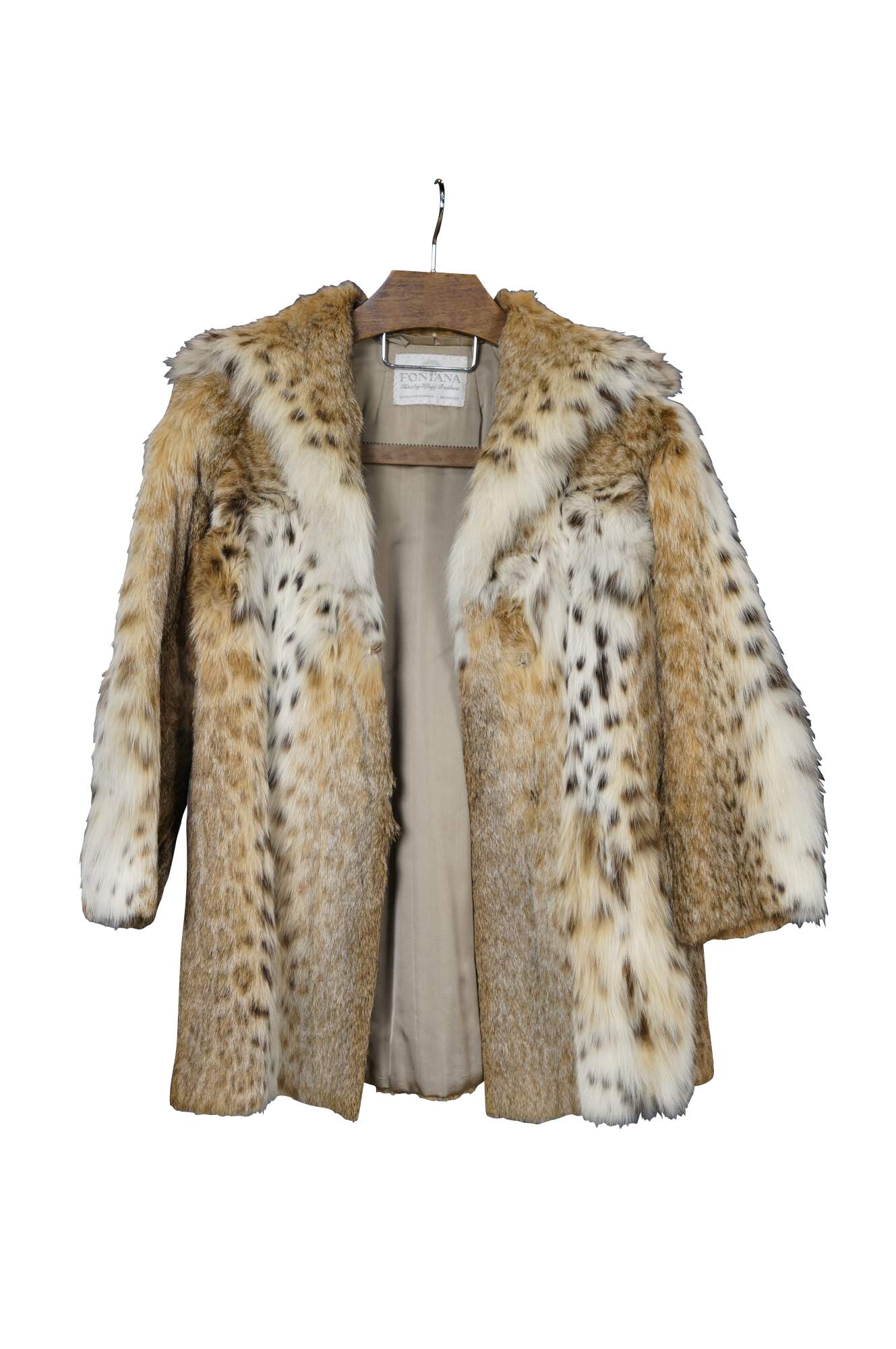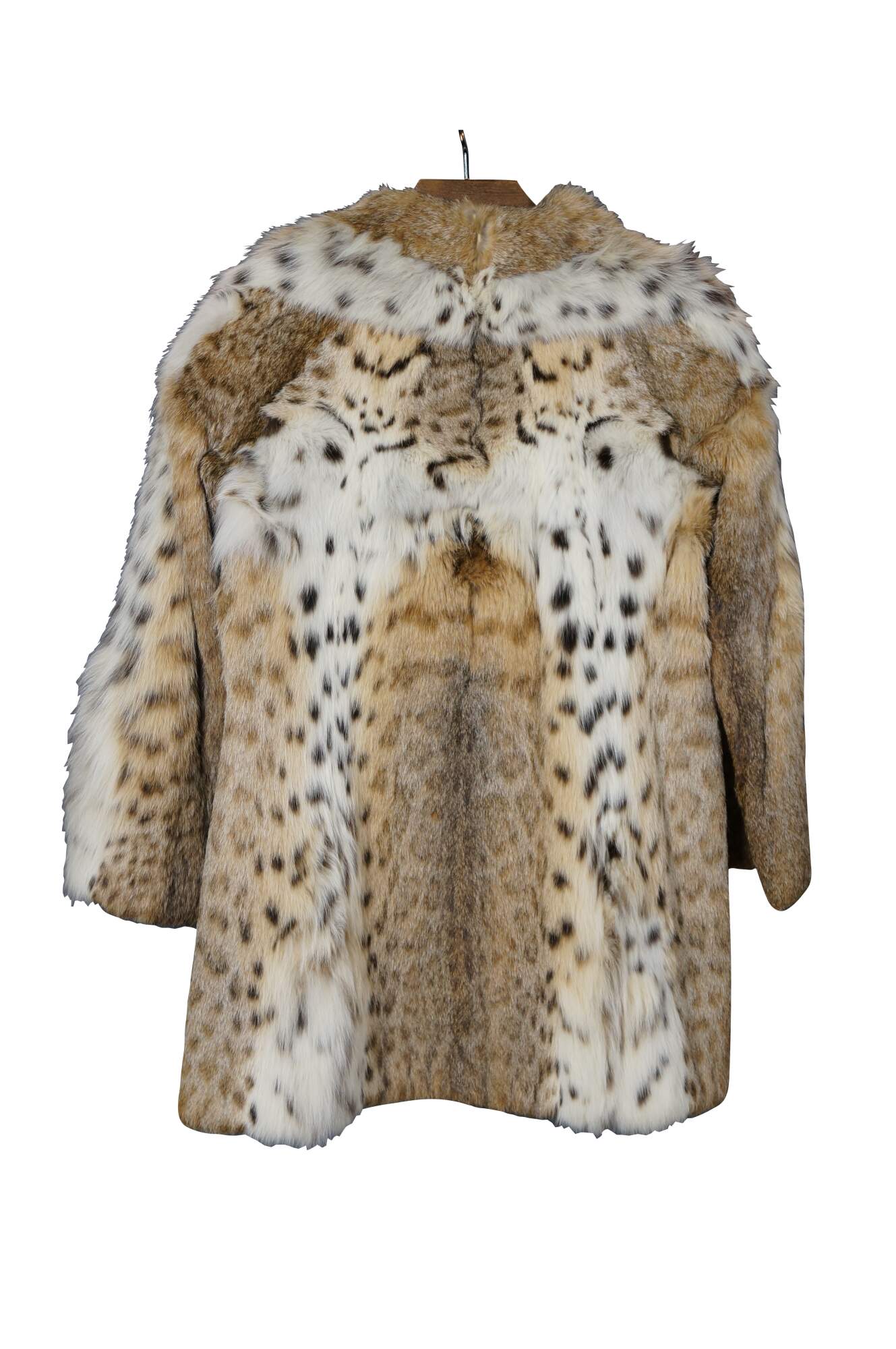 Mid to late 20th century natural spotted lynx / Bobcat fur taxidermy coat. Mid-length; hook and loop closure; no pockets; two belt slits at sides (no belt). Taupe lining monogrammed with initials JPC. Fontana Furs by Klaff Brothers - Coolidge Corner - Brookline.