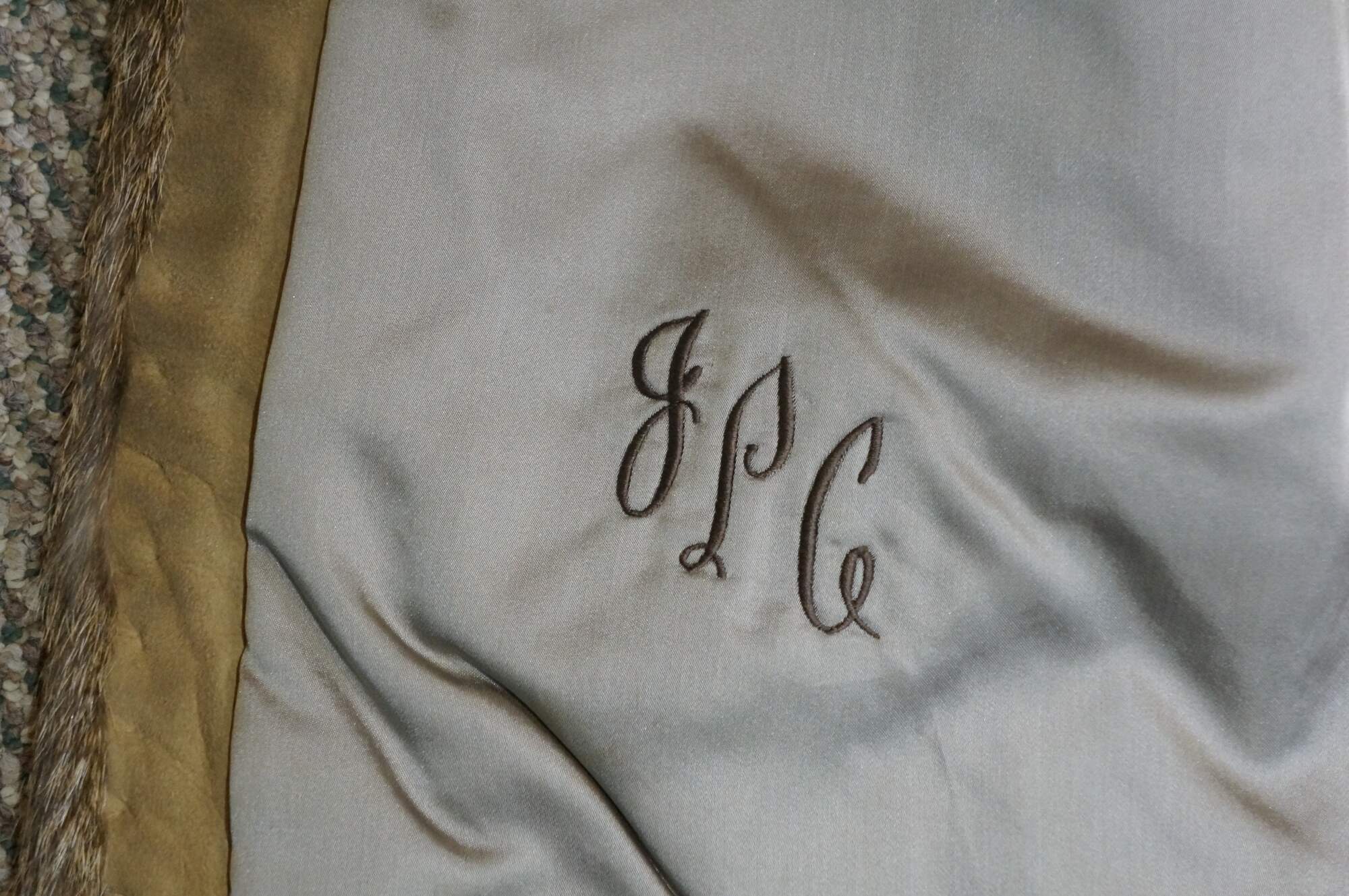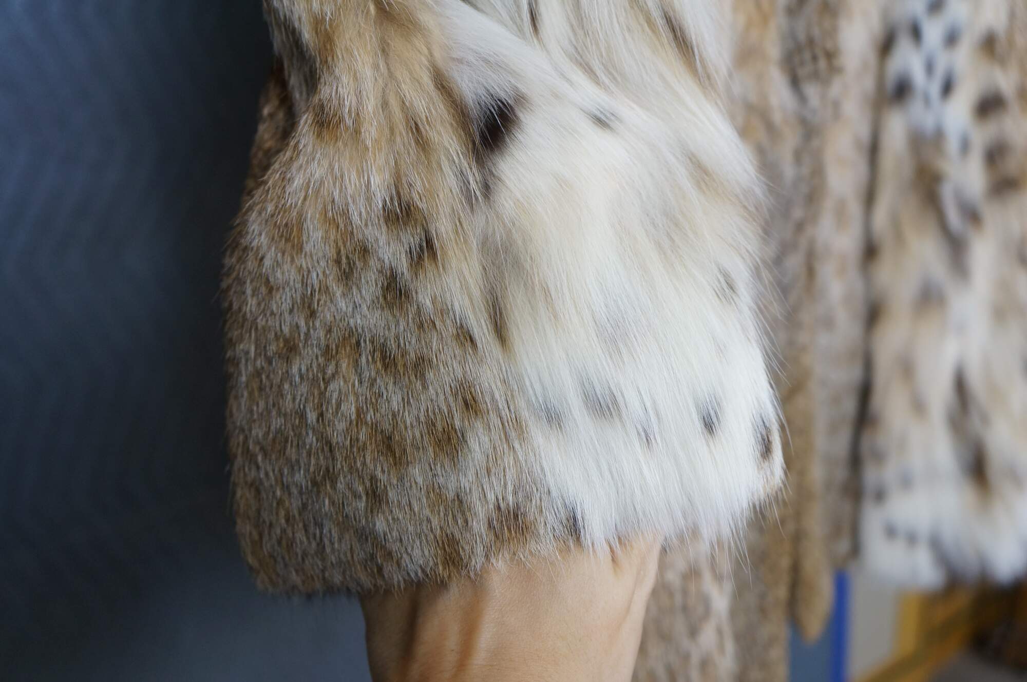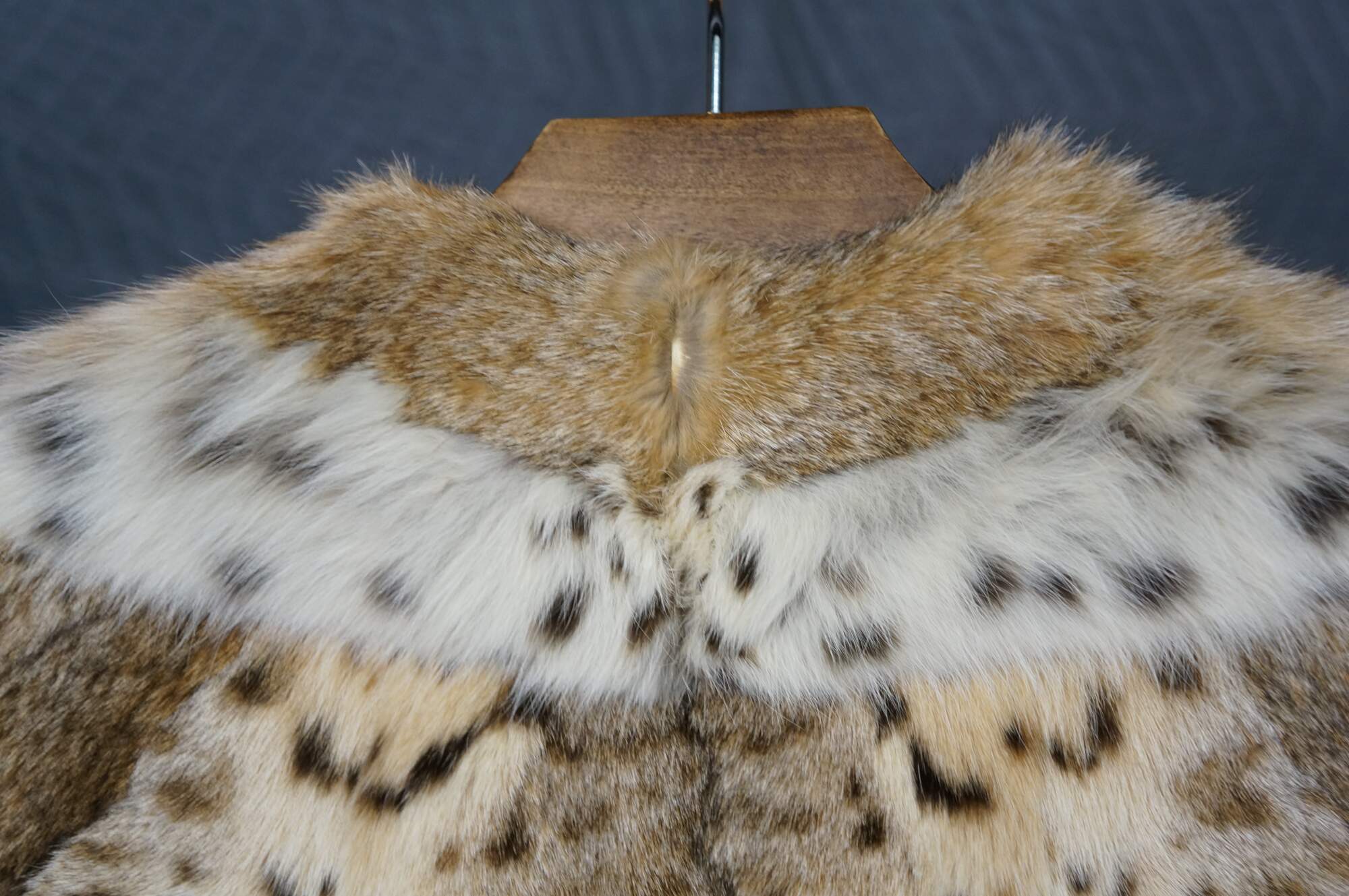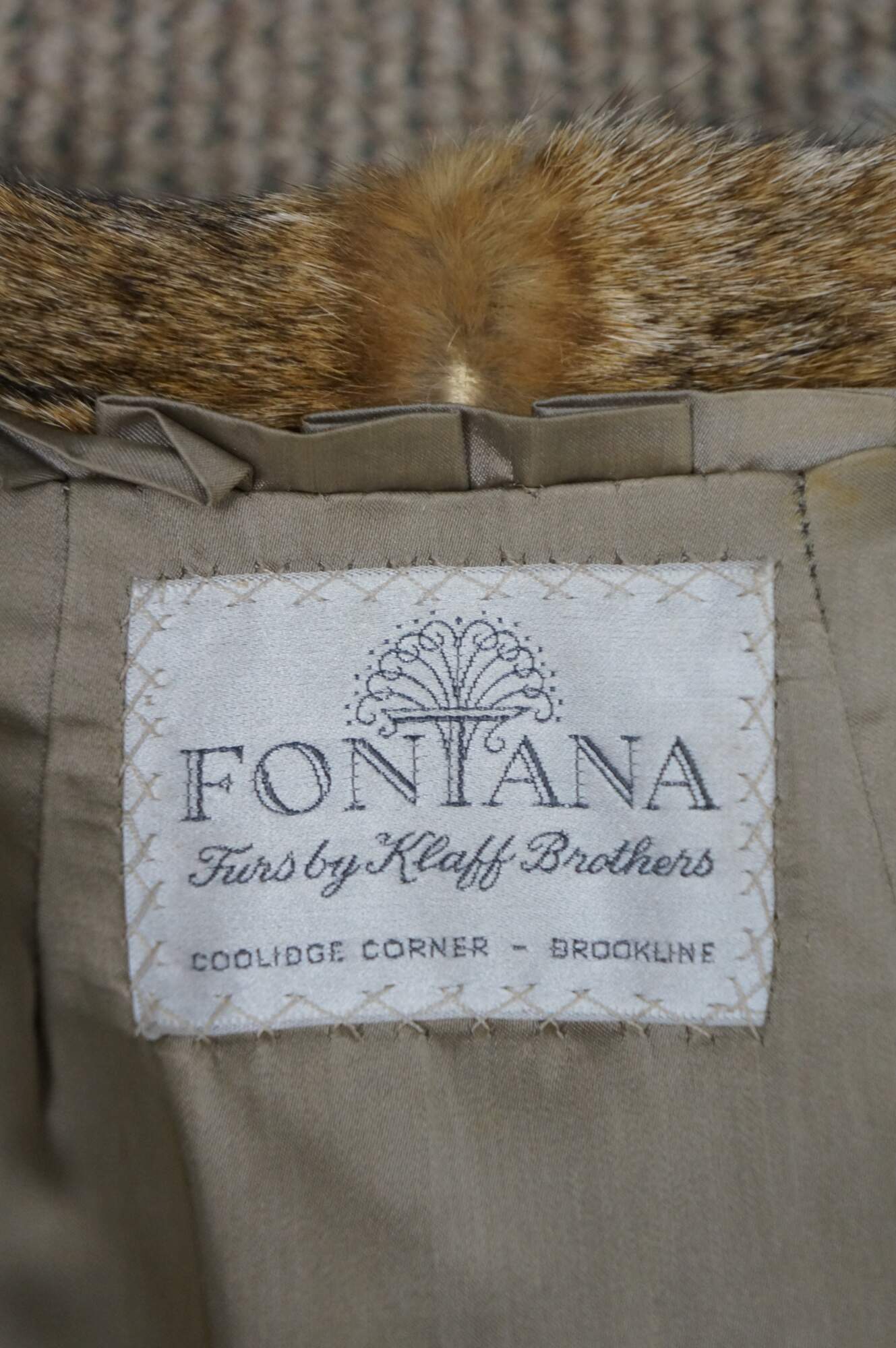 Mid to late 20th century natural spotted lynx / Bobcat fur taxidermy coat. Mid-length; hook and loop closure; no pockets; two belt slits at sides (no belt). Taupe lining monogrammed with initials JPC. Fontana Furs by Klaff Brothers - Coolidge Corner - Brookline.