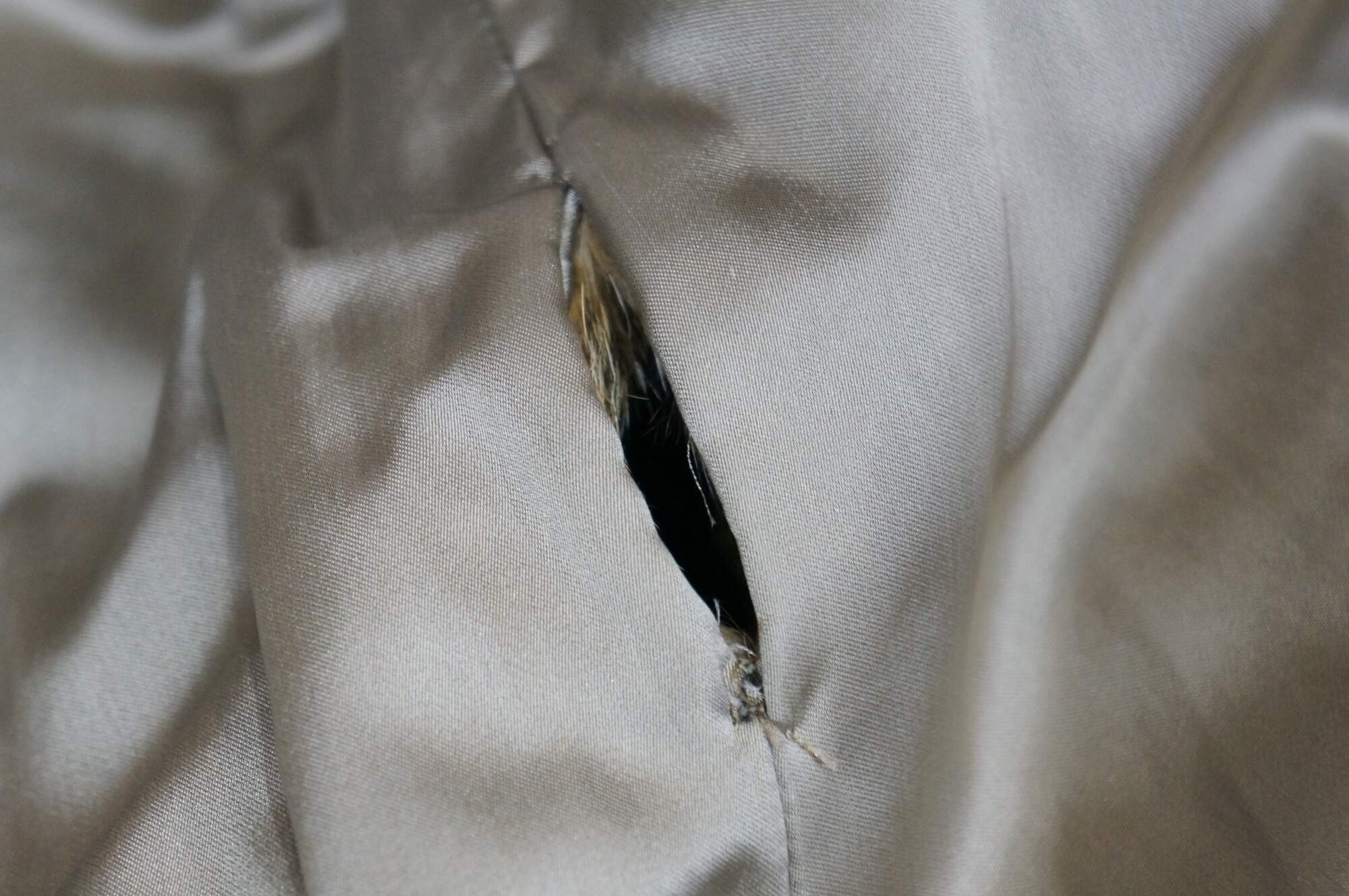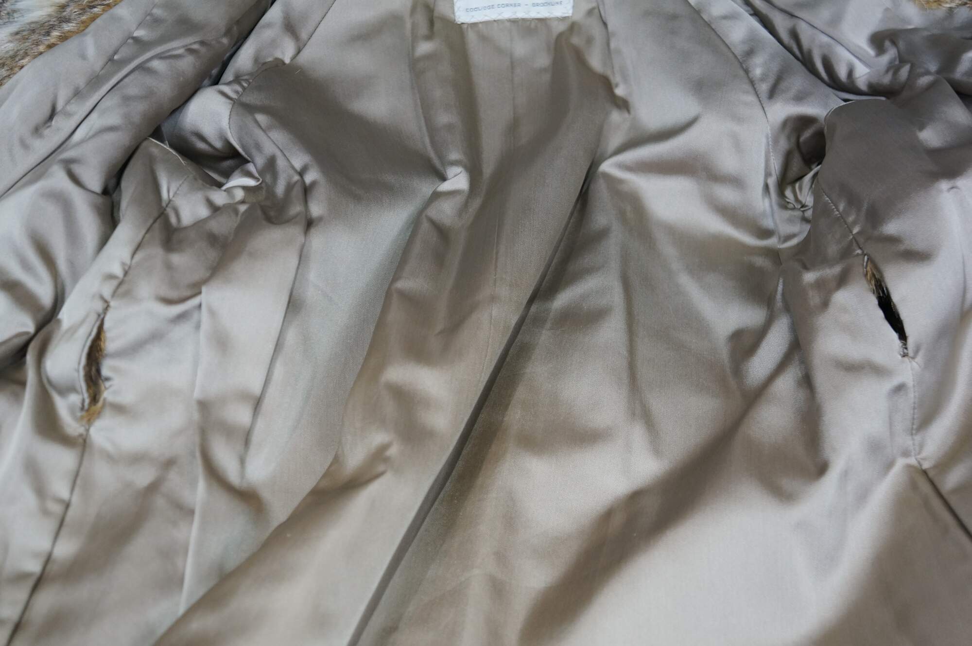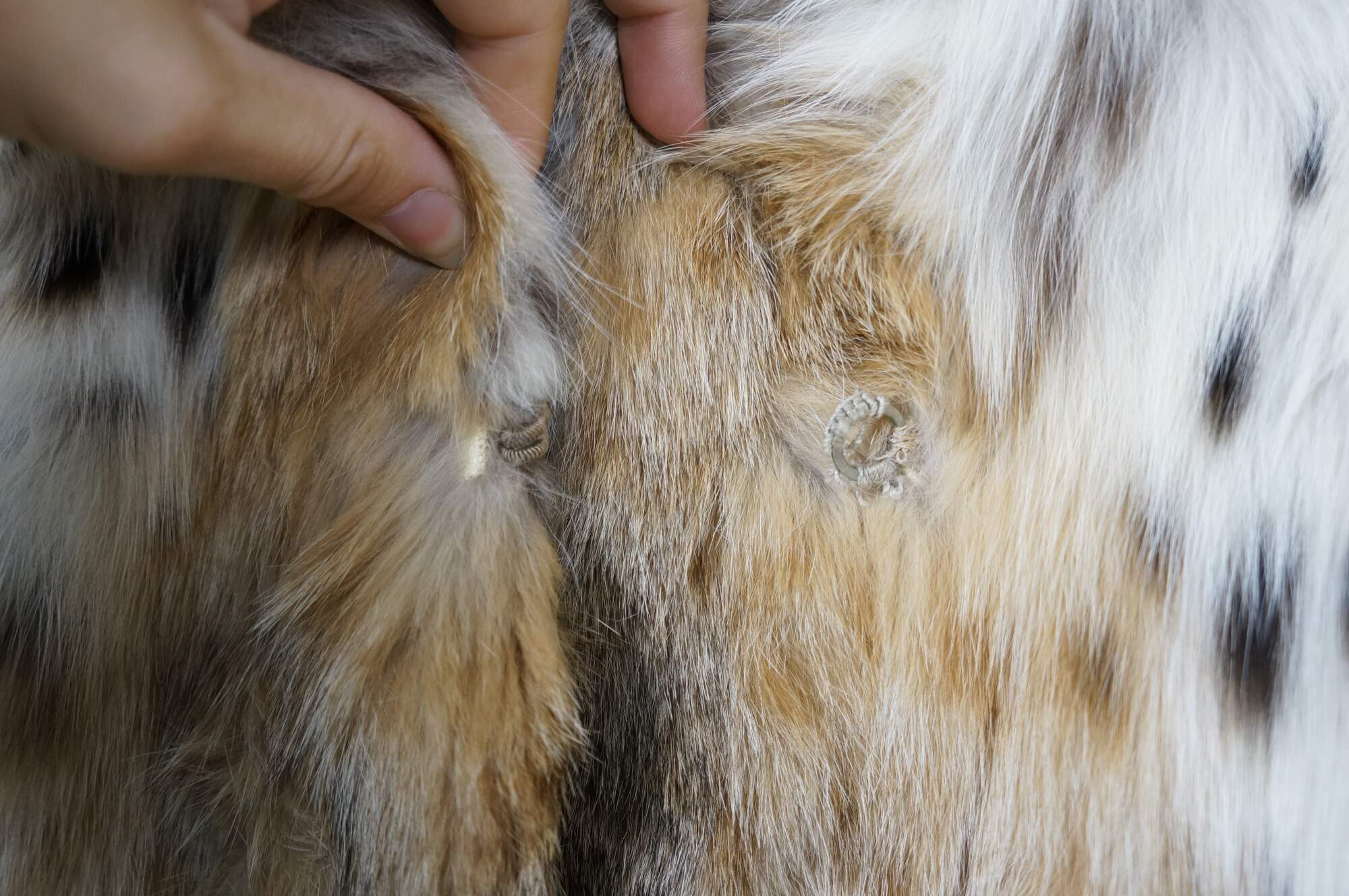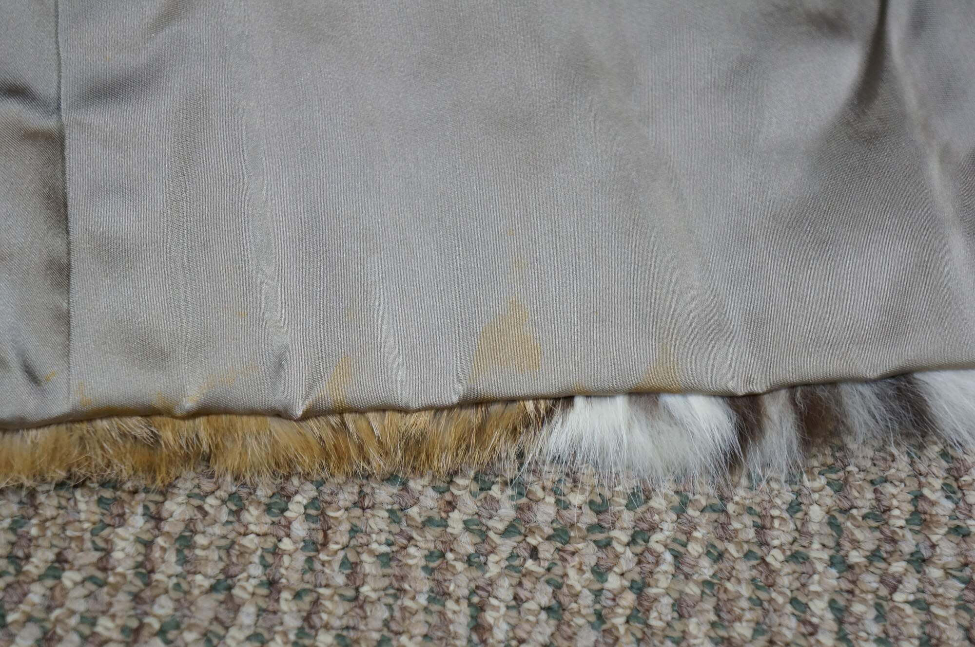 Mid to late 20th century natural spotted lynx / Bobcat fur taxidermy coat. Mid-length; hook and loop closure; no pockets; two belt slits at sides (no belt). Taupe lining monogrammed with initials JPC. Fontana Furs by Klaff Brothers - Coolidge Corner - Brookline.