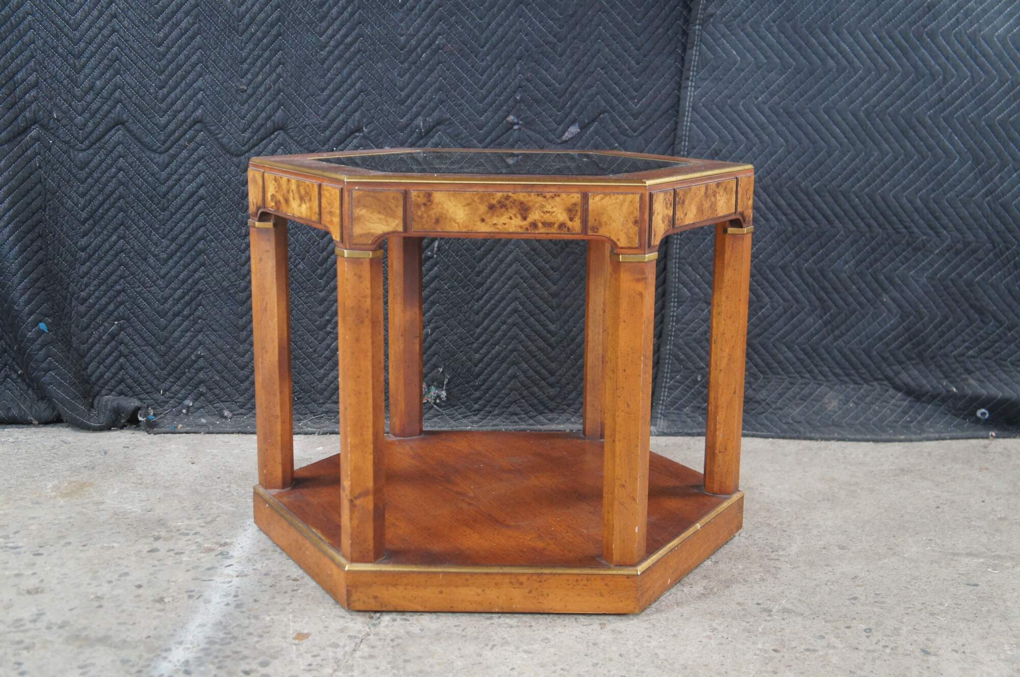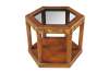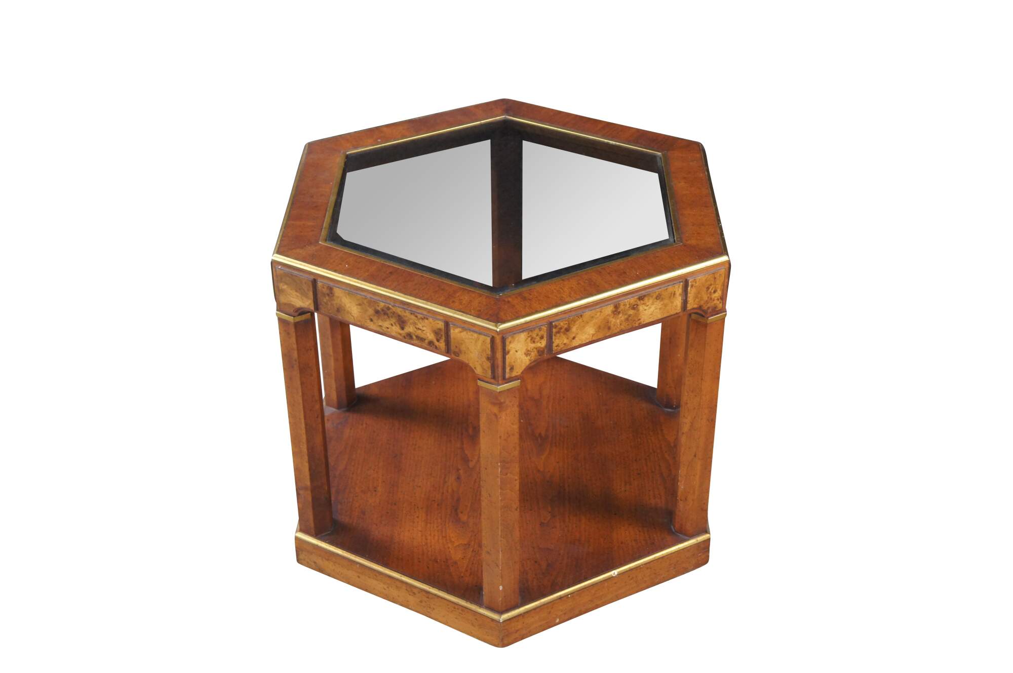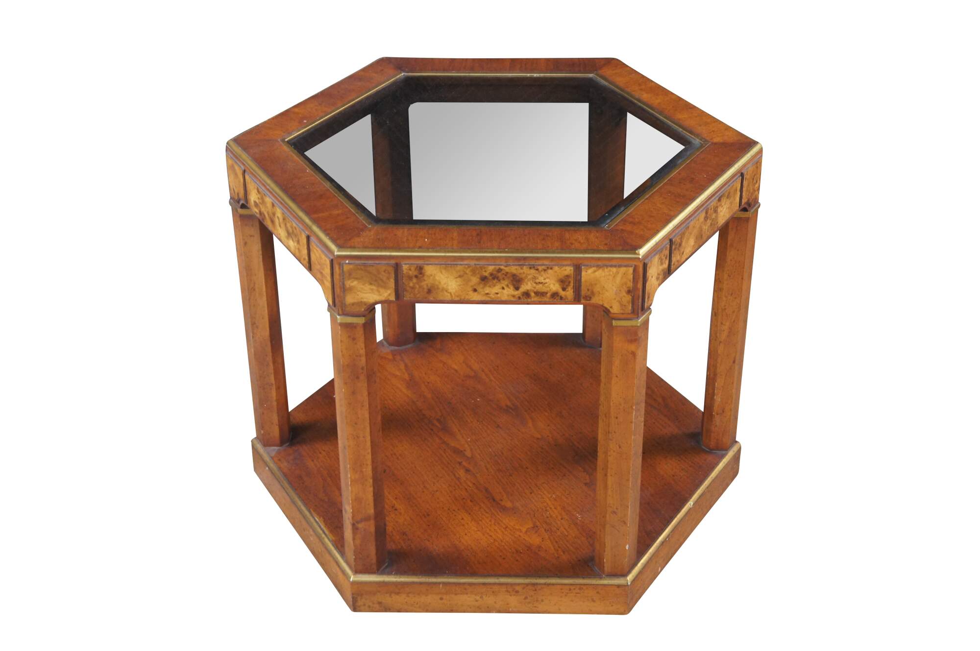 Vintage hexagonal side accent table. Made from walnut featuring burl accents and glass insert.