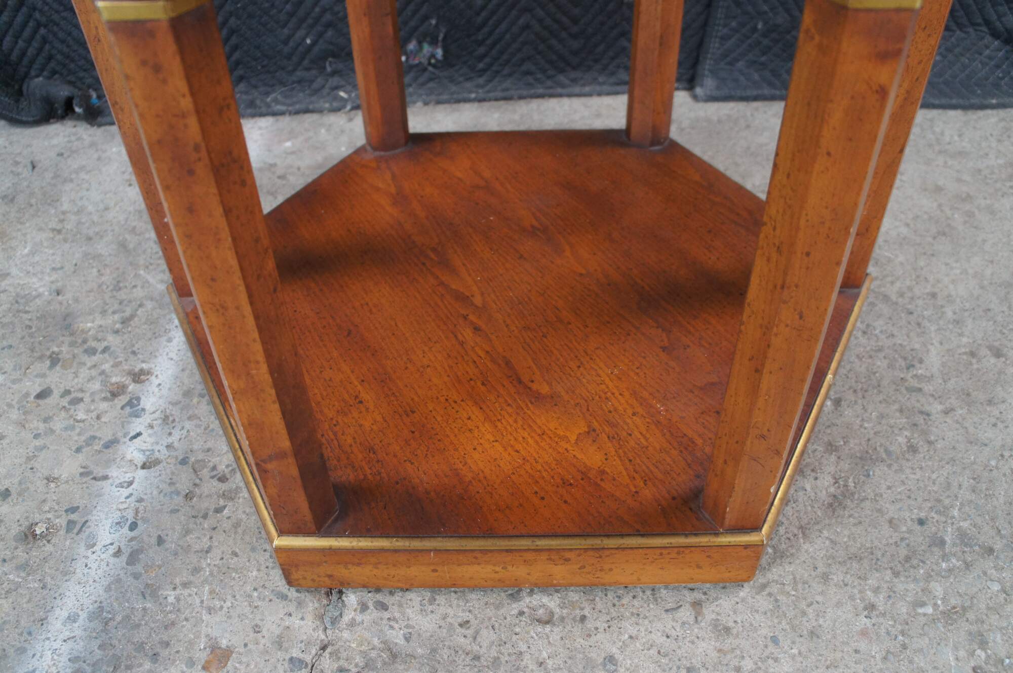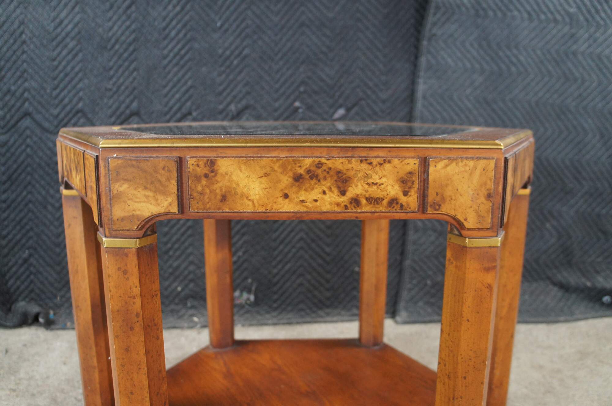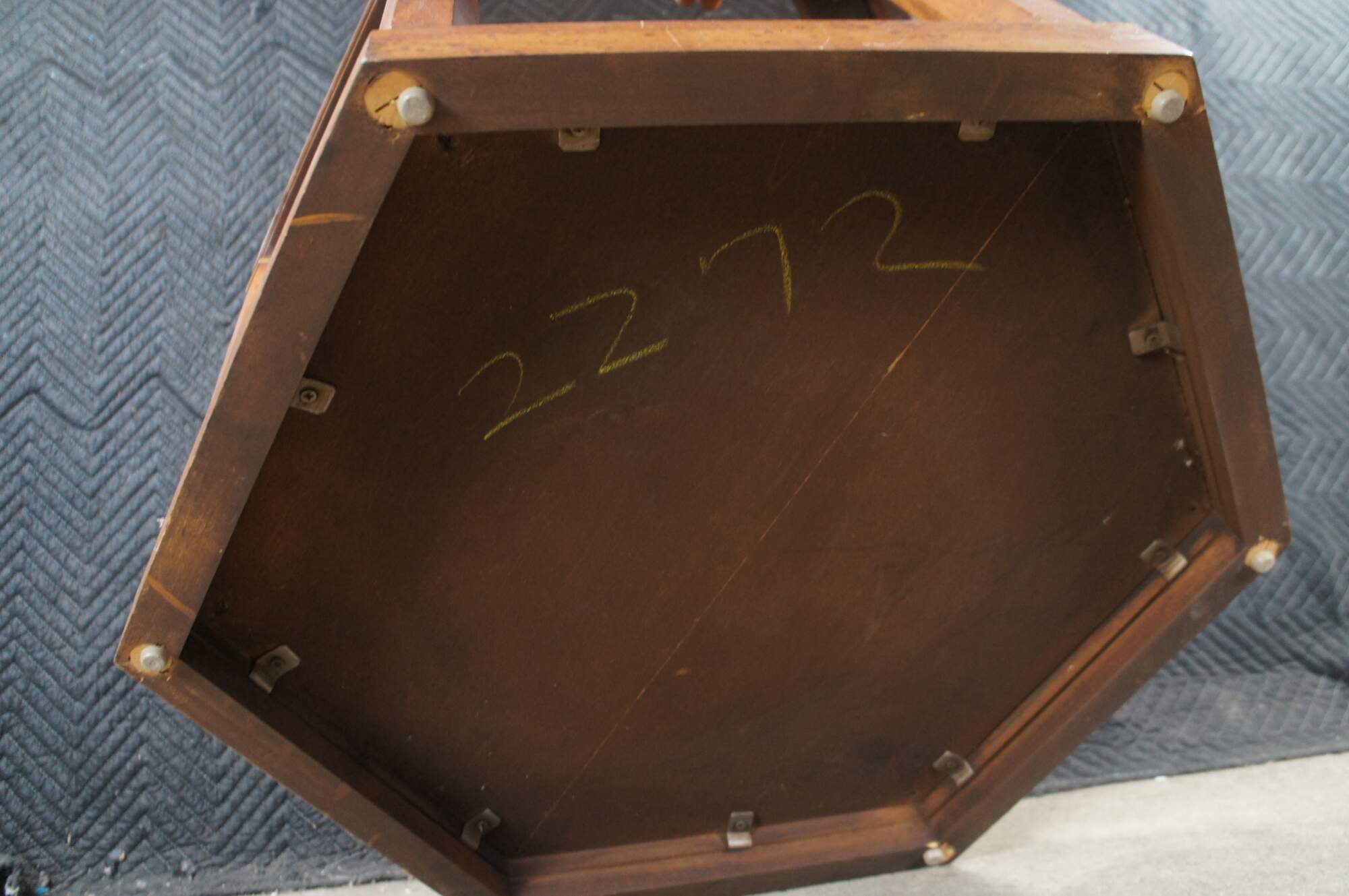 Vintage hexagonal side accent table. Made from walnut featuring burl accents and glass insert.