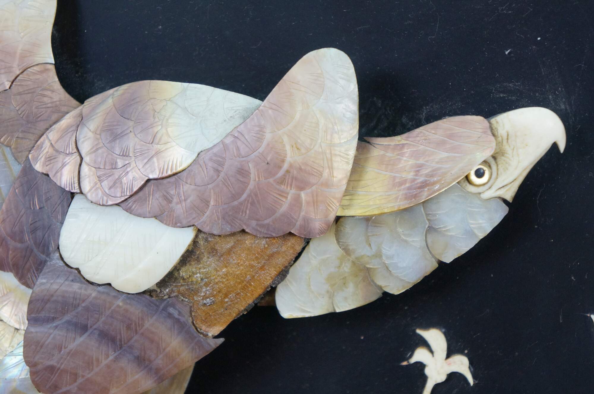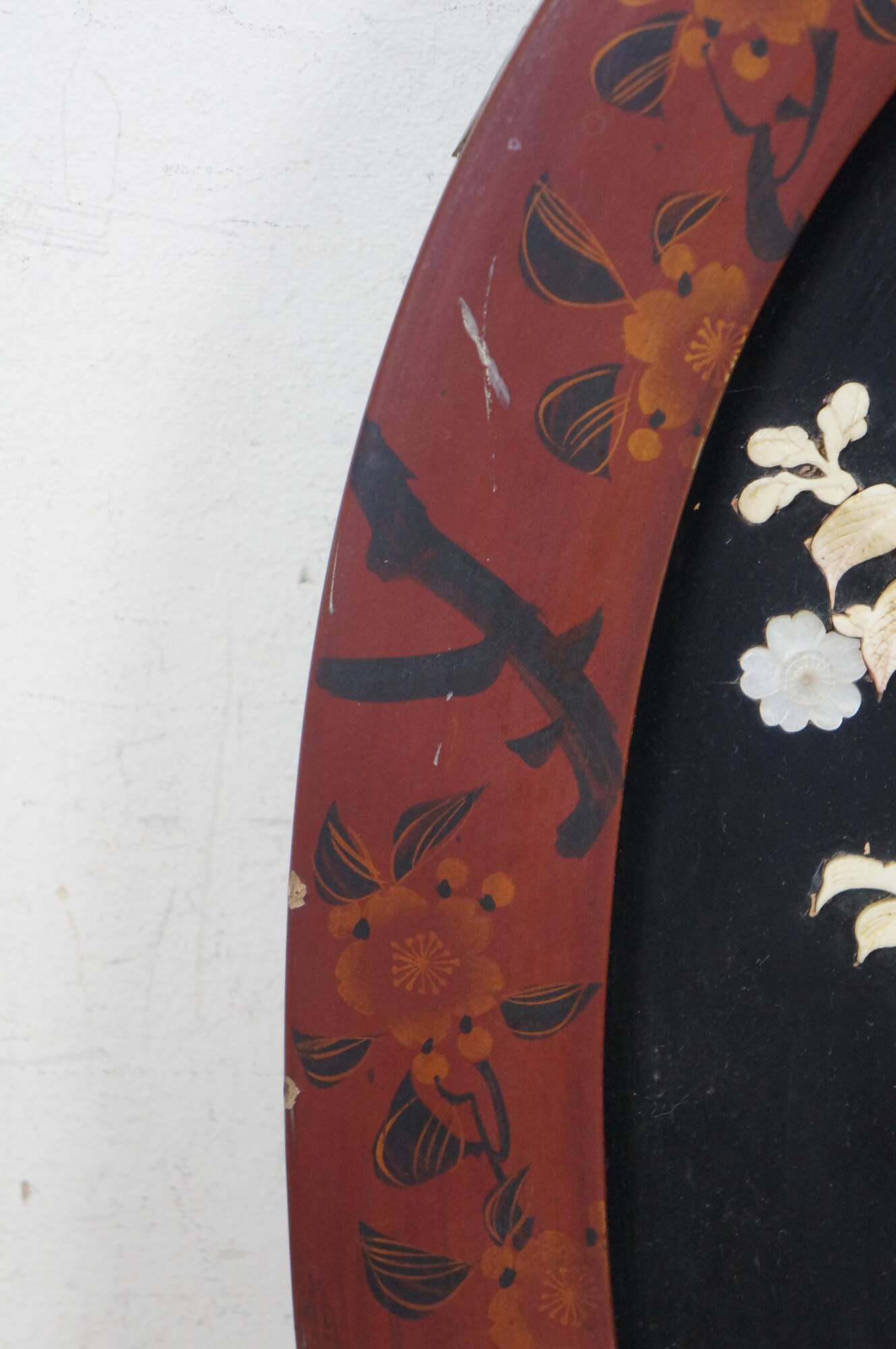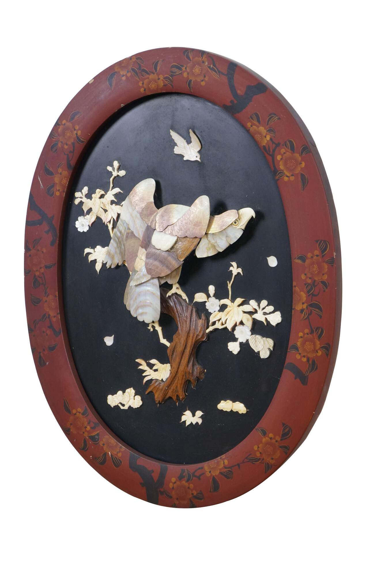 Early 20th century, Meiji period shibayama wall plaque depicting a mother of pearl eagle perched on a flowering tree, set on a black lacquer background, with a reddish brown oval frame painted with flowering branches.