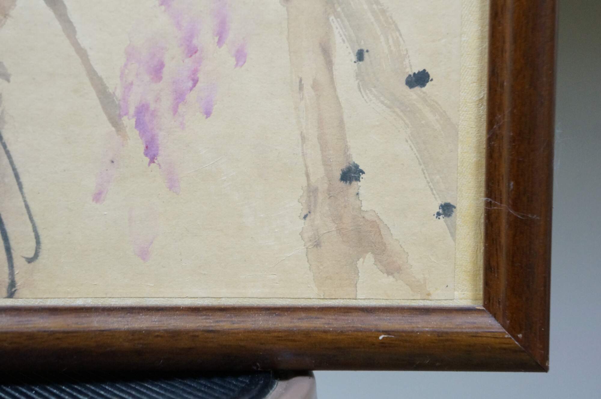 Rare early 20th century Gwo Jianfu Chinese chinoiserie painting, watercolor on scroll paper, mounted on silk, showing a cluster of thorny vines and leaves / lotus, with a dragonfly perched on a flower blossom. Calligraphy at left. Red stamp / seal. Beveled wood frame.