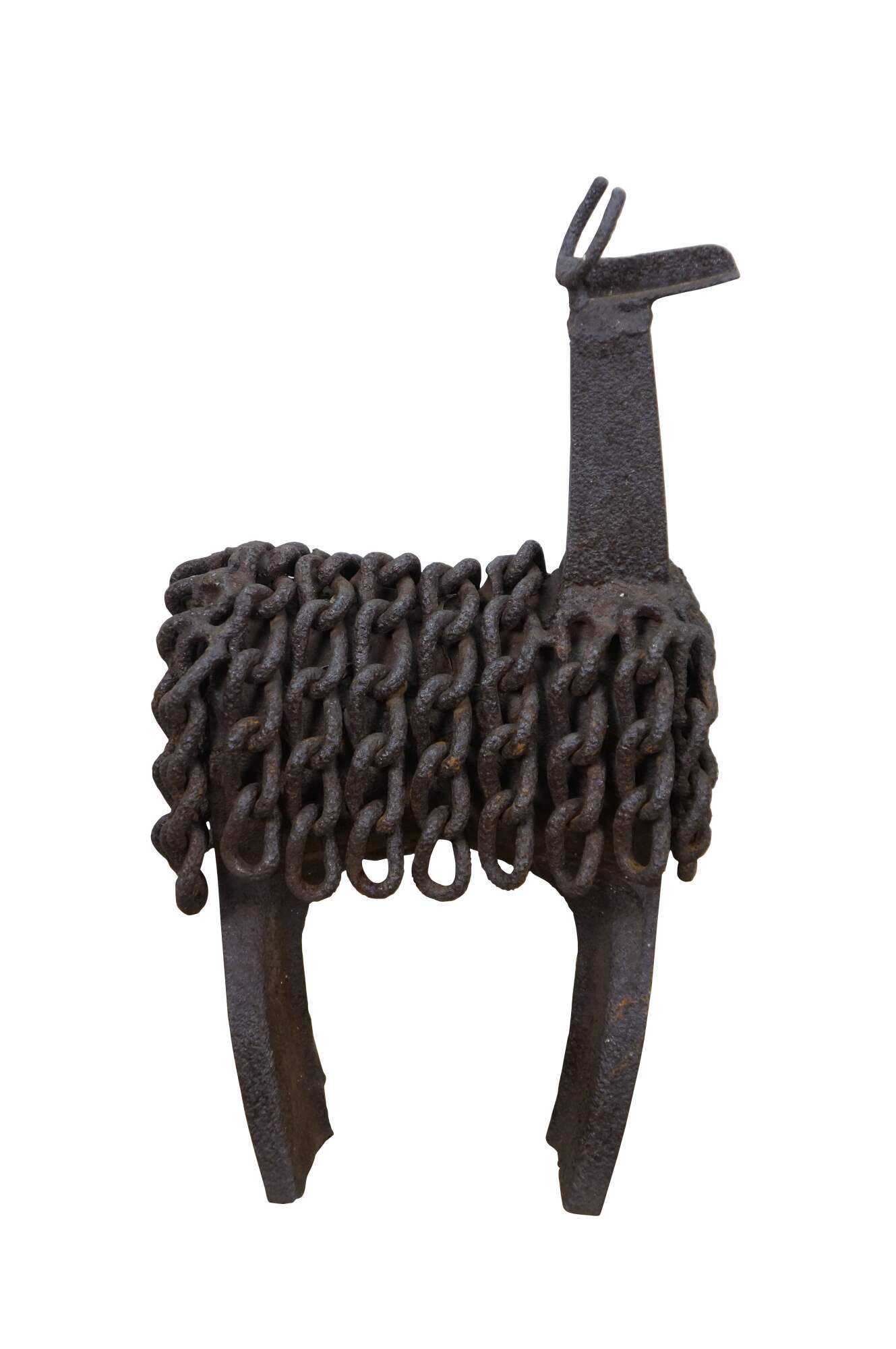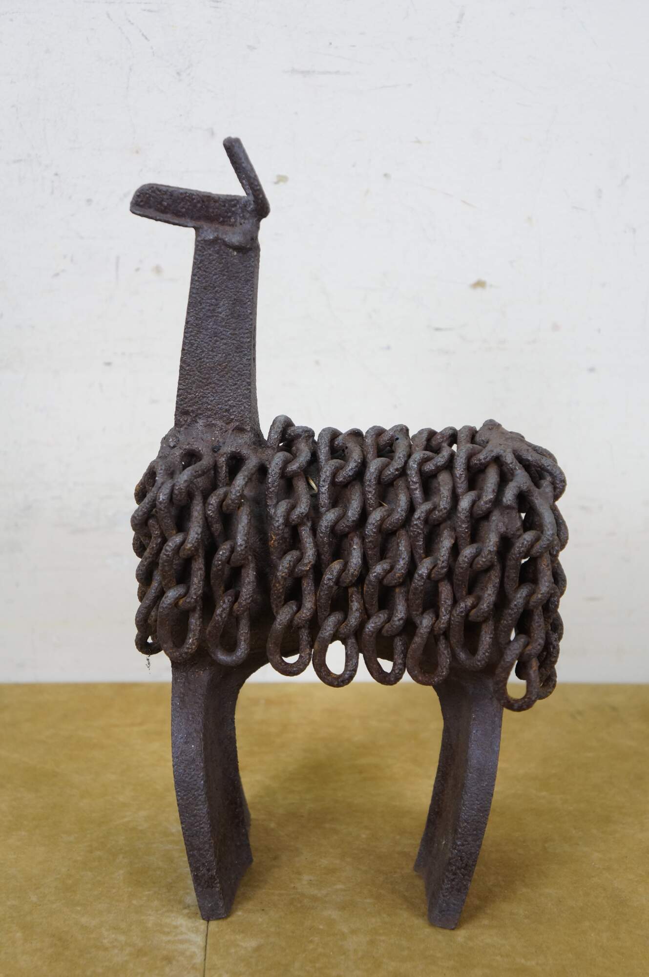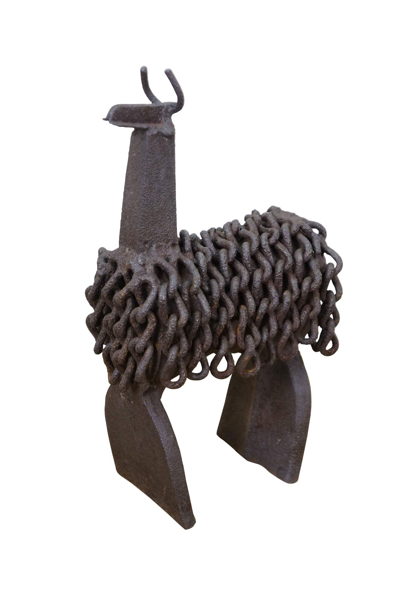 Late 20th century Robert cumpston sculpture / figurine in the shape of a llama with perky ears and long chain wool. Industrial style, crafted of reclaimed farm implements / tools. Signed on rear legs.