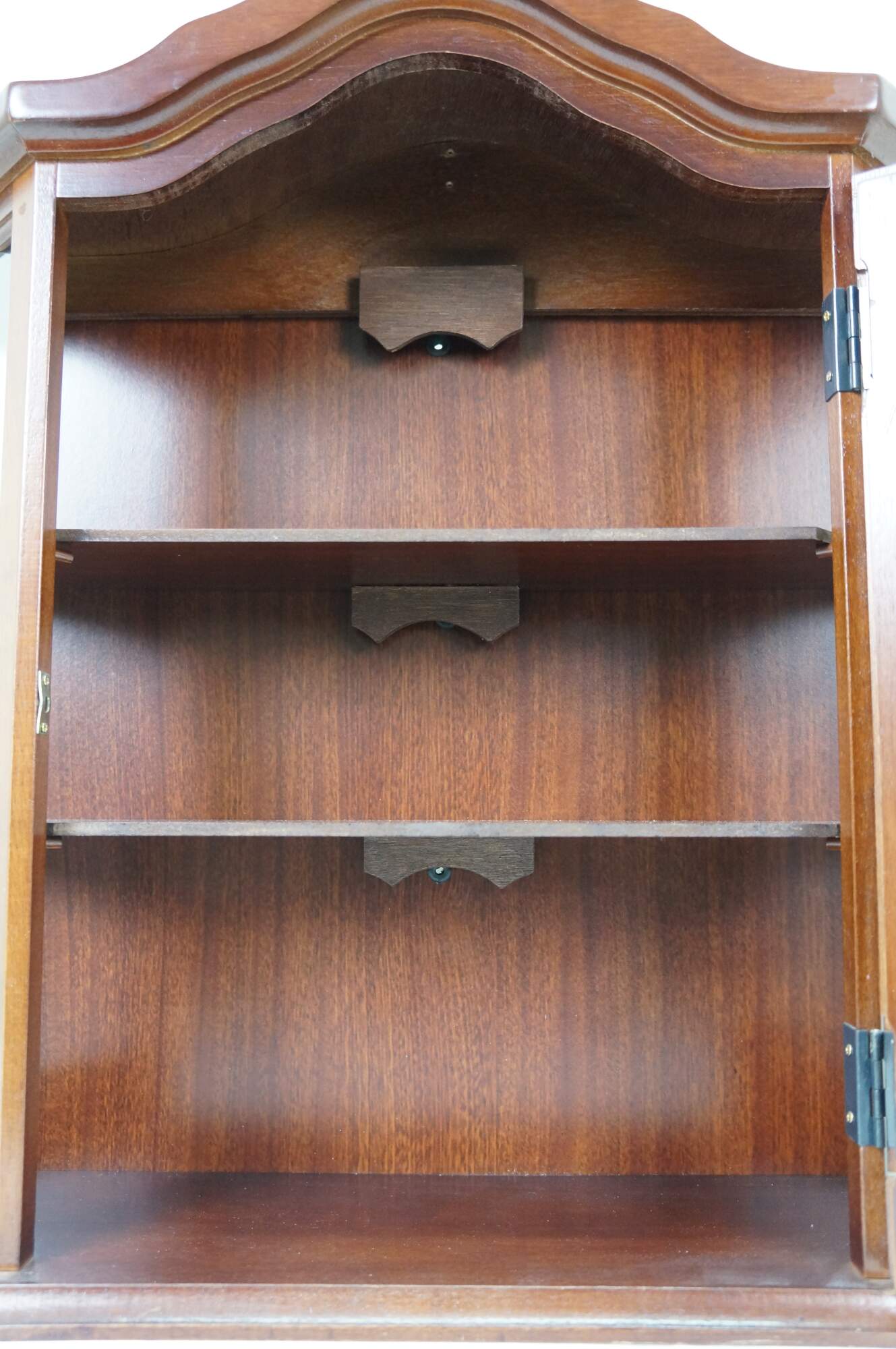 Vintage 20th century mahogany Chippendale style curio / display cabinet featuring a three sided glass front, arch top, and three interior shelves. Back of cabinet is fitted with slots to accomodate wiring for lights.