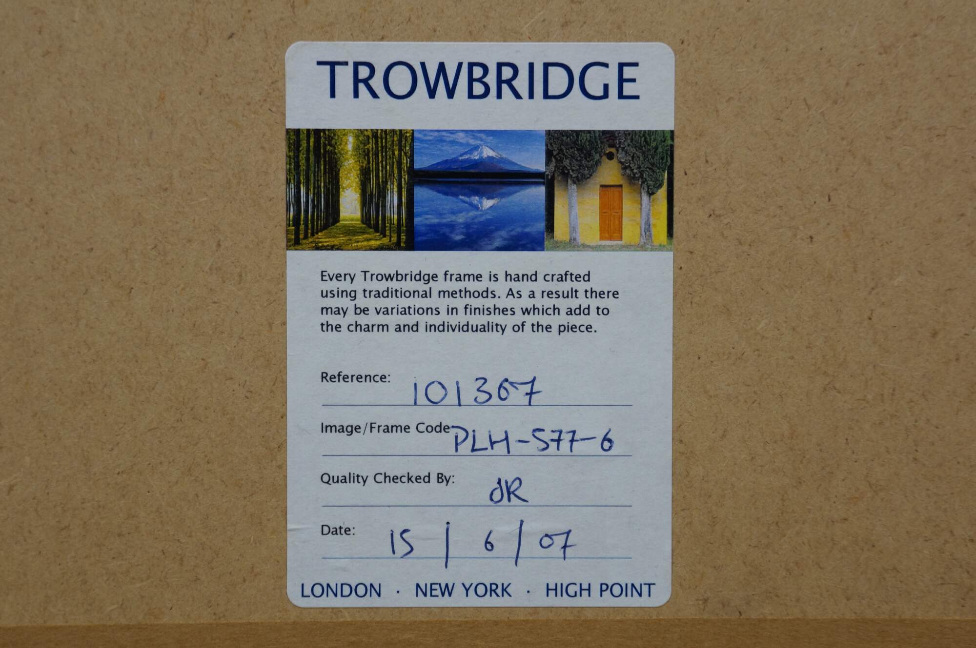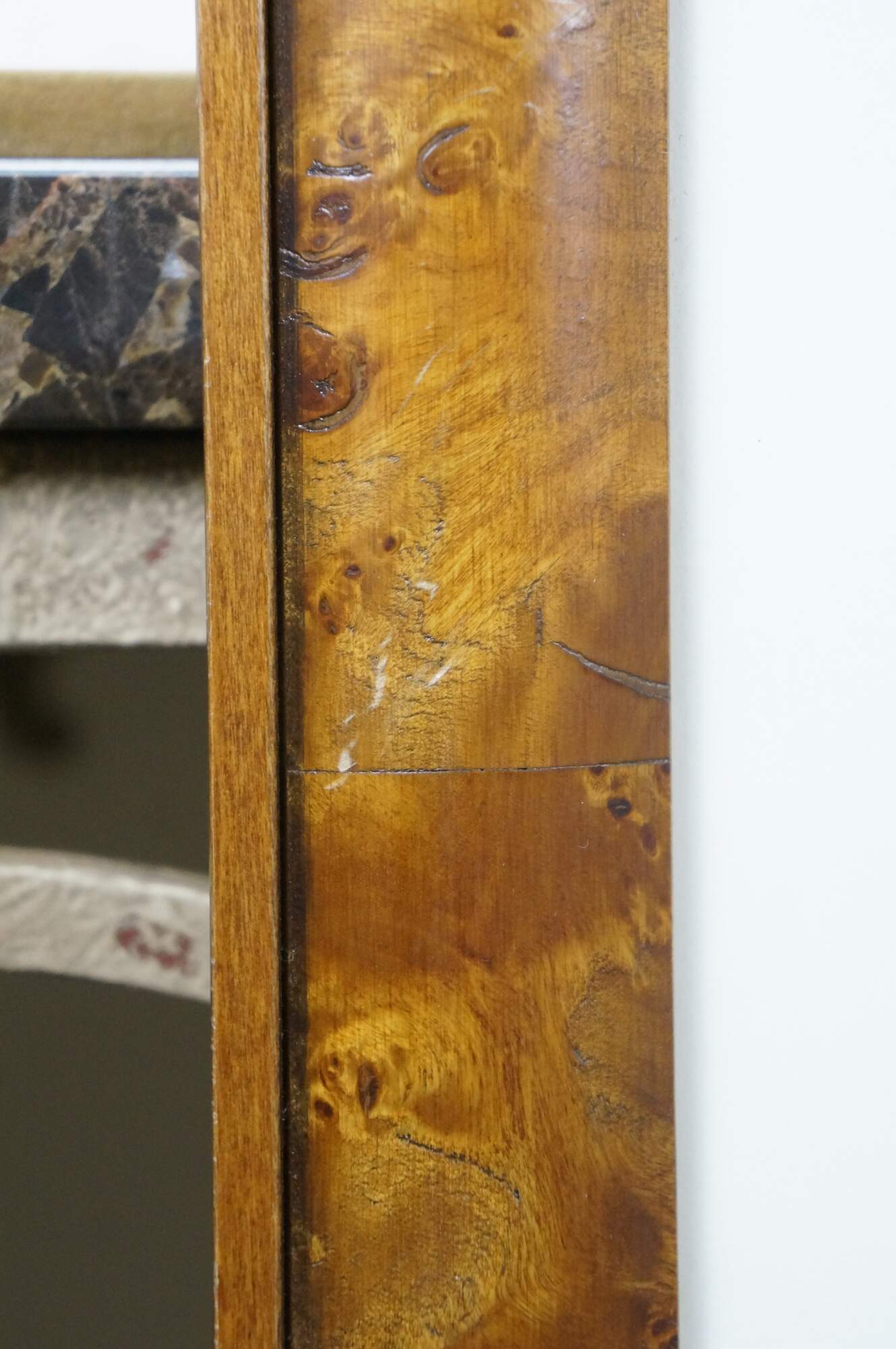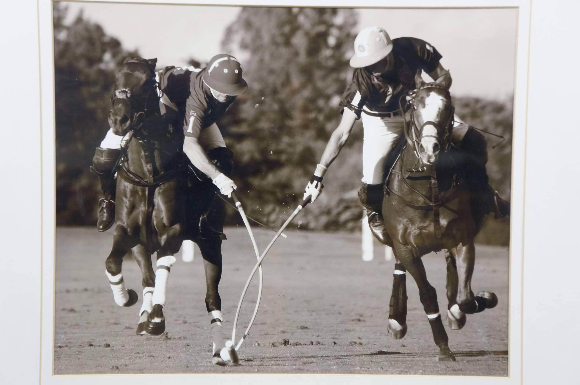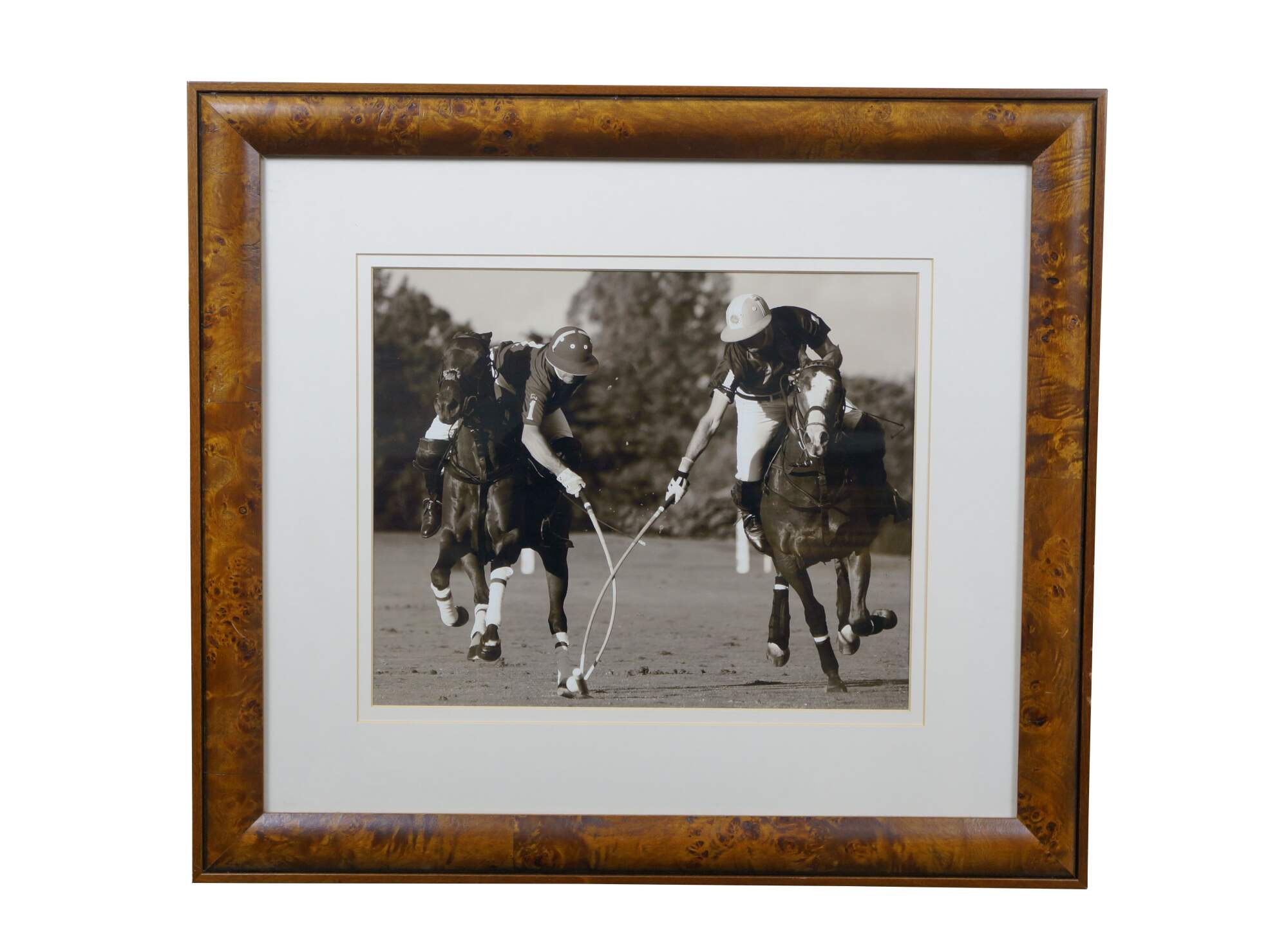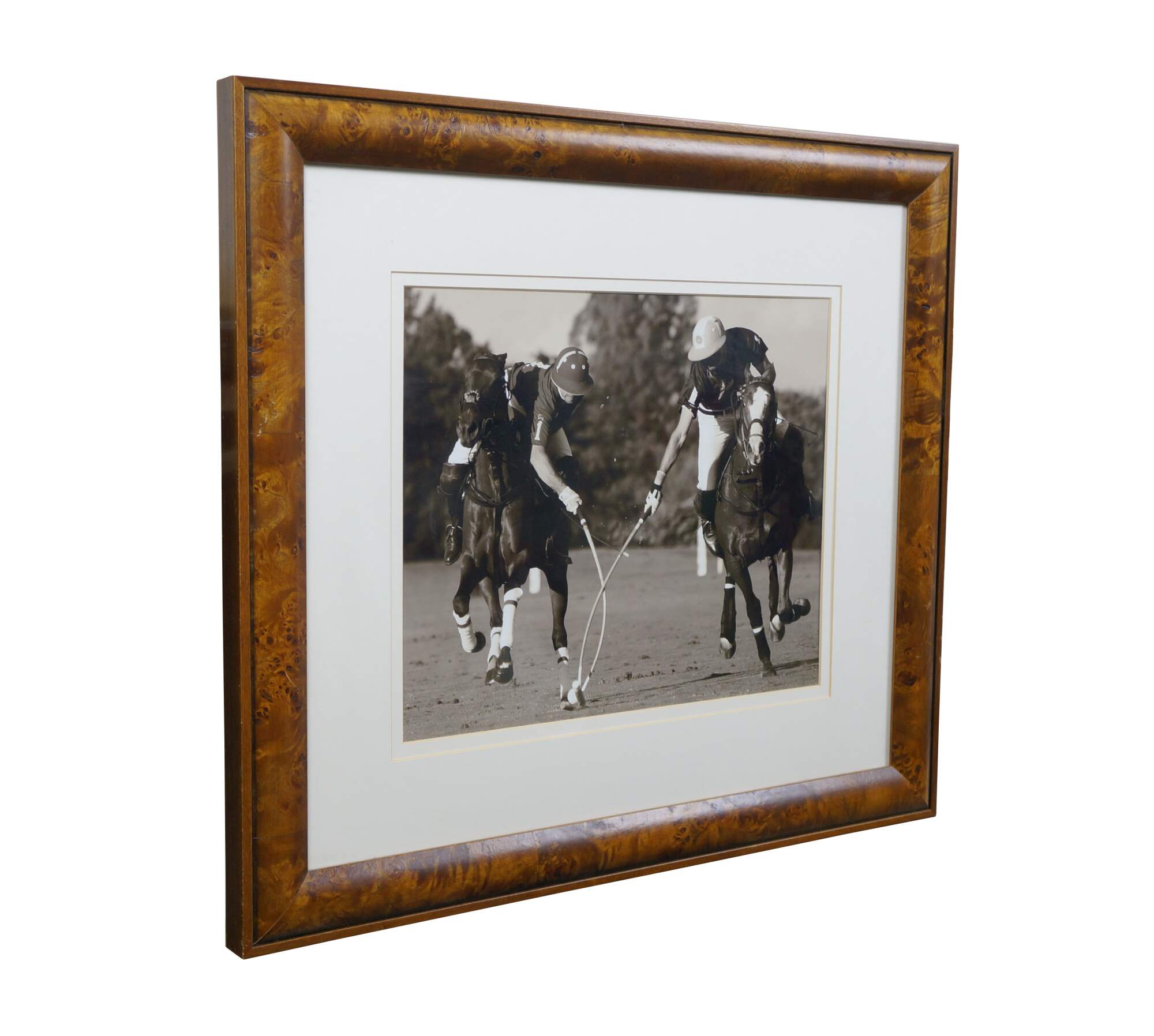 Vintage 20th century sepia photograph showing a pair of polo players on horses. Burl wood frame by Trowbridge; white mat.