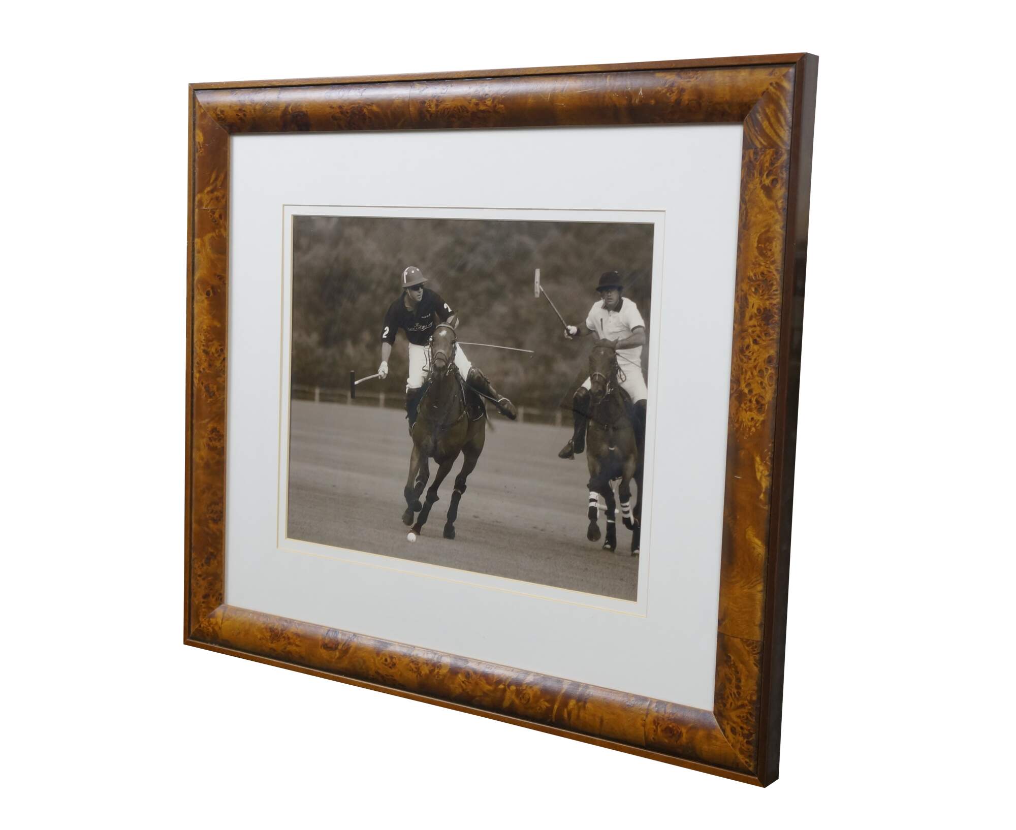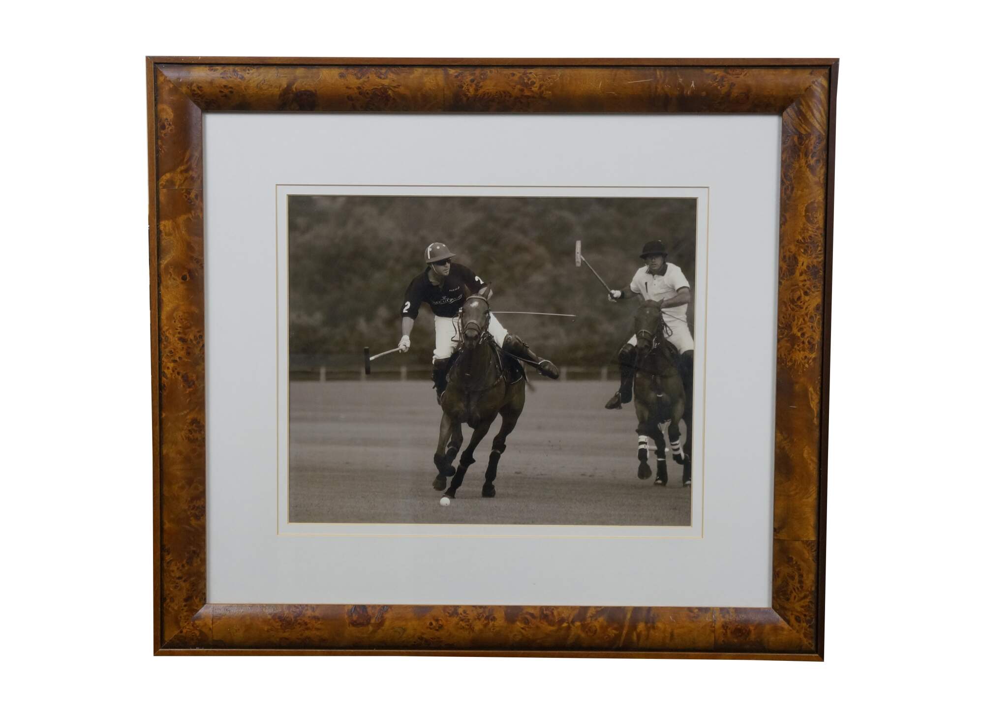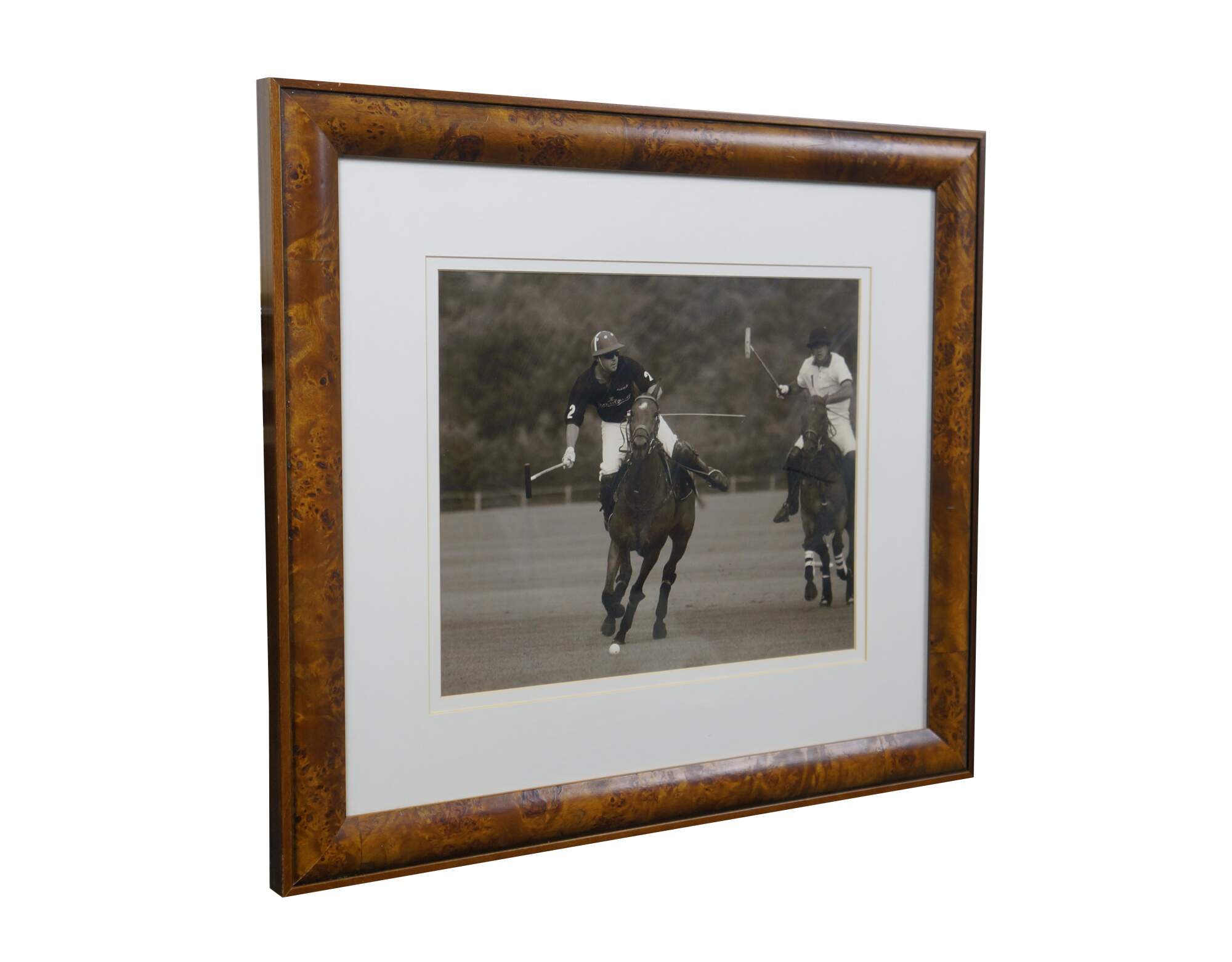 Late 20th century black and white photographic print depicting polo players on horseback, mid game. Burl wood frame by Trowbridge Gallery; white mat.