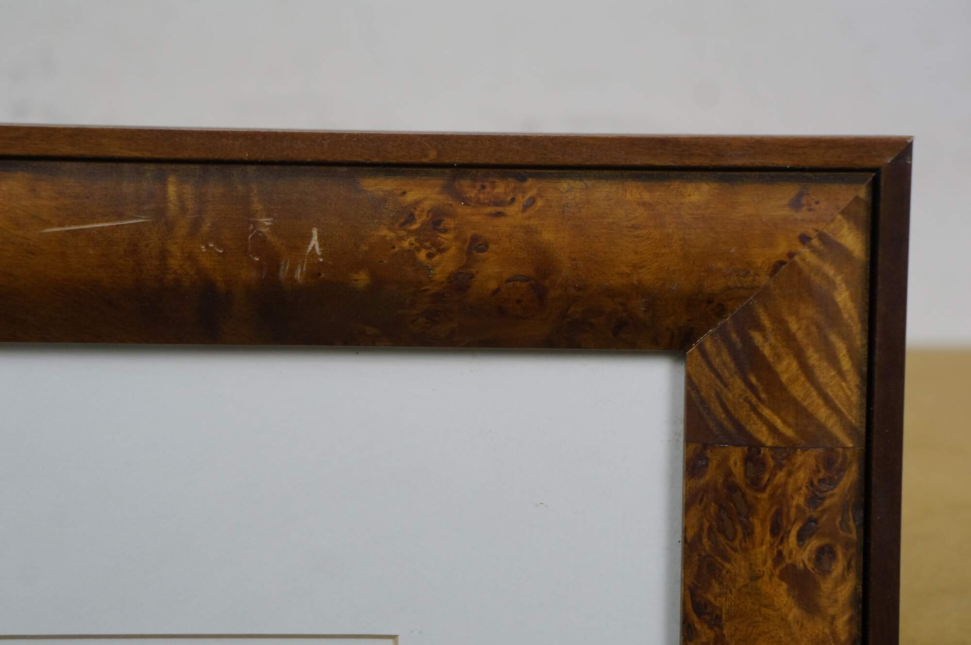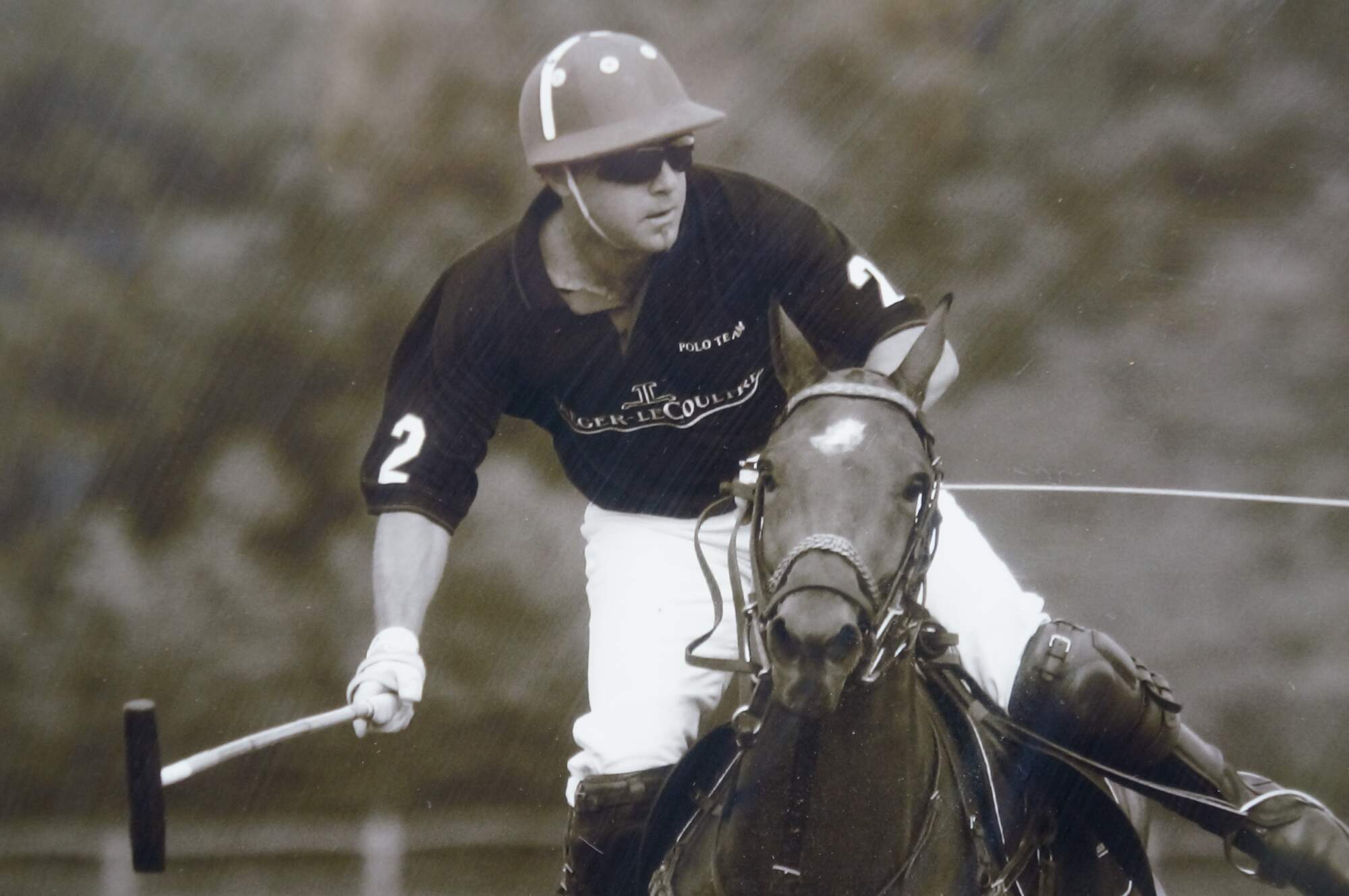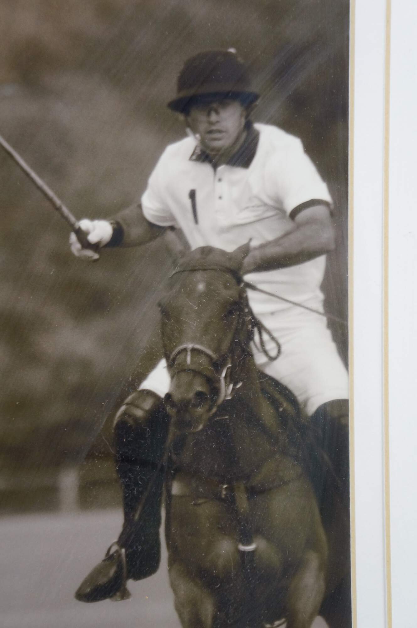 Late 20th century black and white photographic print depicting polo players on horseback, mid game. Burl wood frame by Trowbridge Gallery; white mat.