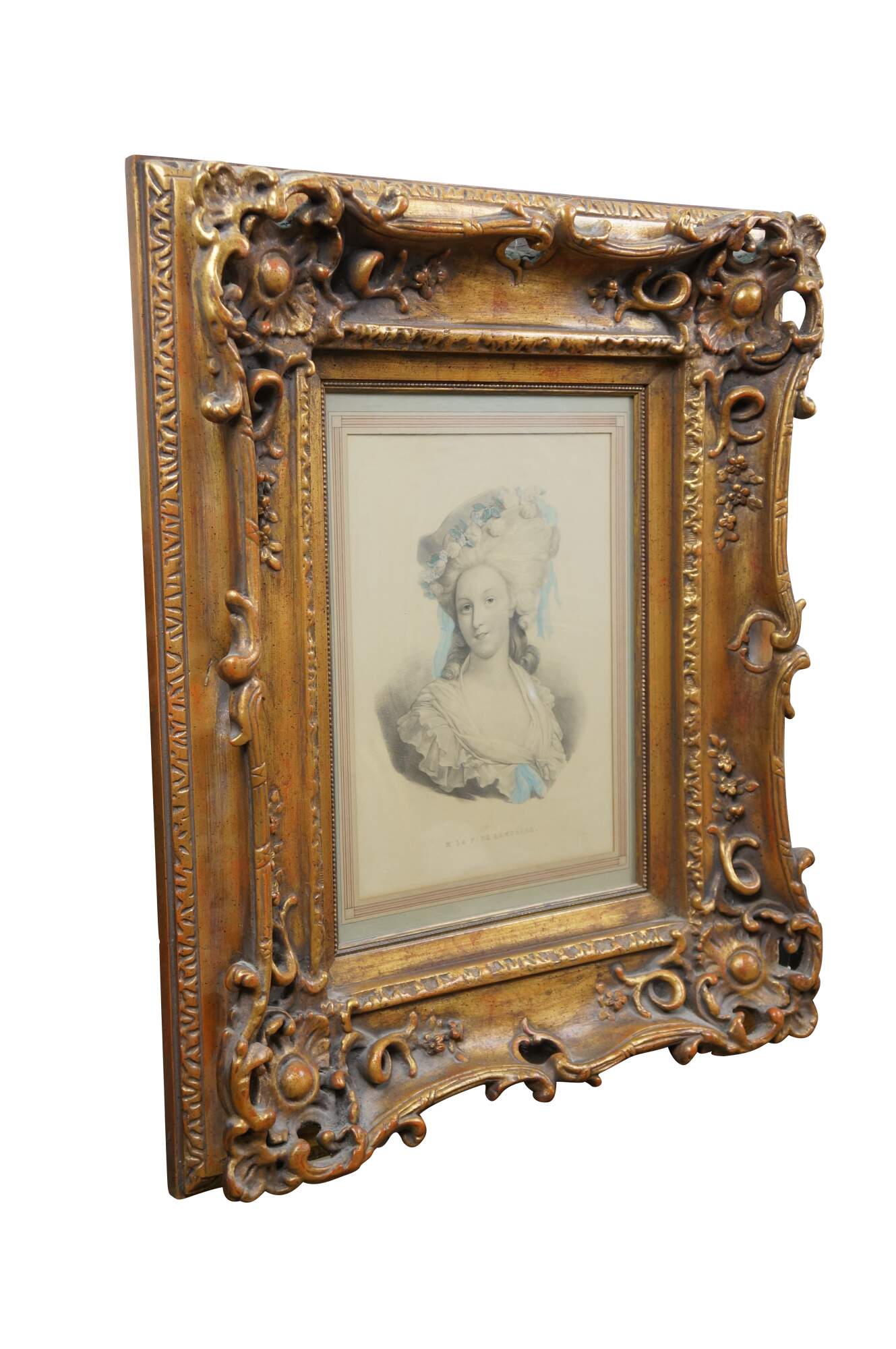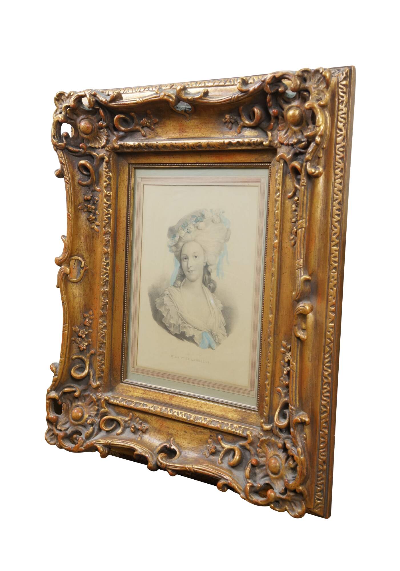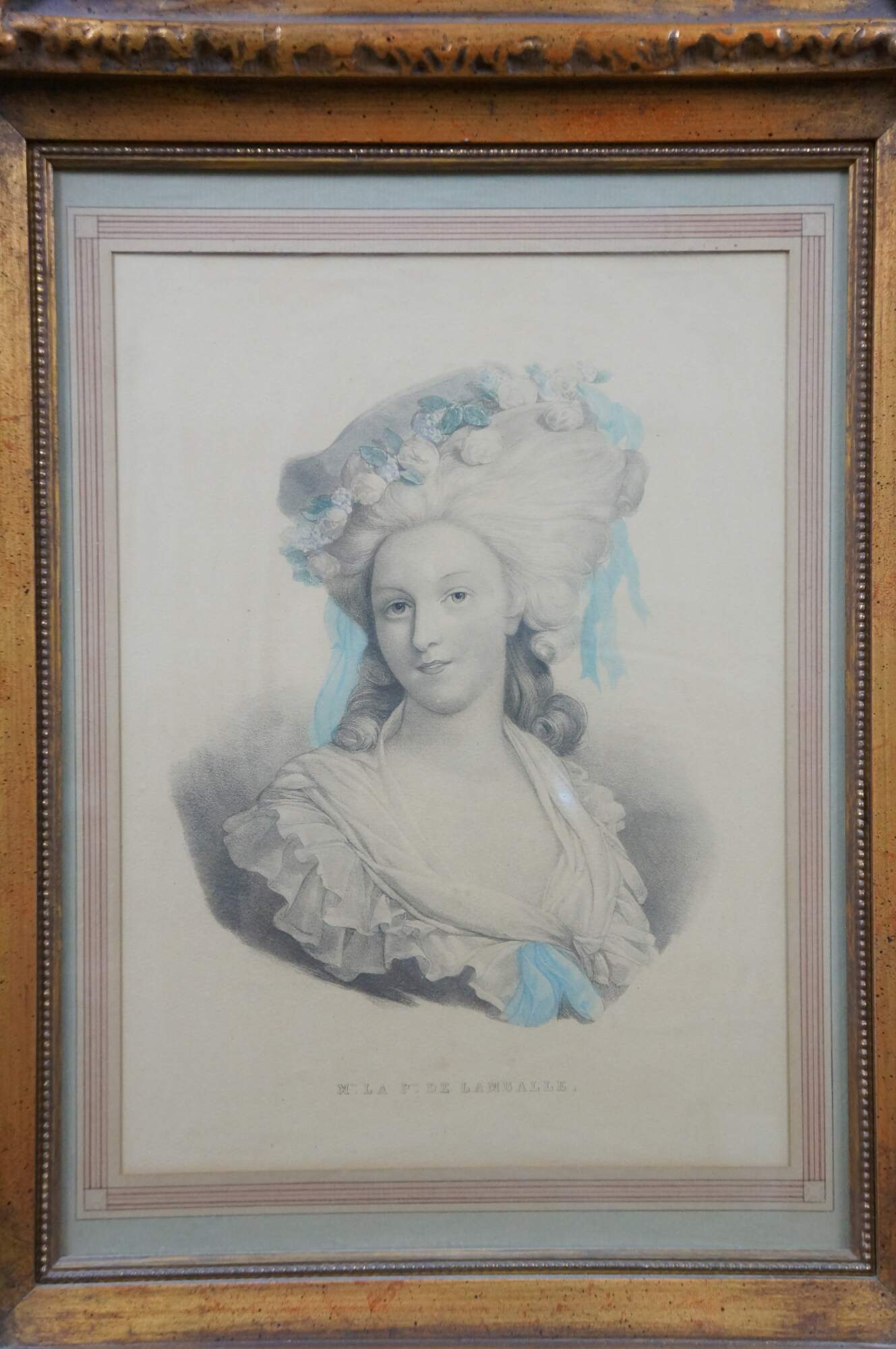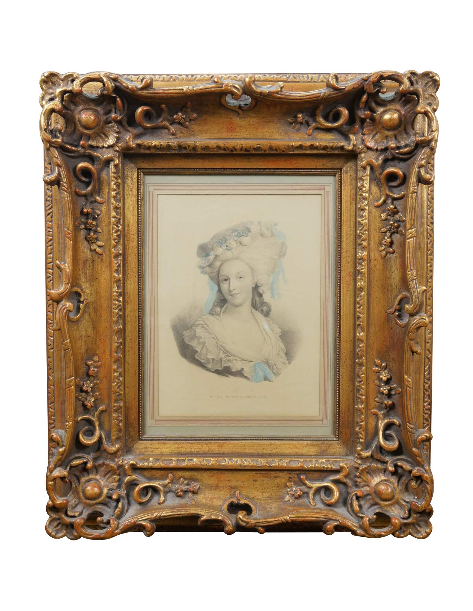 Antique lithograph portrait print of Madame la Princesse de Lambelle. Black and white with hand colored details in blue. "Princess Marie Louise Thérèse of Savoy (Maria Luisa Teresa; 8 September 1749 – 3 September 1792) was born a Princess of Savoy. She was later married to Louis Alexandre de Bourbon a member of the House of Bourbon. In France she was known as the "princesse de Lamballe". She was a close friend of Queen Marie Antoinette. She, like the queen, was killed in the French Revolution. There was national hatred of the Italian-born princess who, along with the Duchess of Polignac, were part of the queen's inner circle." (Wikipedia) Gilt composite frame with floral and foliate details; hand colored pink and blue mat.