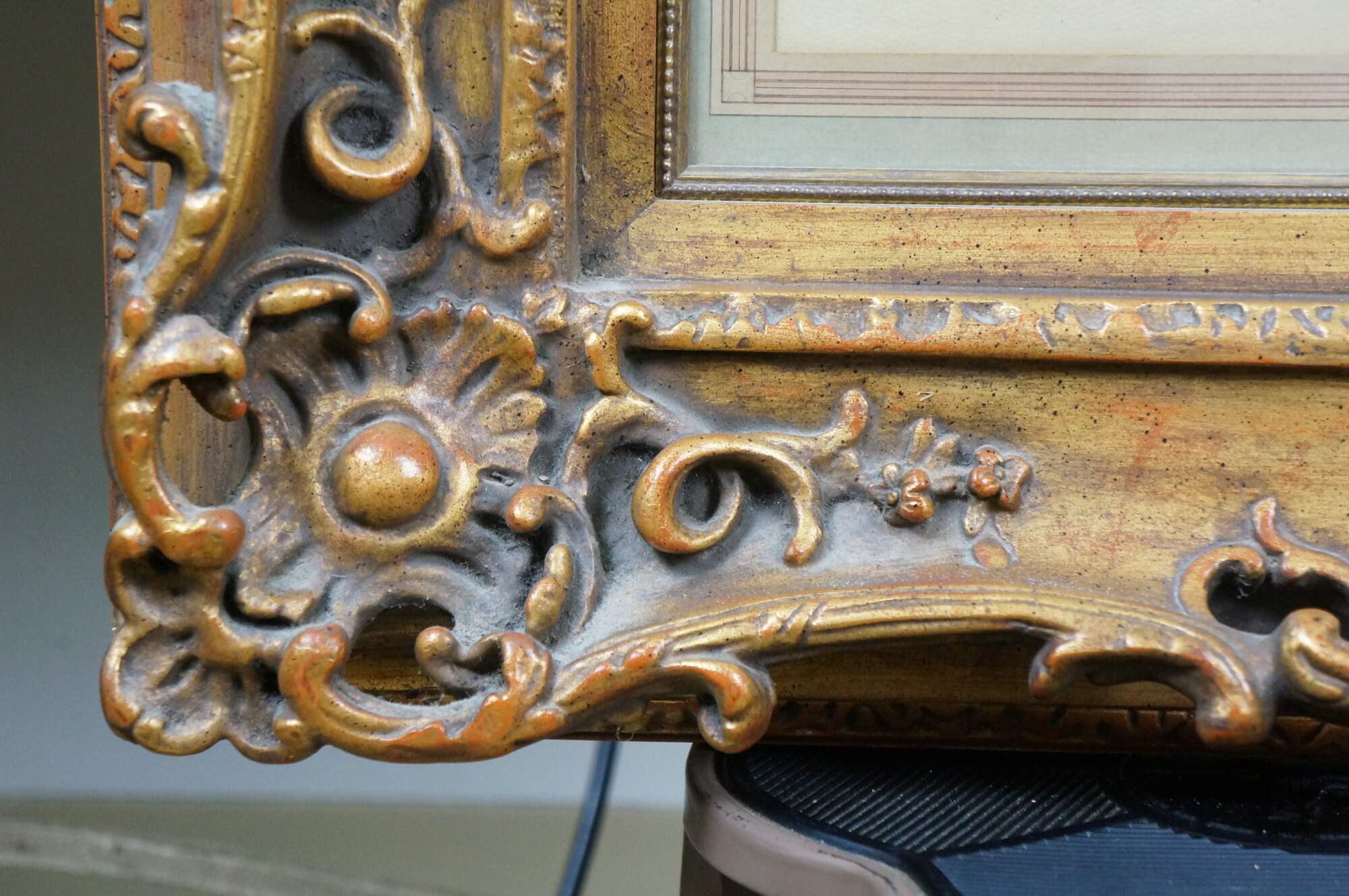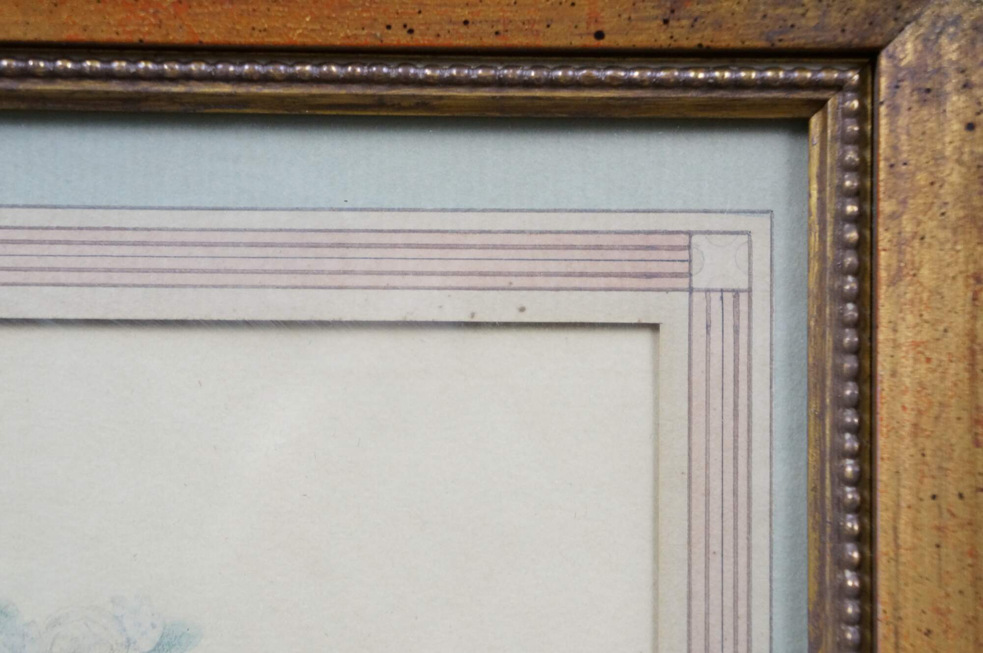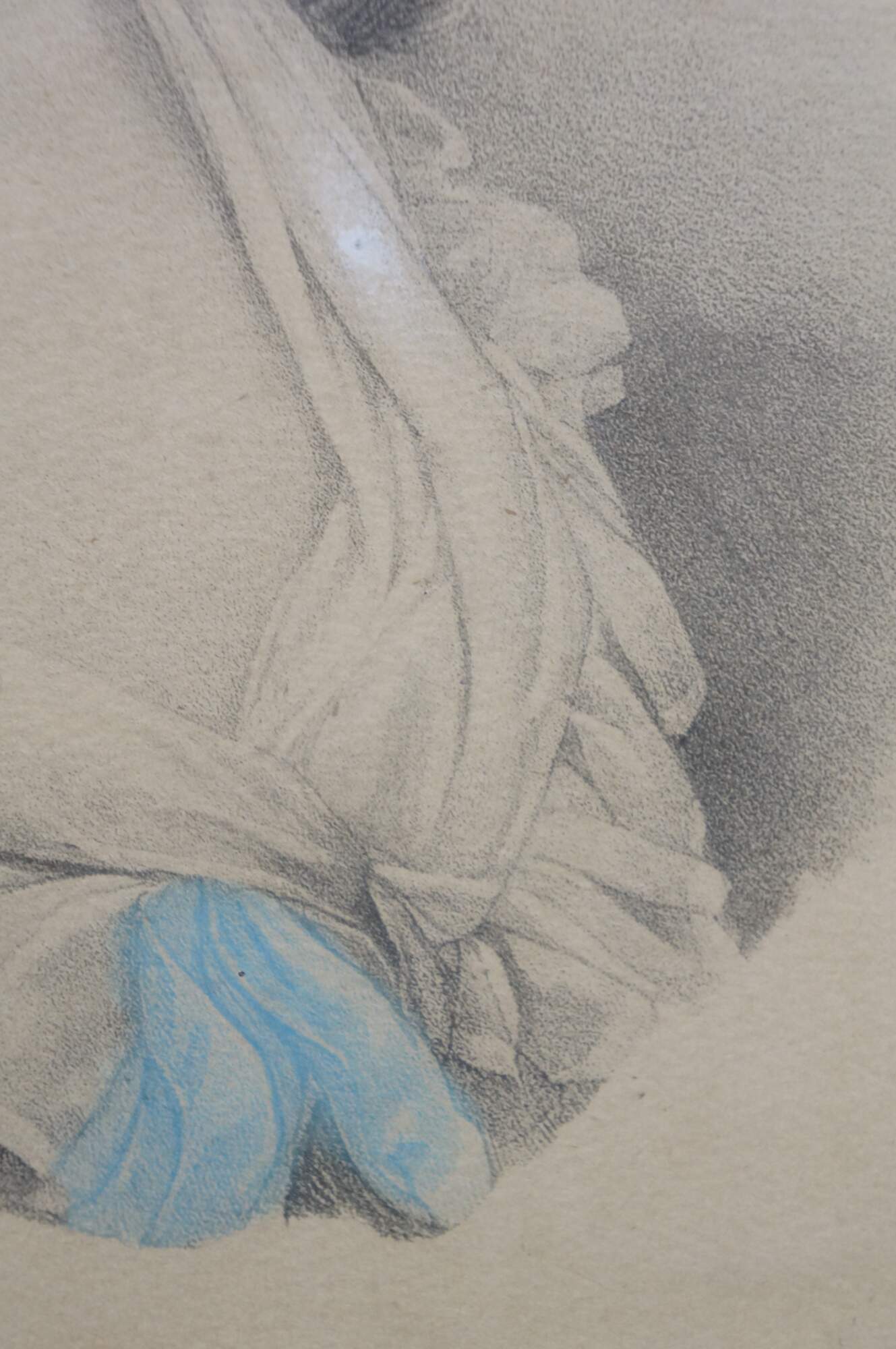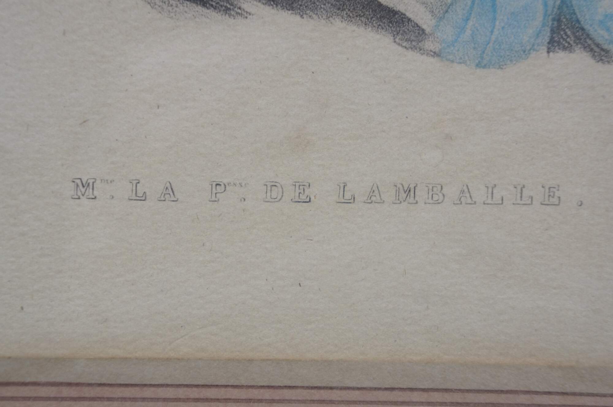 Antique lithograph portrait print of Madame la Princesse de Lambelle. Black and white with hand colored details in blue. "Princess Marie Louise Thérèse of Savoy (Maria Luisa Teresa; 8 September 1749 – 3 September 1792) was born a Princess of Savoy. She was later married to Louis Alexandre de Bourbon a member of the House of Bourbon. In France she was known as the "princesse de Lamballe". She was a close friend of Queen Marie Antoinette. She, like the queen, was killed in the French Revolution. There was national hatred of the Italian-born princess who, along with the Duchess of Polignac, were part of the queen's inner circle." (Wikipedia) Gilt composite frame with floral and foliate details; hand colored pink and blue mat.