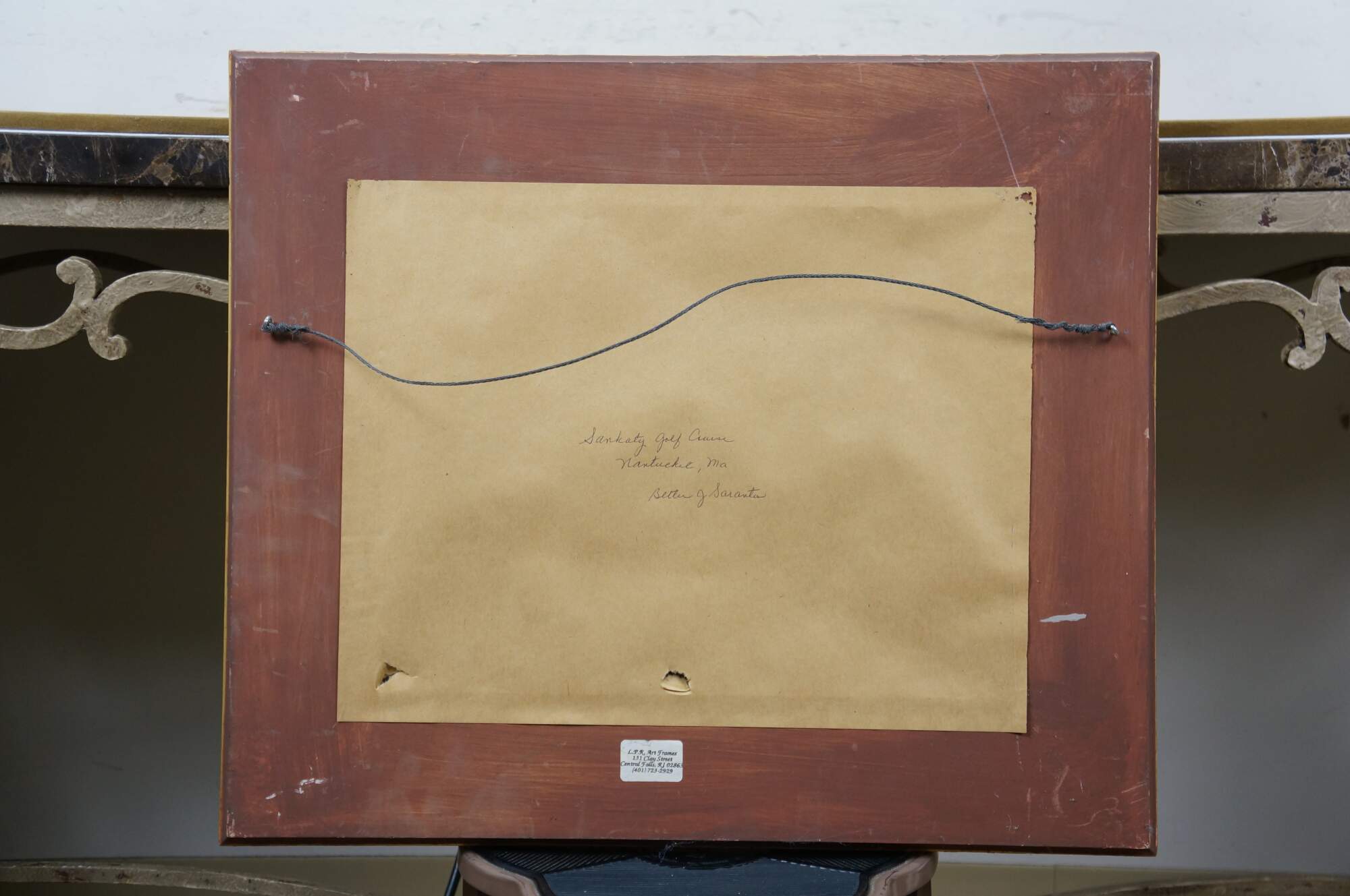 Late 20th century oil on board painting titled "Sankaty Golf Course Nantucket, MA" by Bettie J. Sarantos. Landscape from a putting green with two figures in white, with a view of a distant lighthouse. Signed, lower right. Beveled giltwood frame.