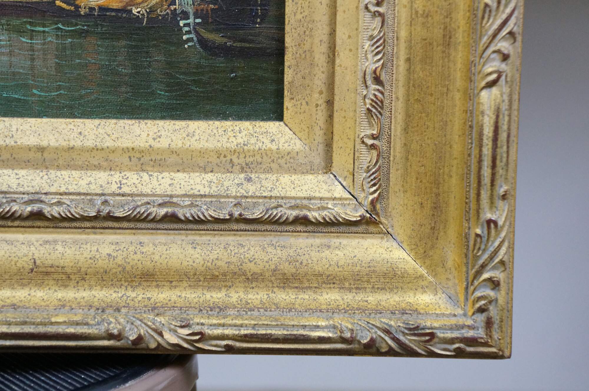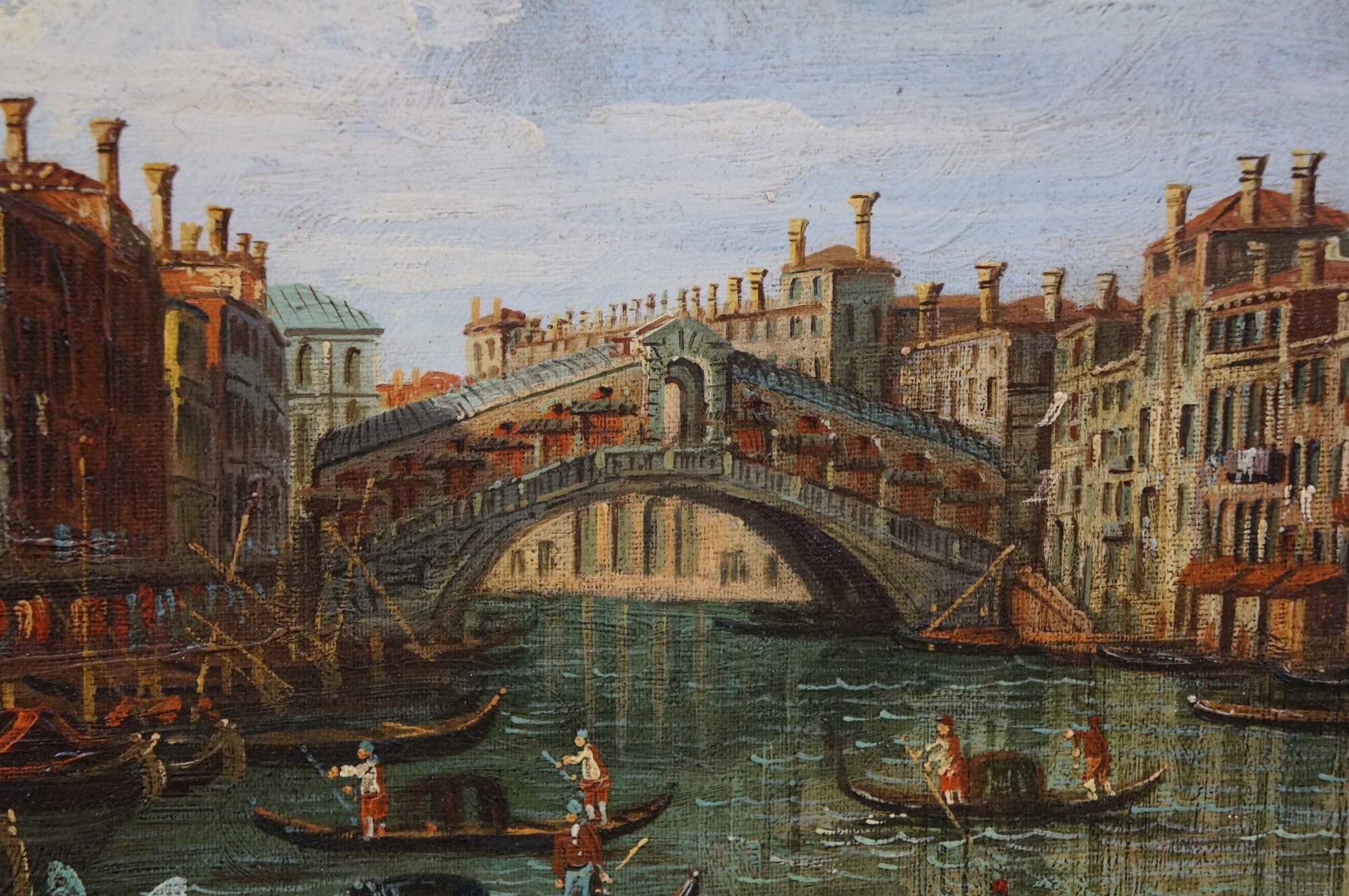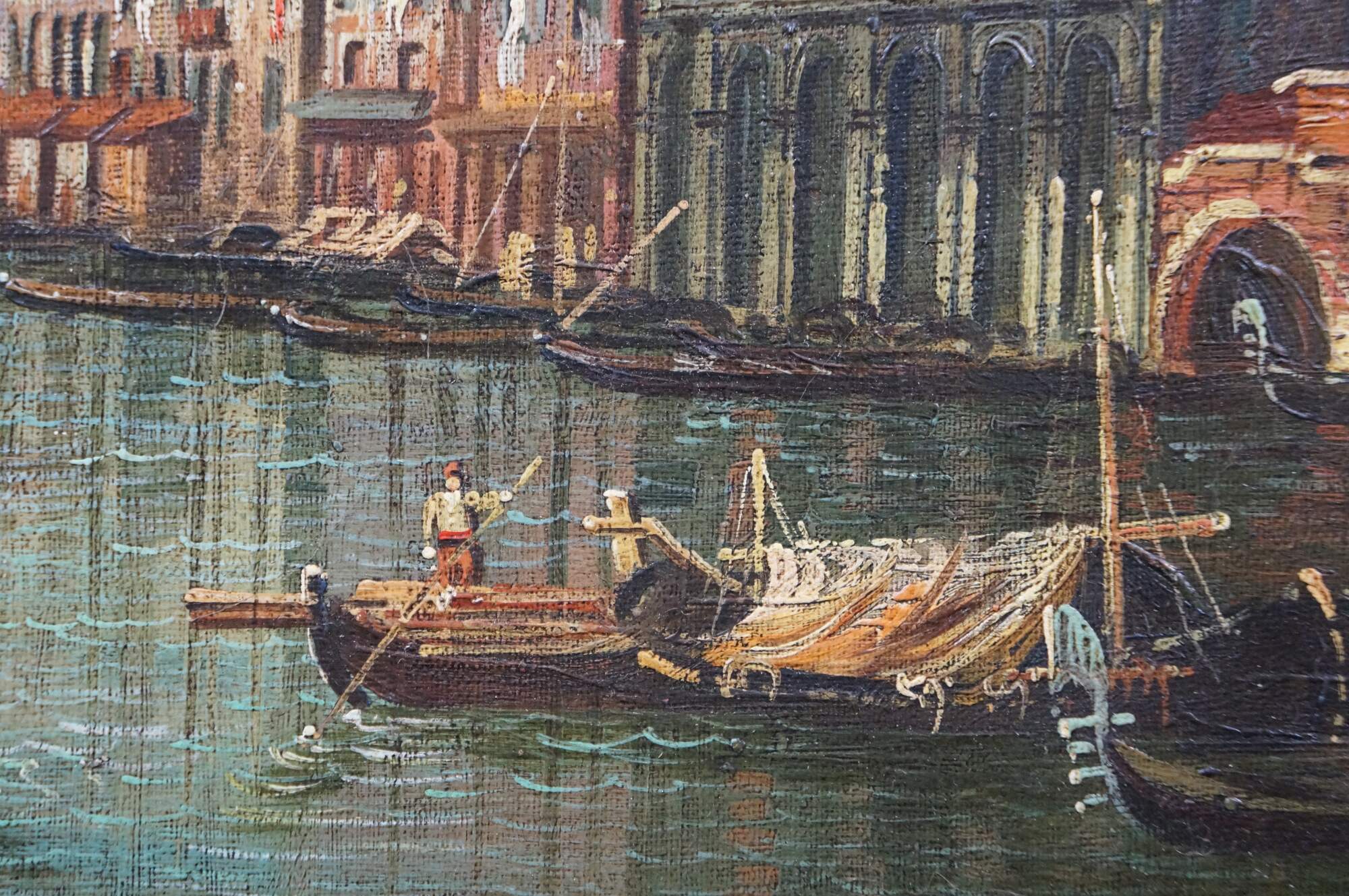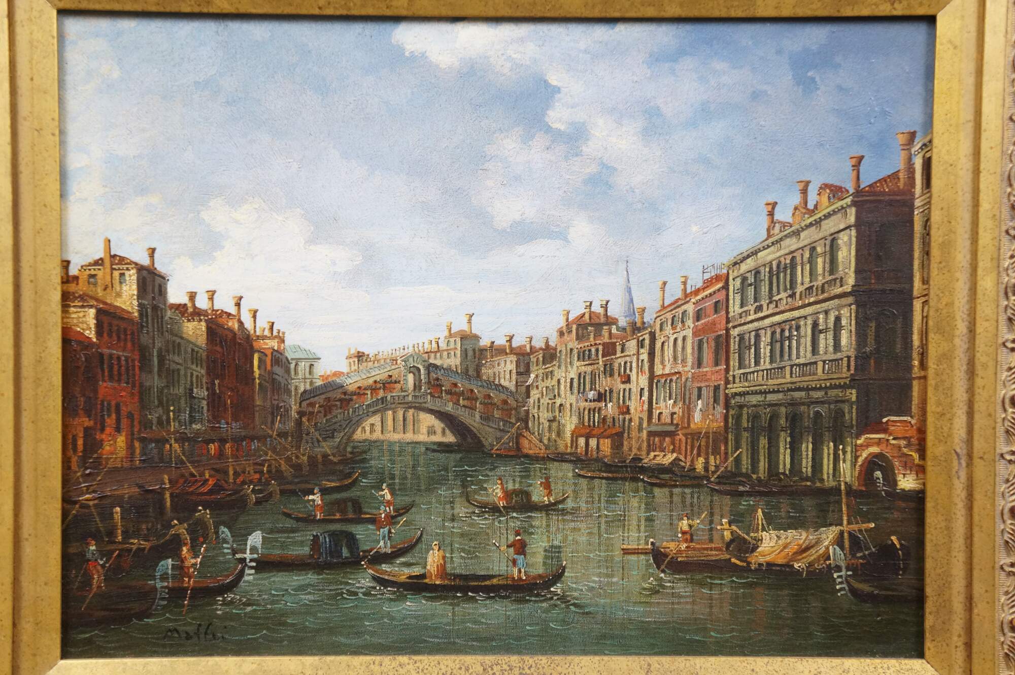 Late 20th century oil on canvas cityscape after “Venice Grand Canal and the Rialto Bridge View from South” by Canaletto, originally painted circa 1733-35. Shows a view of the Rialto Bridge along Venice's Grand Canal with many figures in gondolas. Signed Maffei, lower left. Gilt wood & composite frame with foliate details.