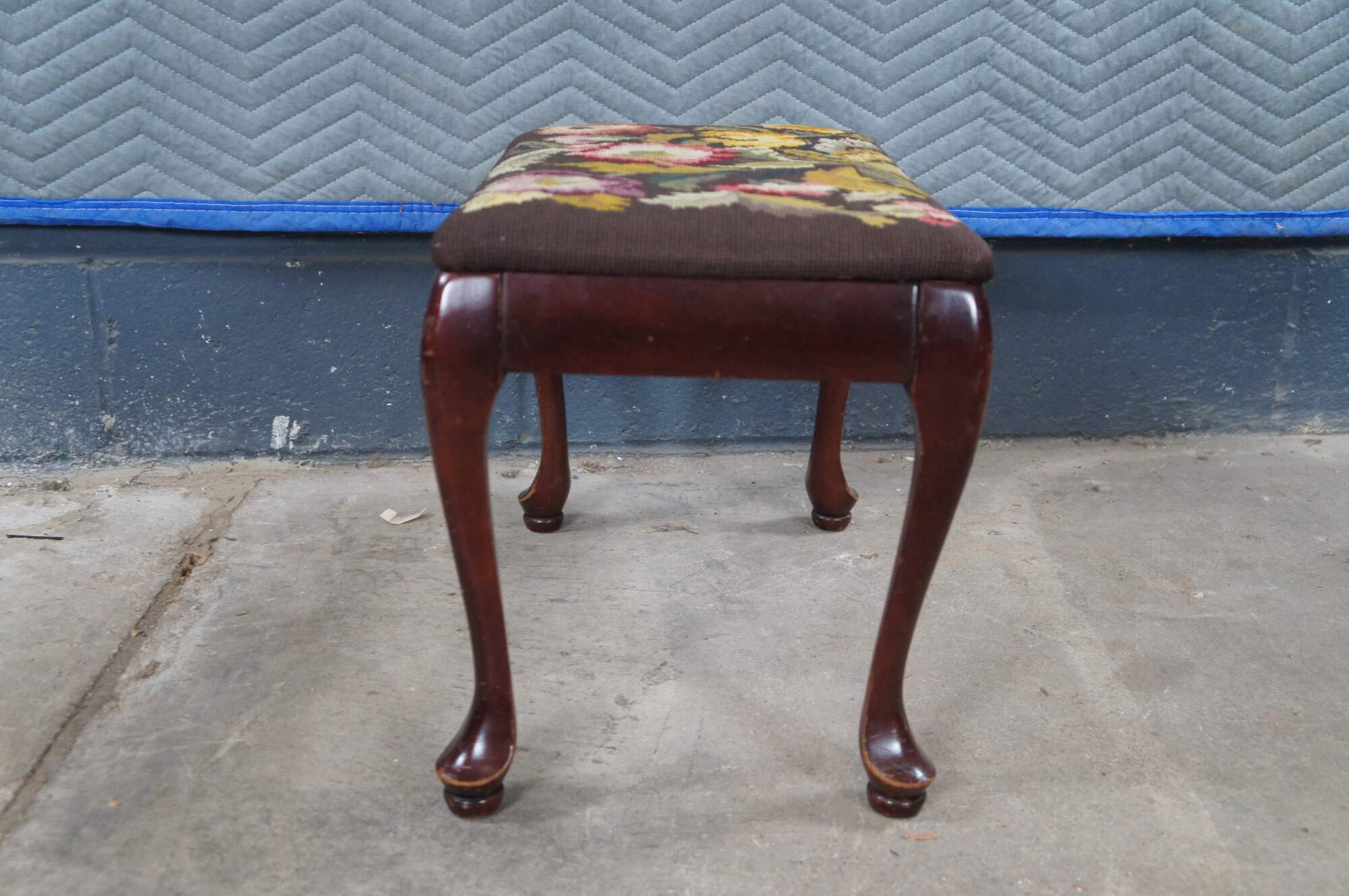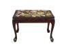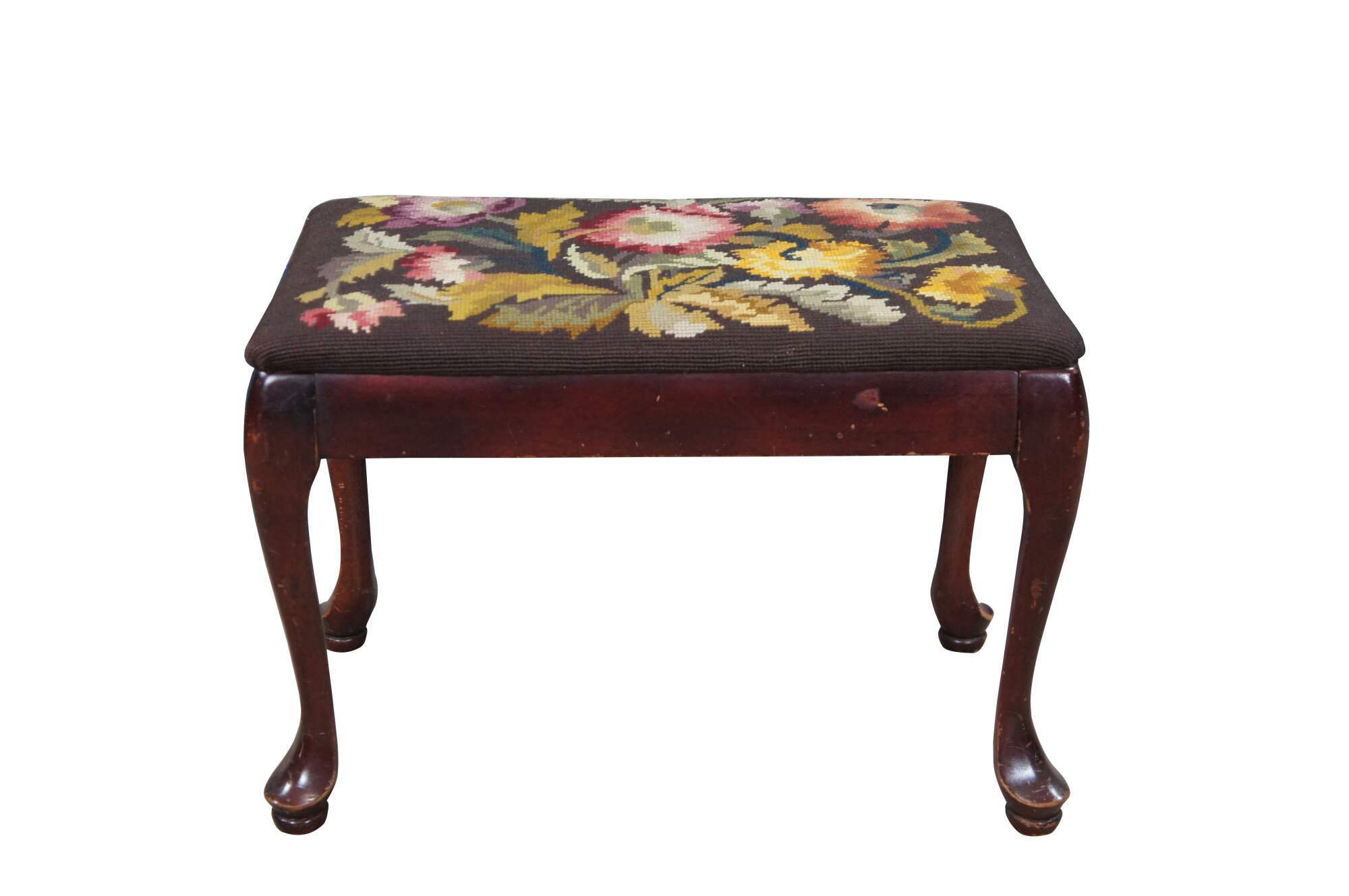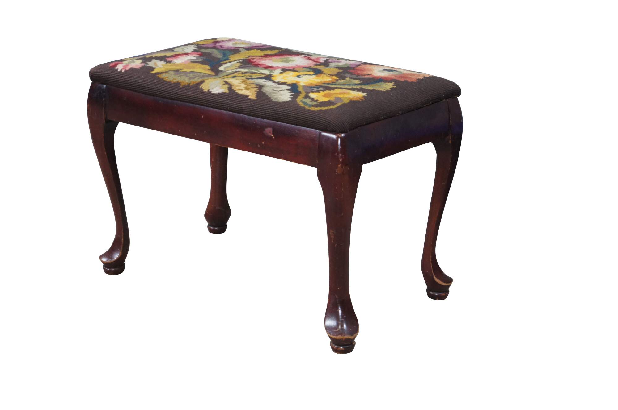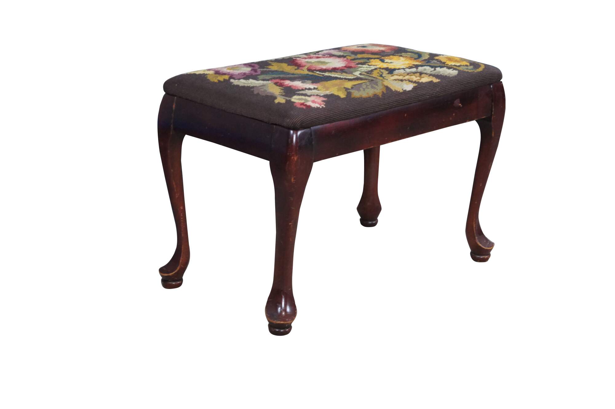 Antique Queen Anne stool, foot rest or ottoman. Made of solid mahogany featuring needlepoint floral acanthus embroidered upholstery and pad feet.