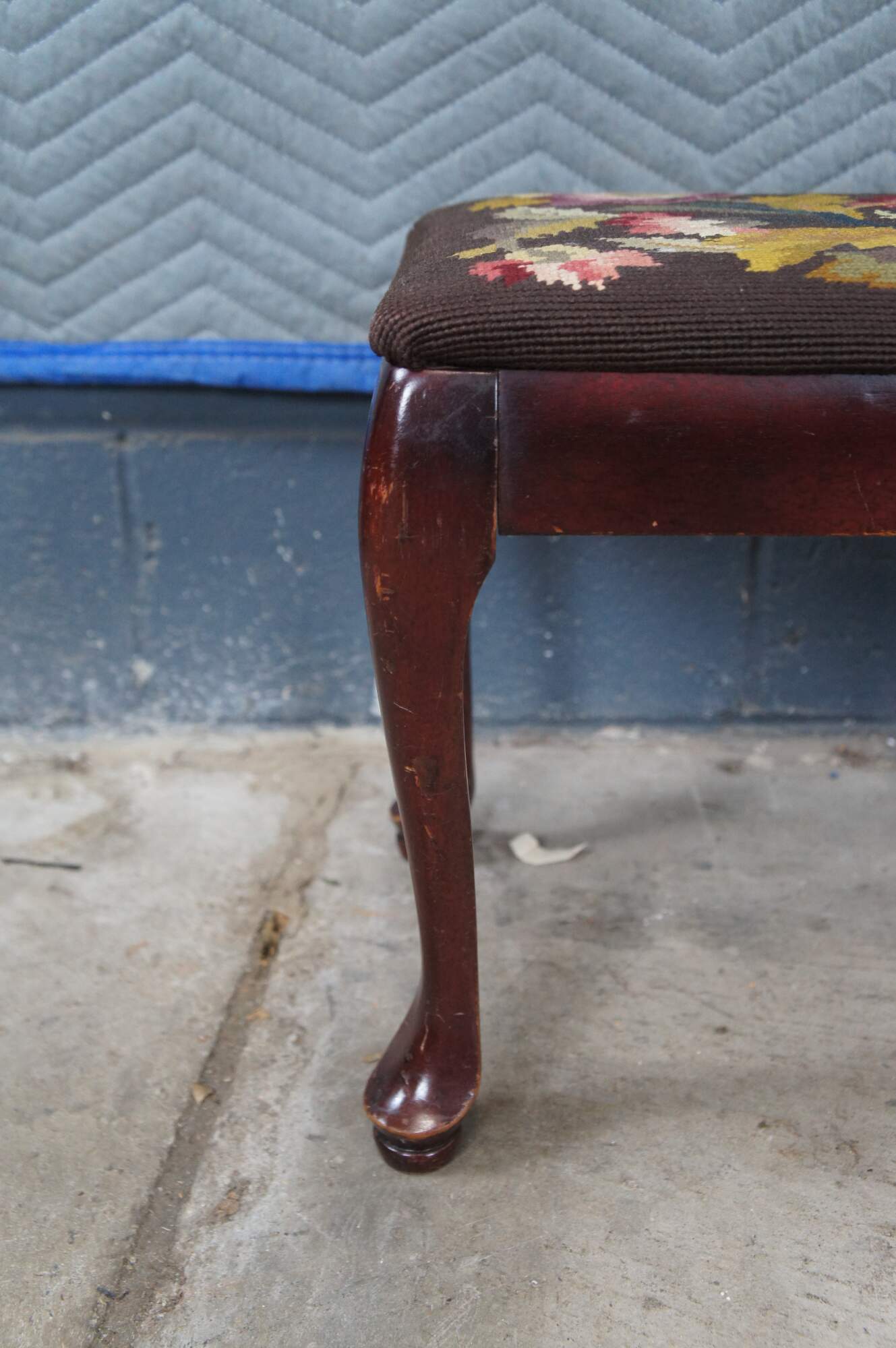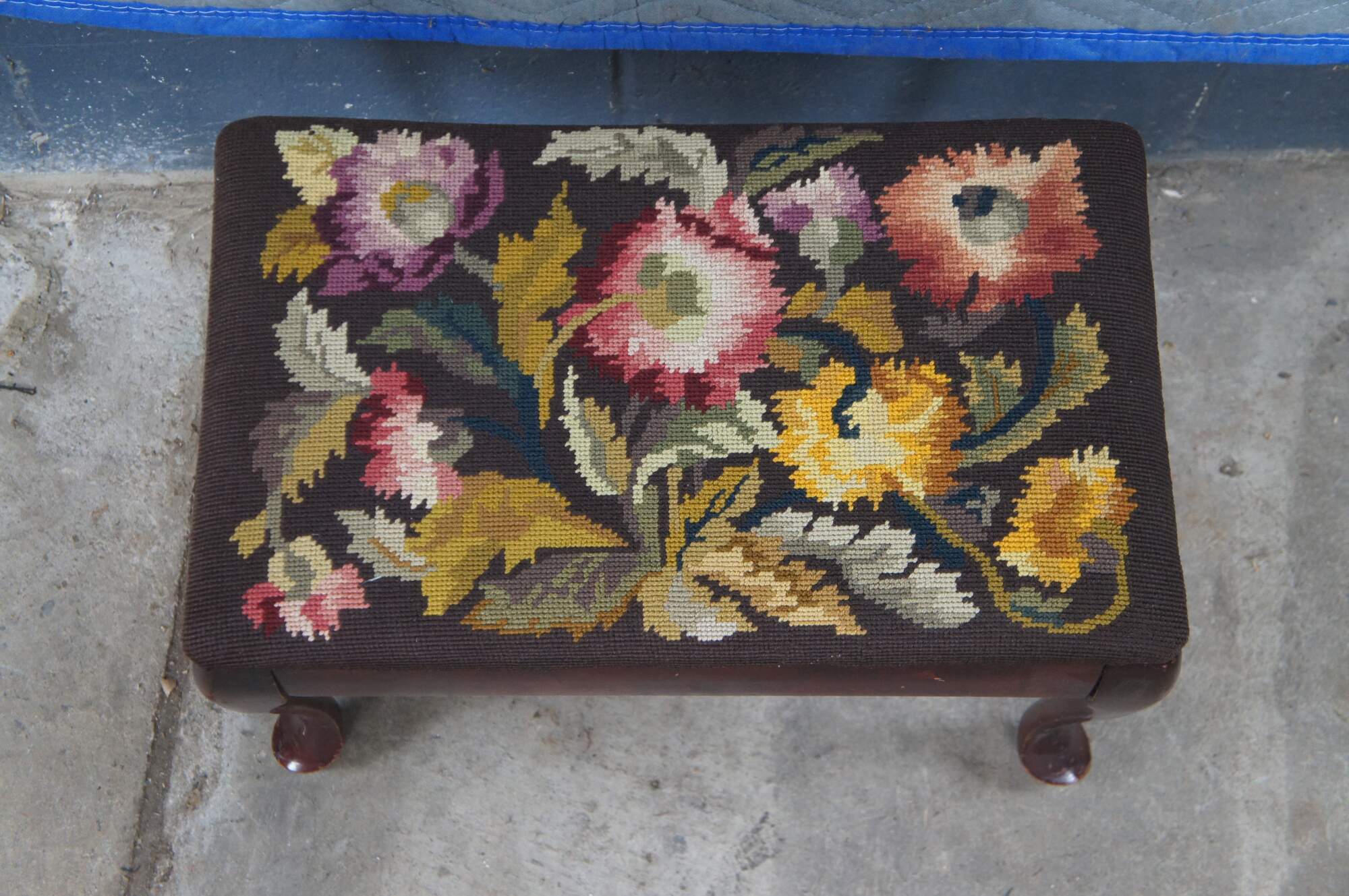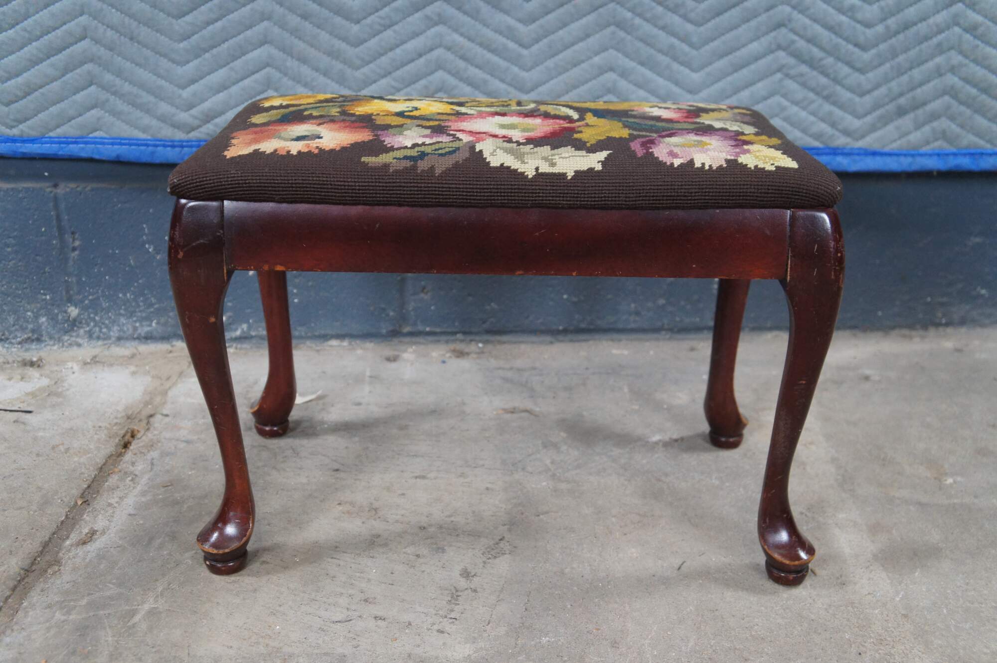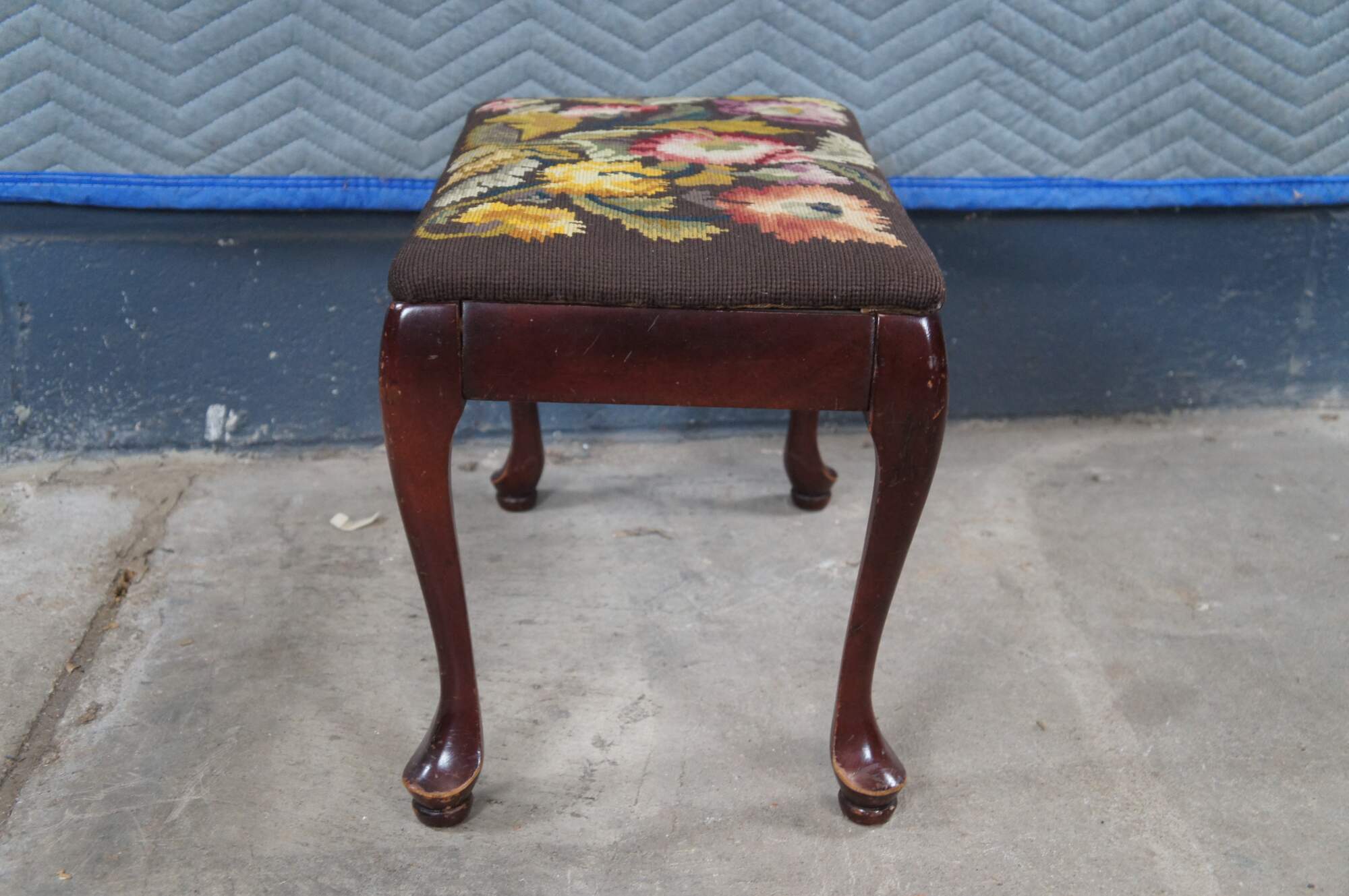 Antique Queen Anne stool, foot rest or ottoman. Made of solid mahogany featuring needlepoint floral acanthus embroidered upholstery and pad feet.