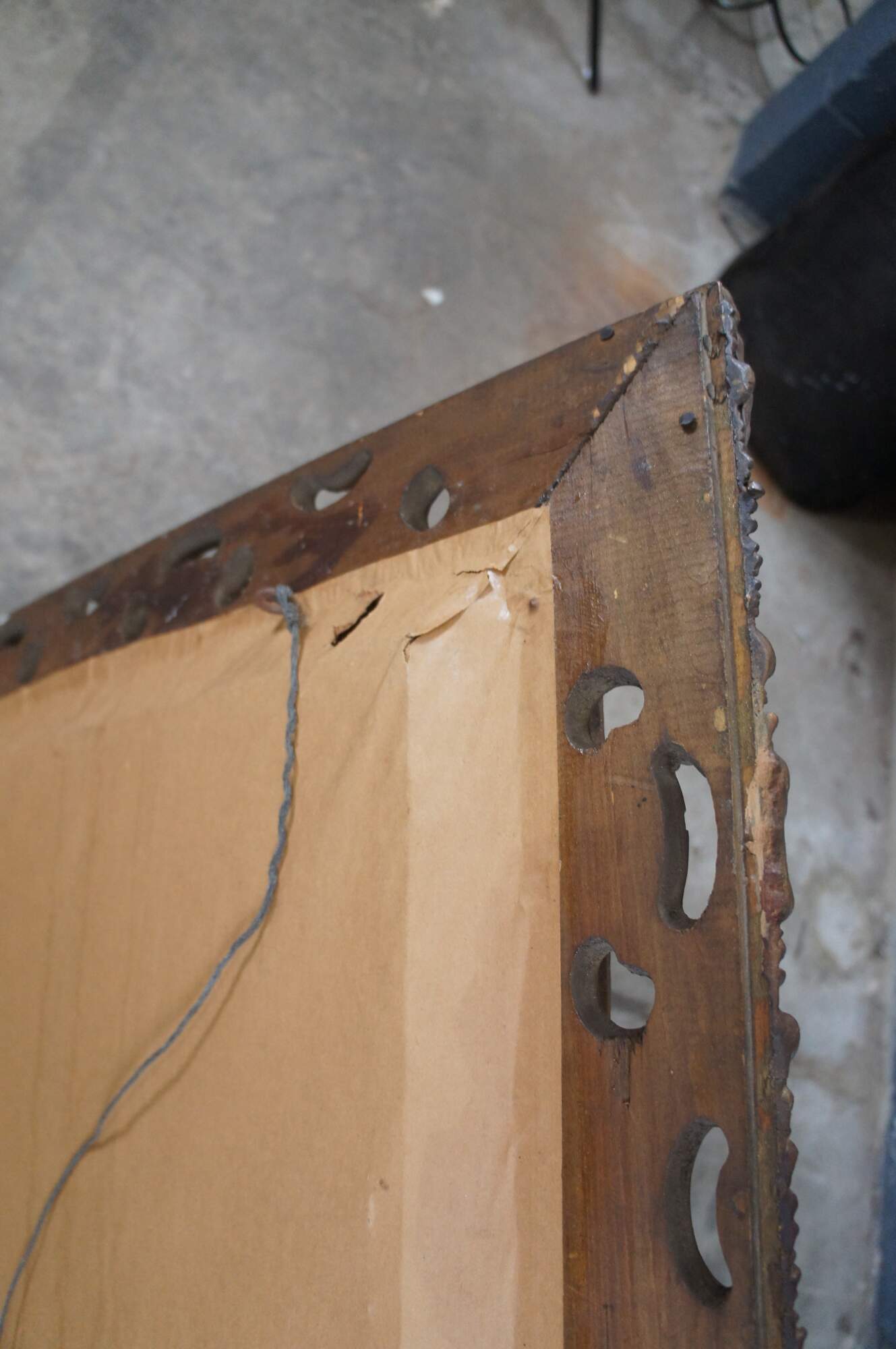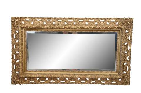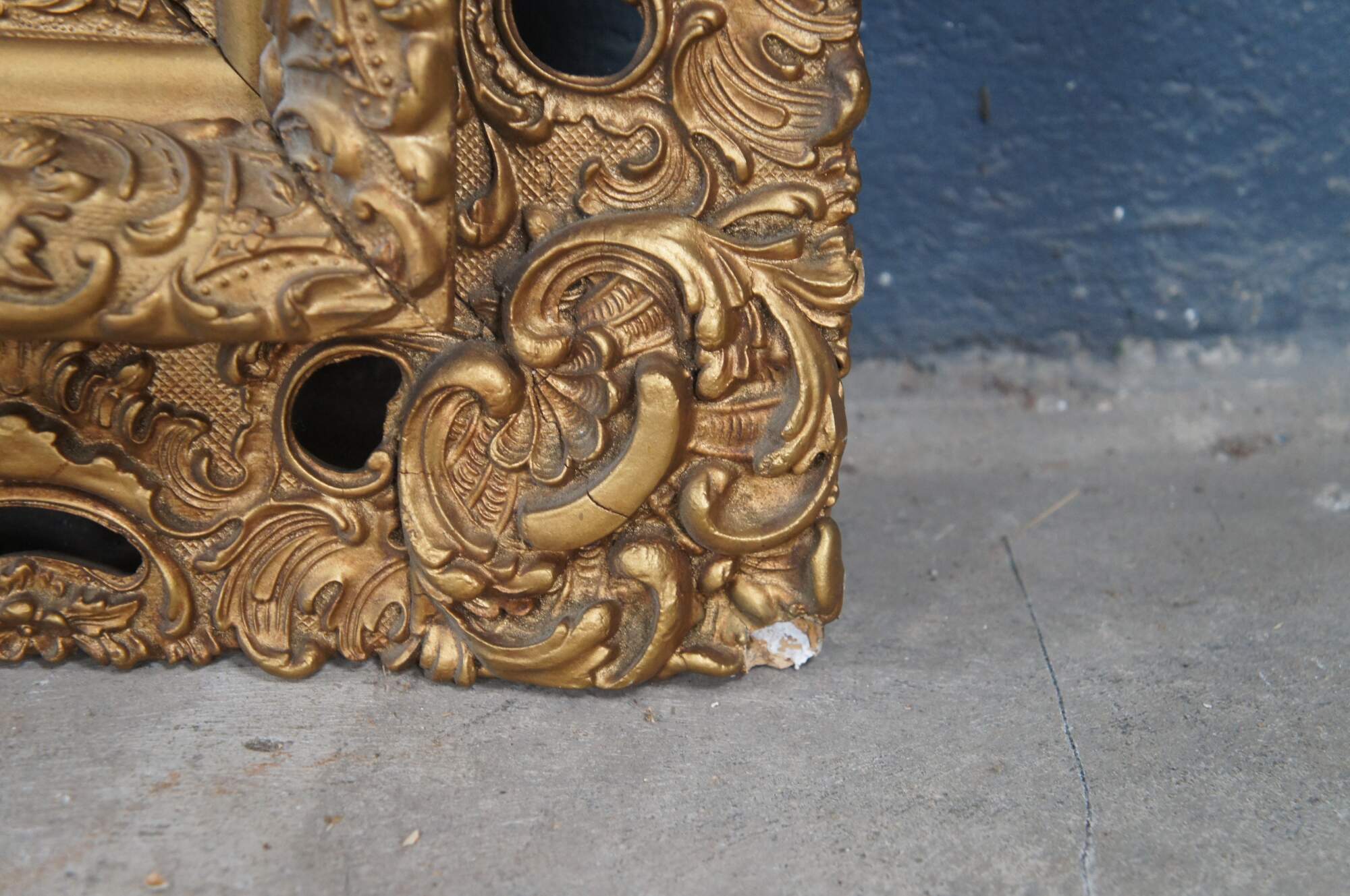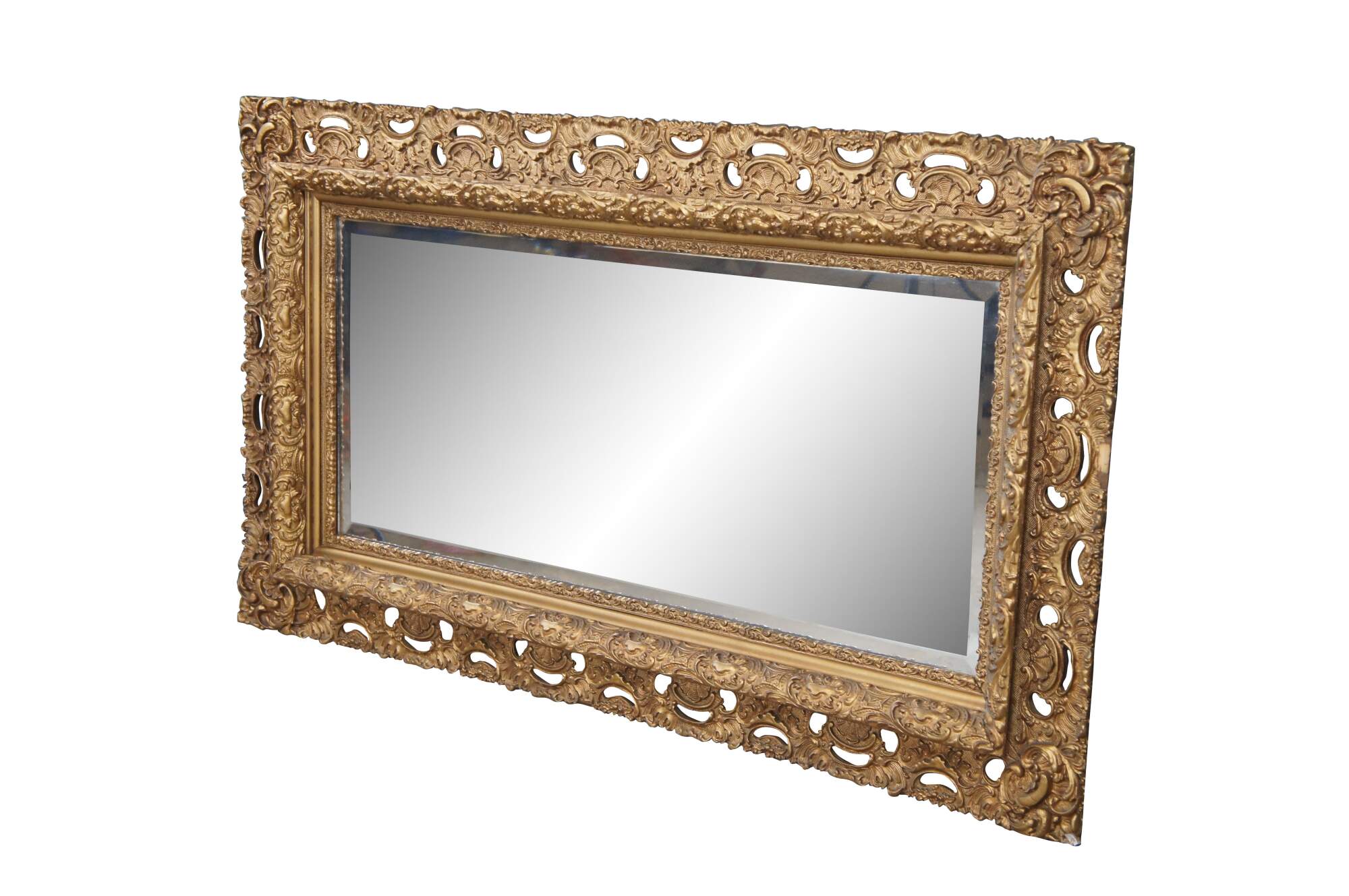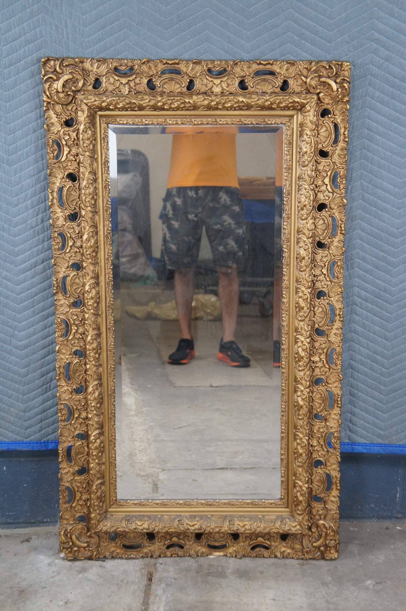 Antique ornate French Baroque / Rococo style gold gilt beveled vanity / hall / mantel mirror featuring a pierced and reticulated design with scalloped acanthus and foliate accents.