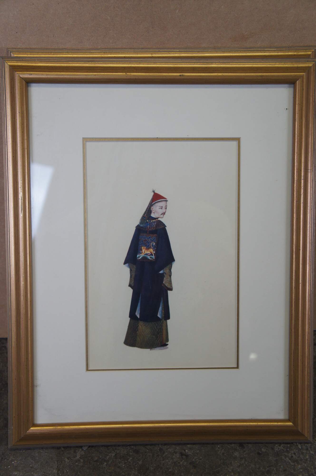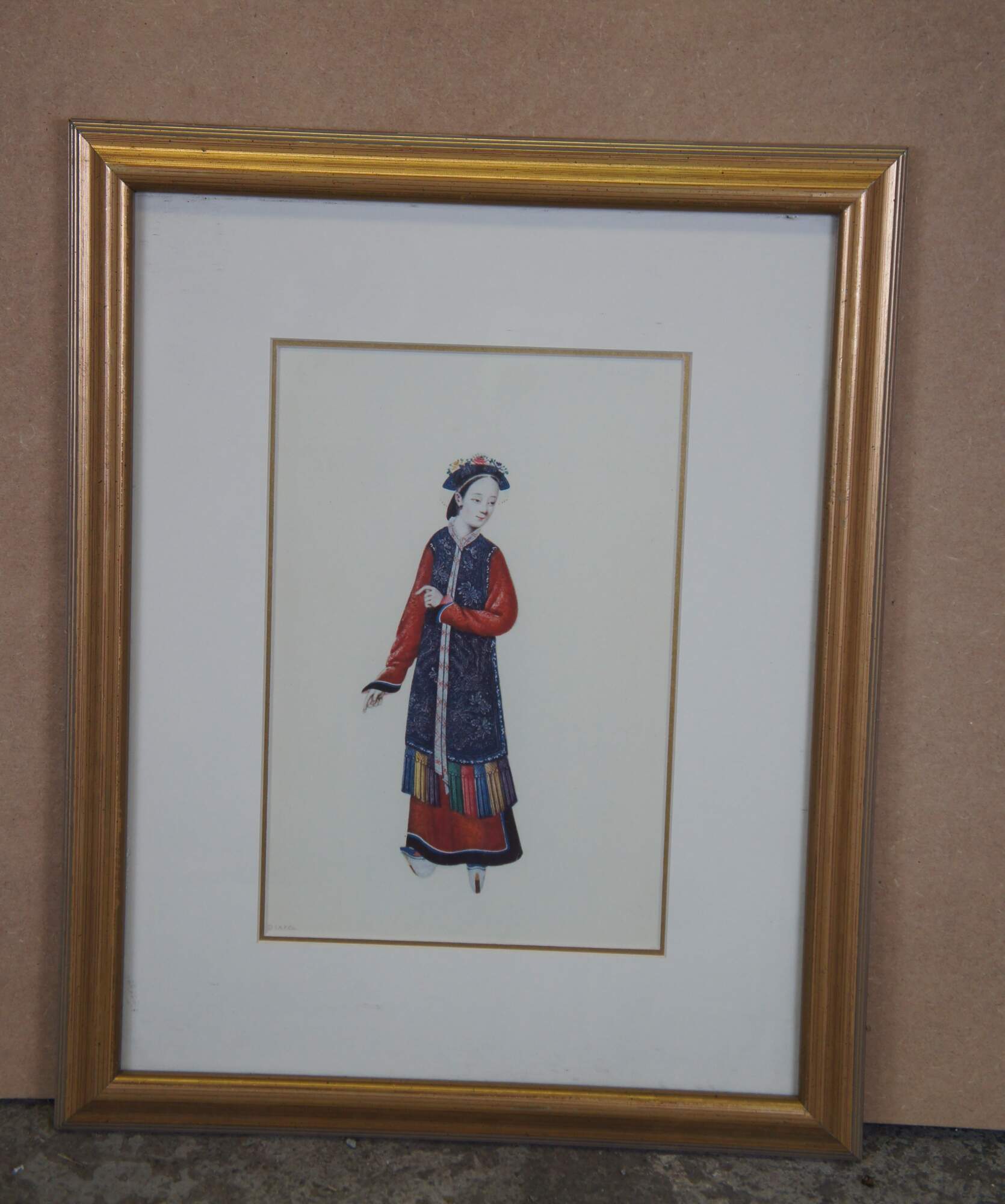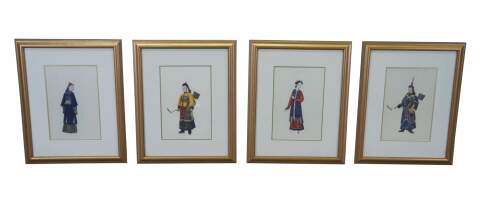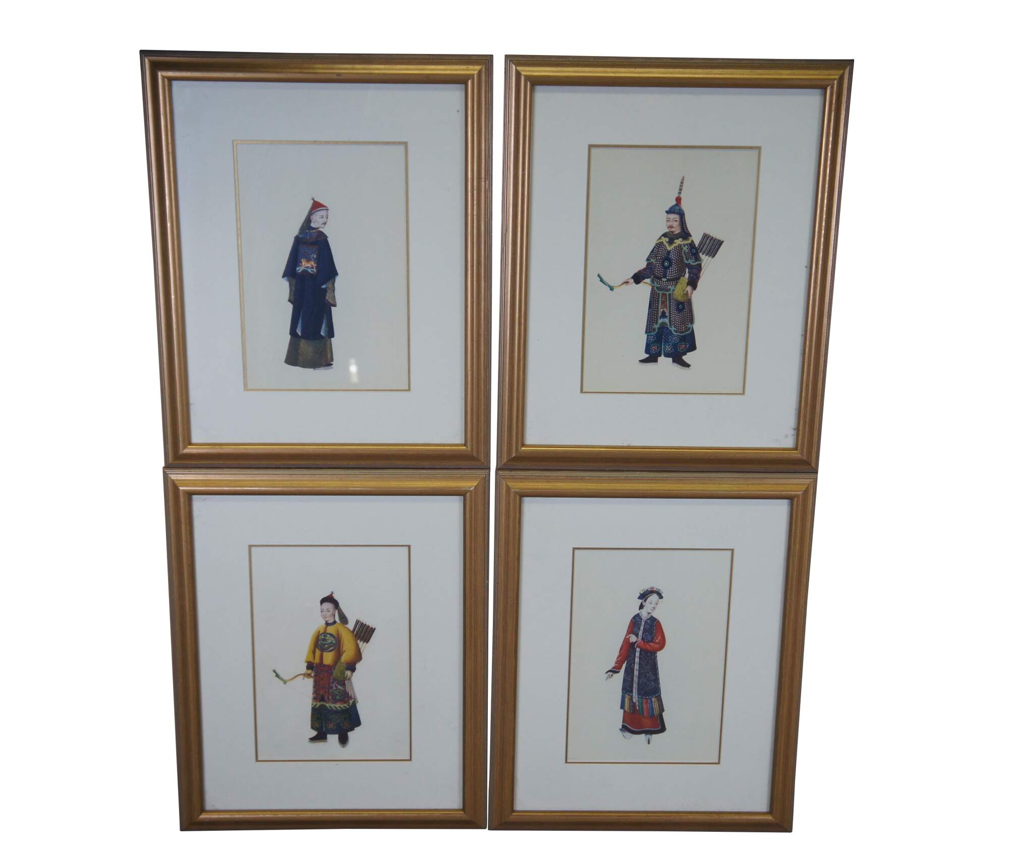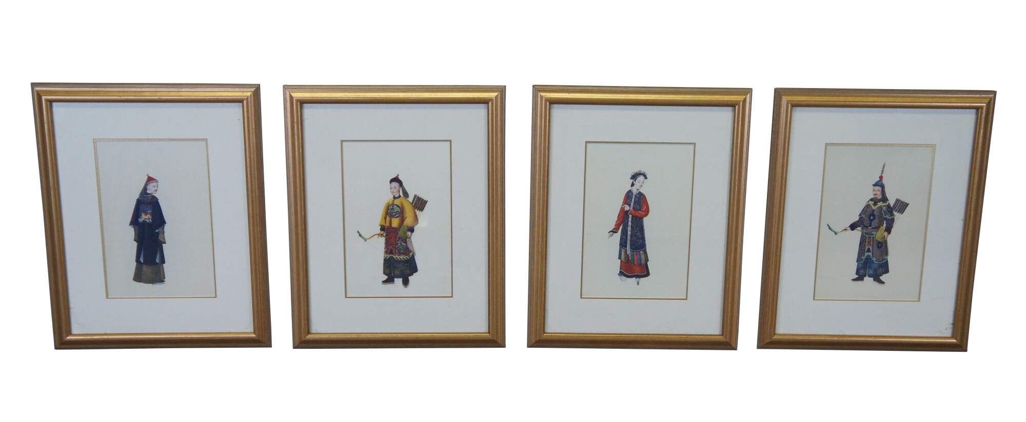 "Chinese Figure No.1-4". Includes A man and woman and two soldiers in traditional Qing Dynasty Clothing. Professionally framed with with gold beveled frame.