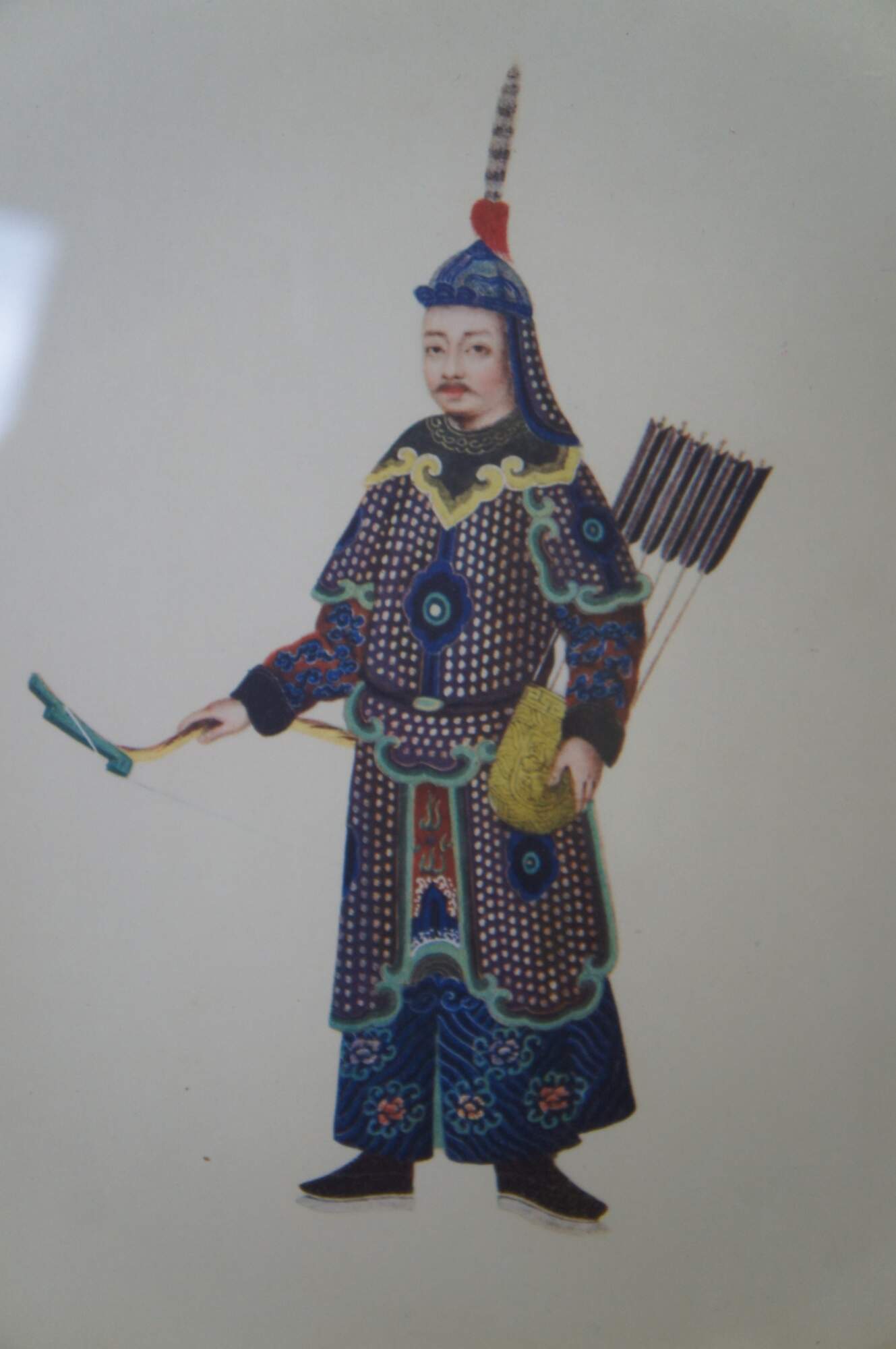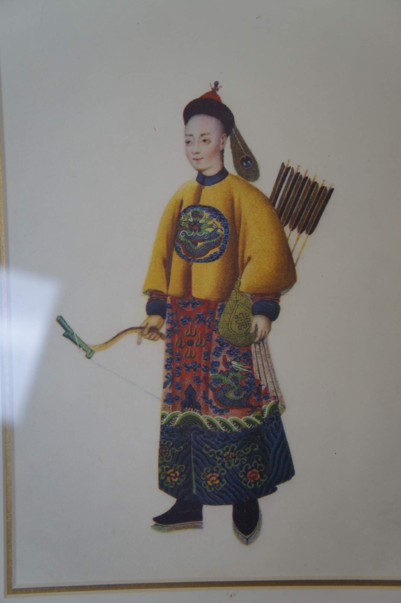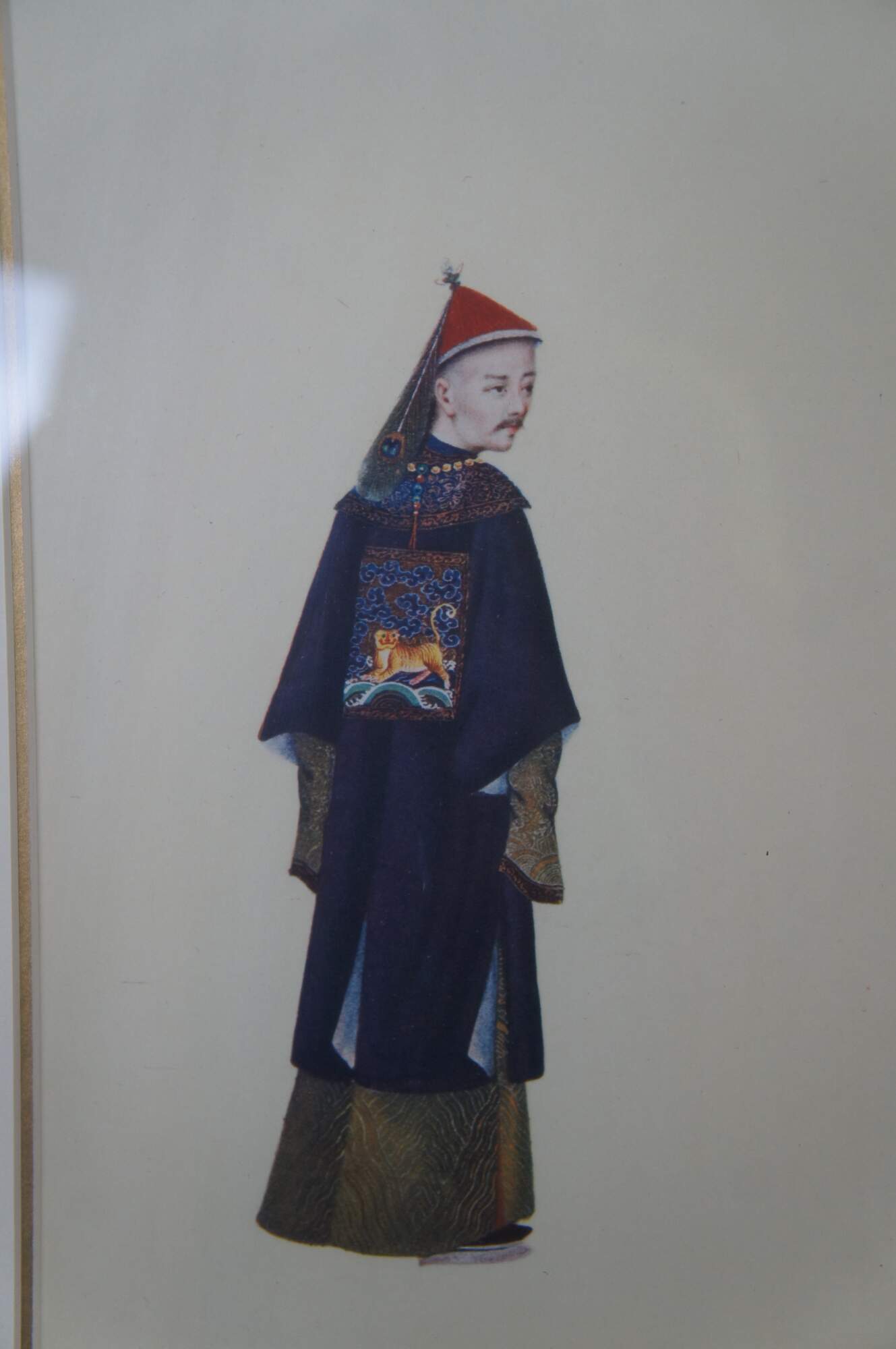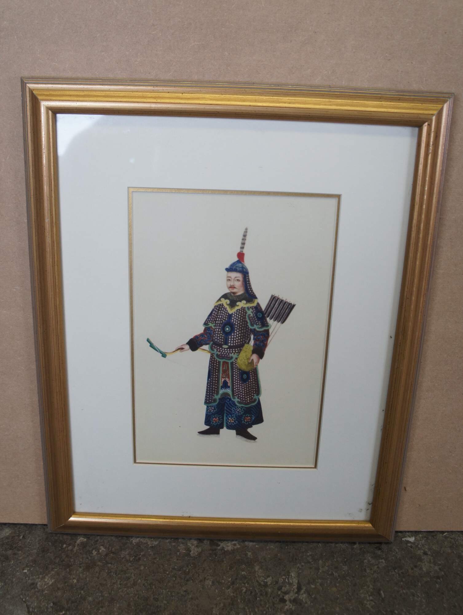"Chinese Figure No.1-4". Includes A man and woman and two soldiers in traditional Qing Dynasty Clothing. Professionally framed with with gold beveled frame.