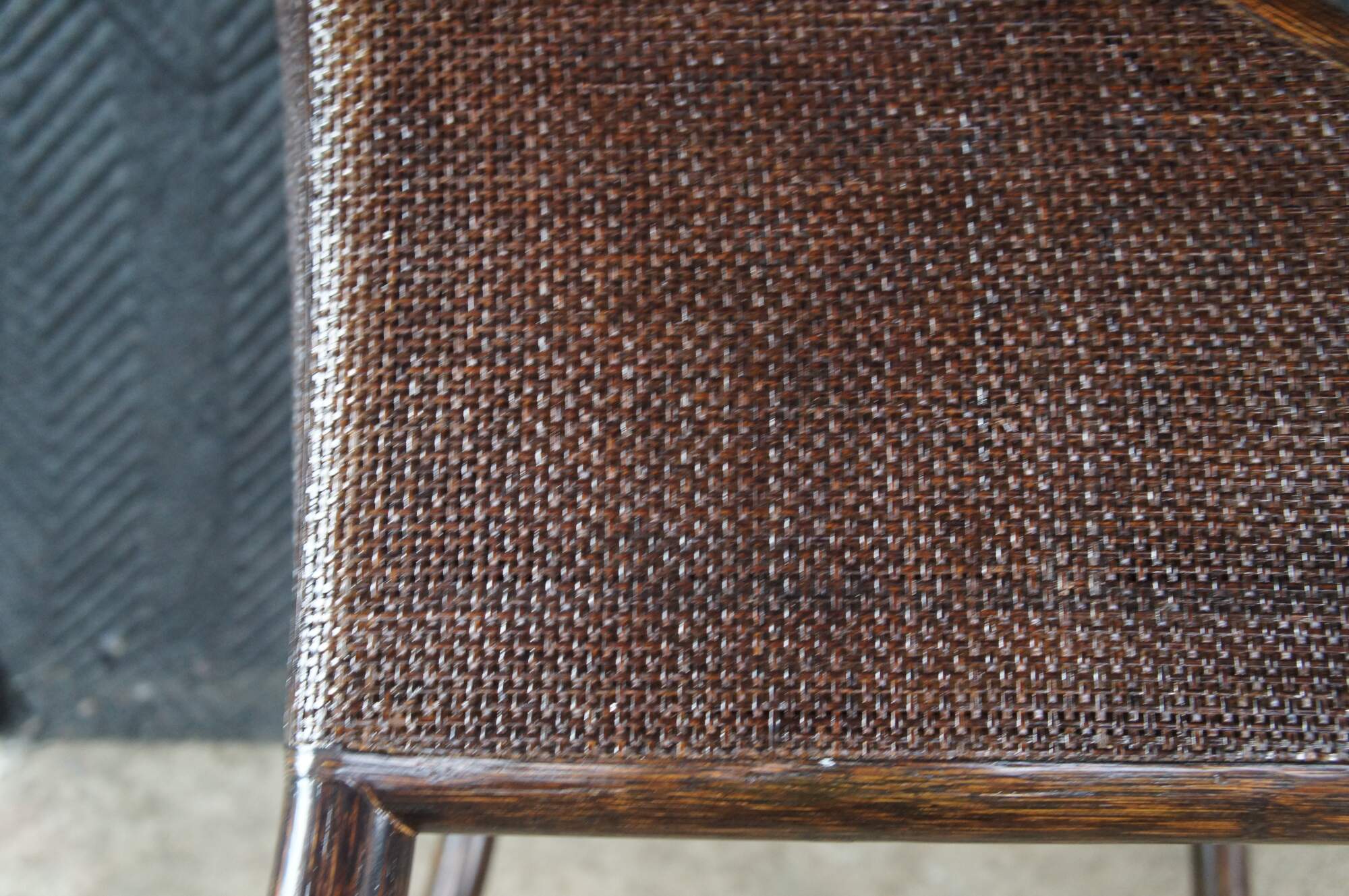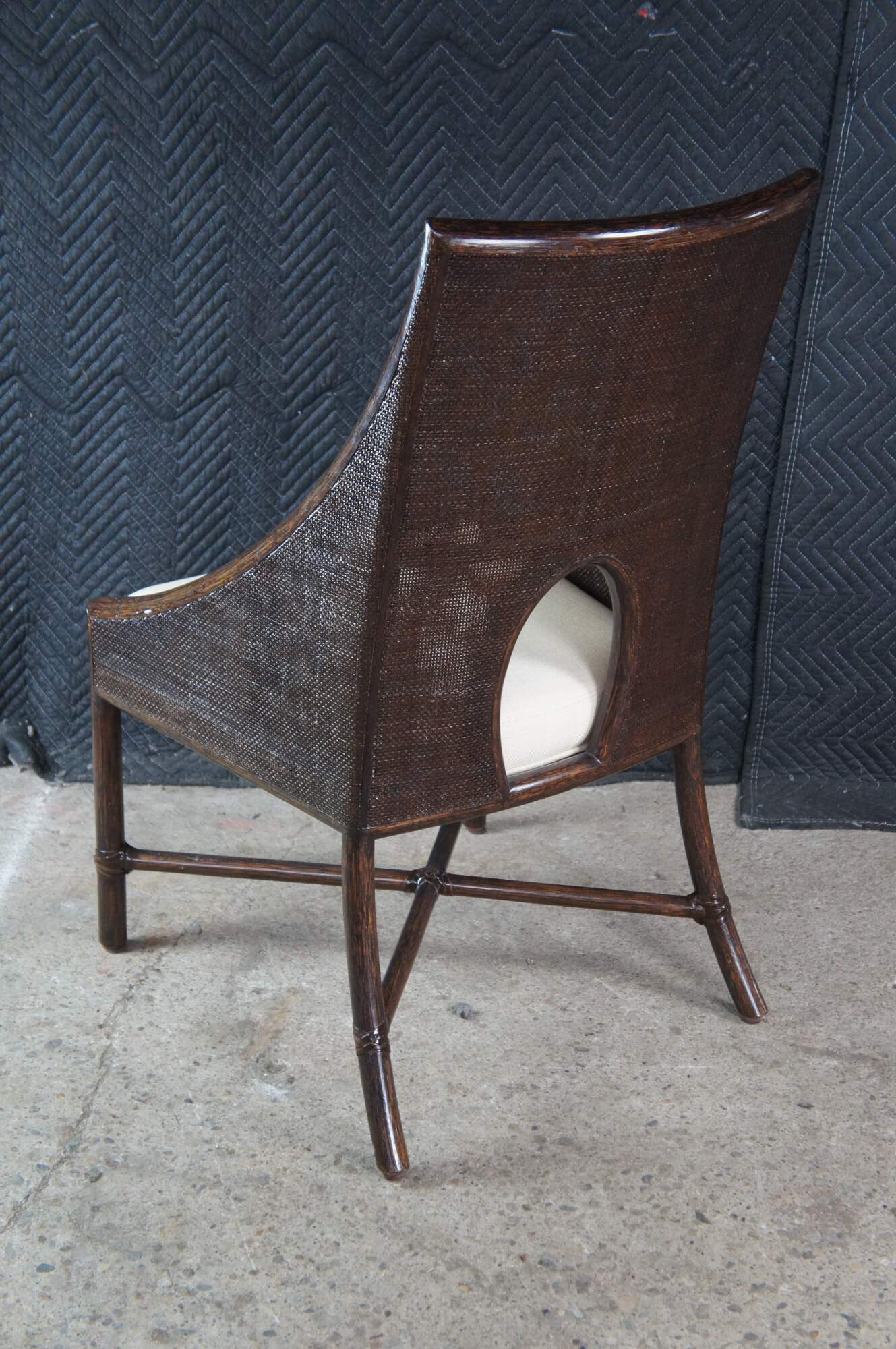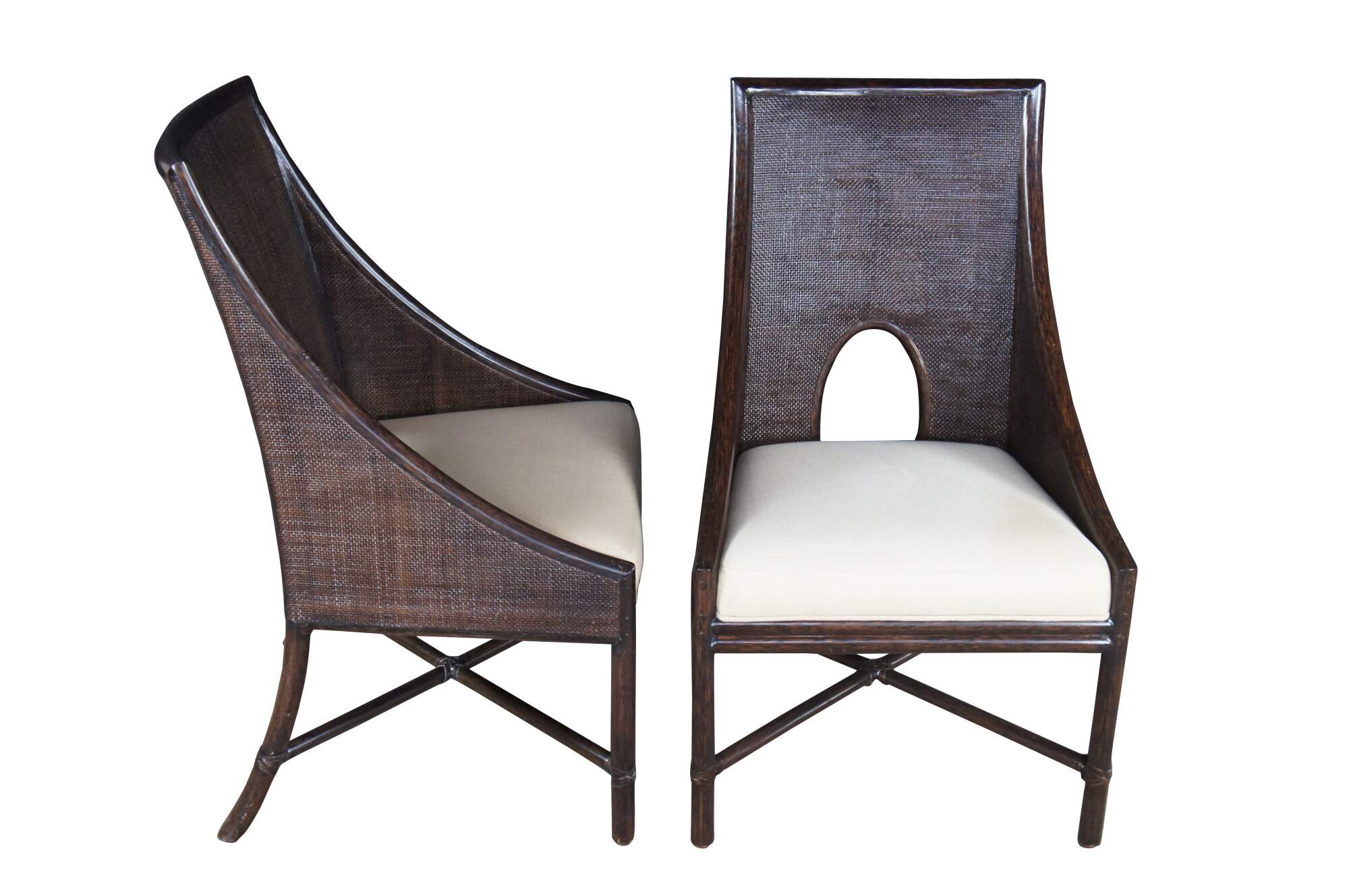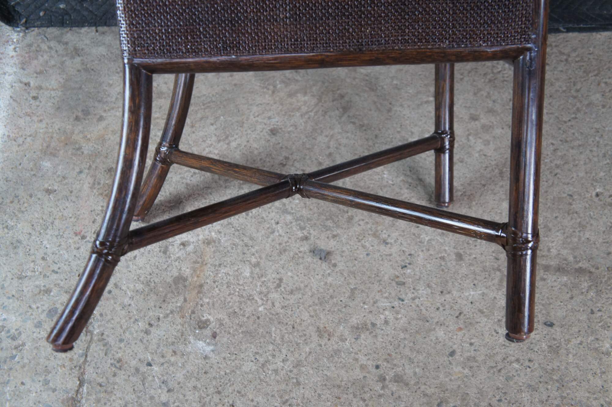 Barbara Barry's blend of Boho Chic and Mid Century Modern Design makes a statement on these Organic Modern Tobacco Caned Arm Chairs by Mcguire. Features a faux bamboo frame with sloped arms and caned accents. The back is caned with an arched bottom leading to an upholstered seat. Legs are connected by an X stretcher.