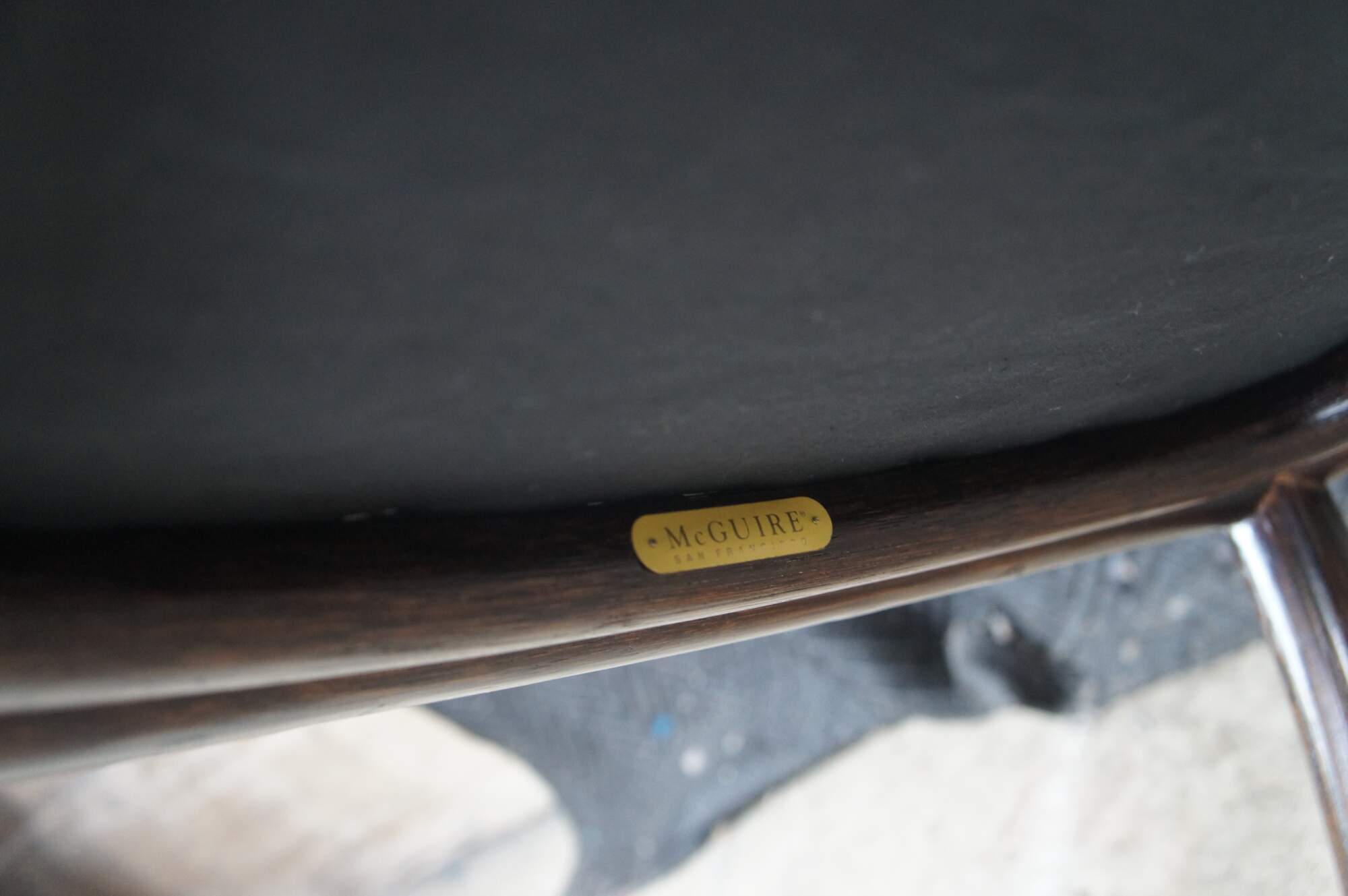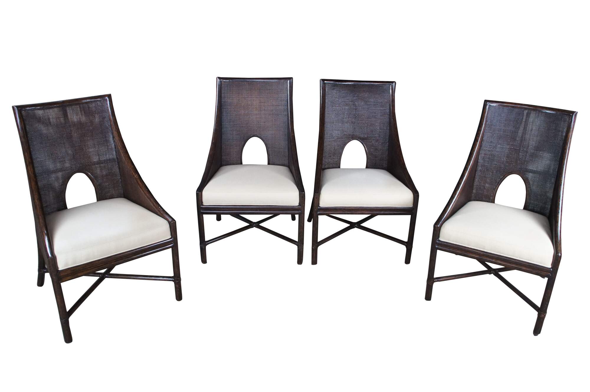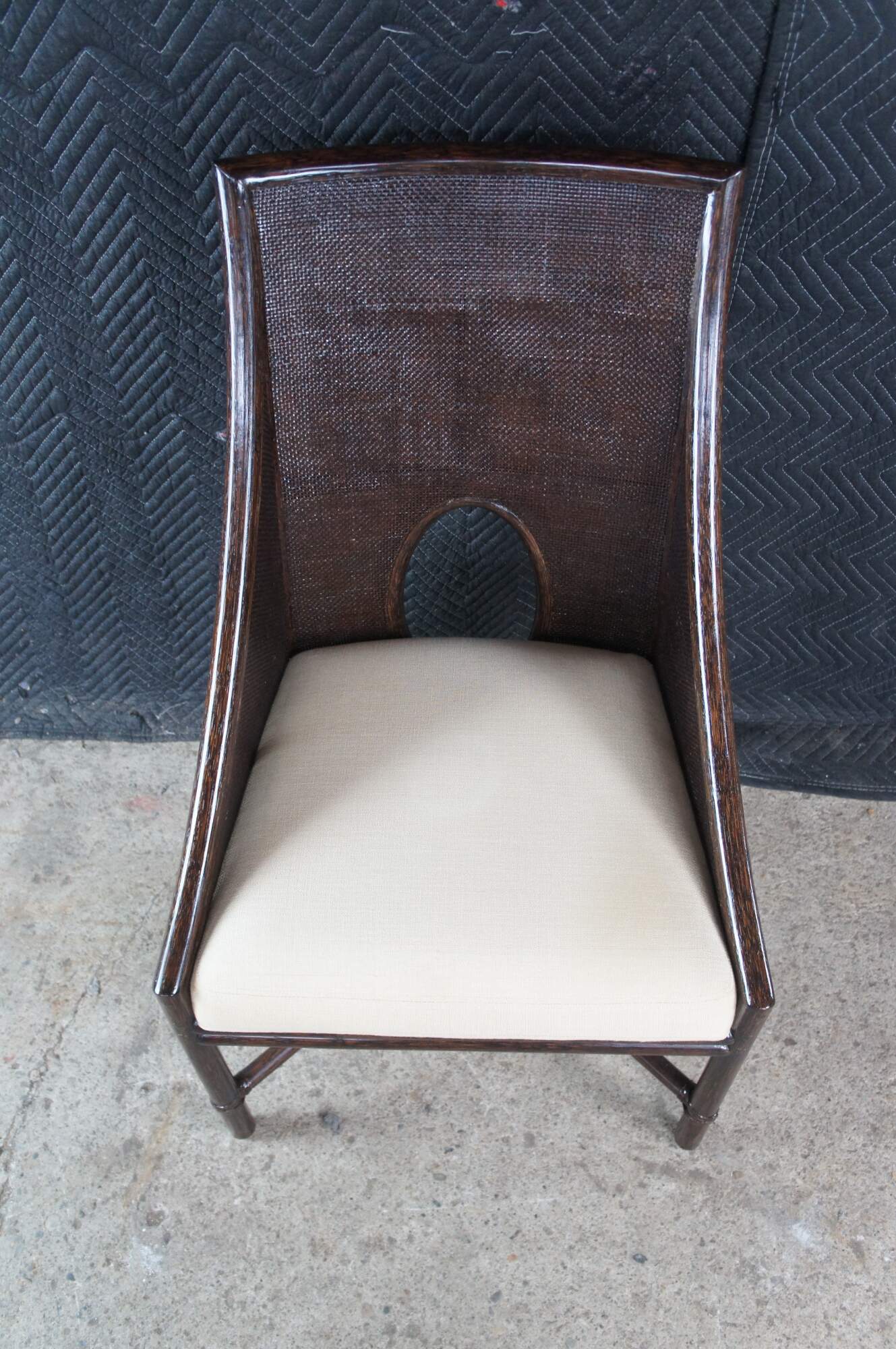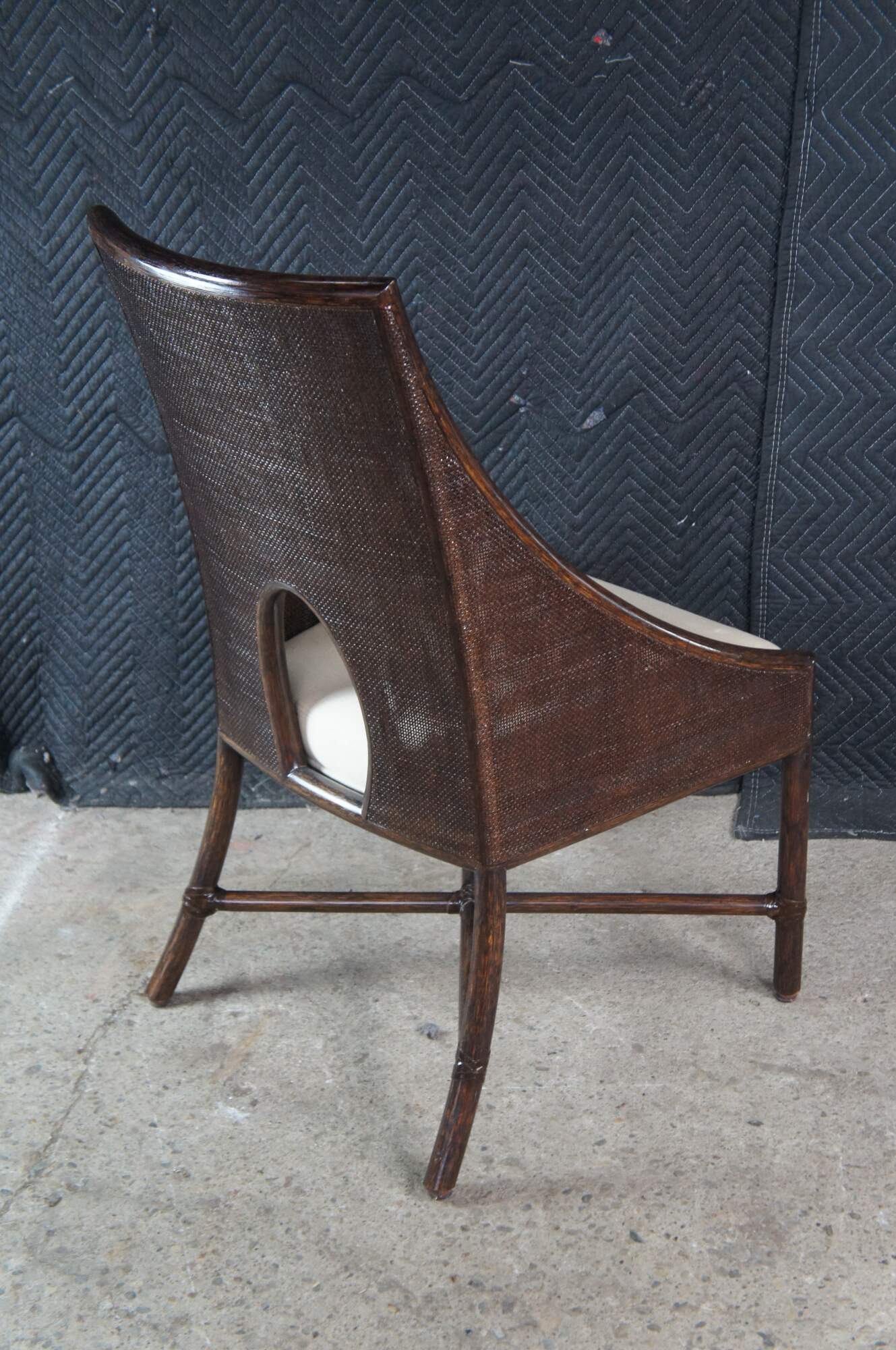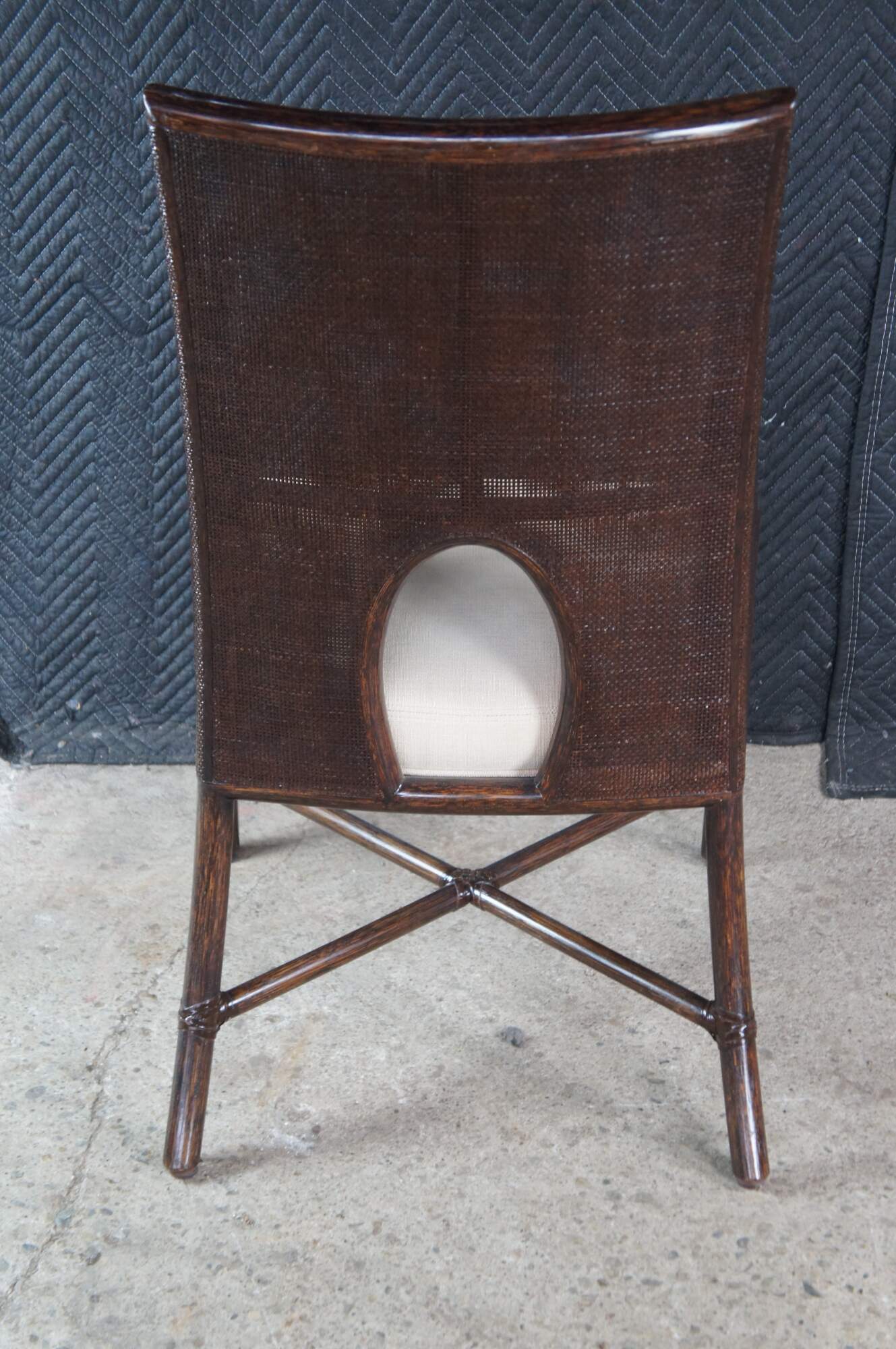 Barbara Barry's blend of Boho Chic and Mid Century Modern Design makes a statement on these Organic Modern Tobacco Caned Arm Chairs by Mcguire. Features a faux bamboo frame with sloped arms and caned accents. The back is caned with an arched bottom leading to an upholstered seat. Legs are connected by an X stretcher.