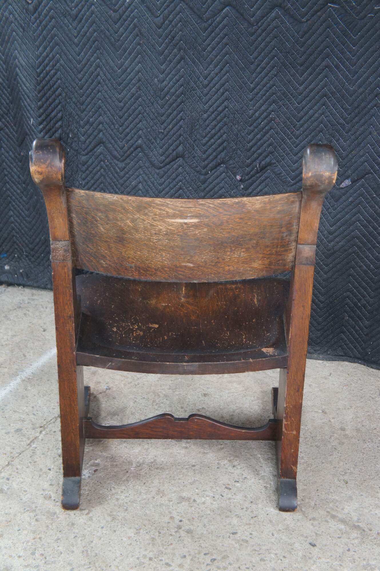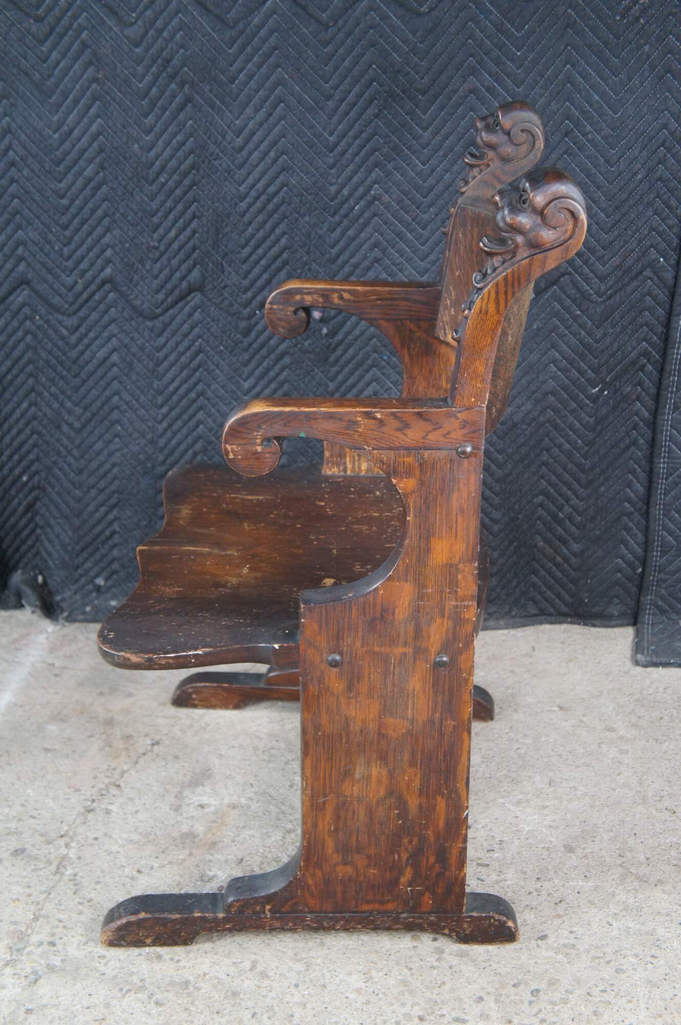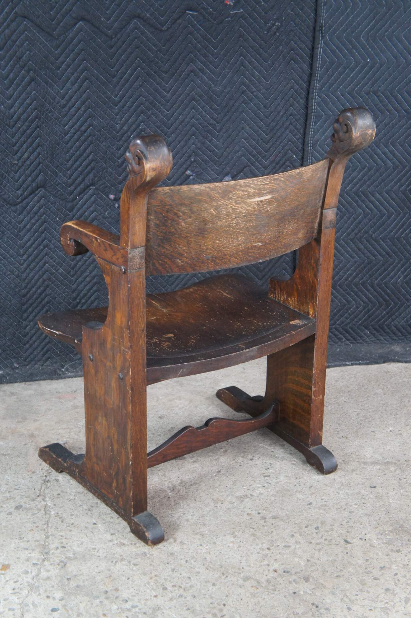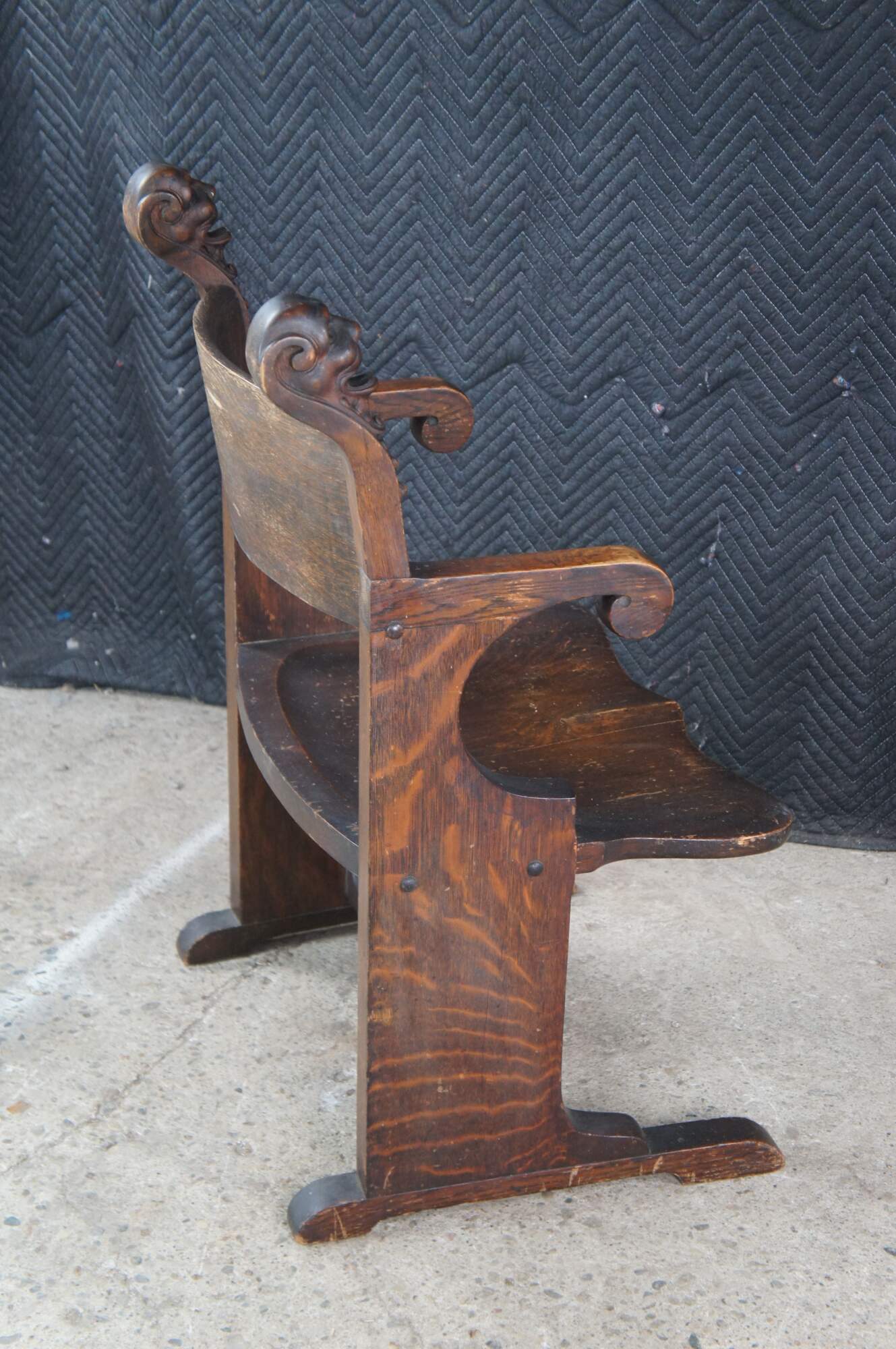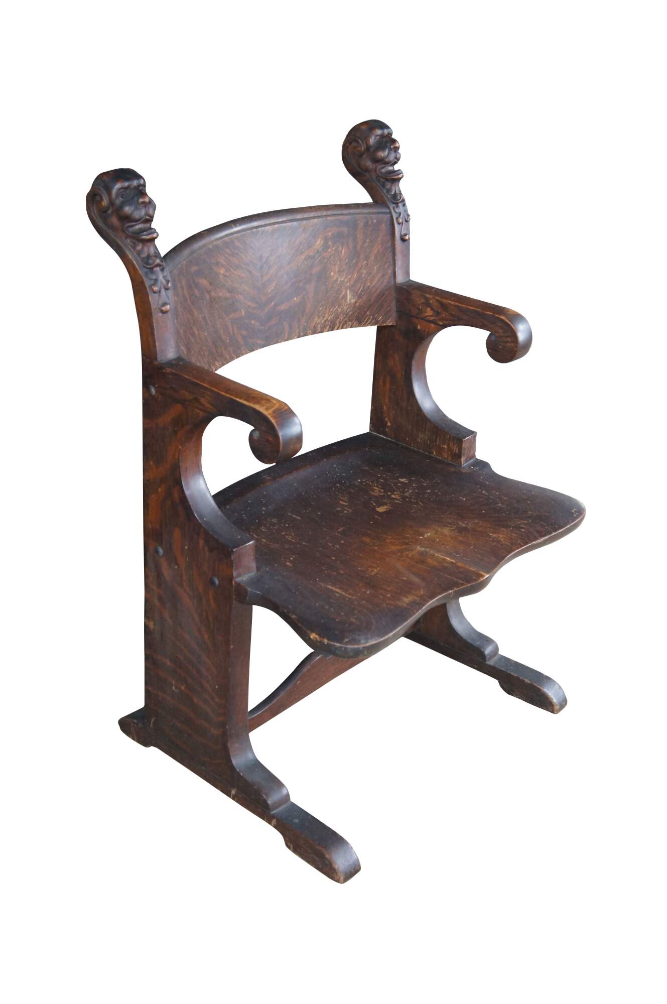 A spectacular antique 19th century American Victorian Arm Chair. Drawing inspiration from Renaissance Revival styling with grotesque face formed finials over a curved back, 'C' scrolled arms, a saddle seat and trestle form base. The perfect statement for any space.