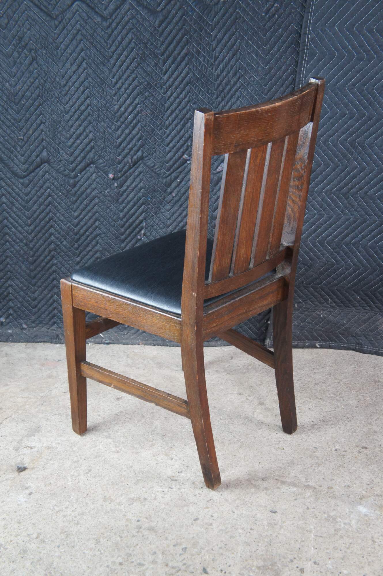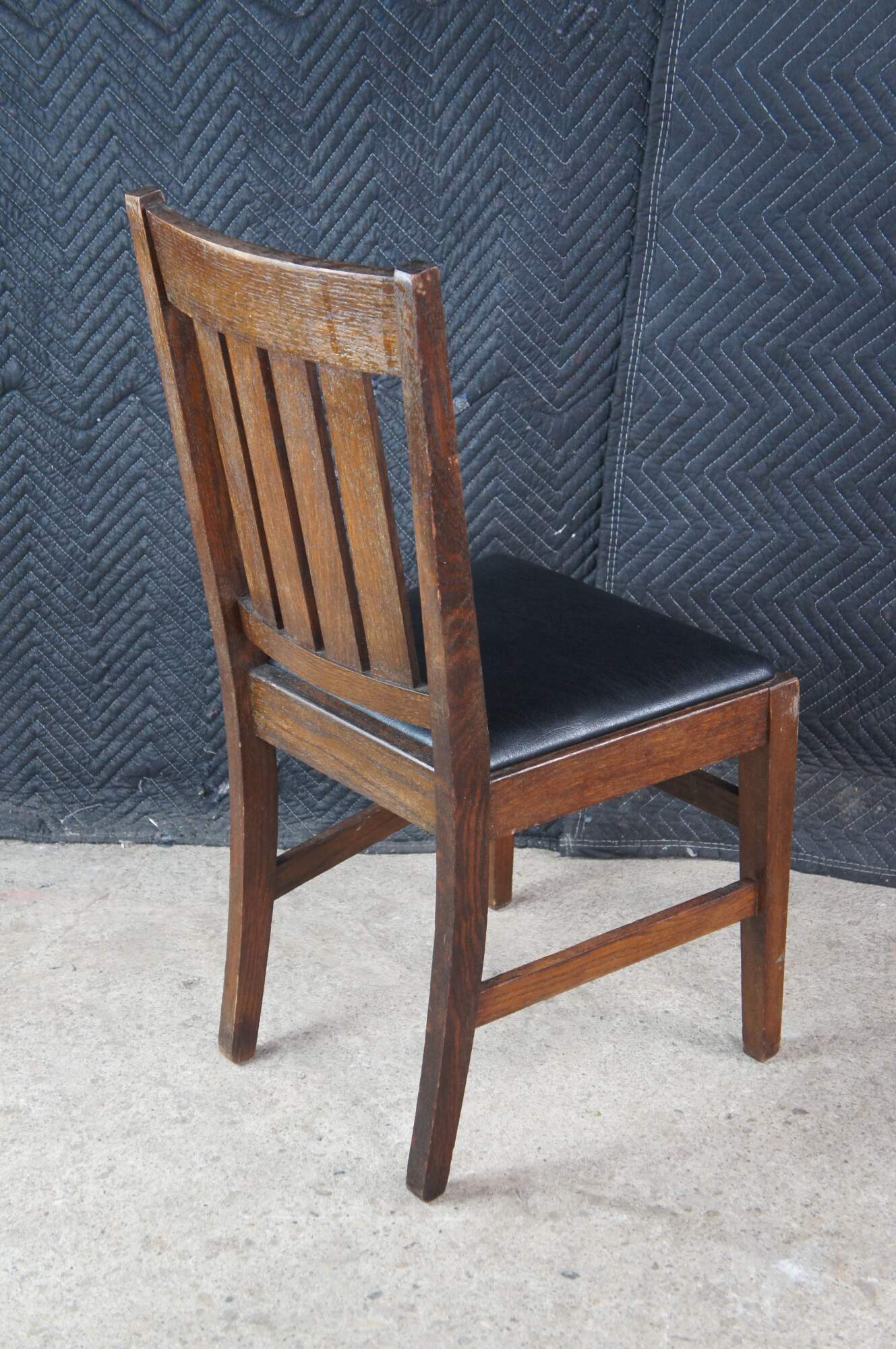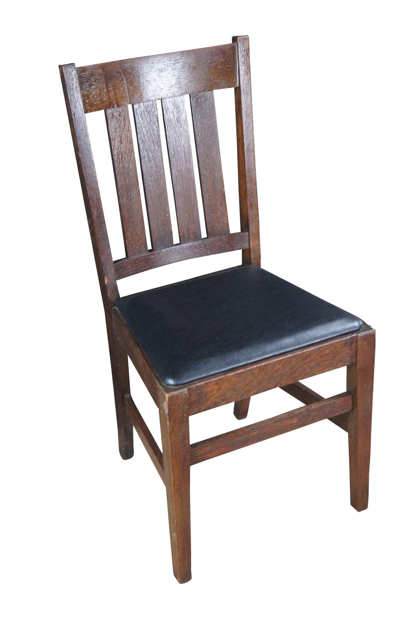 1912-1988. Features a quartersawn oak frame, vertical slat back and leather seat. Each chair is supported by square tapered legs connected by Stretchers on the front and side. Marked along underside.