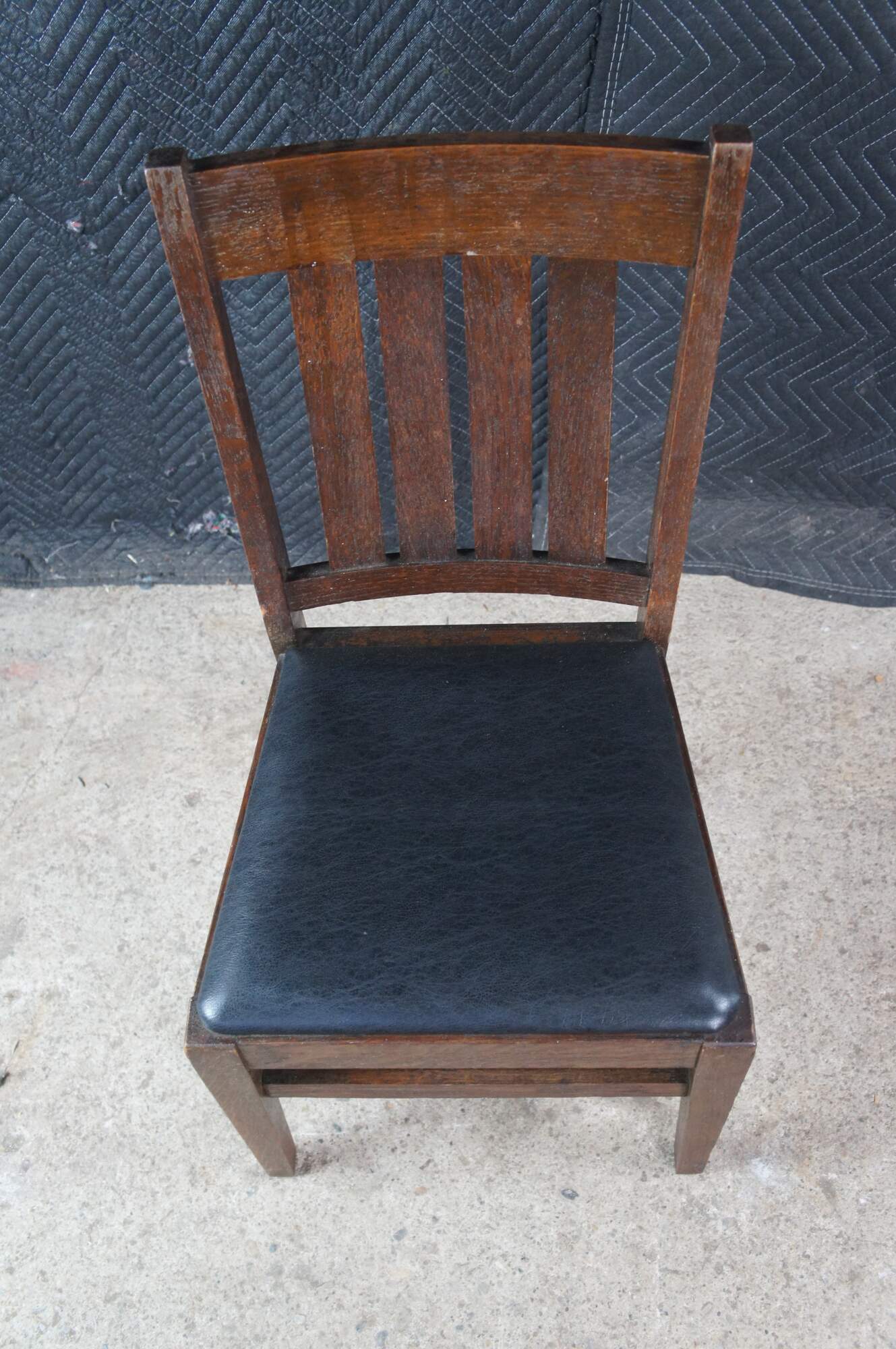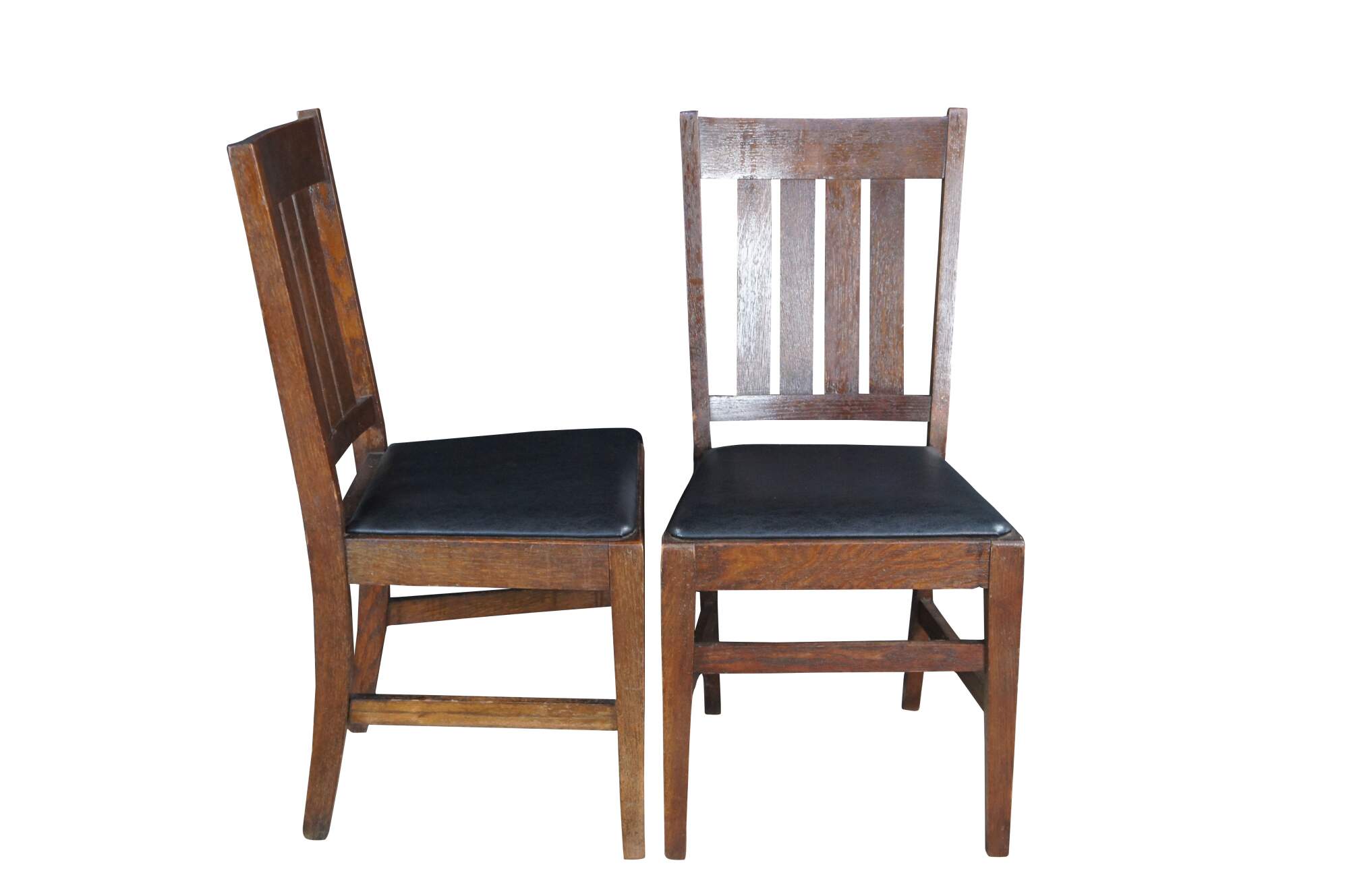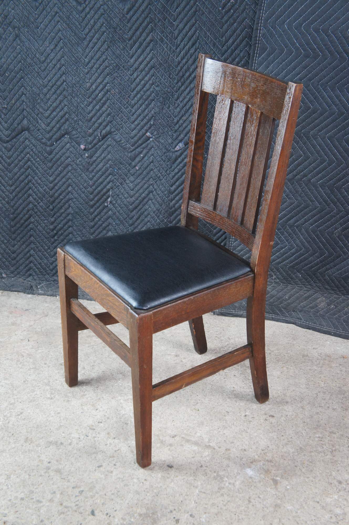 1912-1988. Features a quartersawn oak frame, vertical slat back and leather seat. Each chair is supported by square tapered legs connected by Stretchers on the front and side. Marked along underside.