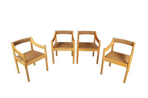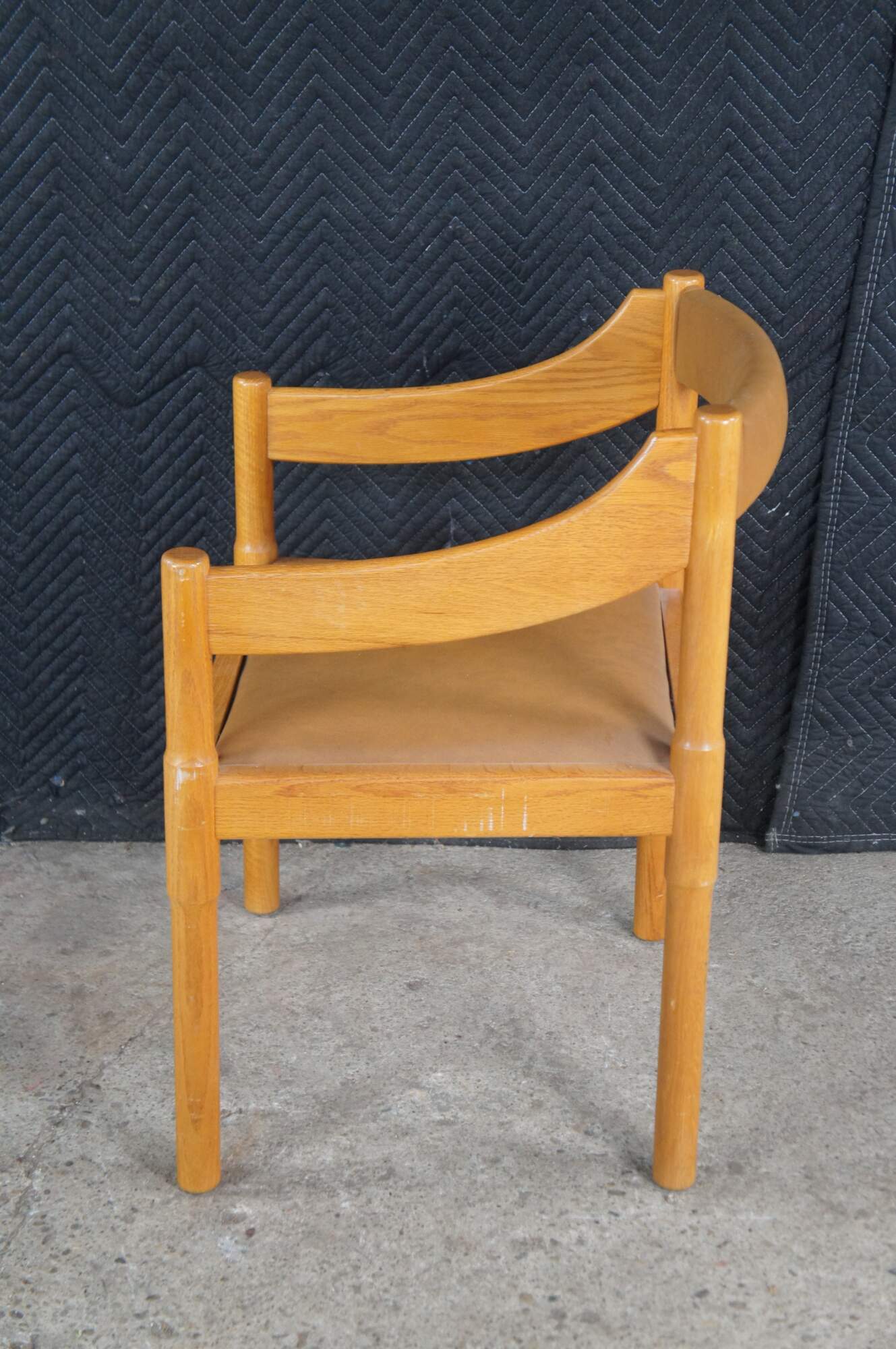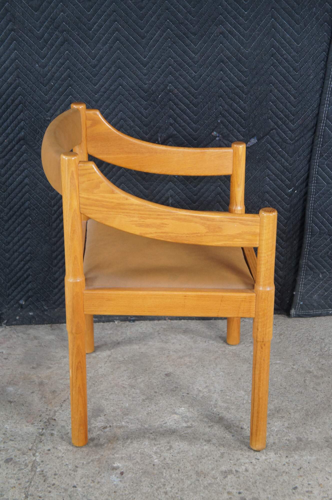 Set of four Vico Magistretti Italian Mid-Century Modern 'Carimate' Dining Chairs. The chairs are mininmalist at its finest. Simple lines combined with innovative functionality. Made from oak with a contoured brown leather back, sloped arms and a leather inset seat. A combination of Italian MCM & scandinavian design.