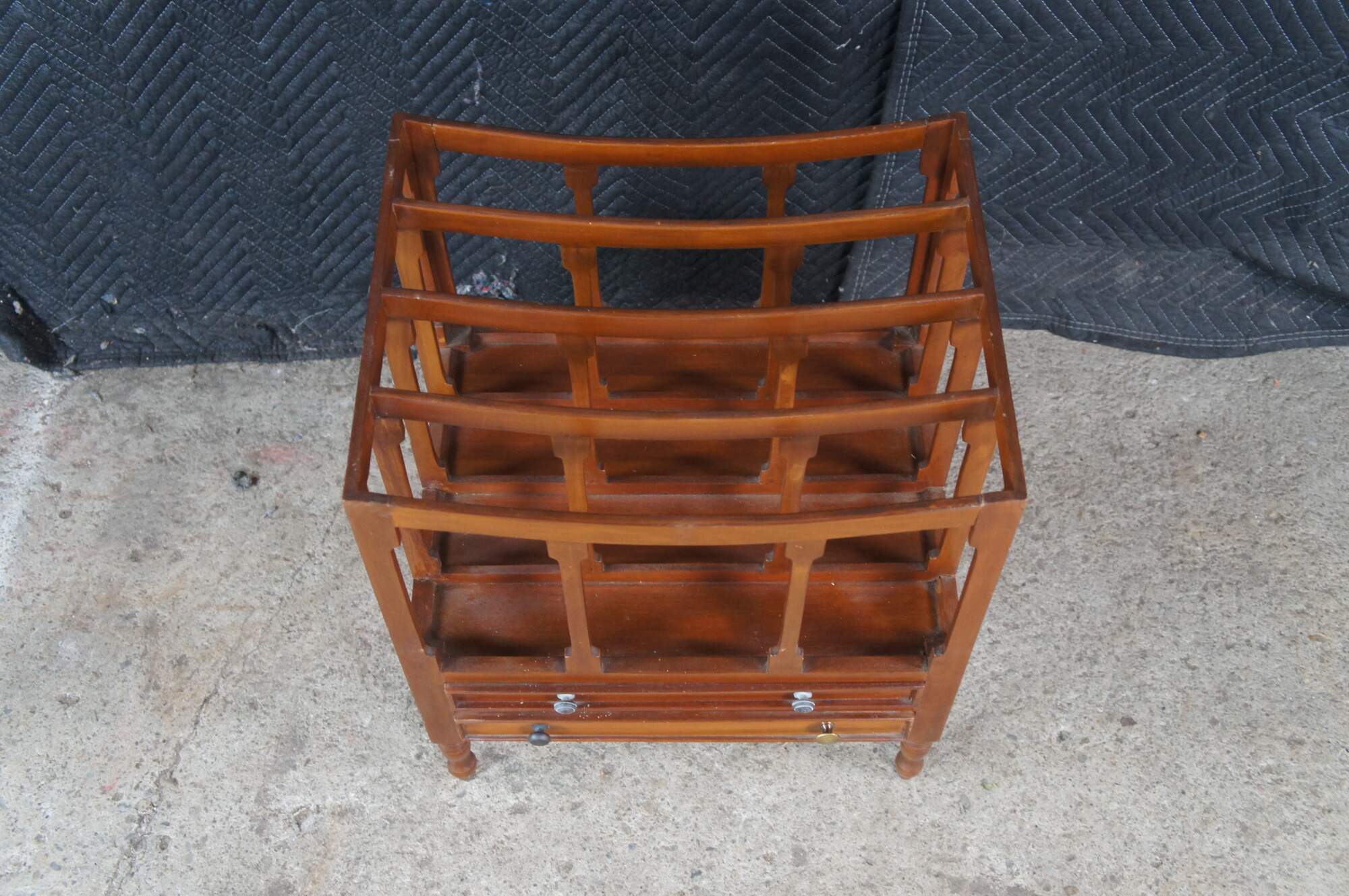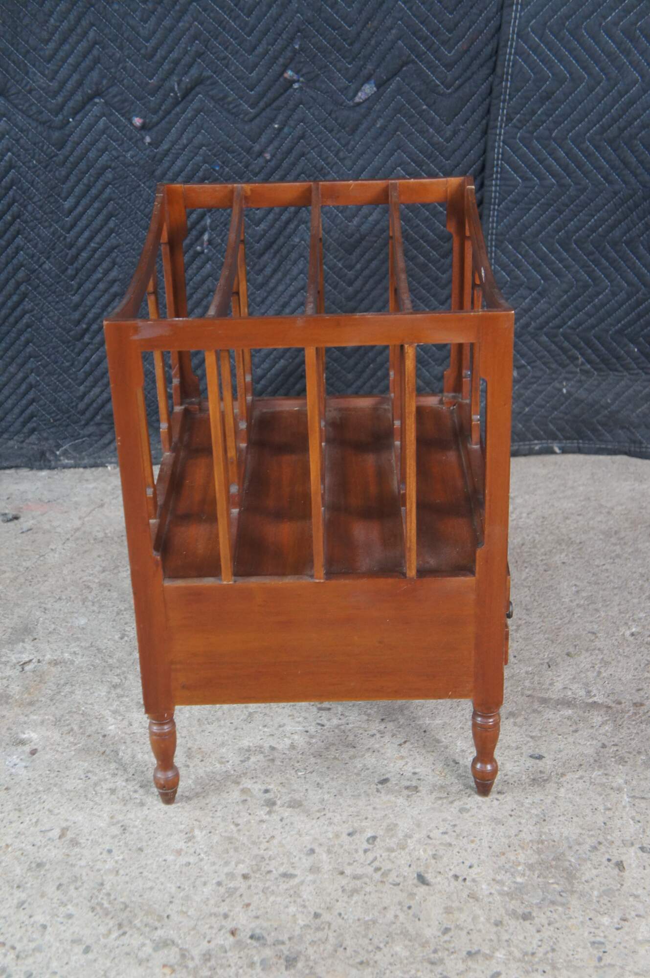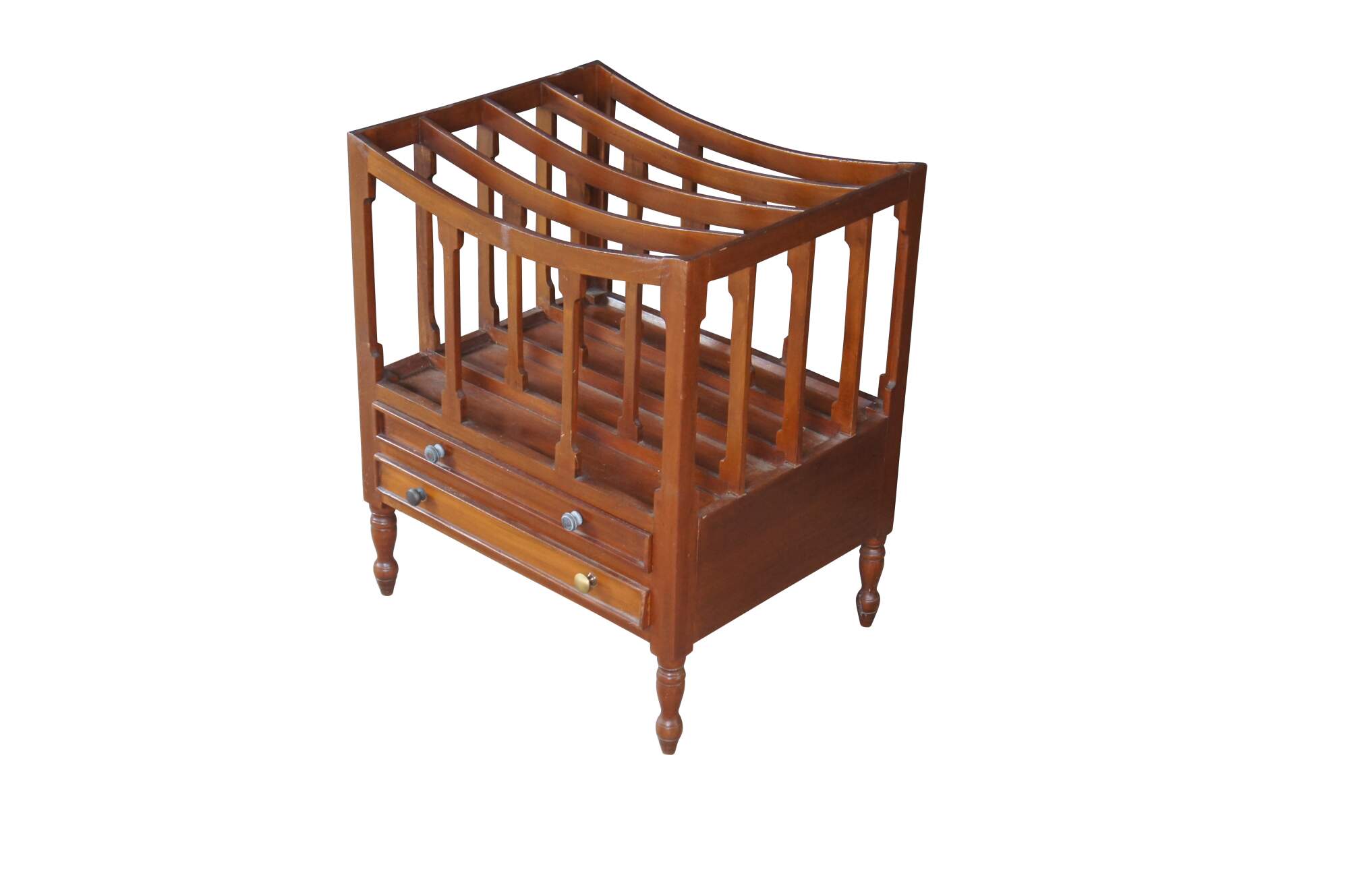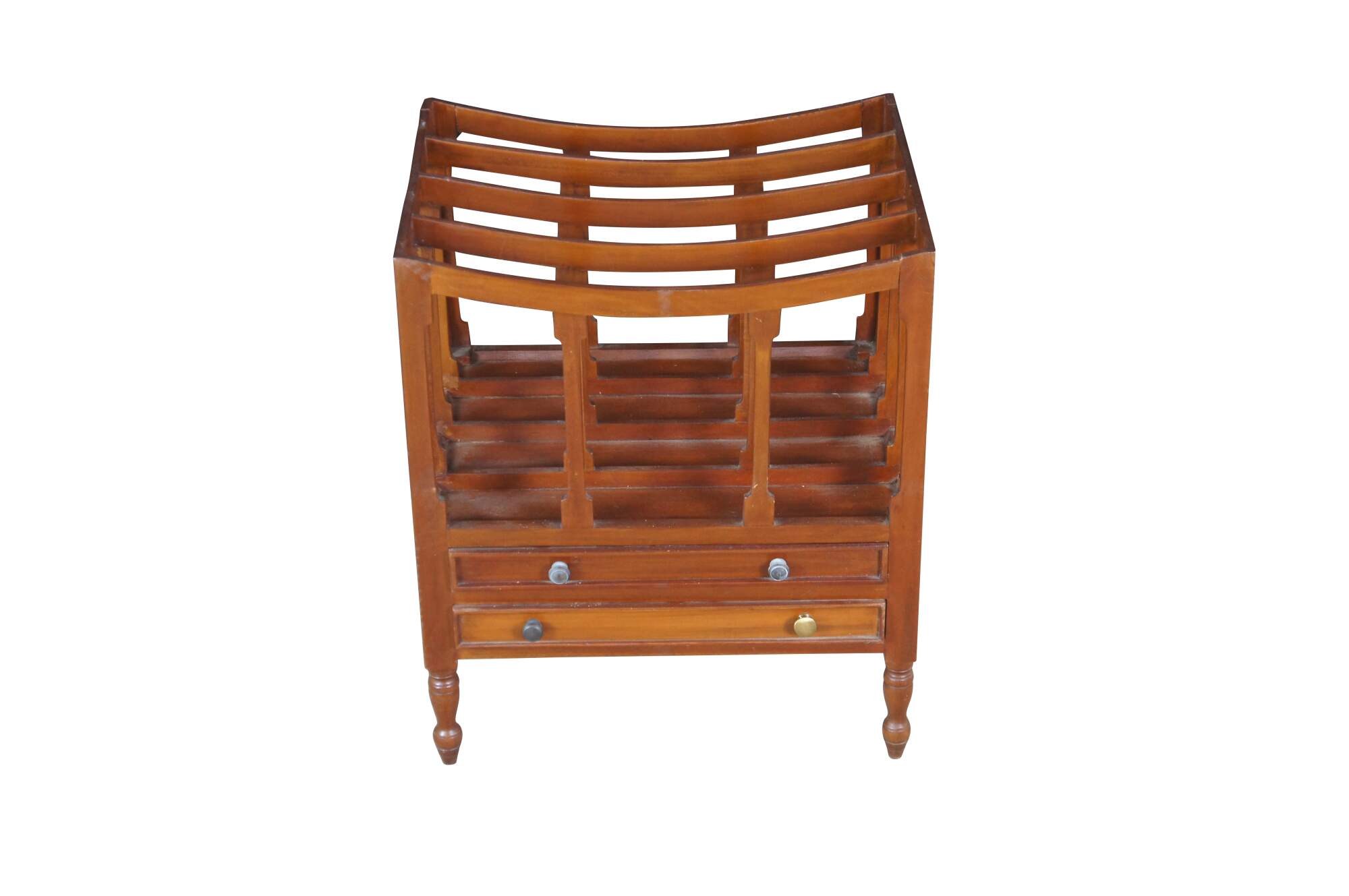 Late 20th Century Georgian Style Canterbury Magazine or Sheet Music Rack. Made from mahogany with five sloped rails along the top separating the compartments and two lower dovetailed drawers. The stand is supported by turned legs with arrow feet.
