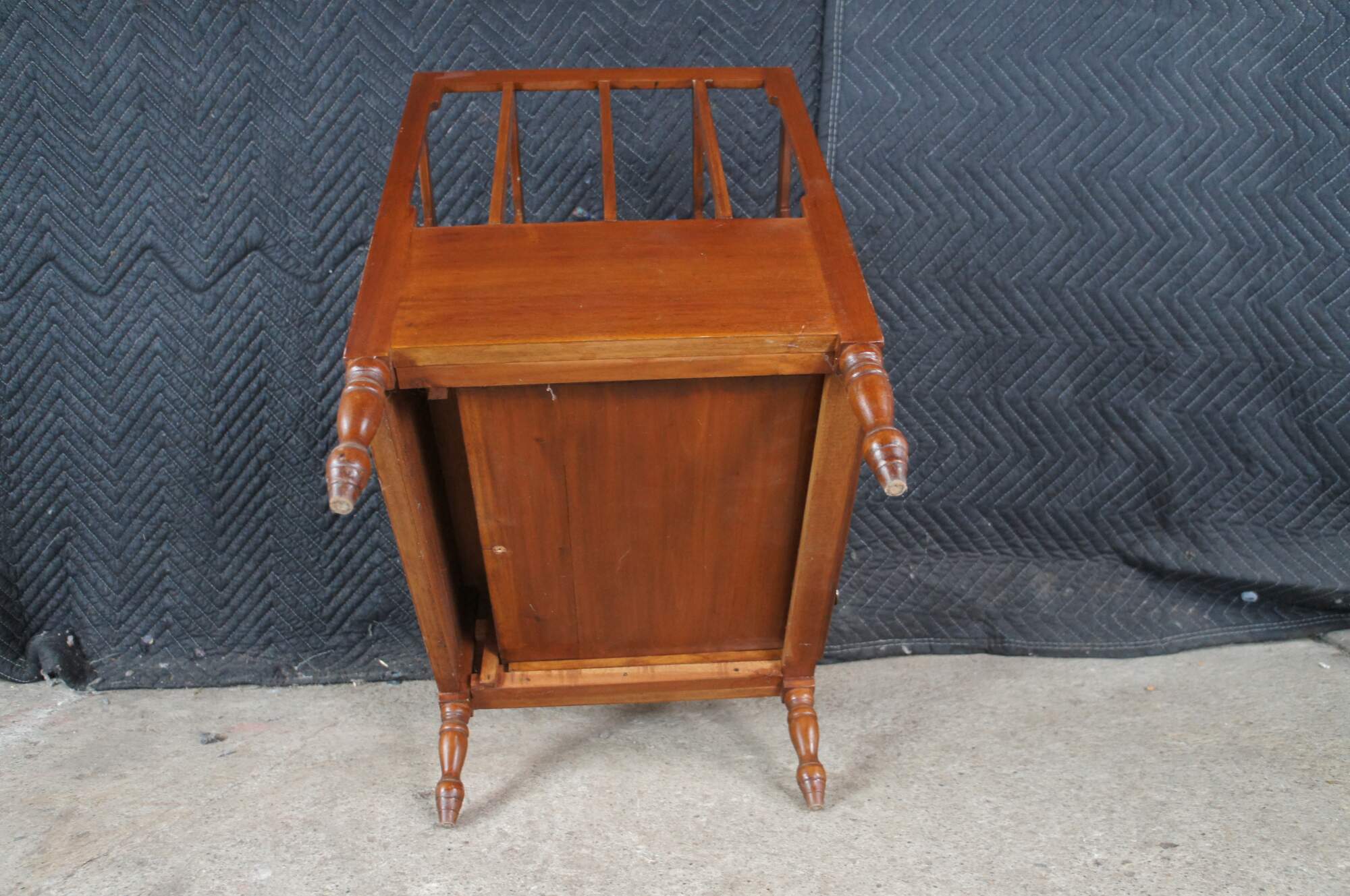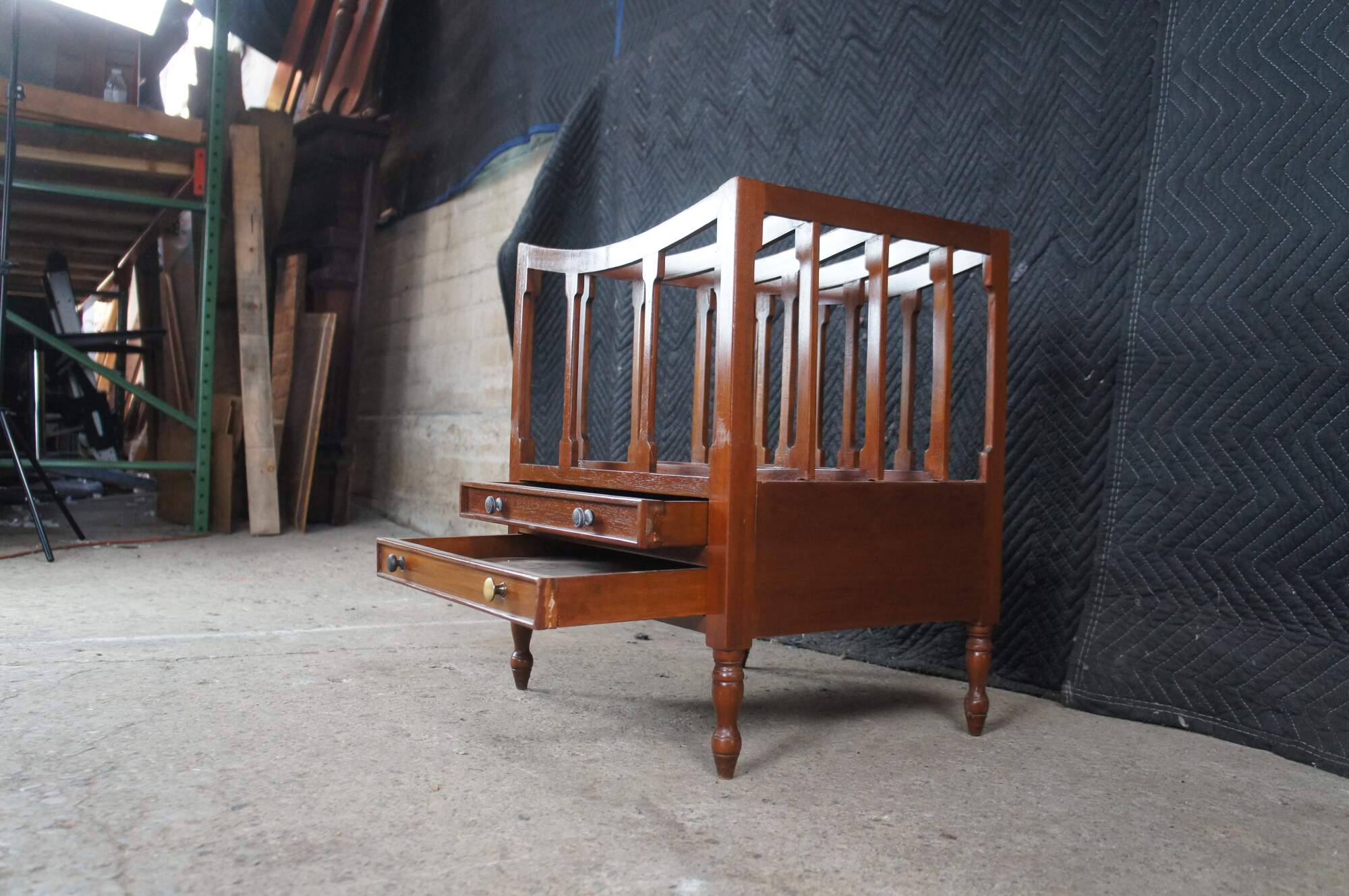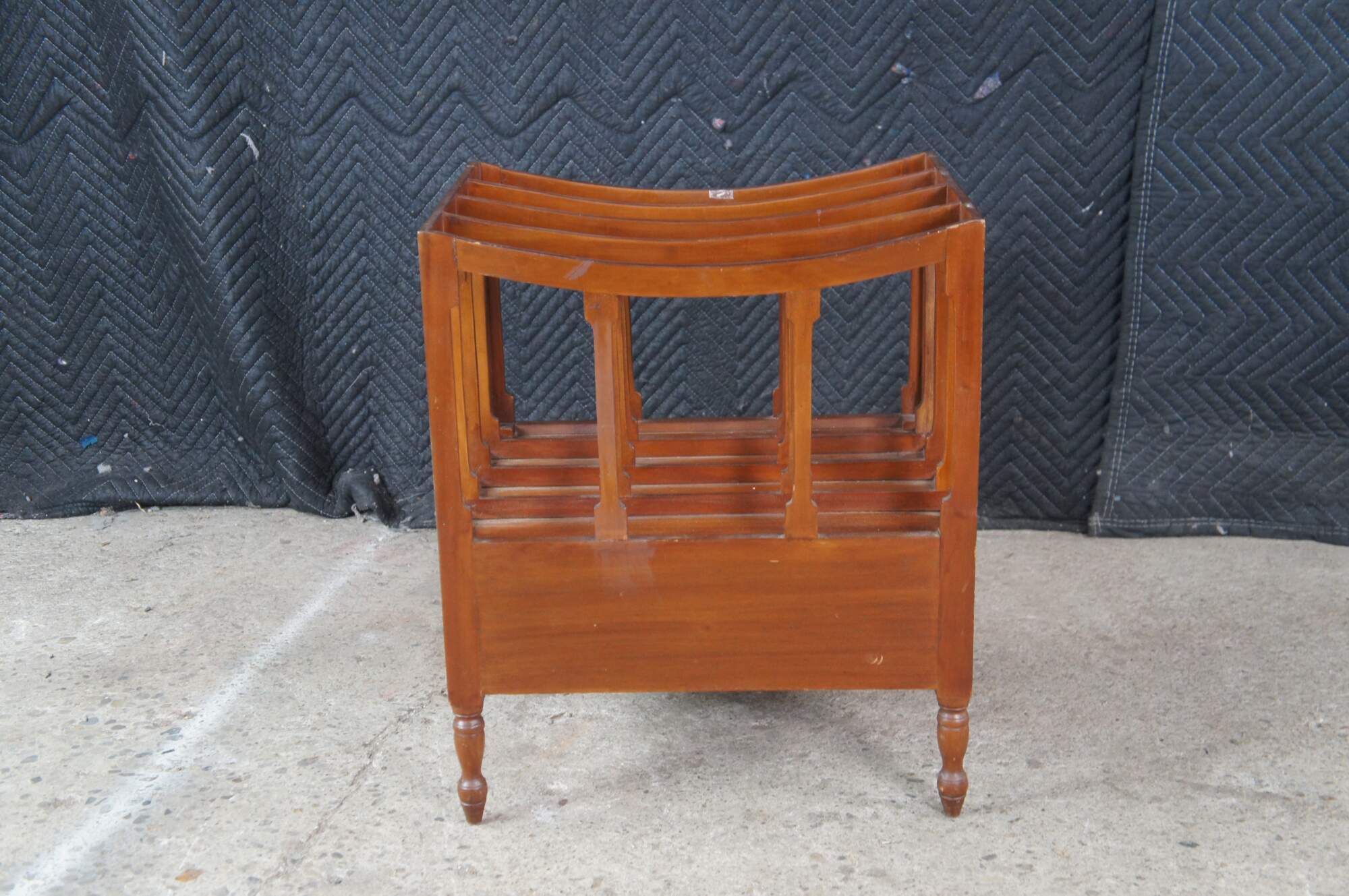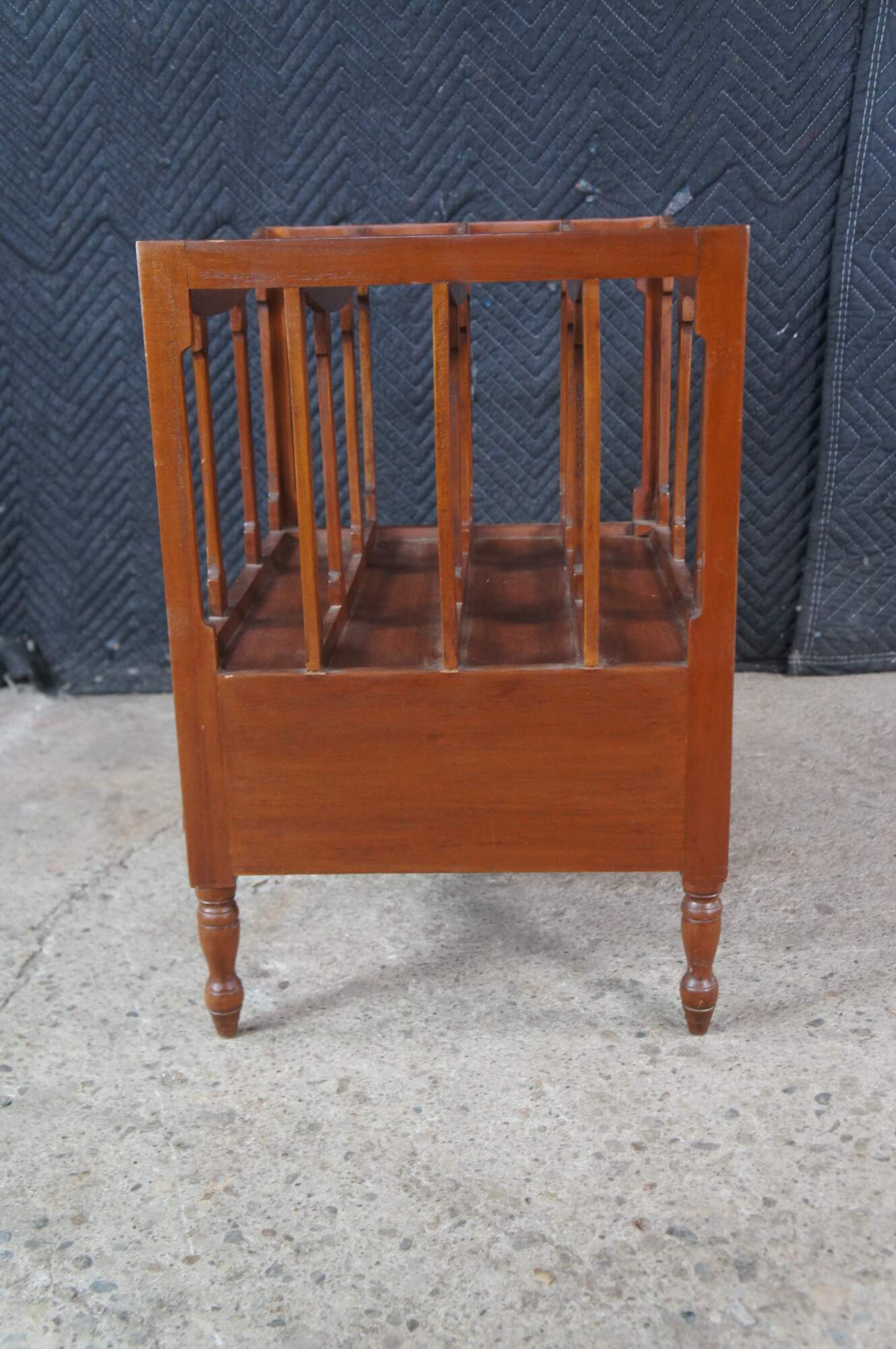 Late 20th Century Georgian Style Canterbury Magazine or Sheet Music Rack. Made from mahogany with five sloped rails along the top separating the compartments and two lower dovetailed drawers. The stand is supported by turned legs with arrow feet.