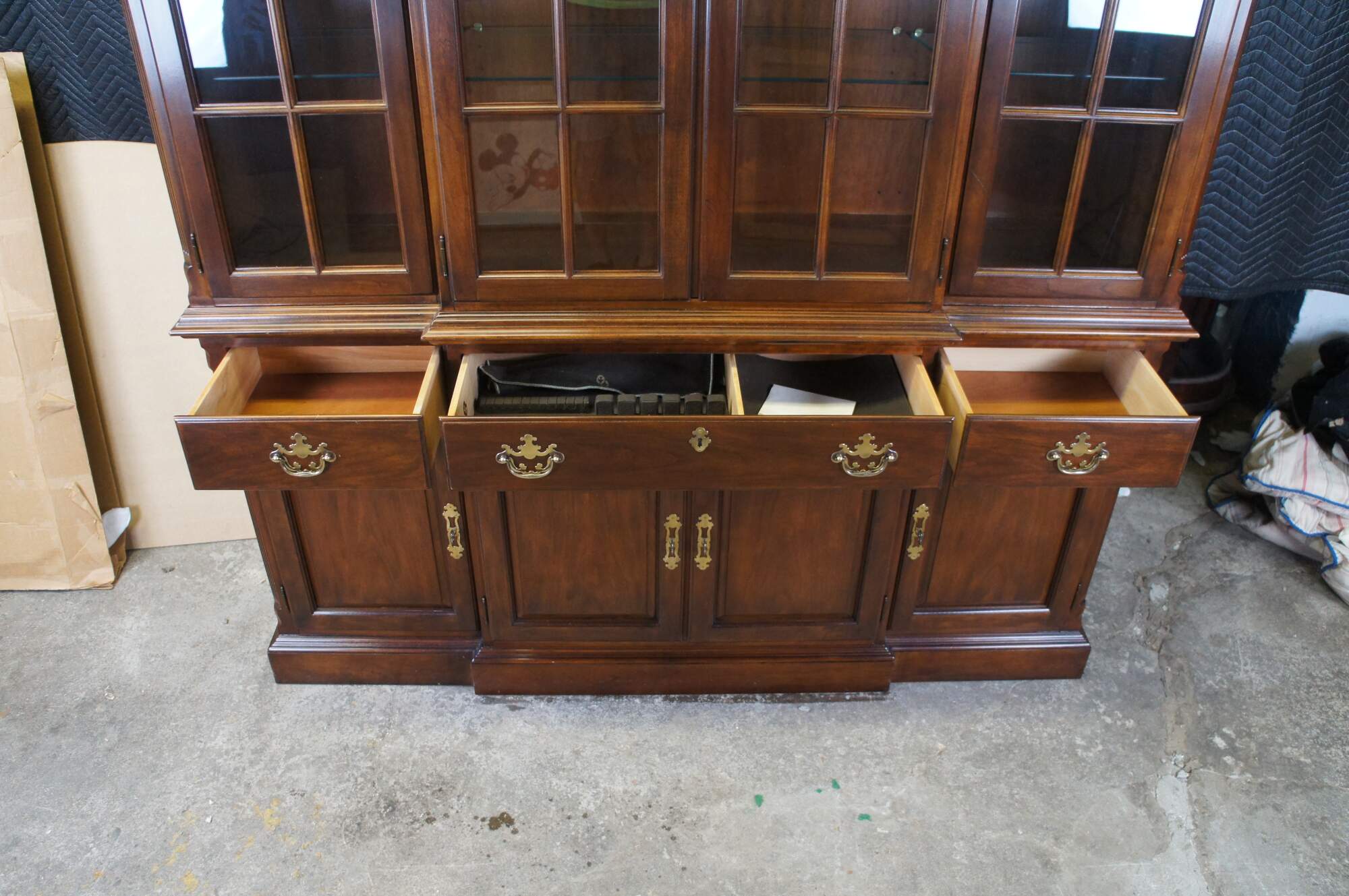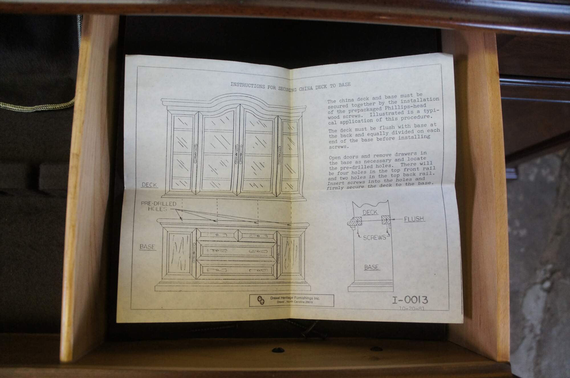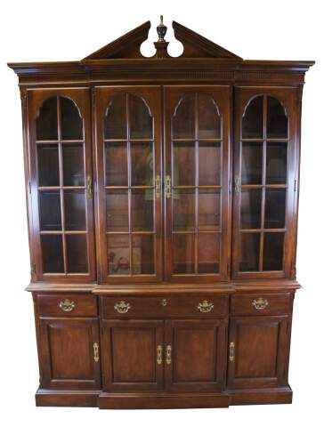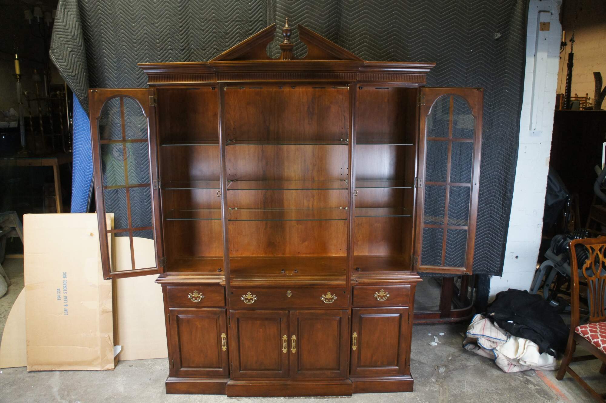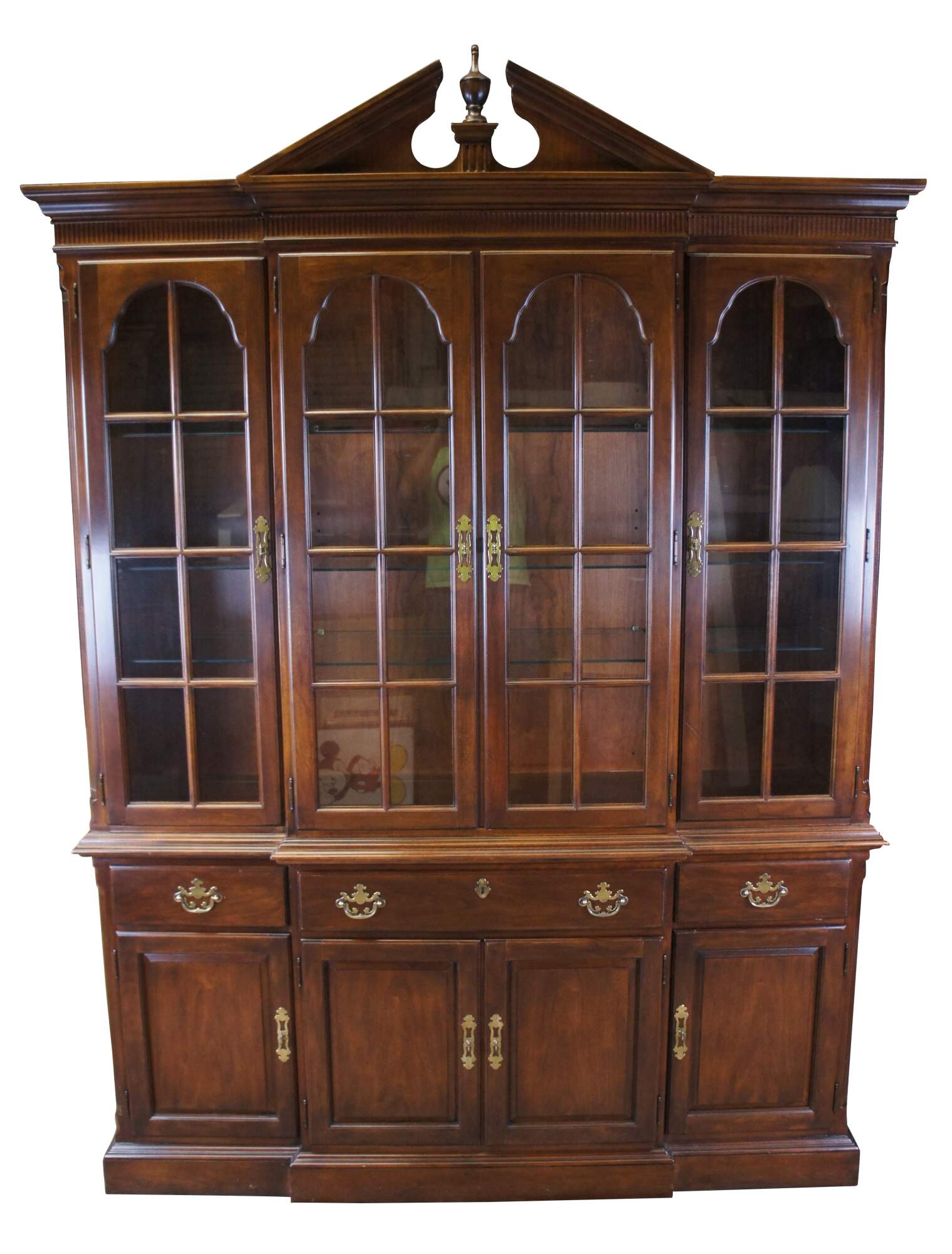 Vintage 1987 Drexel Furniture China cabinet featuring traditional styling with open pediment trophy finial over an illumined showcase, supported by a lower cabinet with large silverware drawer and additional storage.